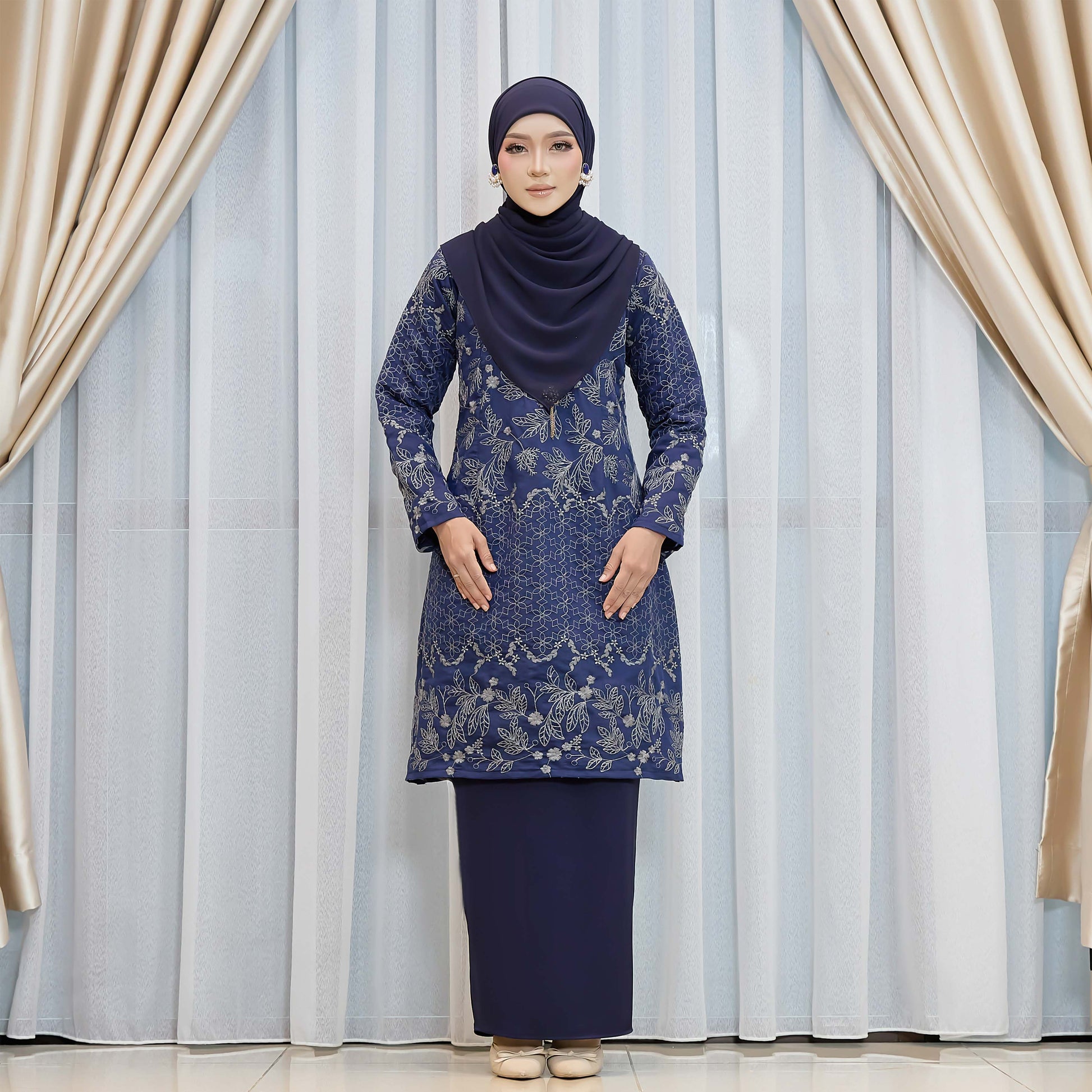 The Adora Kurung features Tensilk embroidery on Sutera Luminous fabric, offering style and comfort. It includes a decorative button, layered back skirt, and easy-access zips for nursing and wudhu. This design blends tradition with modern convenience.