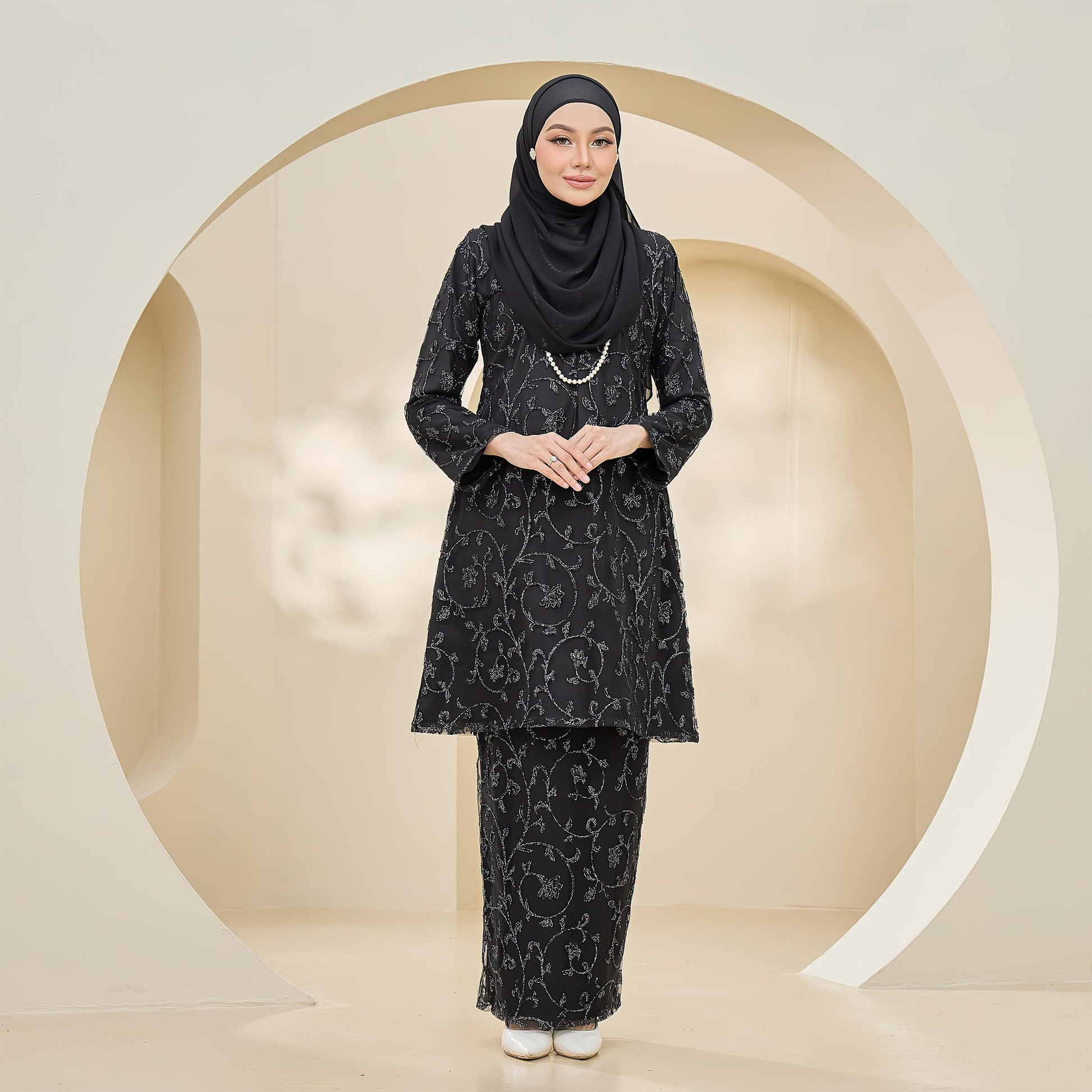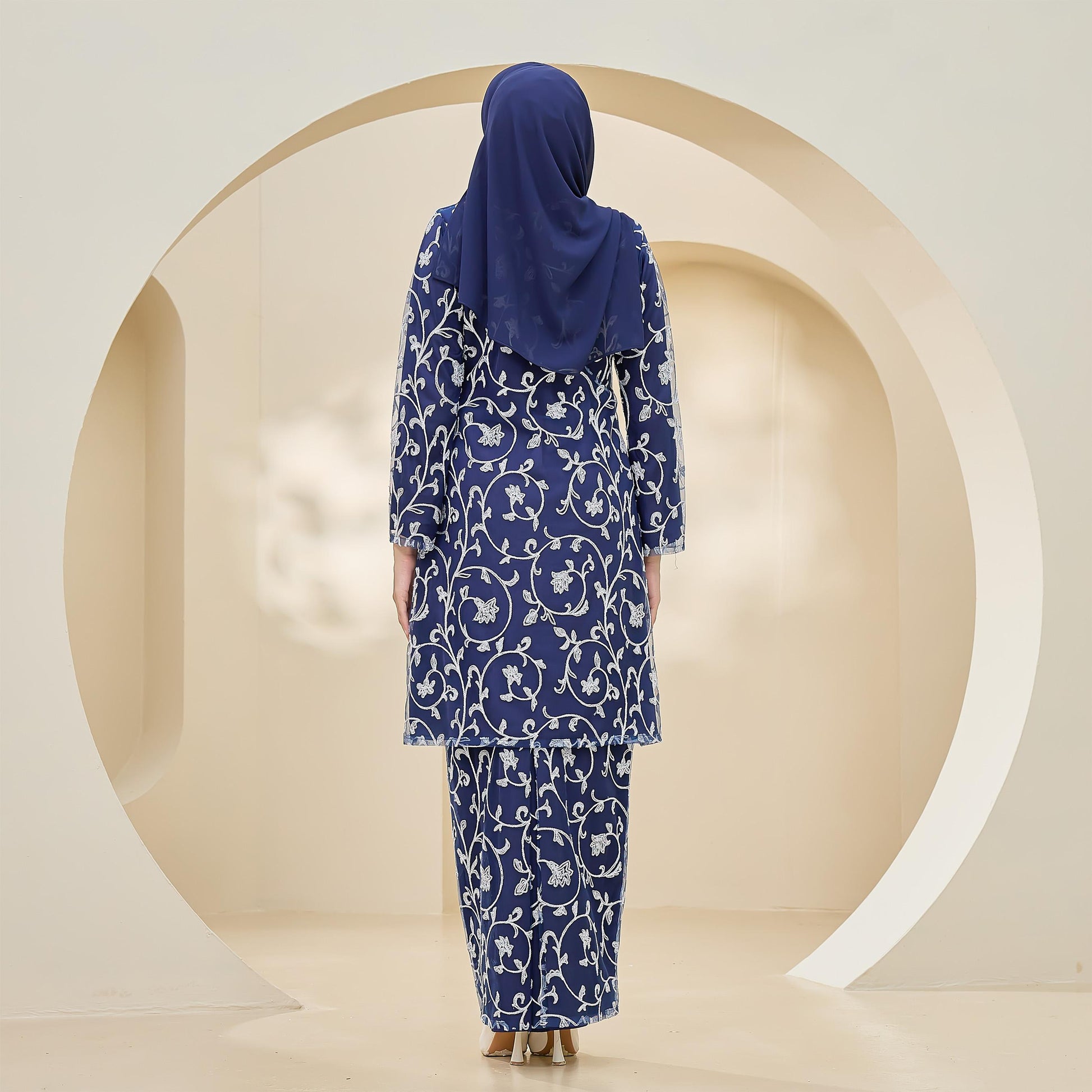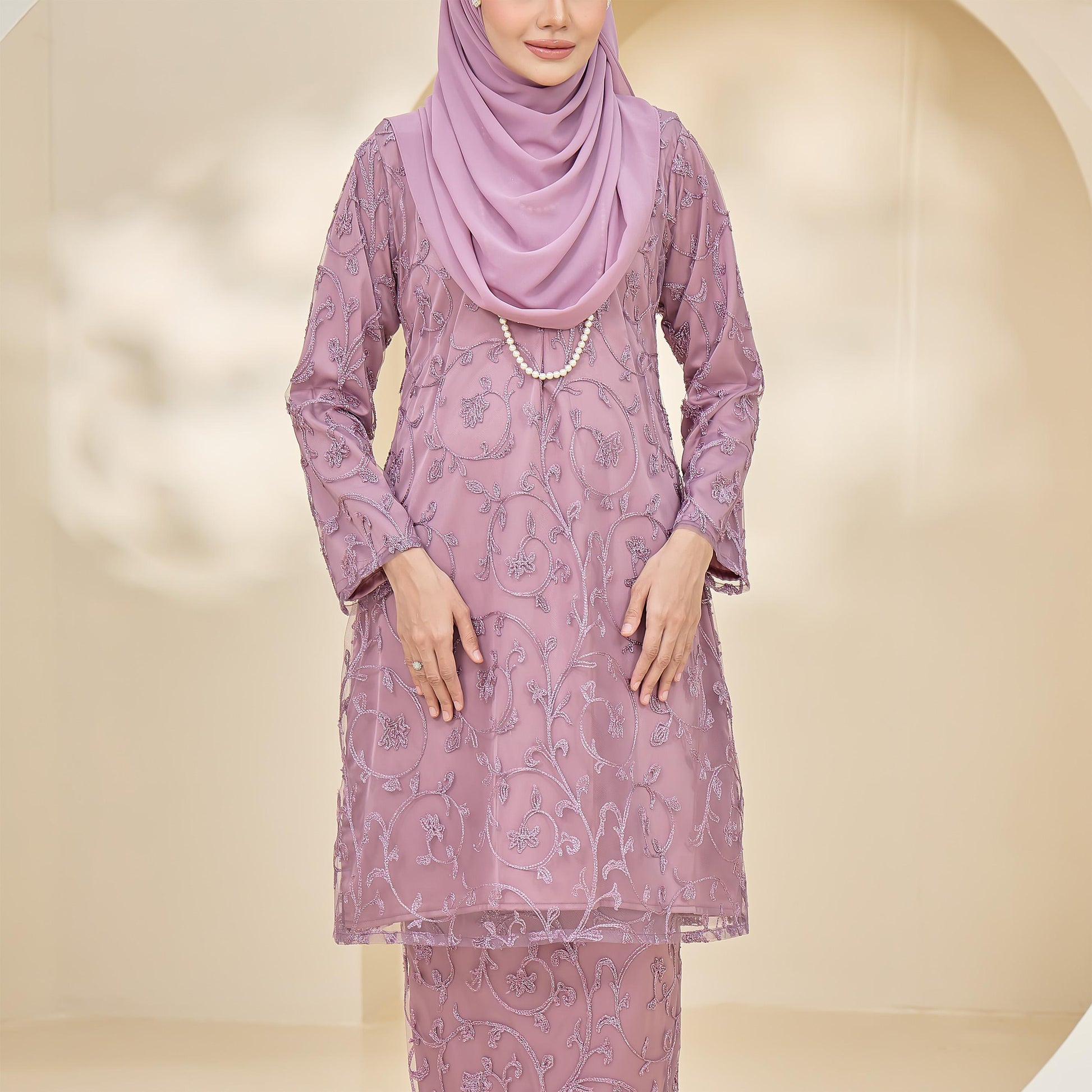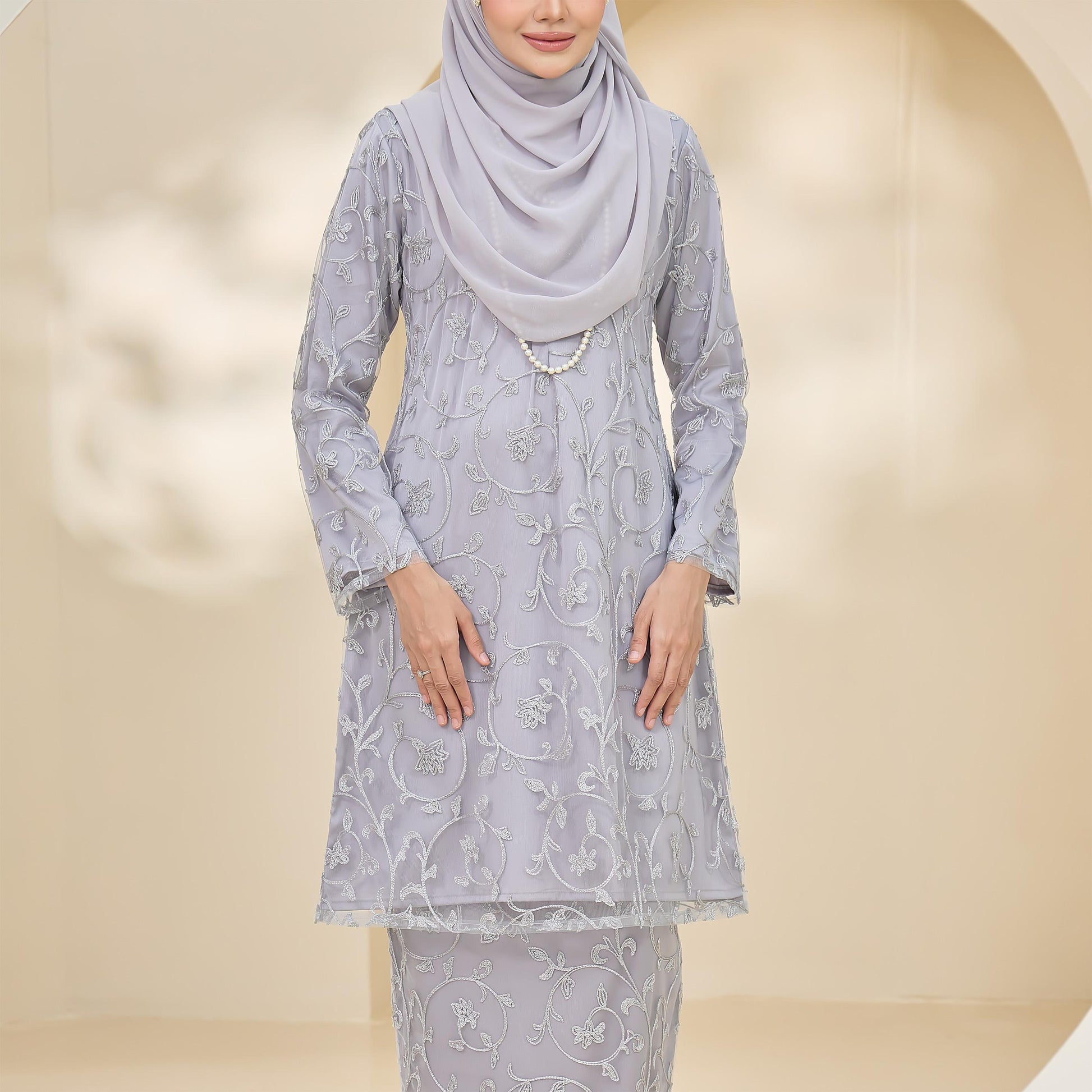 Made with Sutera Luminous lining and tulle lace, the Amaya Kurung combines style and practicality. It features lace trim, a layered back skirt, a chest zip for easy nursing, and loose cuffs for wudhu convenience.