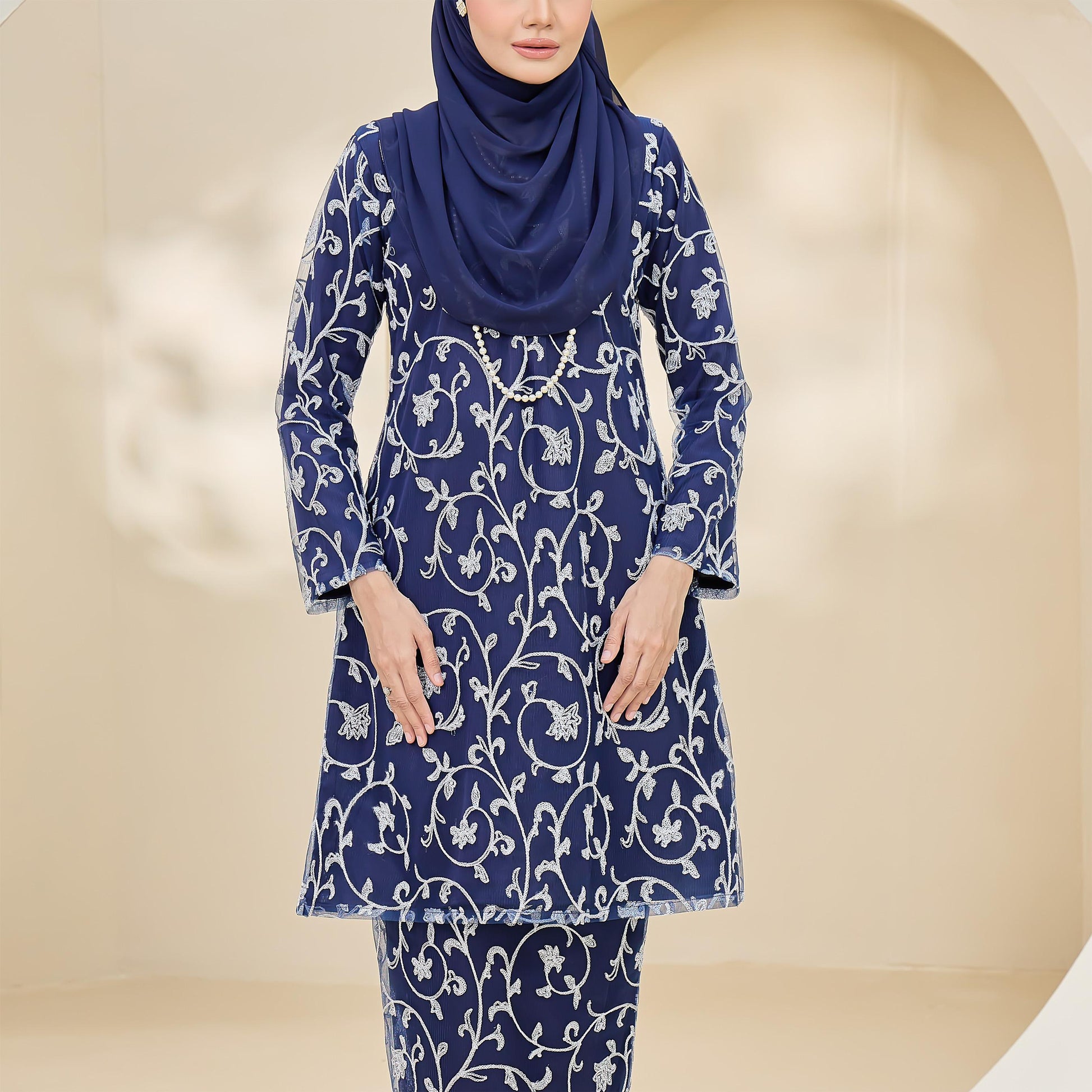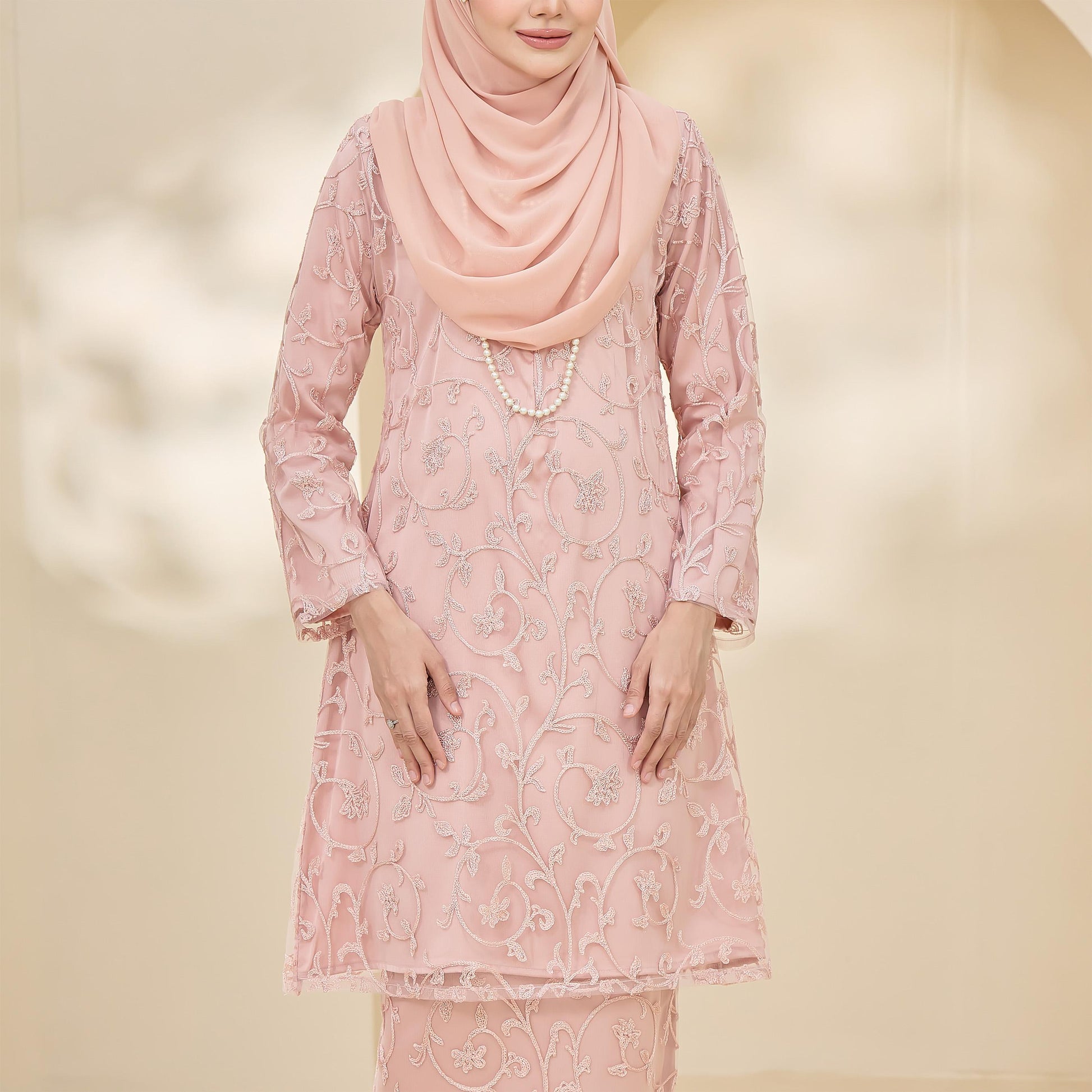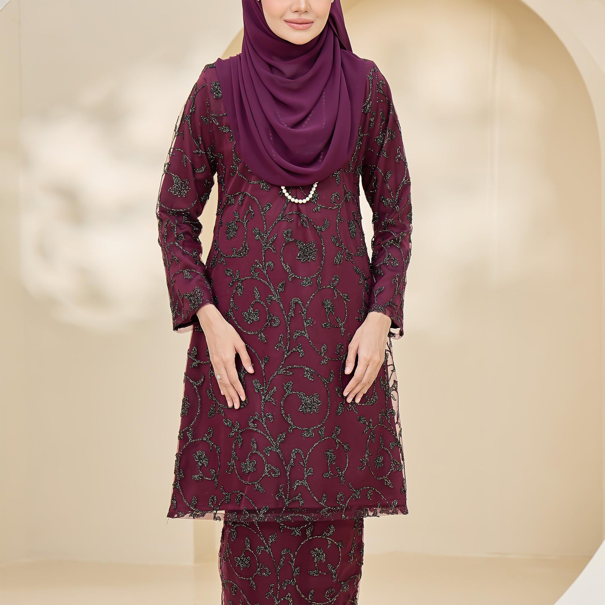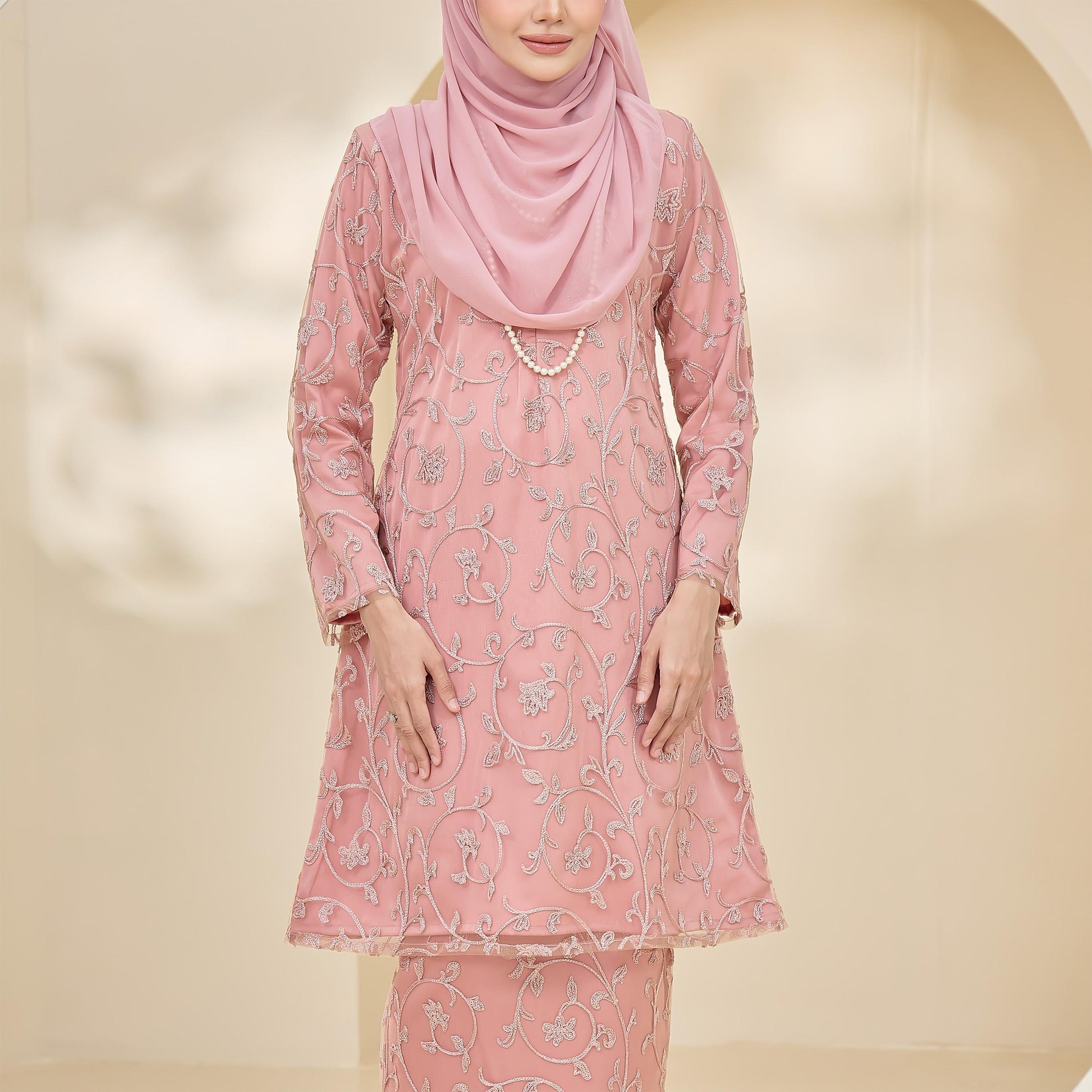 Made with Sutera Luminous lining and tulle lace, the Amaya Kurung combines style and practicality. It features lace trim, a layered back skirt, a chest zip for easy nursing, and loose cuffs for wudhu convenience.