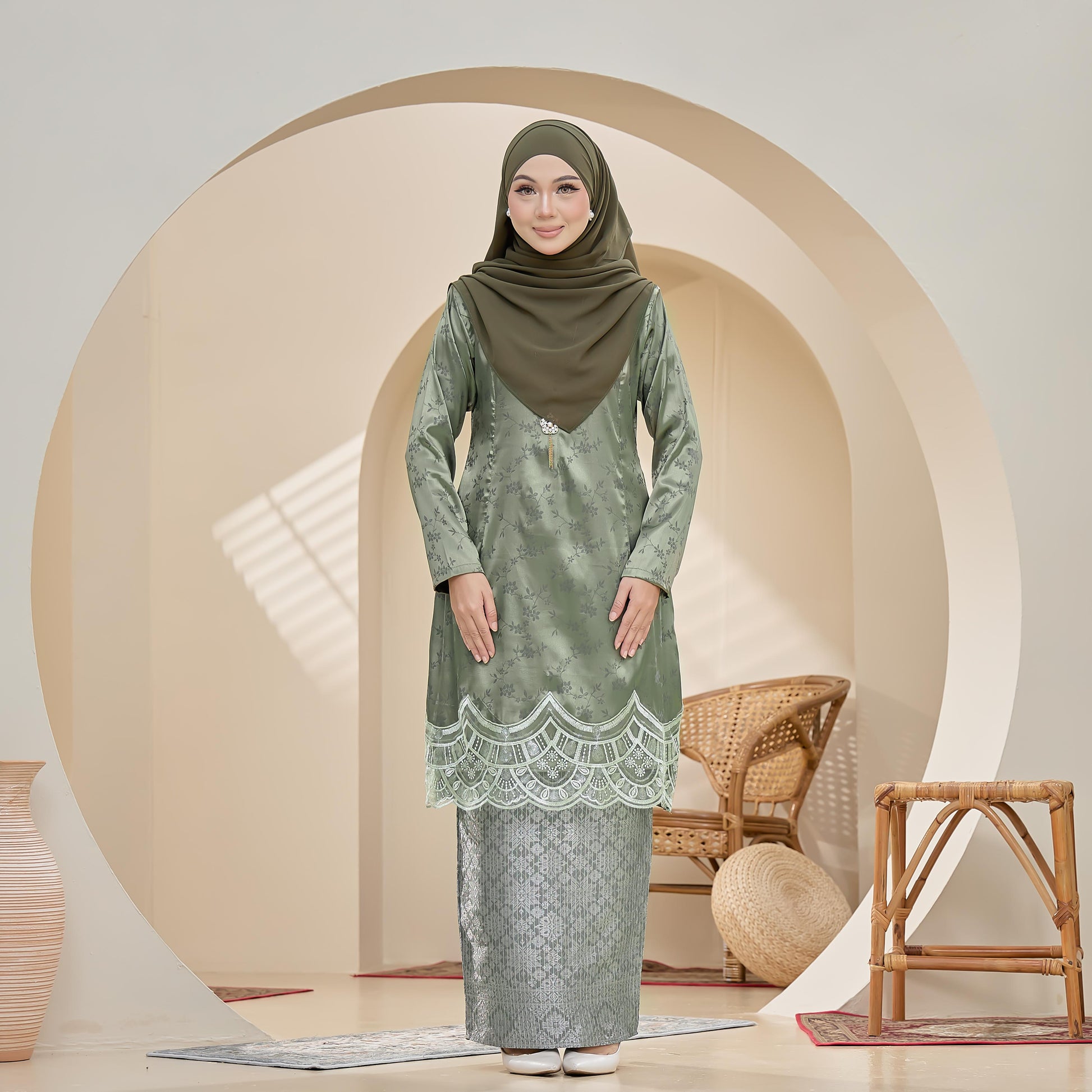 The Audrena Kurung features a Sutera Luminous Jacquard top and Songket skirt. It has a susun belakang skirt and chest and wrist zips for easy nursing and wudhu.