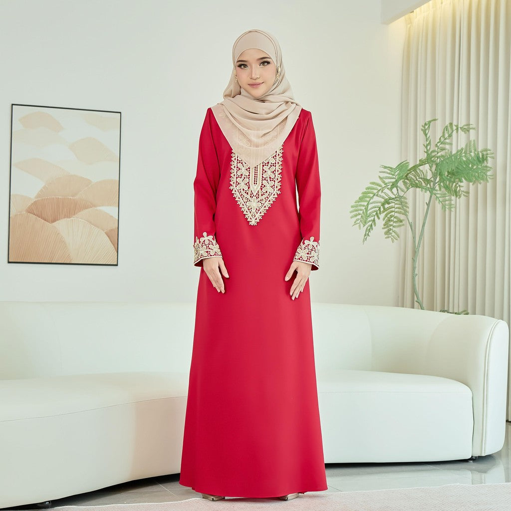 The Aylaa Jubah is made from soft Como Crepe with lace trim on the chest. It has a back zip and wrist zips for easy wudhu.