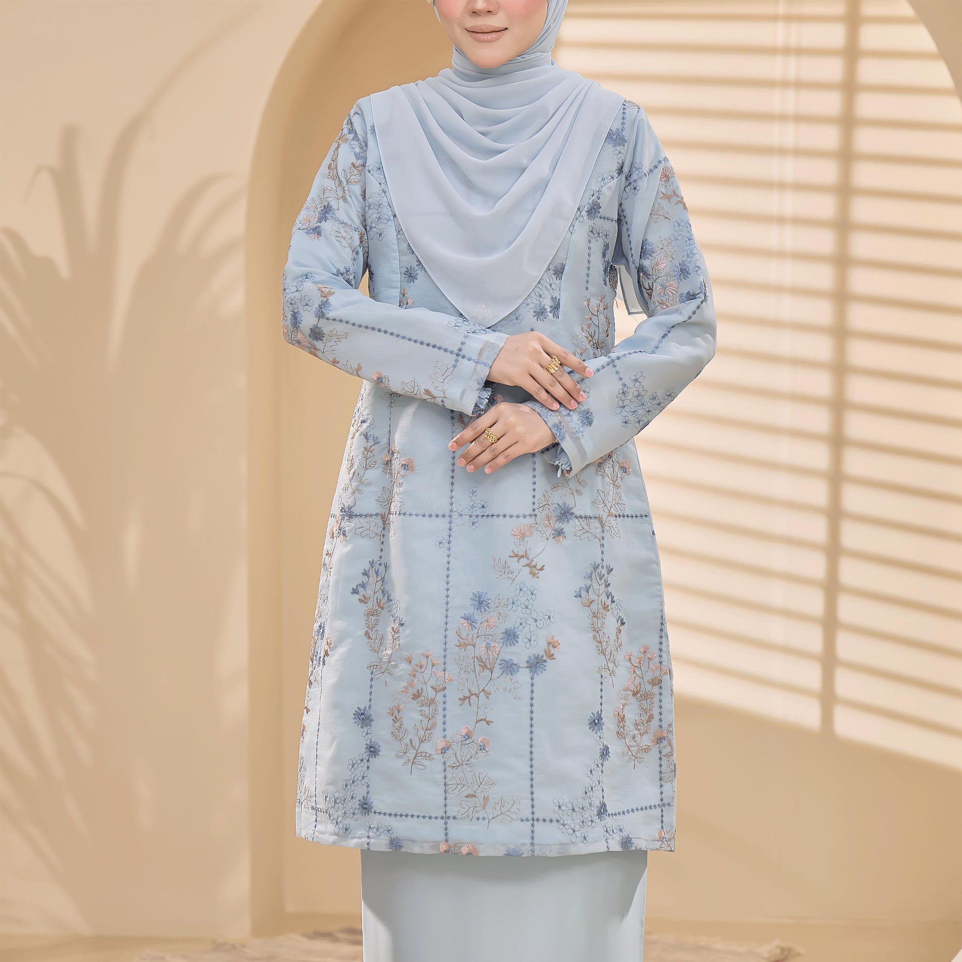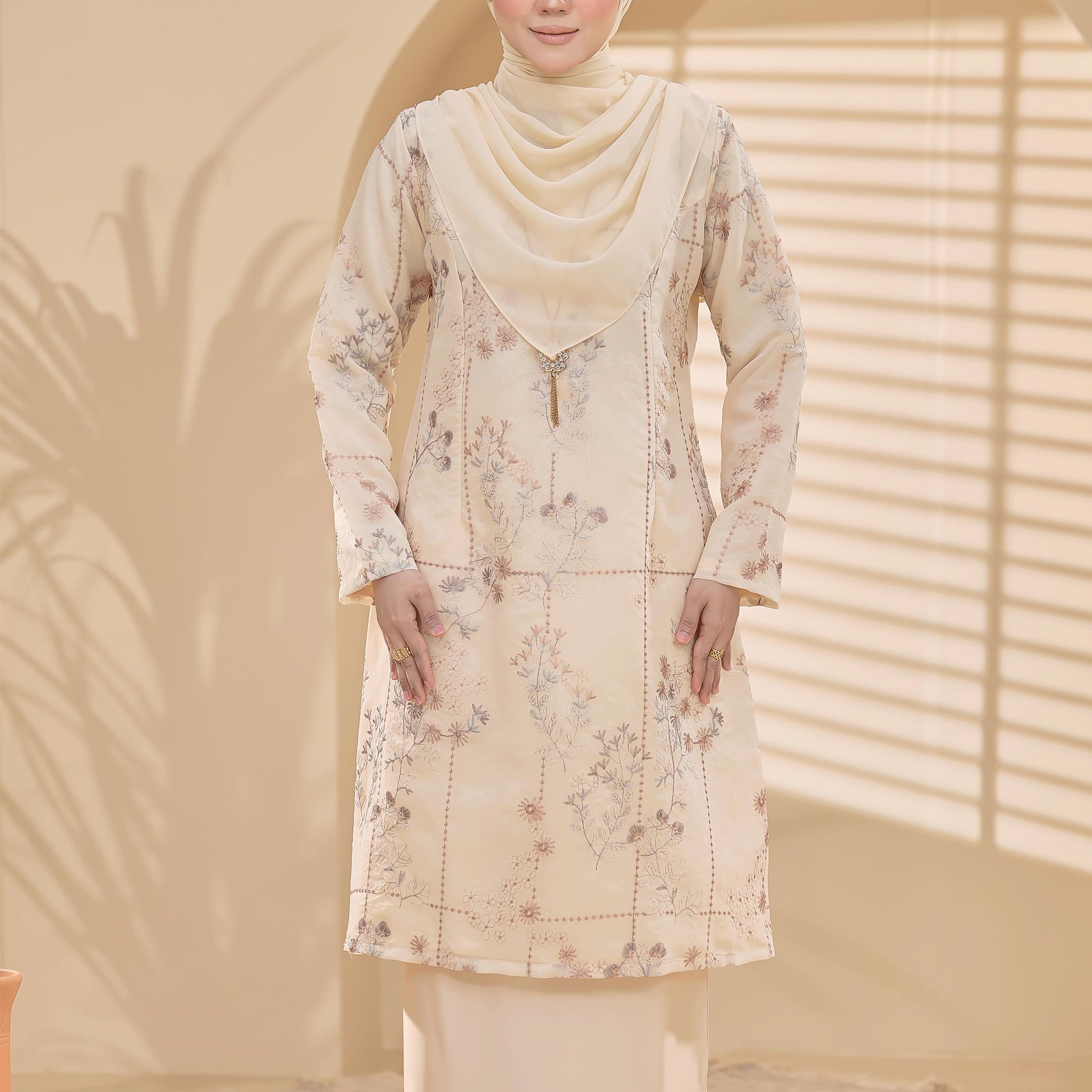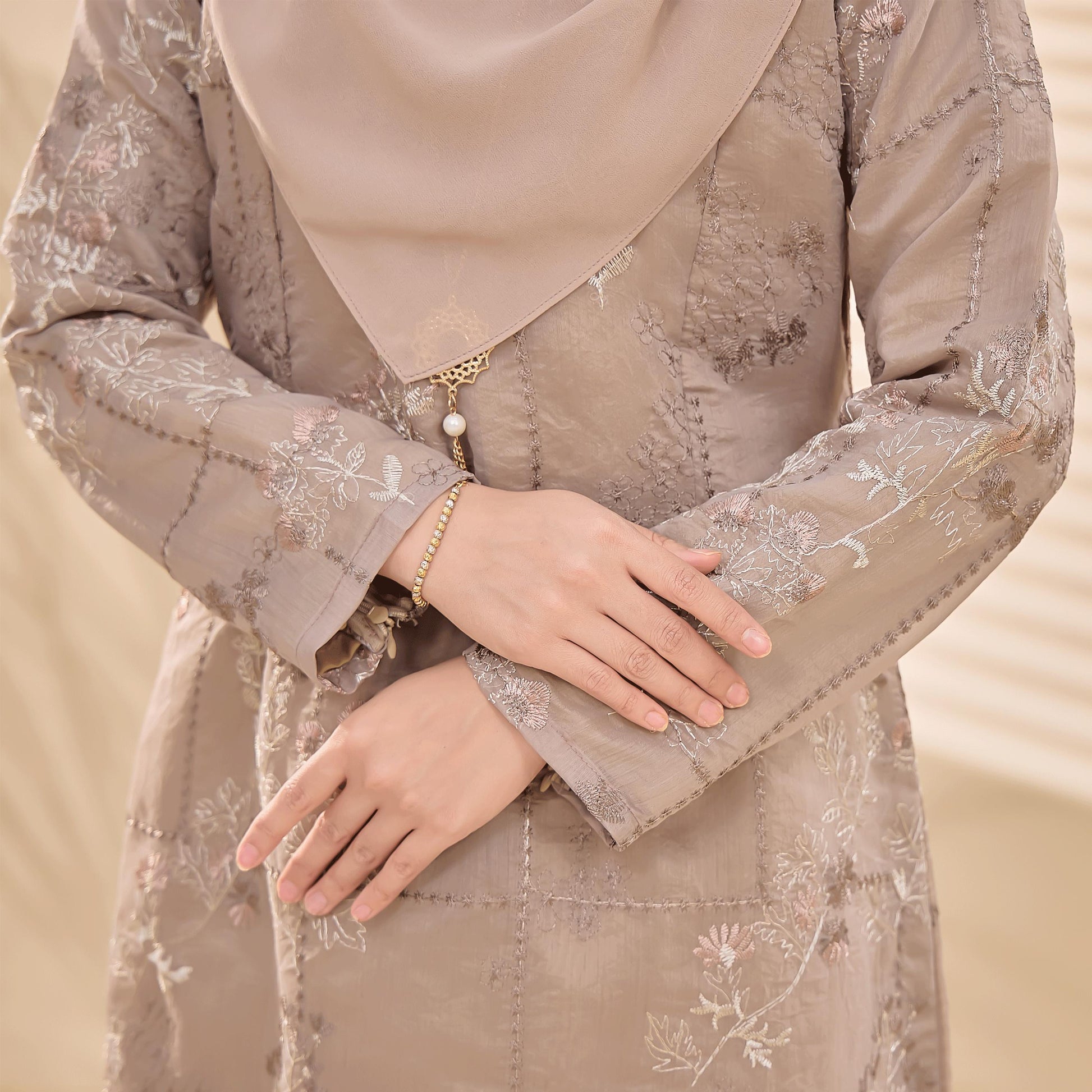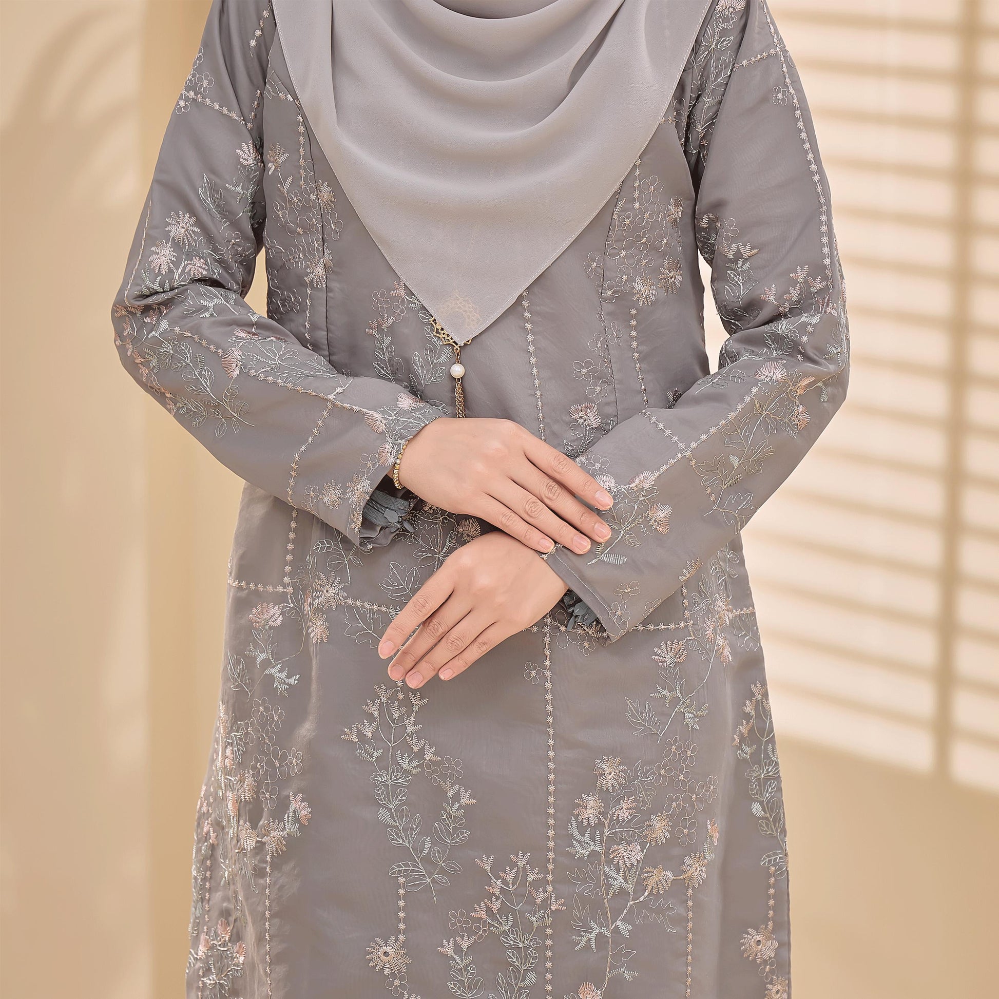 The Bianca Kurung is made from comfortable Tensilk Embroidery and Sutera Luminous fabrics with floral embroidery. It has a susun belakang skirt, a chest zip for easy nursing, and wrist zips for wudhu access.