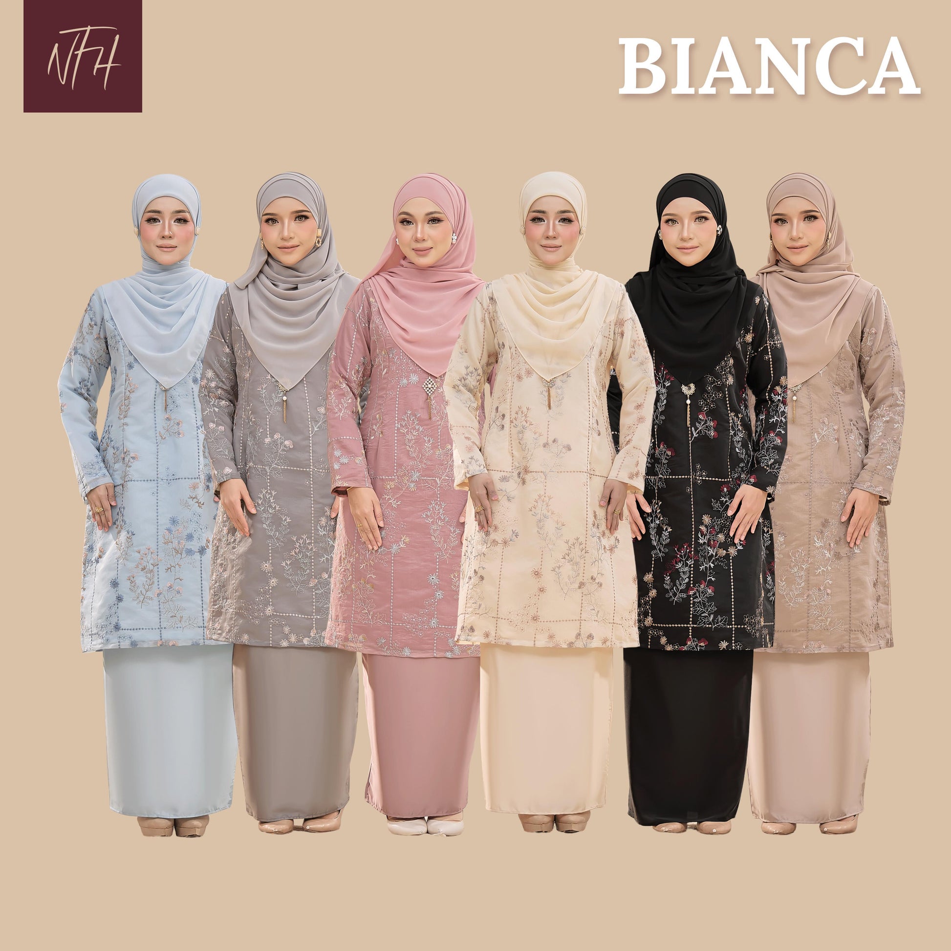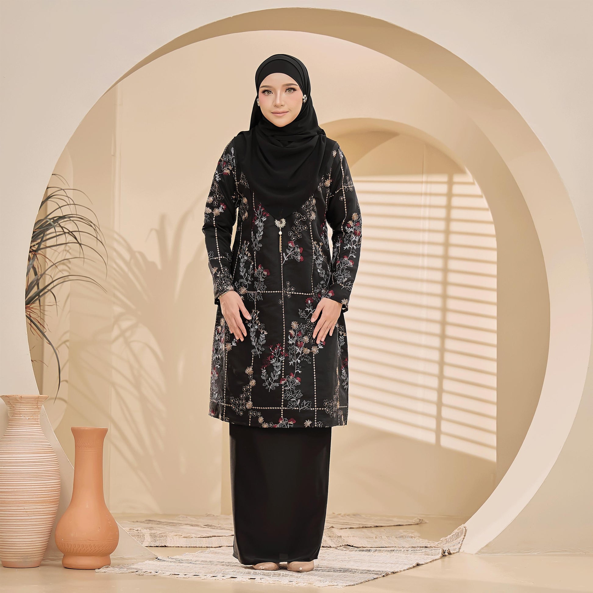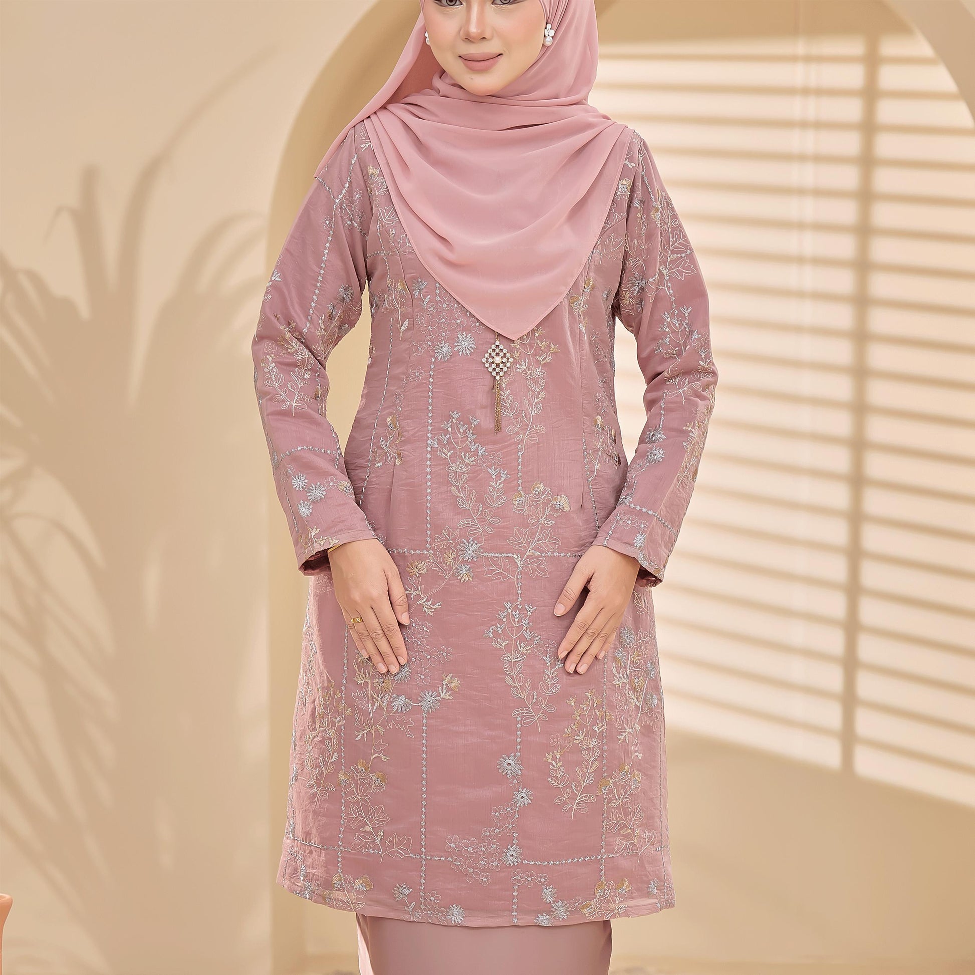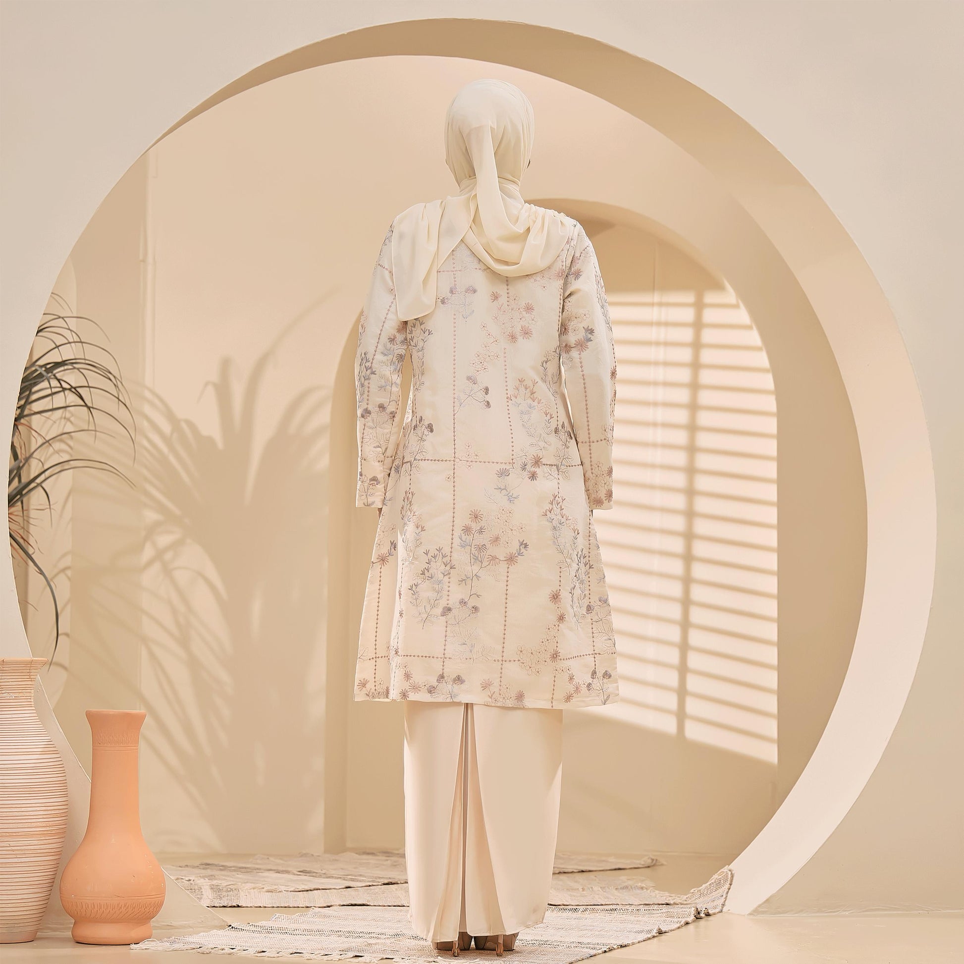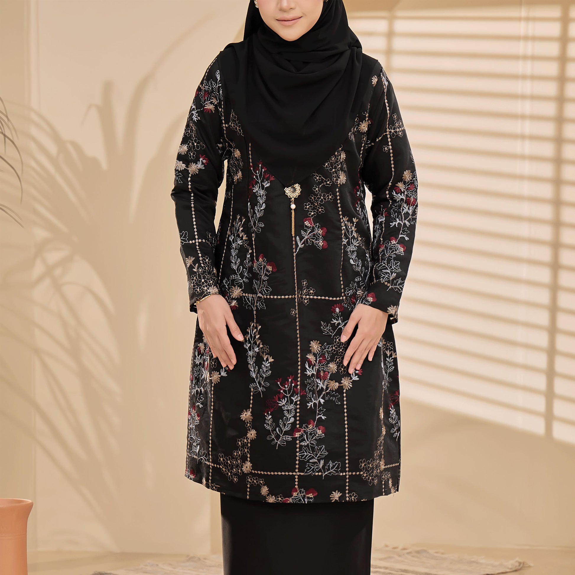 The Bianca Kurung is made from comfortable Tensilk Embroidery and Sutera Luminous fabrics with floral embroidery. It has a susun belakang skirt, a chest zip for easy nursing, and wrist zips for wudhu access.