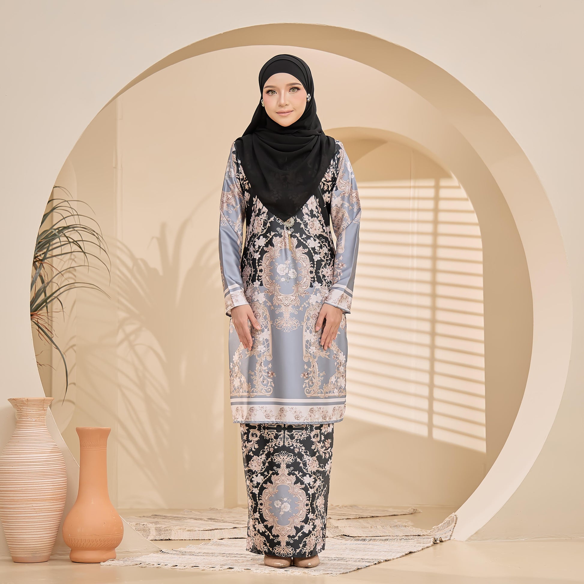 Made from Sutera Luminous, the Carrosa Kurung has a floral print and Susun Belakang skirt. It includes a chest zip for easy nursing and wrist zips for convenient wudhu.