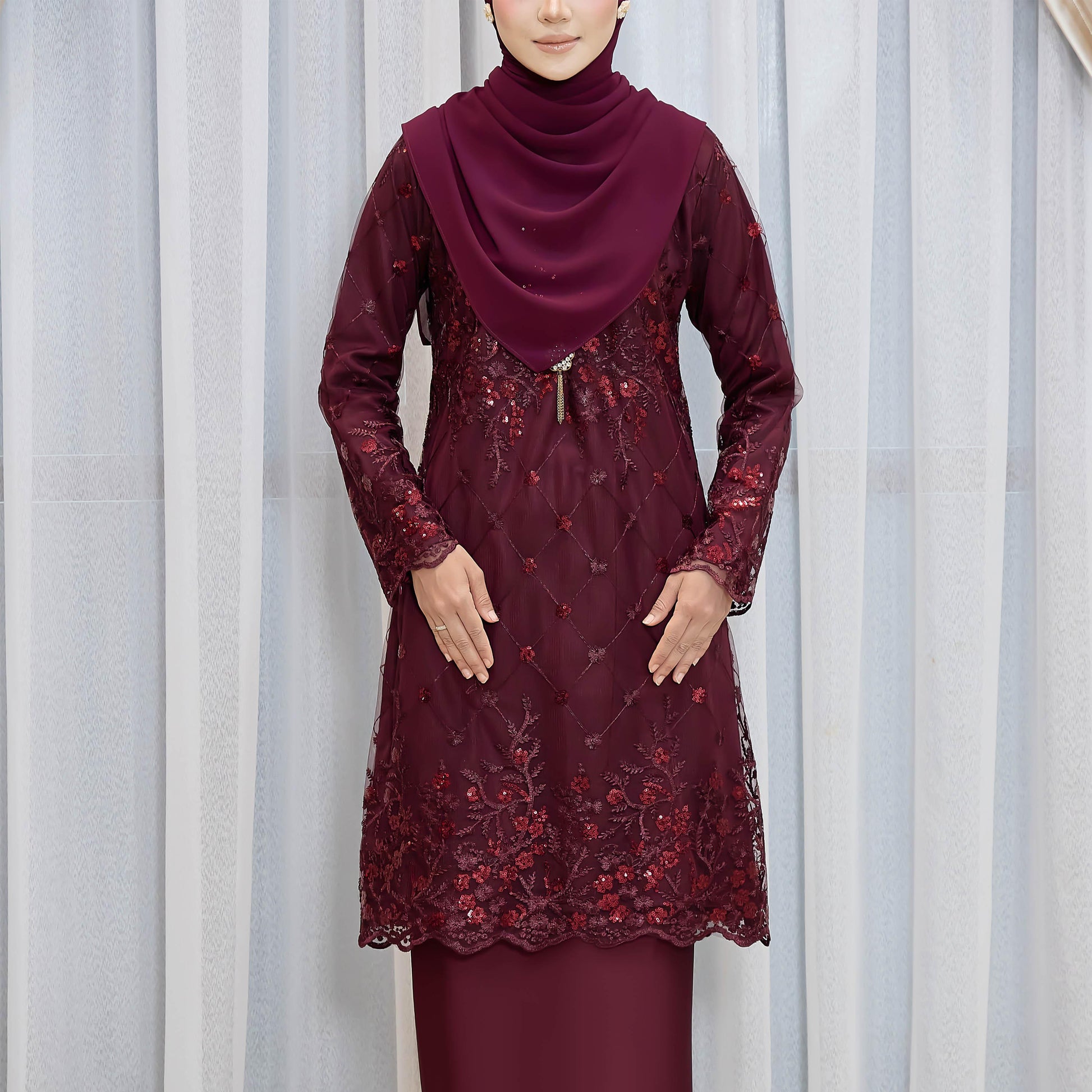 The Cassie Kurung is made from Sutera Luminous fabric with a floral lace and sequin design. It has a susun belakang skirt for ease of movement, plus chest and wrist zip closures for nursing and wudhu convenience.