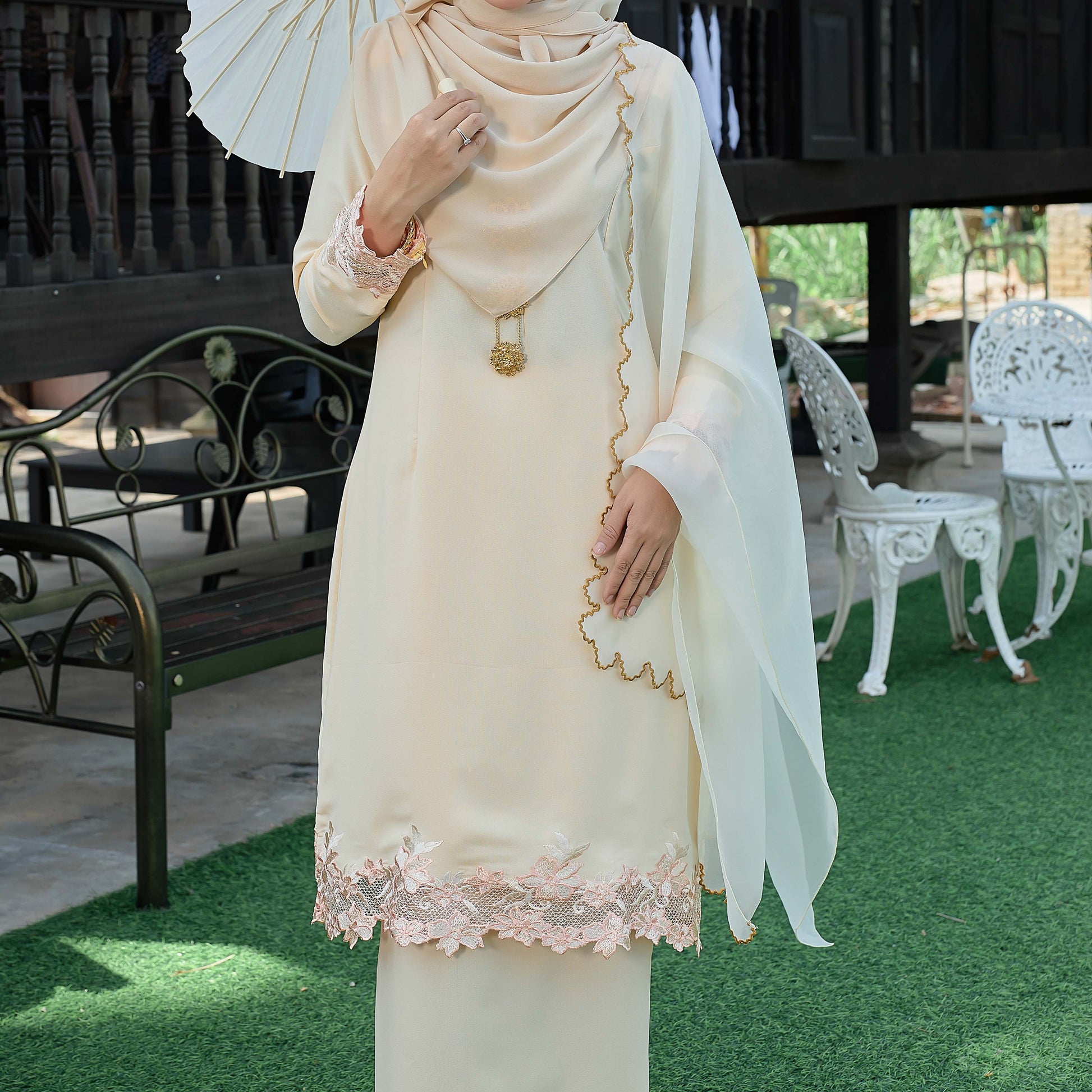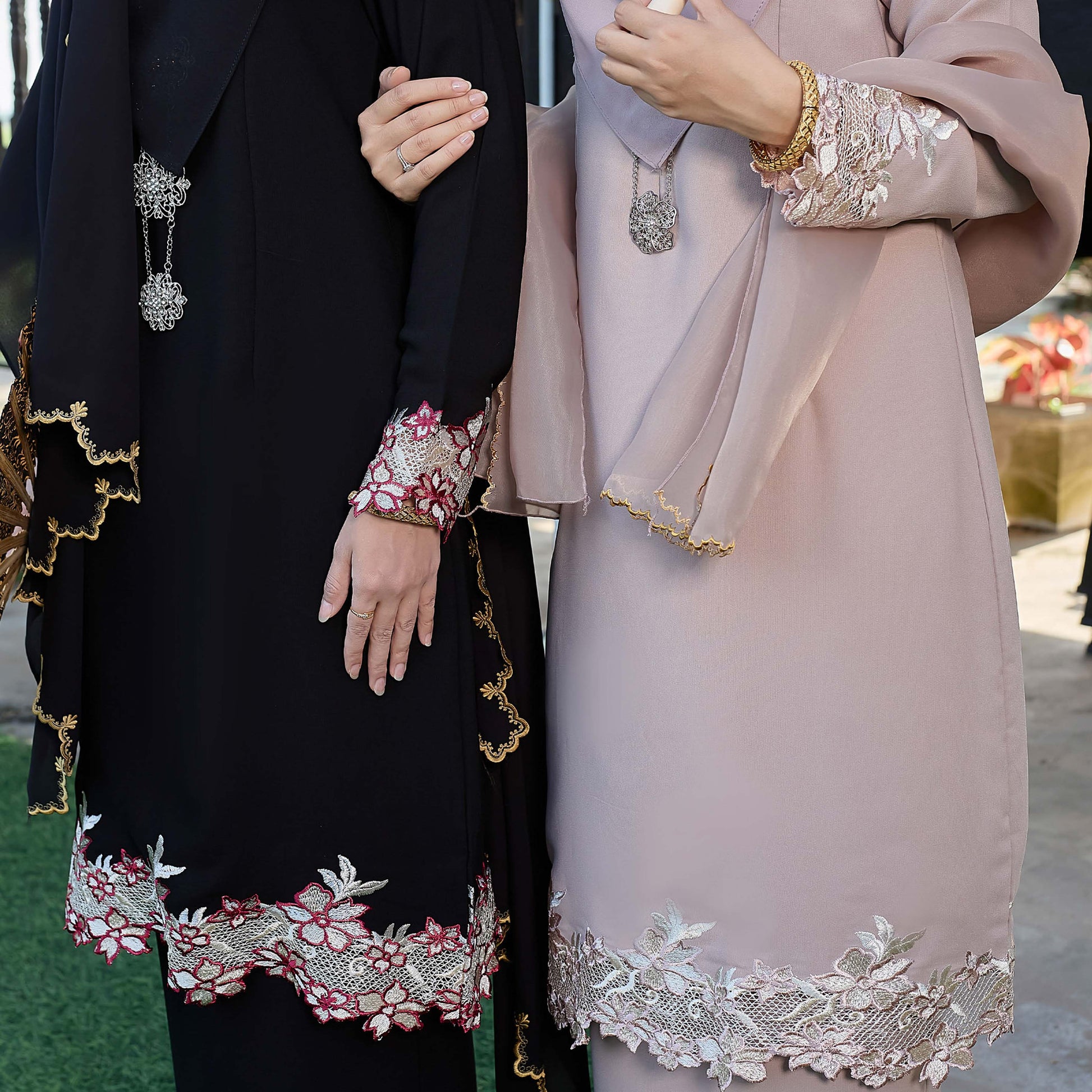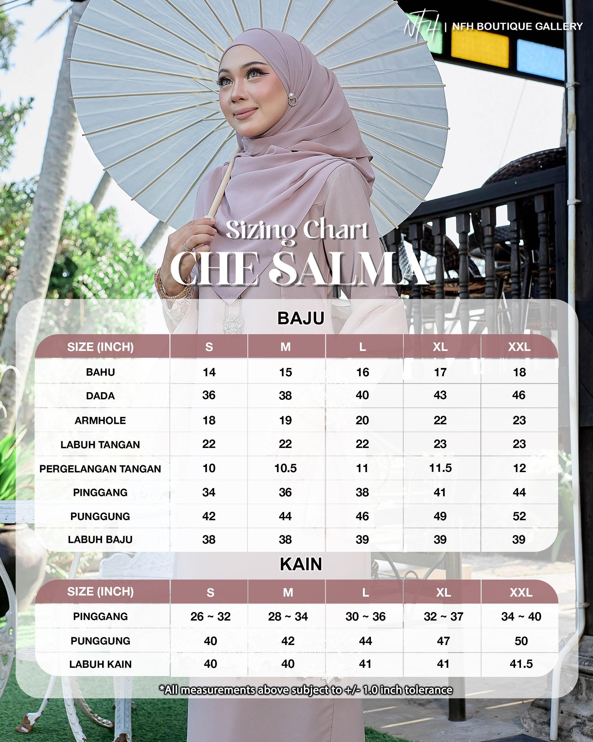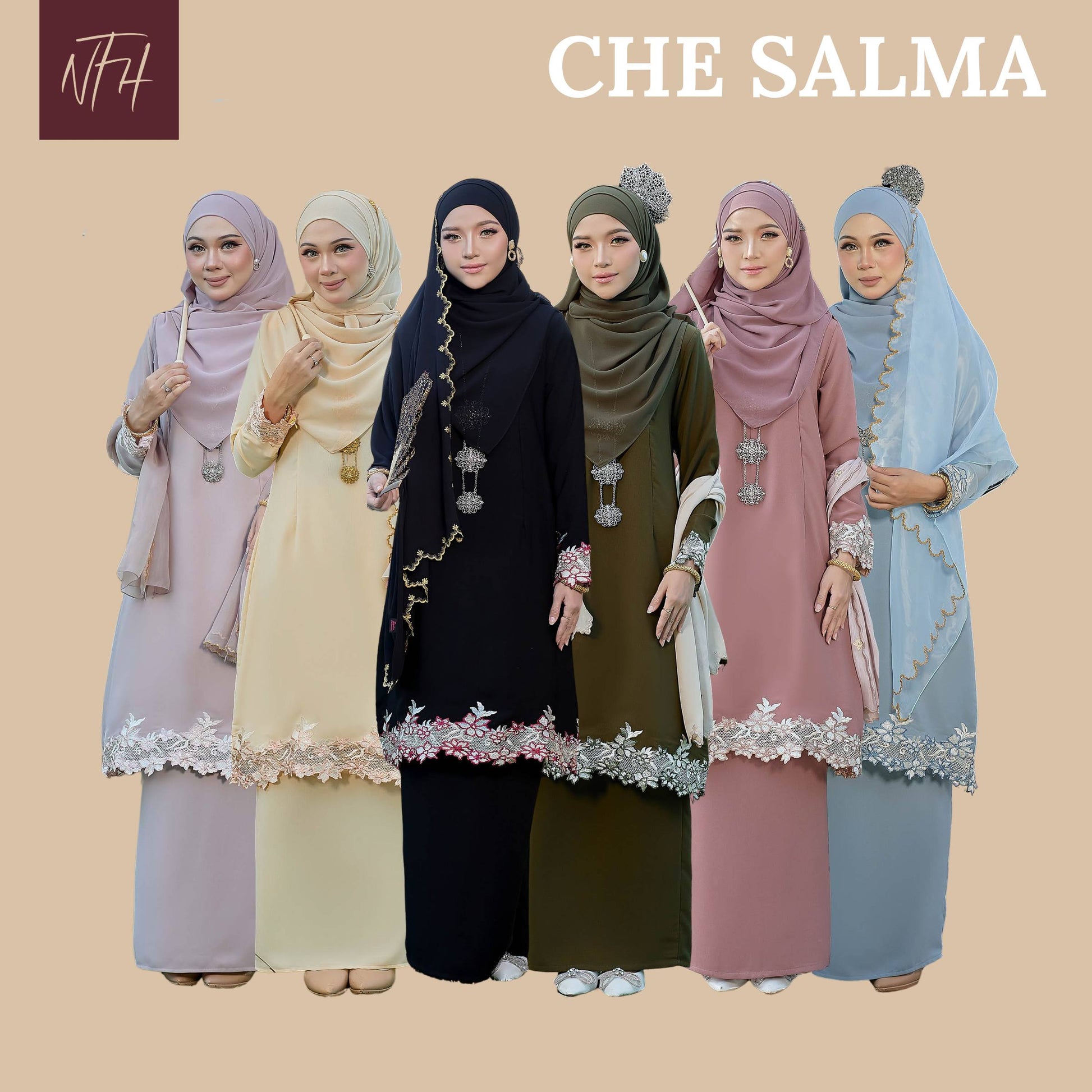 The Che Salma Kurung features premium Fusan embroidery with elegant floral details. This timeless traditional attire is perfect for special occasions while offering sophisticated craftsmanship.