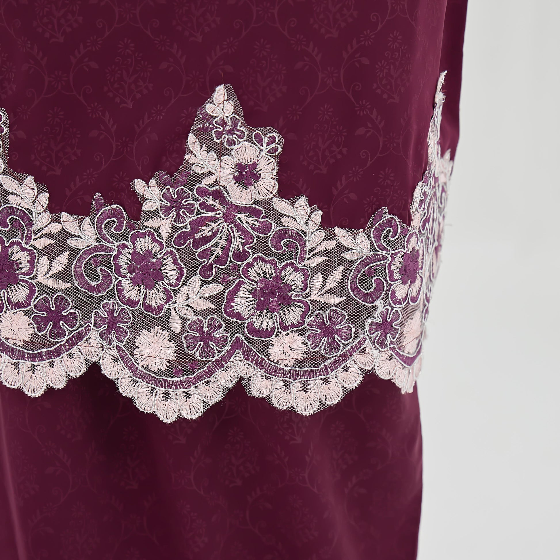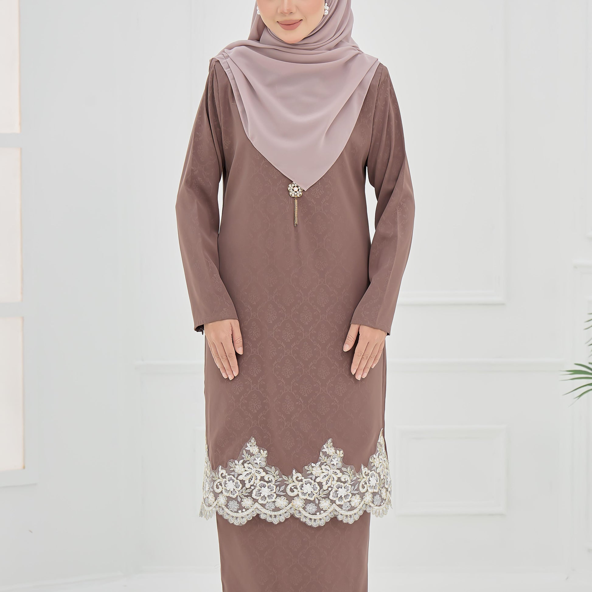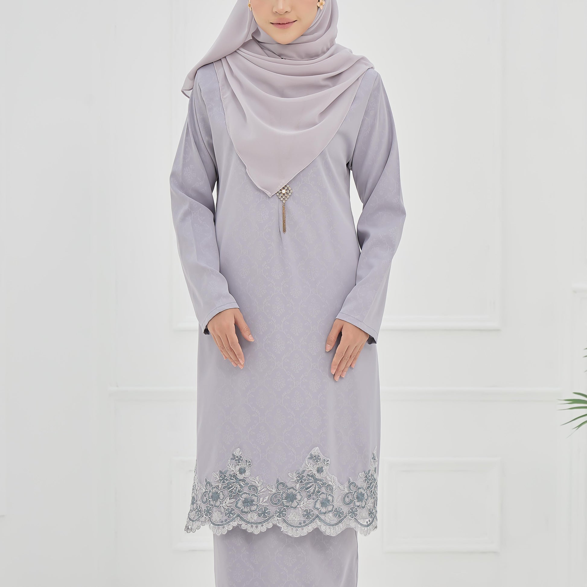 Made from embossed Pokka silk with lace trim, the Elaine Kurung features a layered skirt and practical zippers for easy nursing and wudhu.