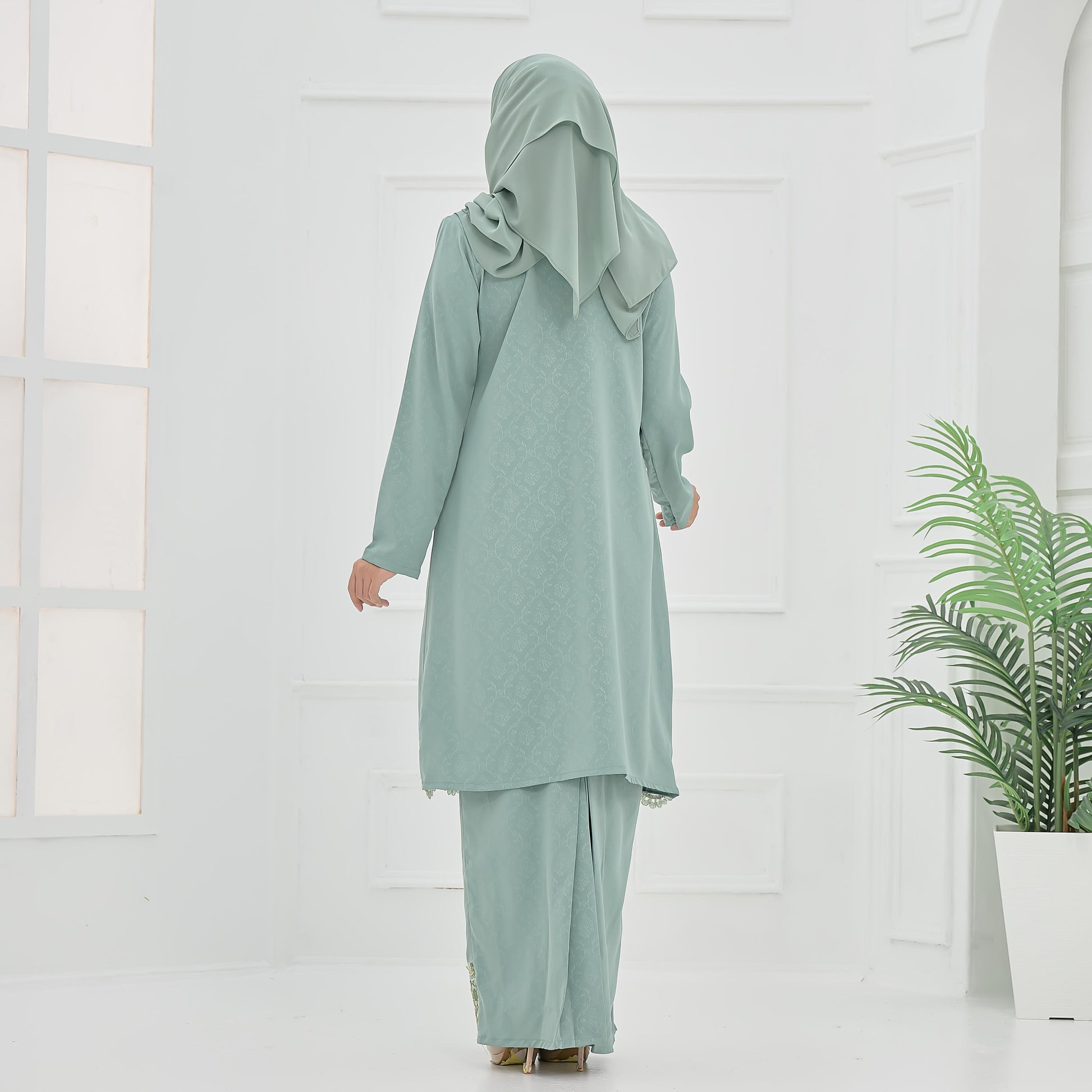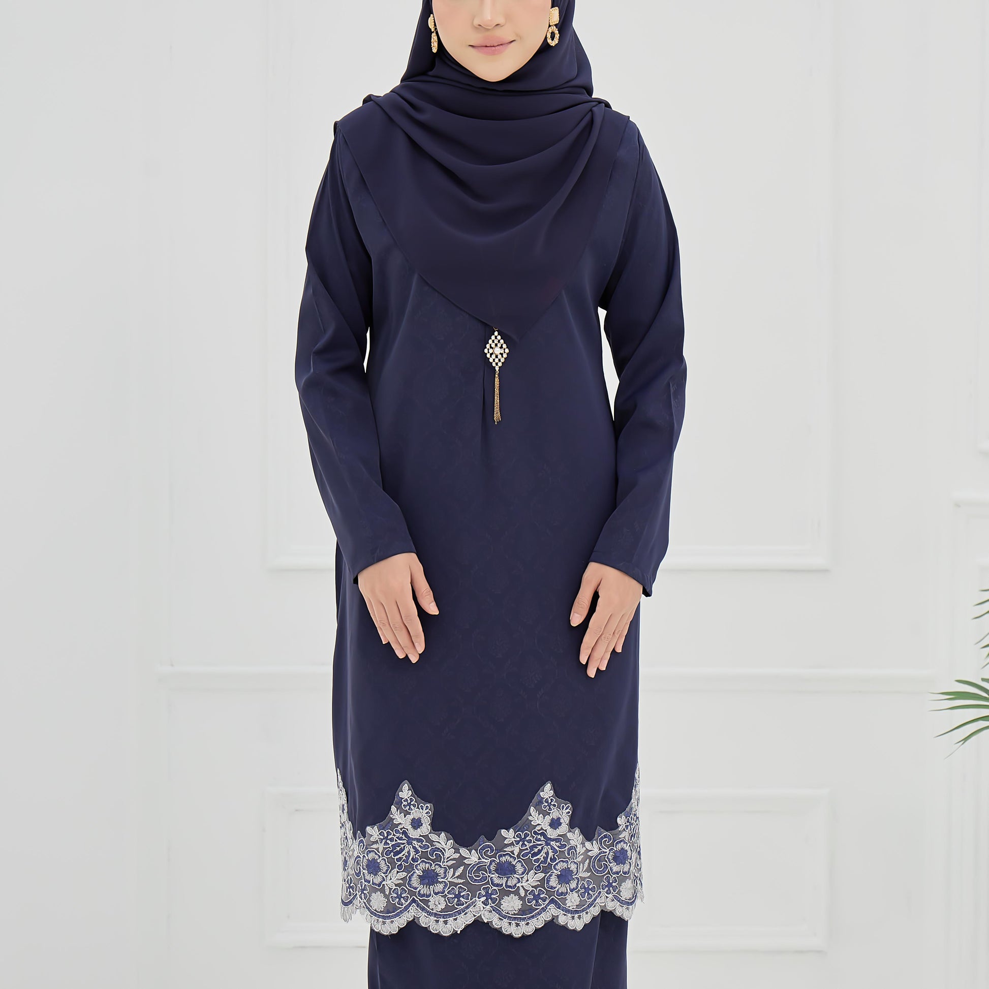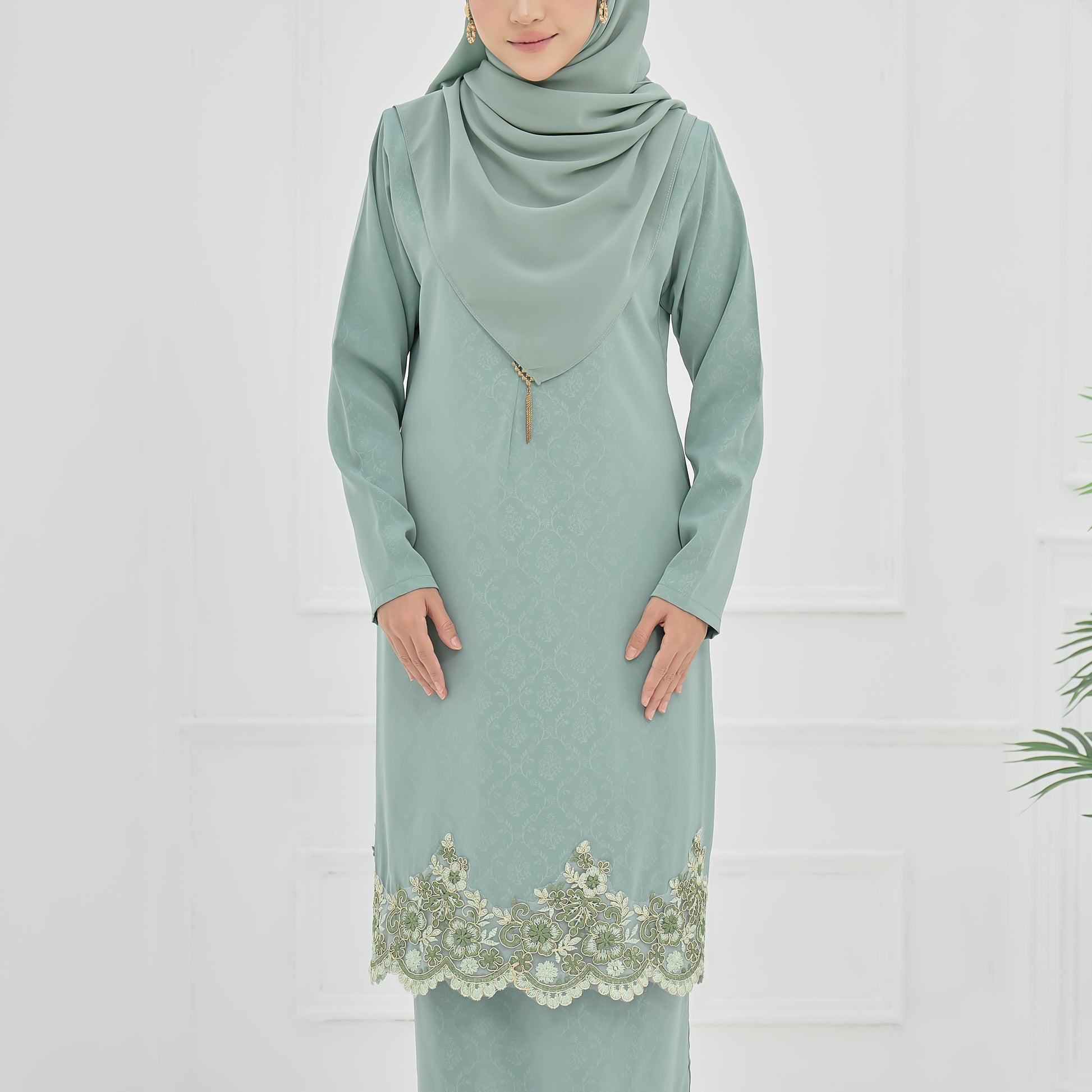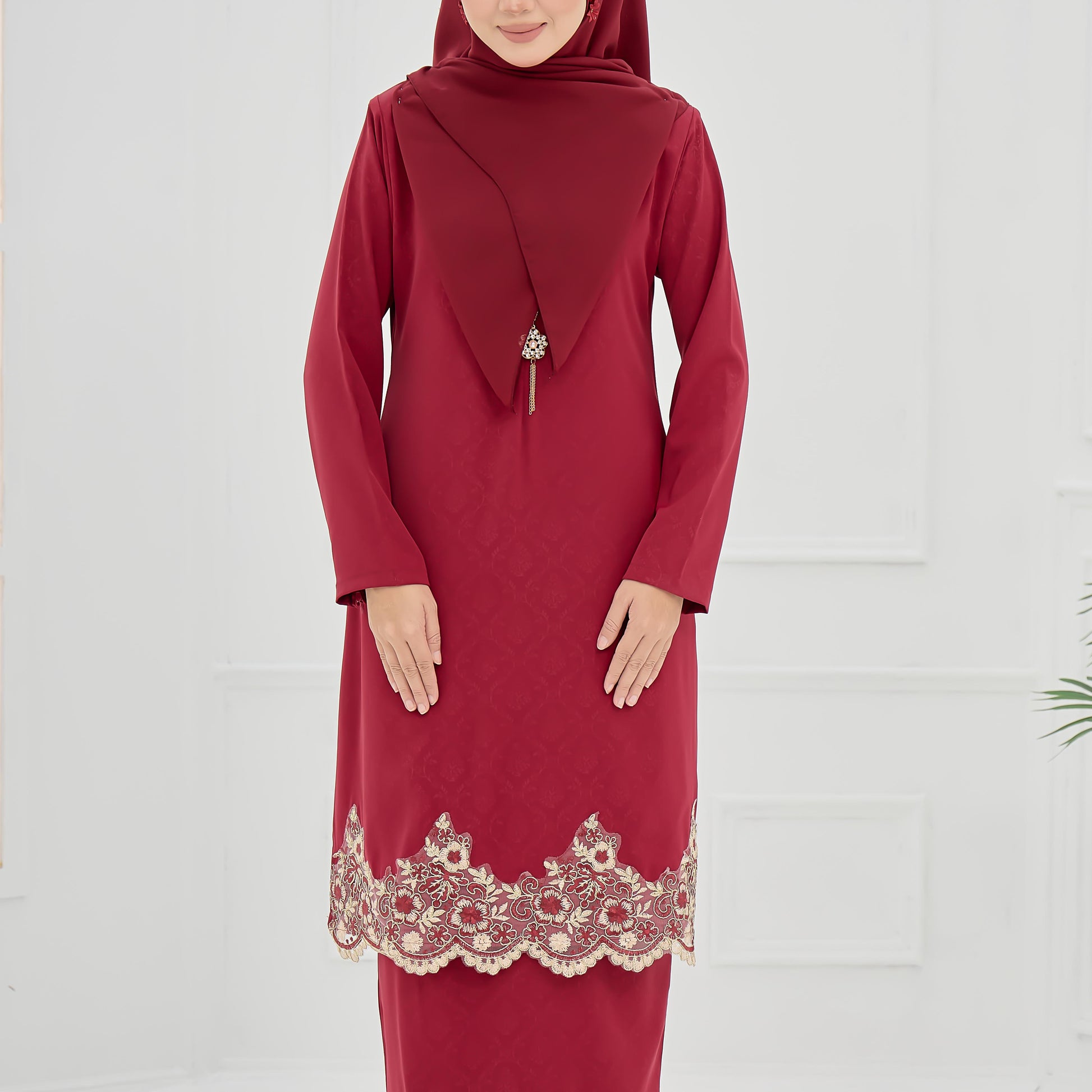Made from embossed Pokka silk with lace trim, the Elaine Kurung features a layered skirt and practical zippers for easy nursing and wudhu.