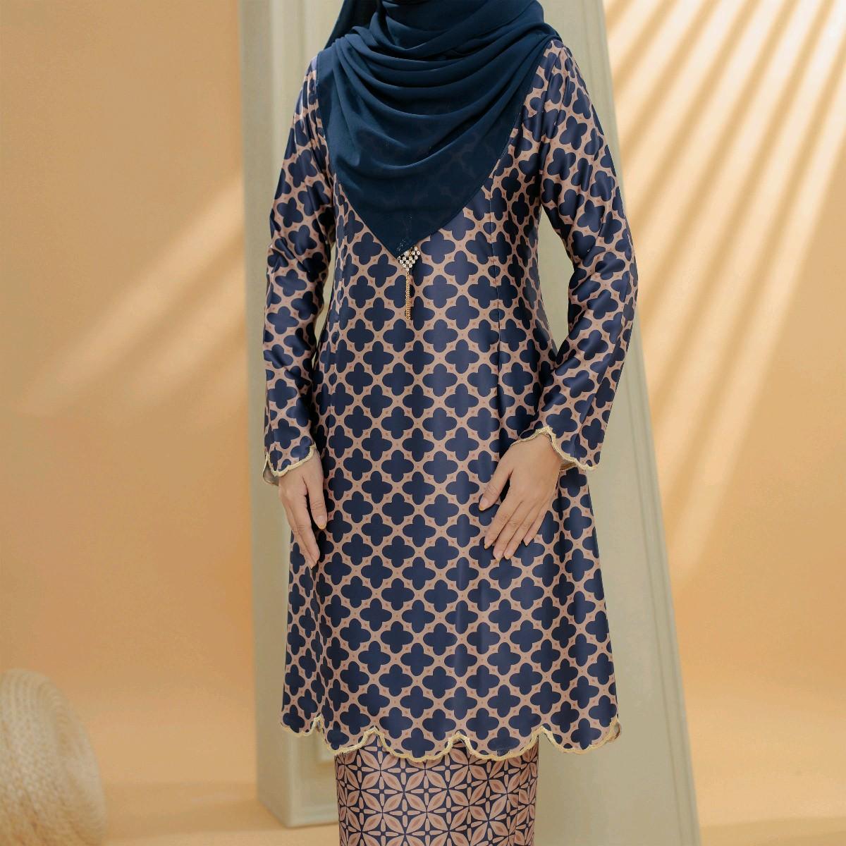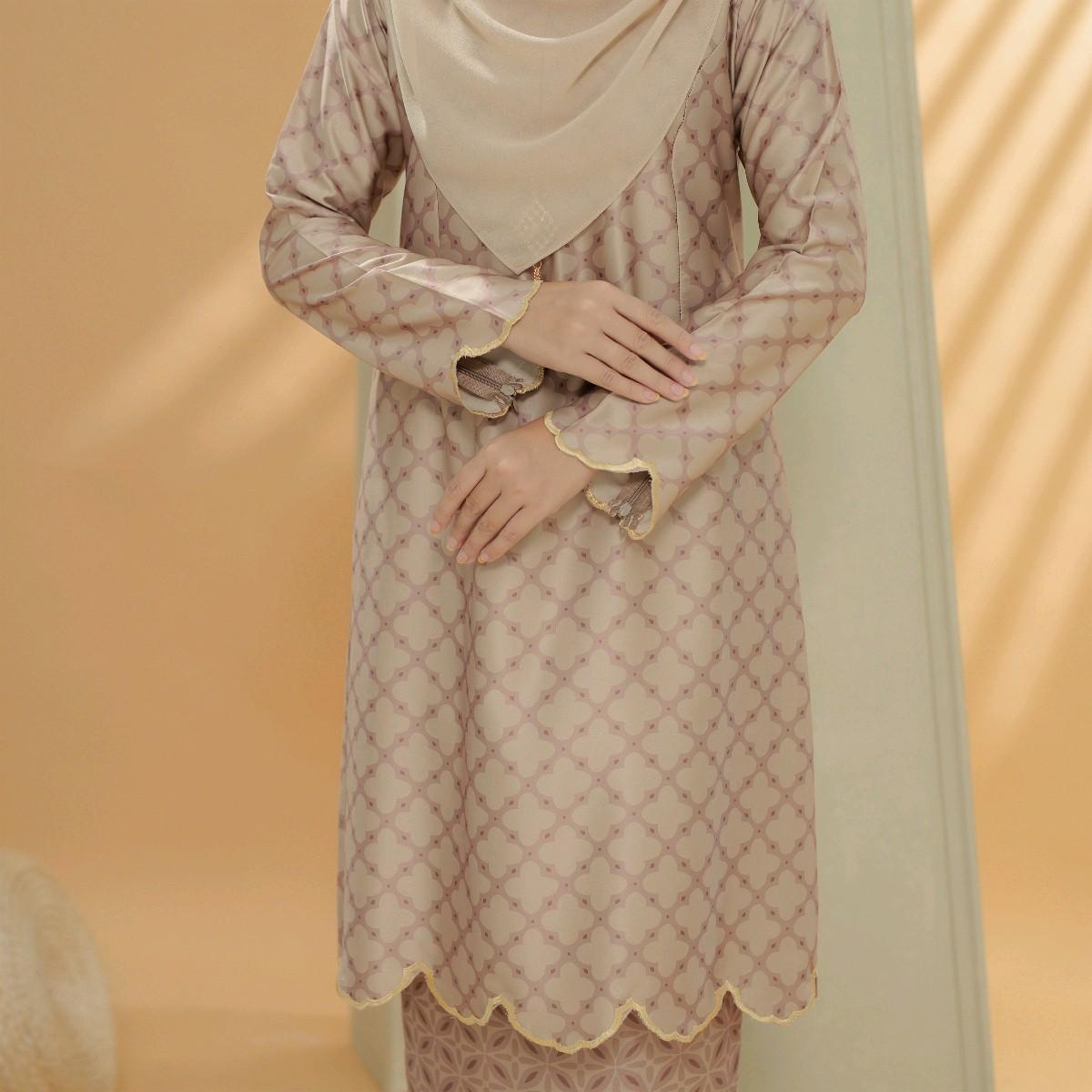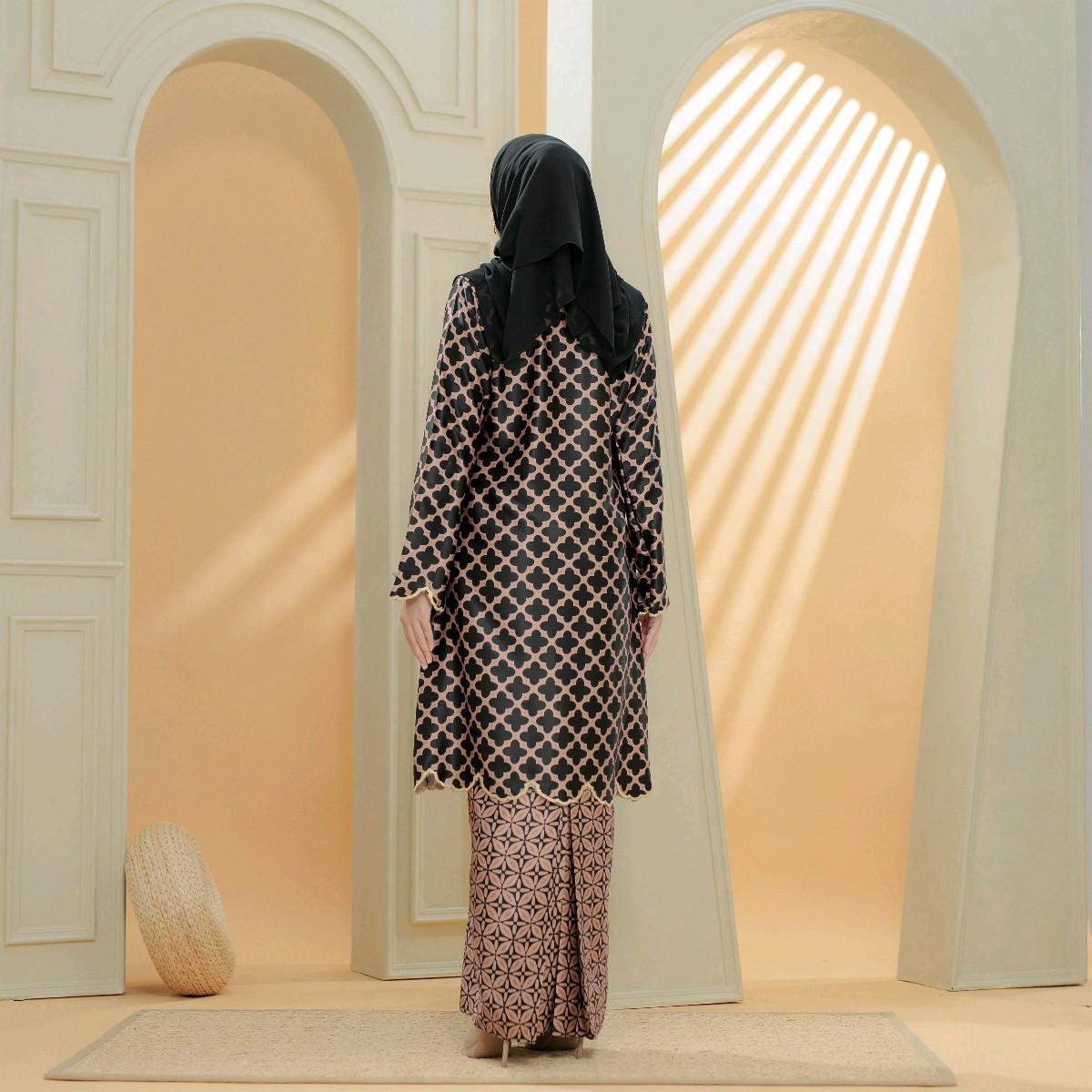 Dubai Silk Estilla Kurung with geometric print and embroidery. Features nursing-friendly chest zip, wudhu-friendly wrist zips, and Susun Belakang skirt design.