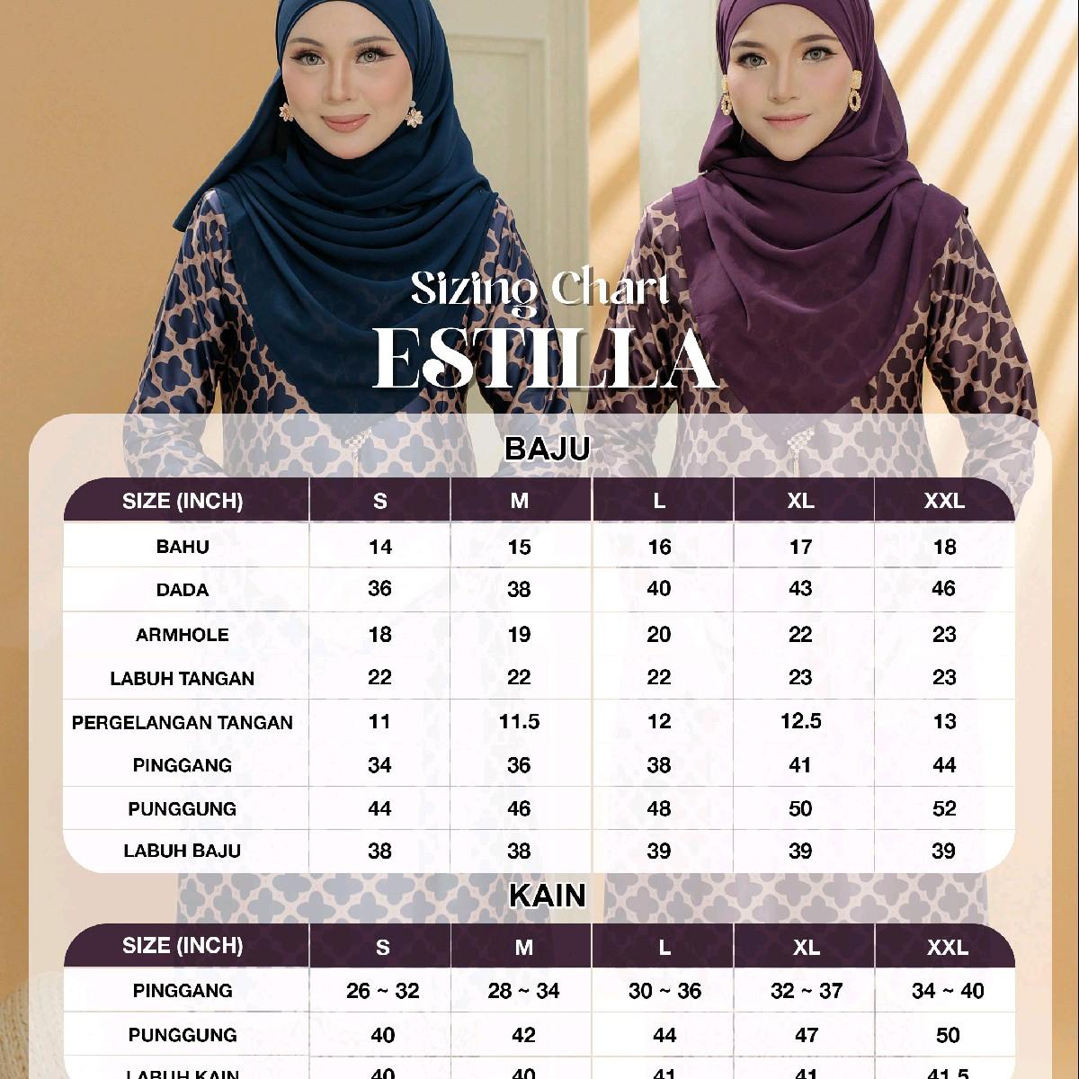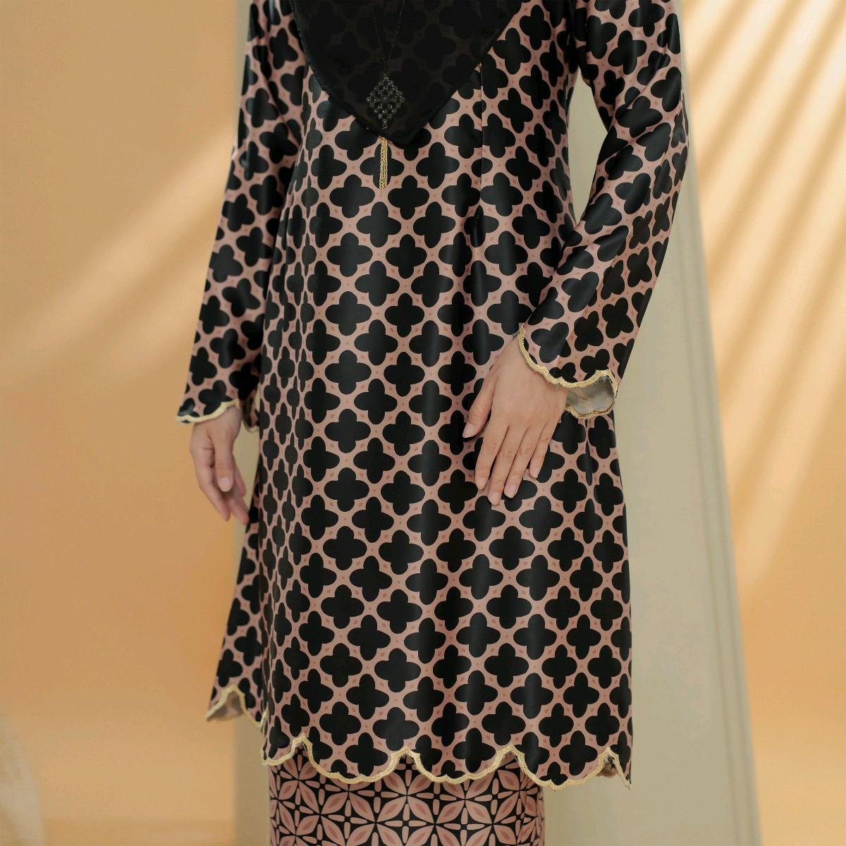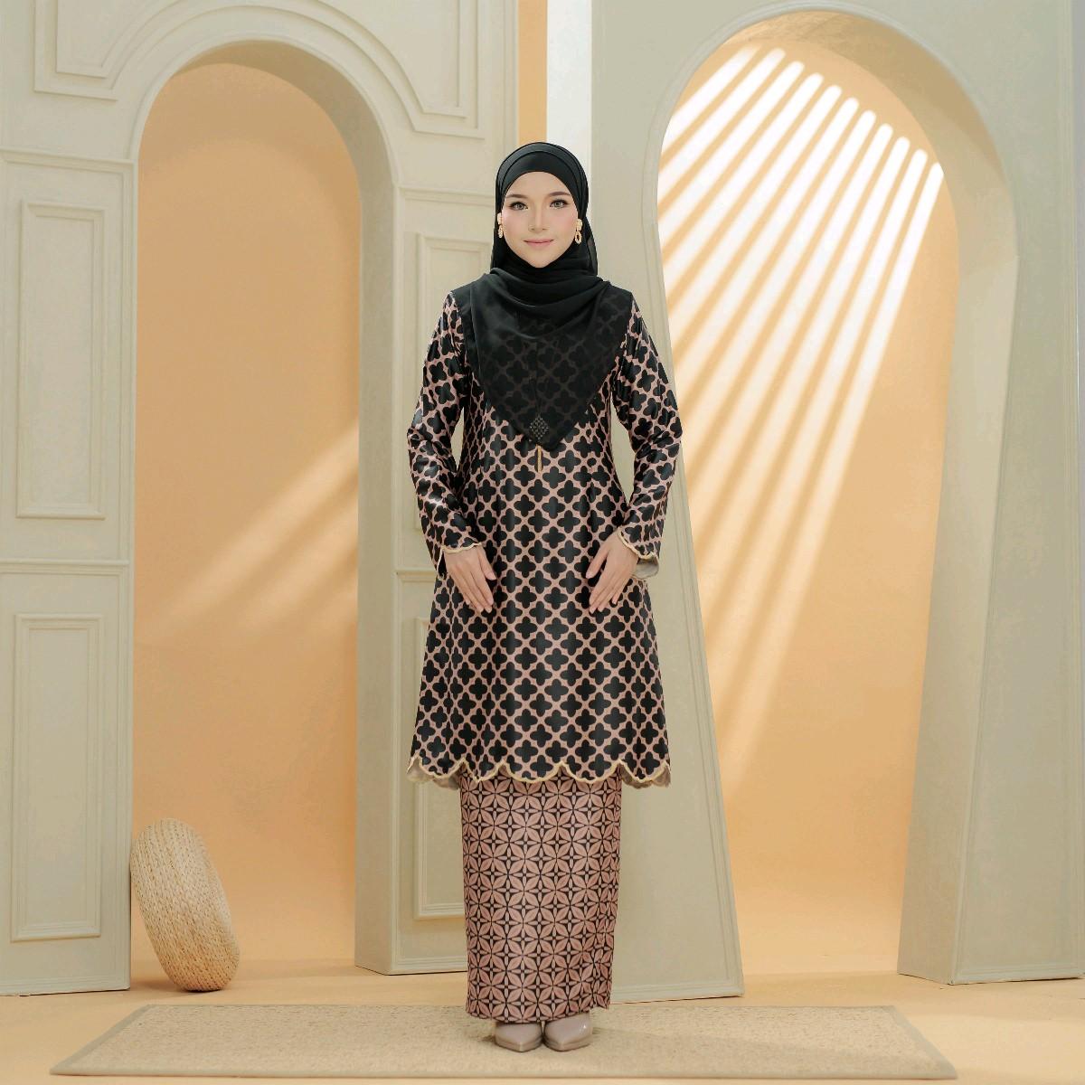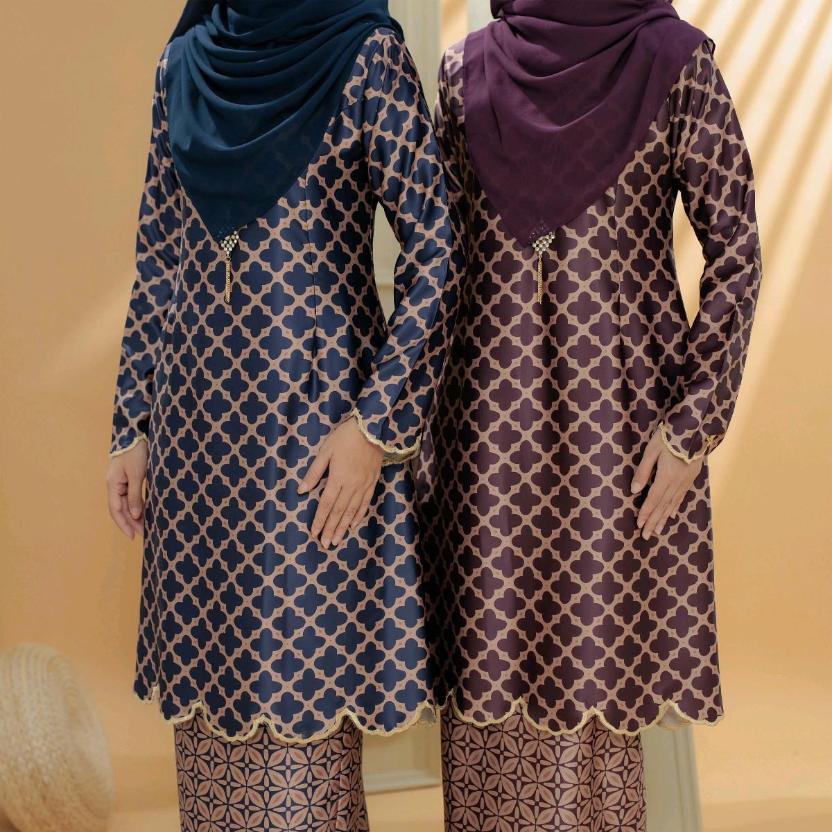Dubai Silk Estilla Kurung with geometric print and embroidery. Features nursing-friendly chest zip, wudhu-friendly wrist zips, and Susun Belakang skirt design.