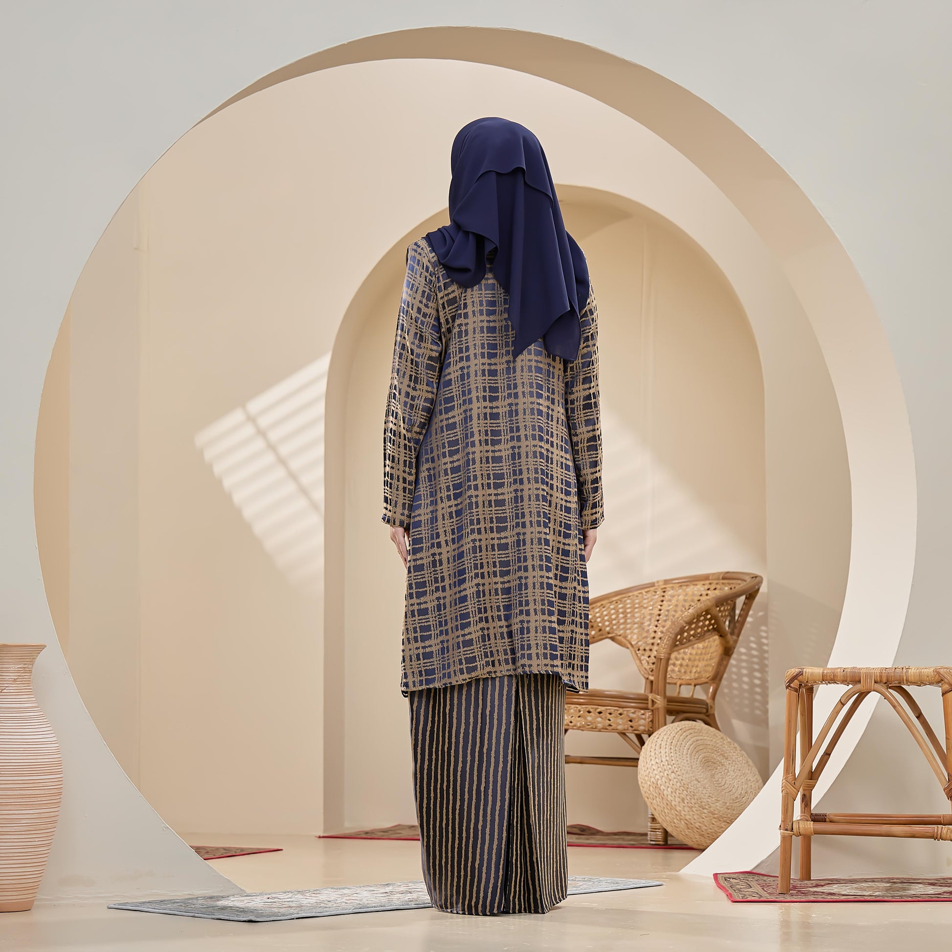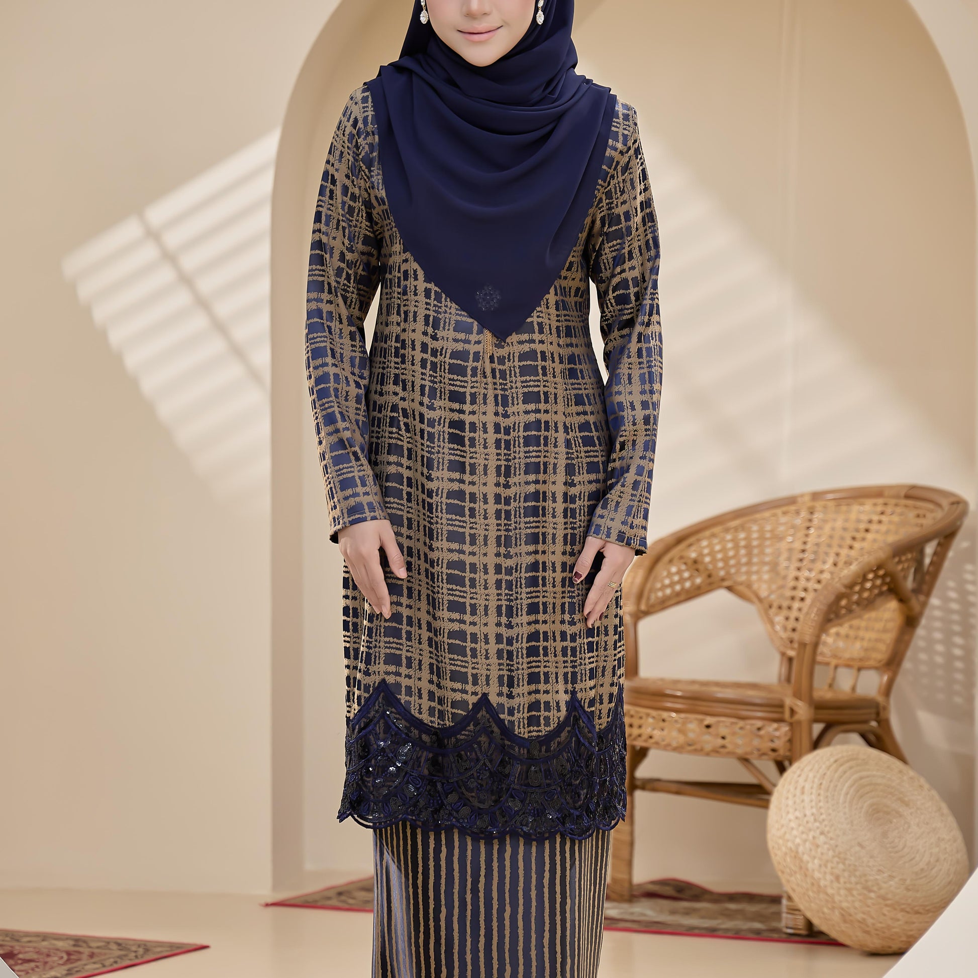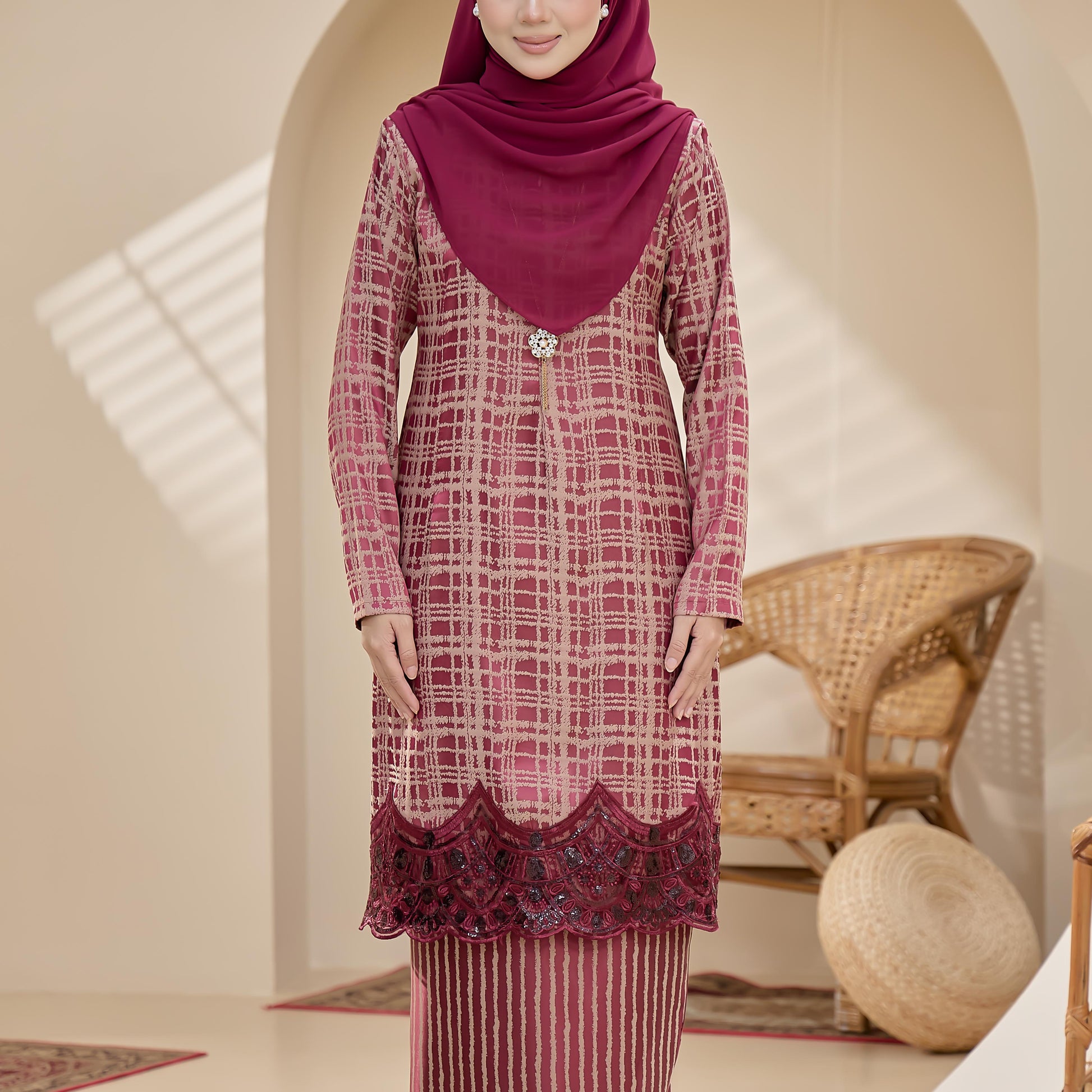 The Farabelle Kurung is made from Shanghai silk with a floral lace pattern and a Lipat Batik skirt. It includes a chest zip for nursing and a wrist zip for easy wudhu, combining comfort and functionality.