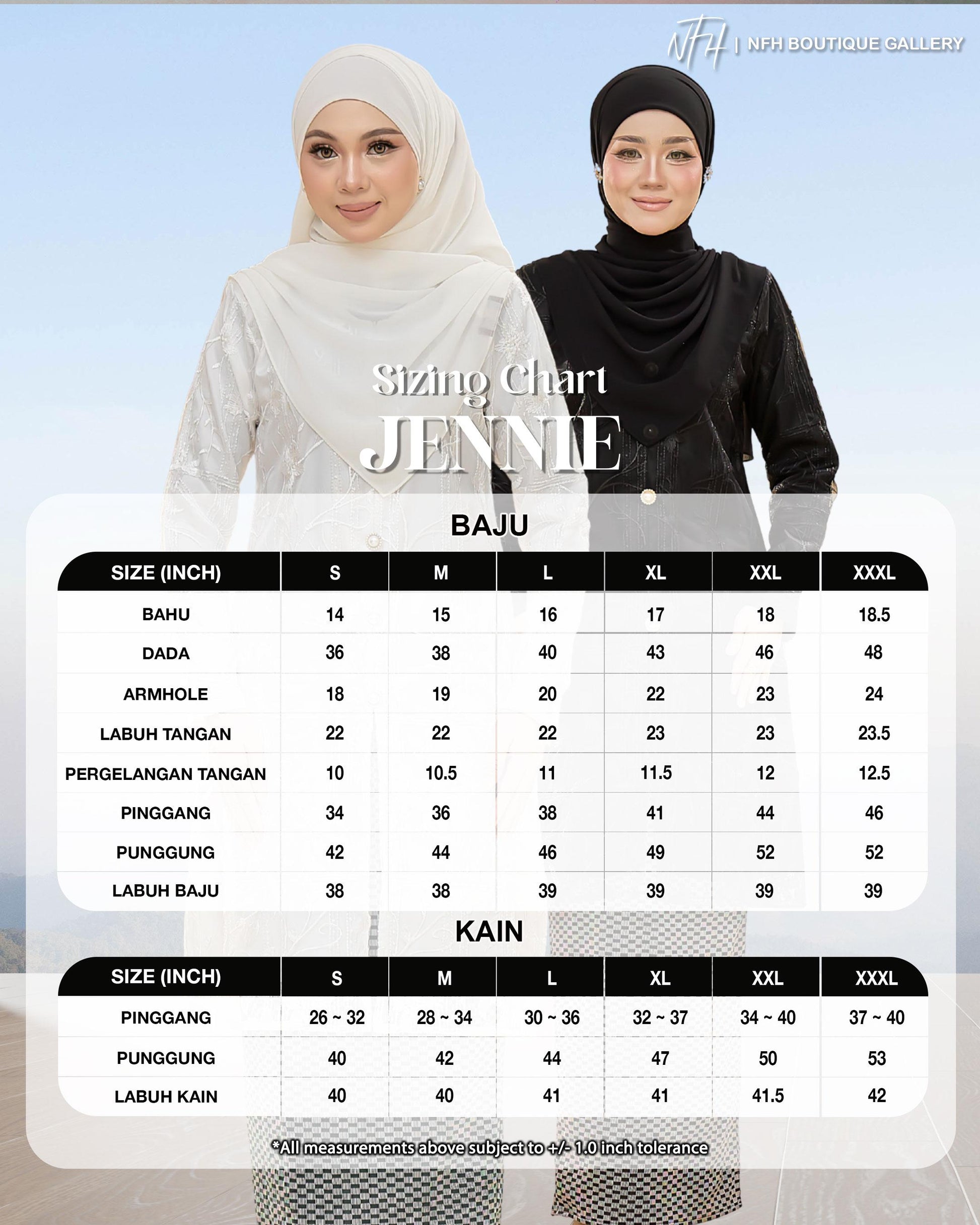 The Jennie Kurung is made from premium Uragiri lace with a floral pattern and a susun belakang skirt for a flattering shape. It has a chest zip for easy nursing and wrist zips to allow wudhu without removing the sleeves, combining style with practical features.