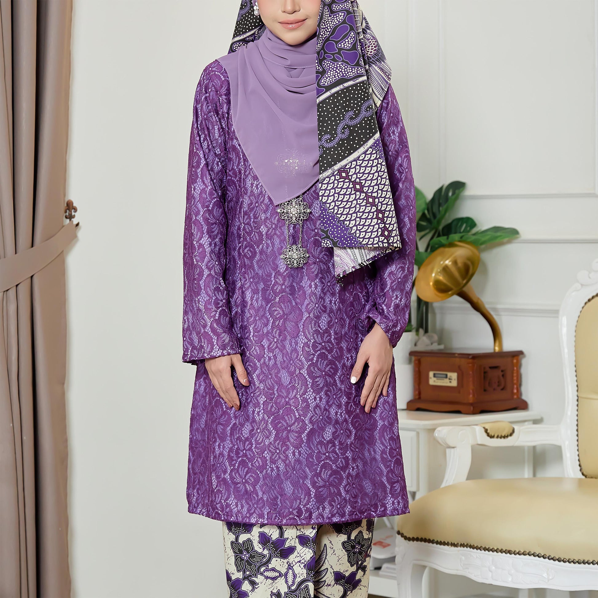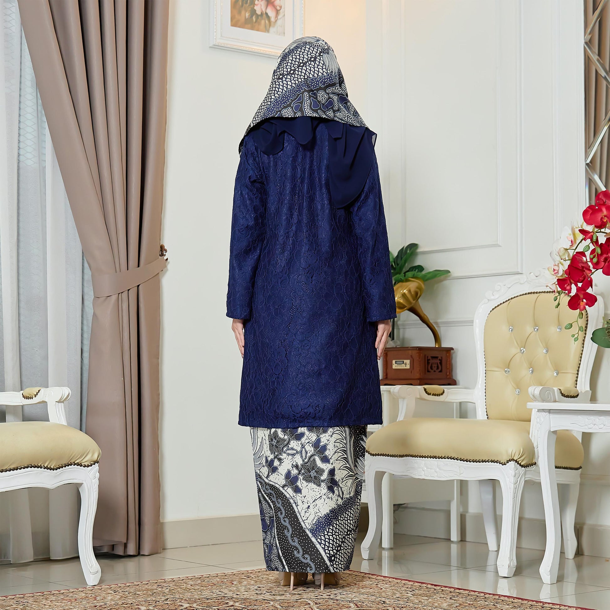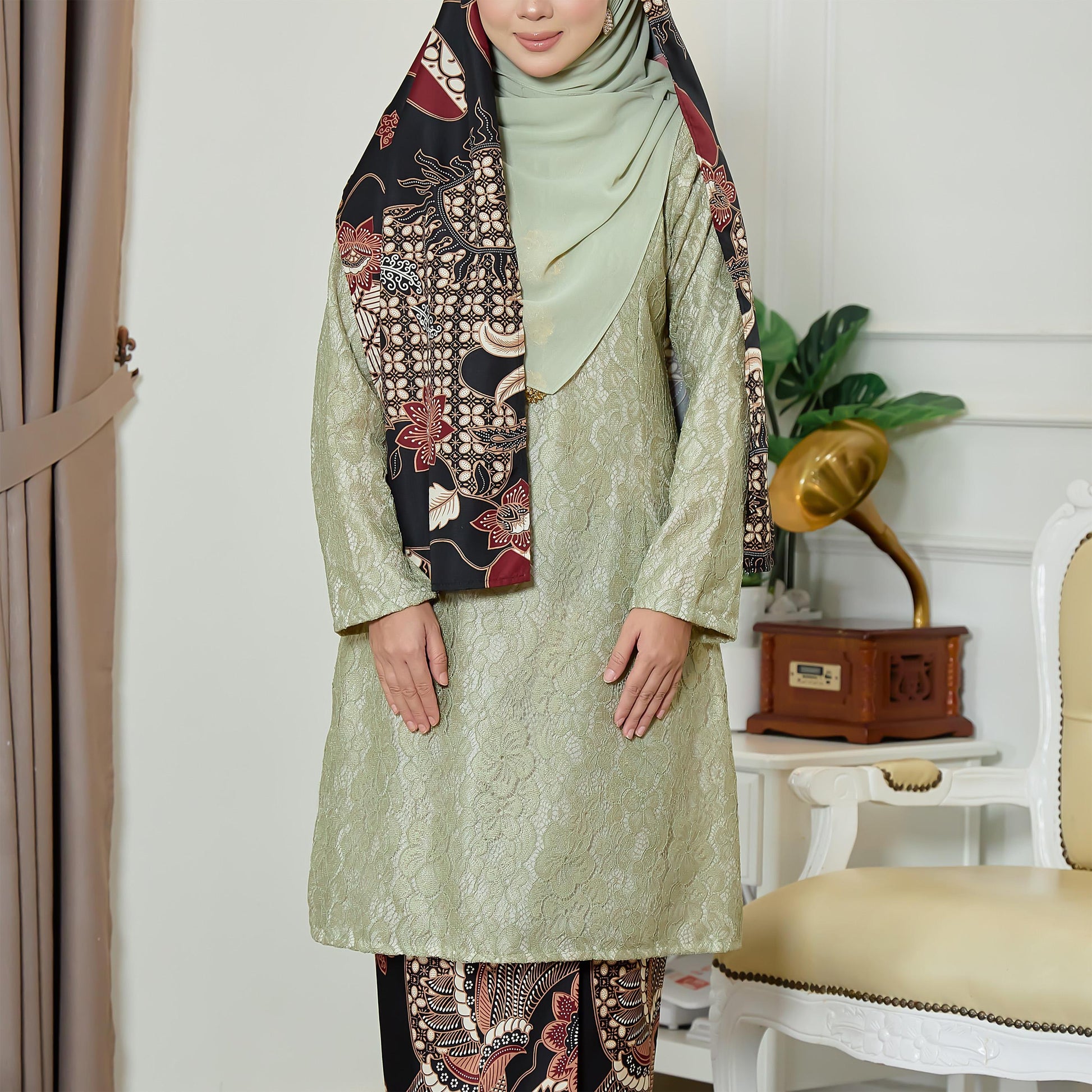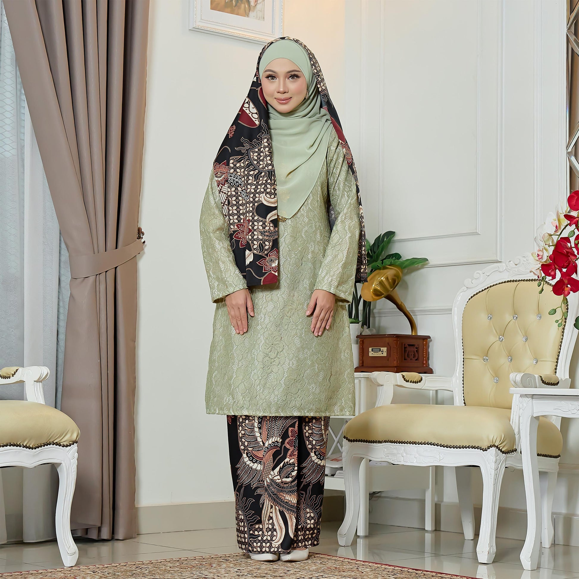 The Maysuri Kebarung combines embossed Pokka silk and Songket fabric with a susun belakang skirt for ease of movement. It includes a chest zip for nursing and loose cuffs for wudhu, offering both elegance and practicality.