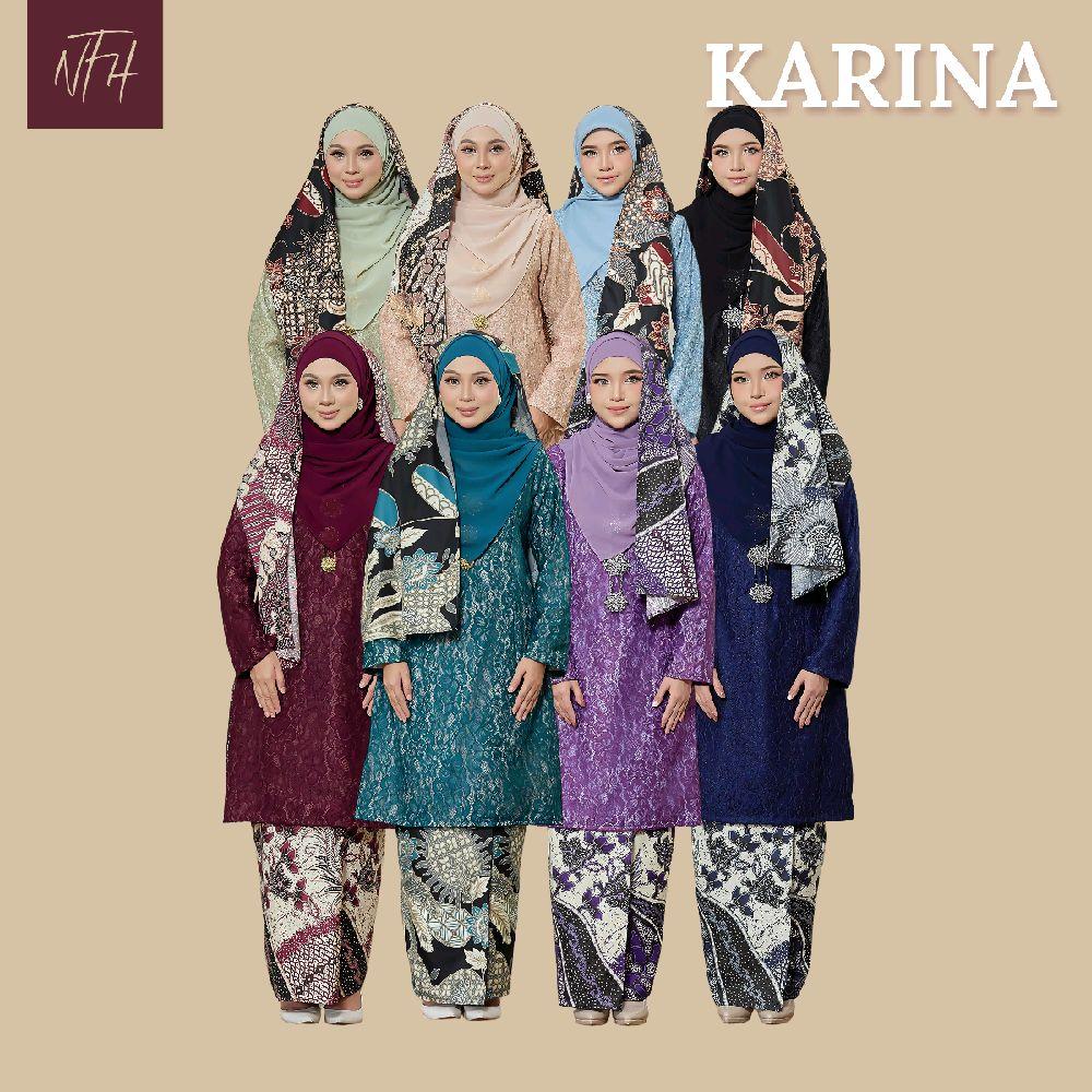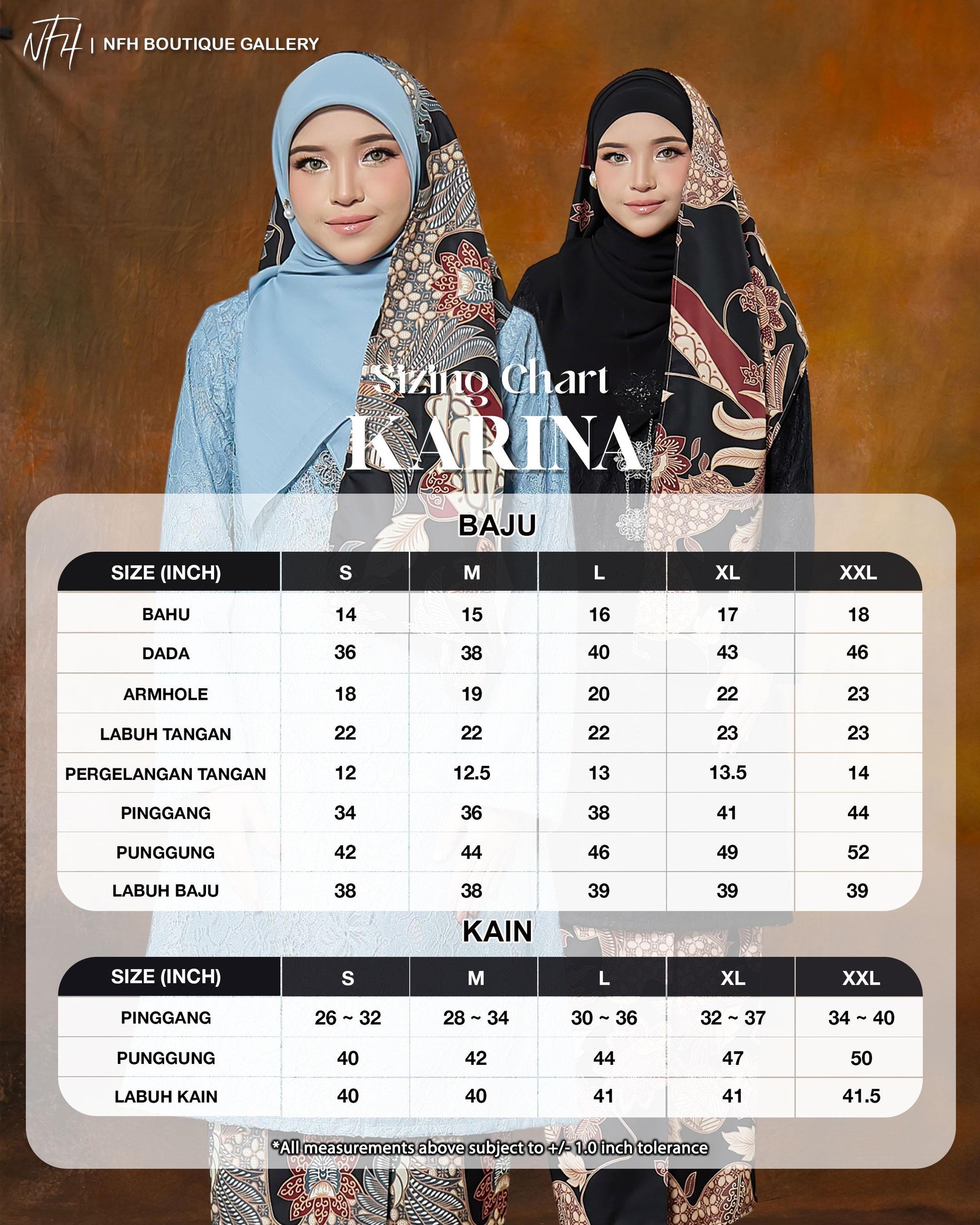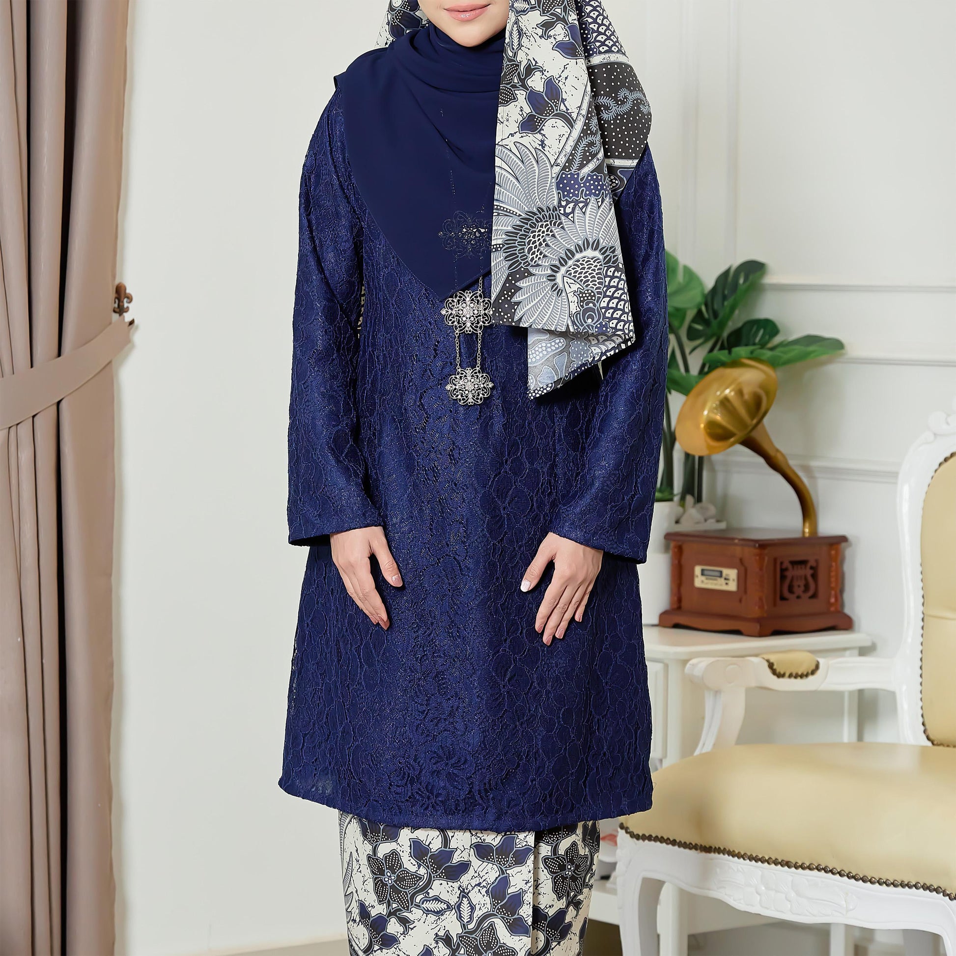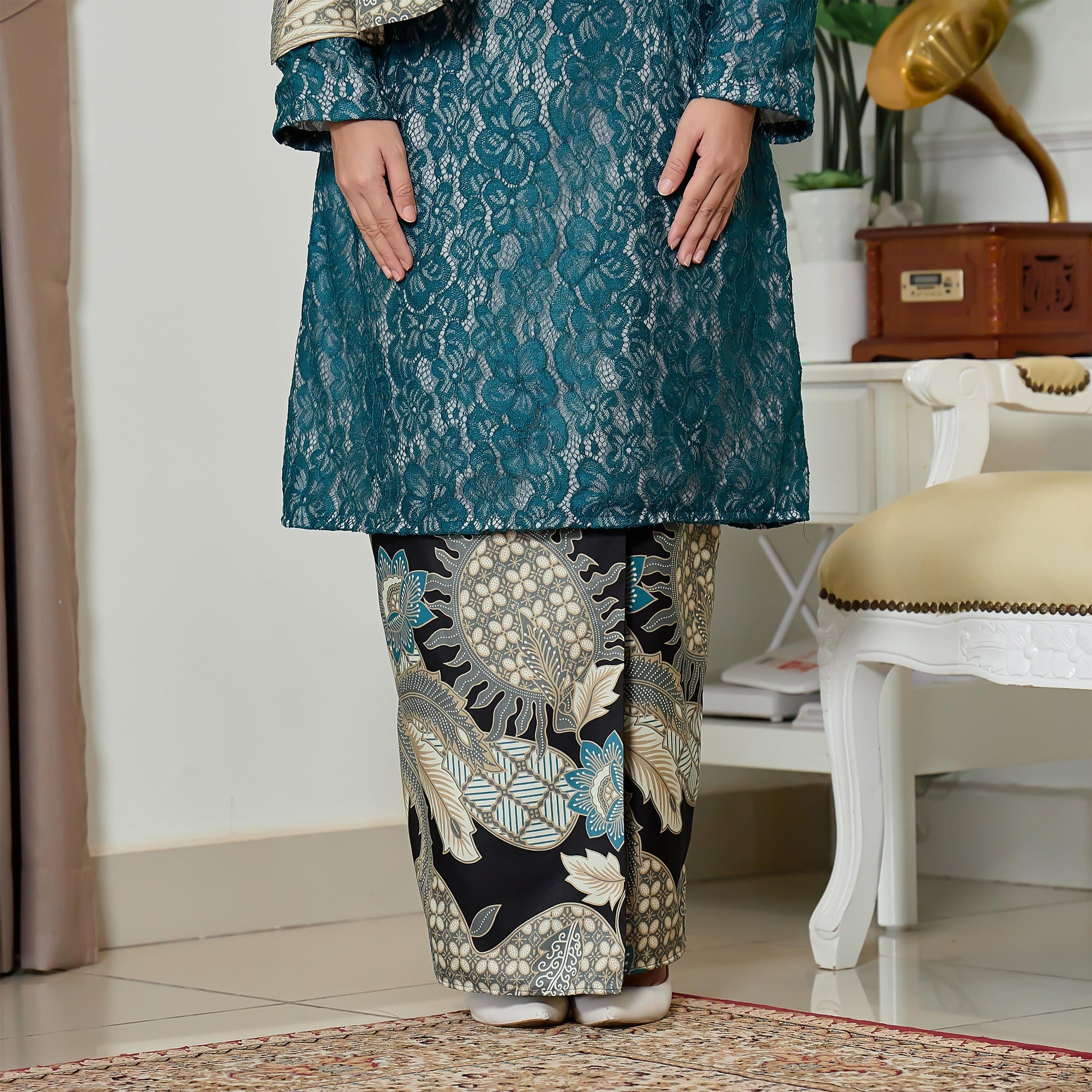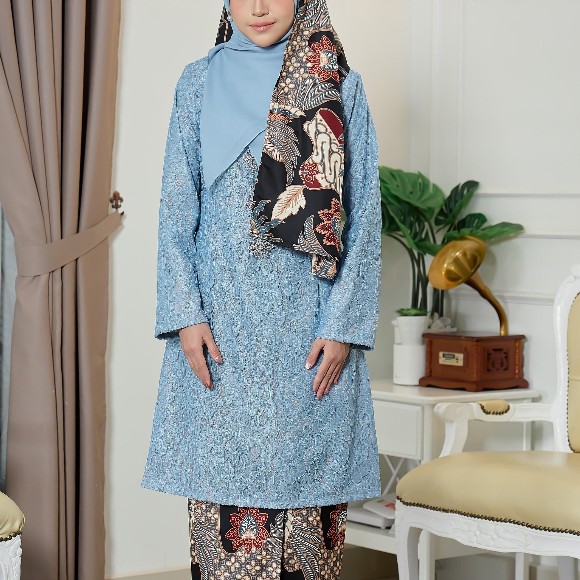 The Maysuri Kebarung combines embossed Pokka silk and Songket fabric with a susun belakang skirt for ease of movement. It includes a chest zip for nursing and loose cuffs for wudhu, offering both elegance and practicality.