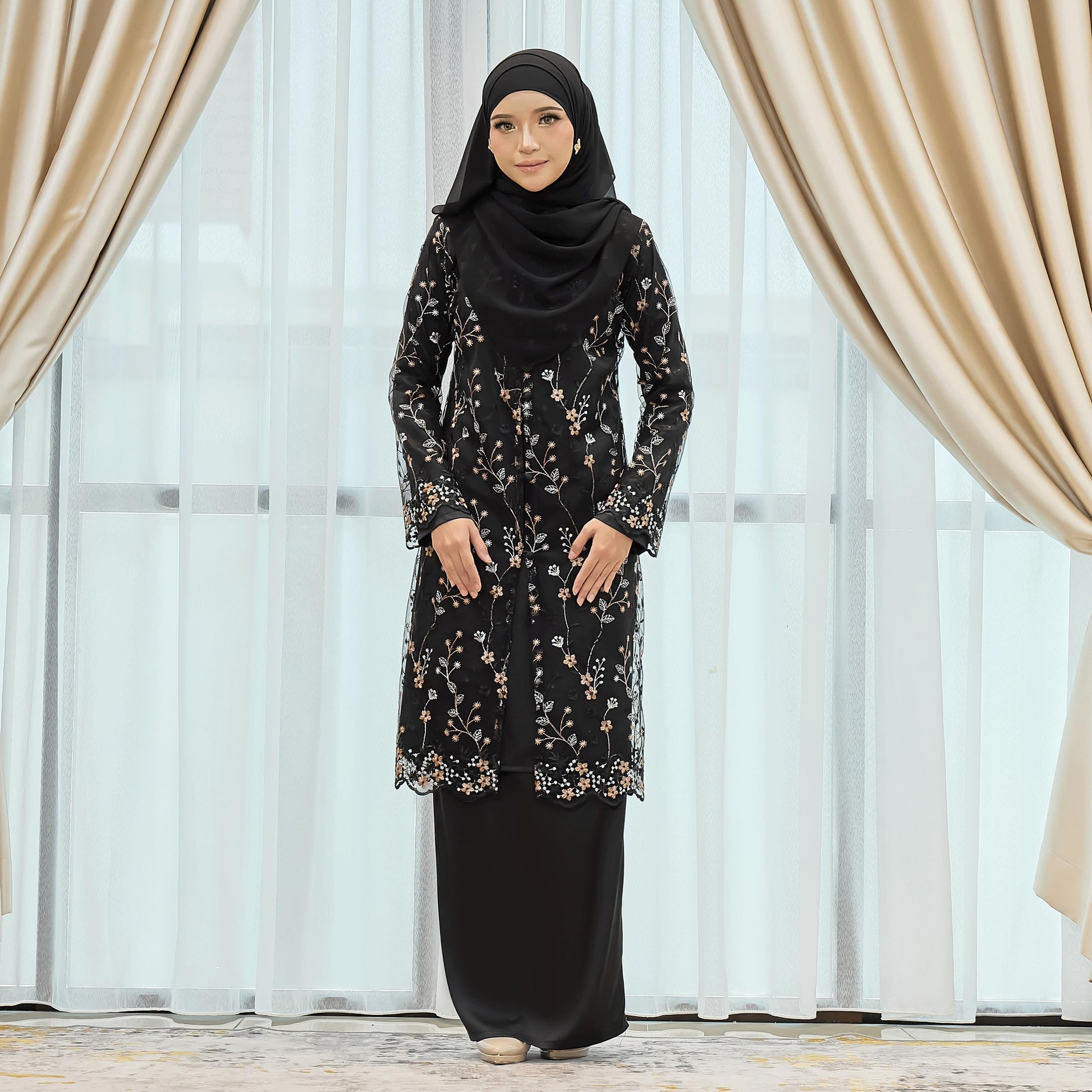 The Larabelle Kurung is made from soft Sutera Luminous fabric with a floral lace design. It has a susun belakang skirt, a chest zip for nursing, and wrist zips for easy wudhu, blending comfort with practicality.
