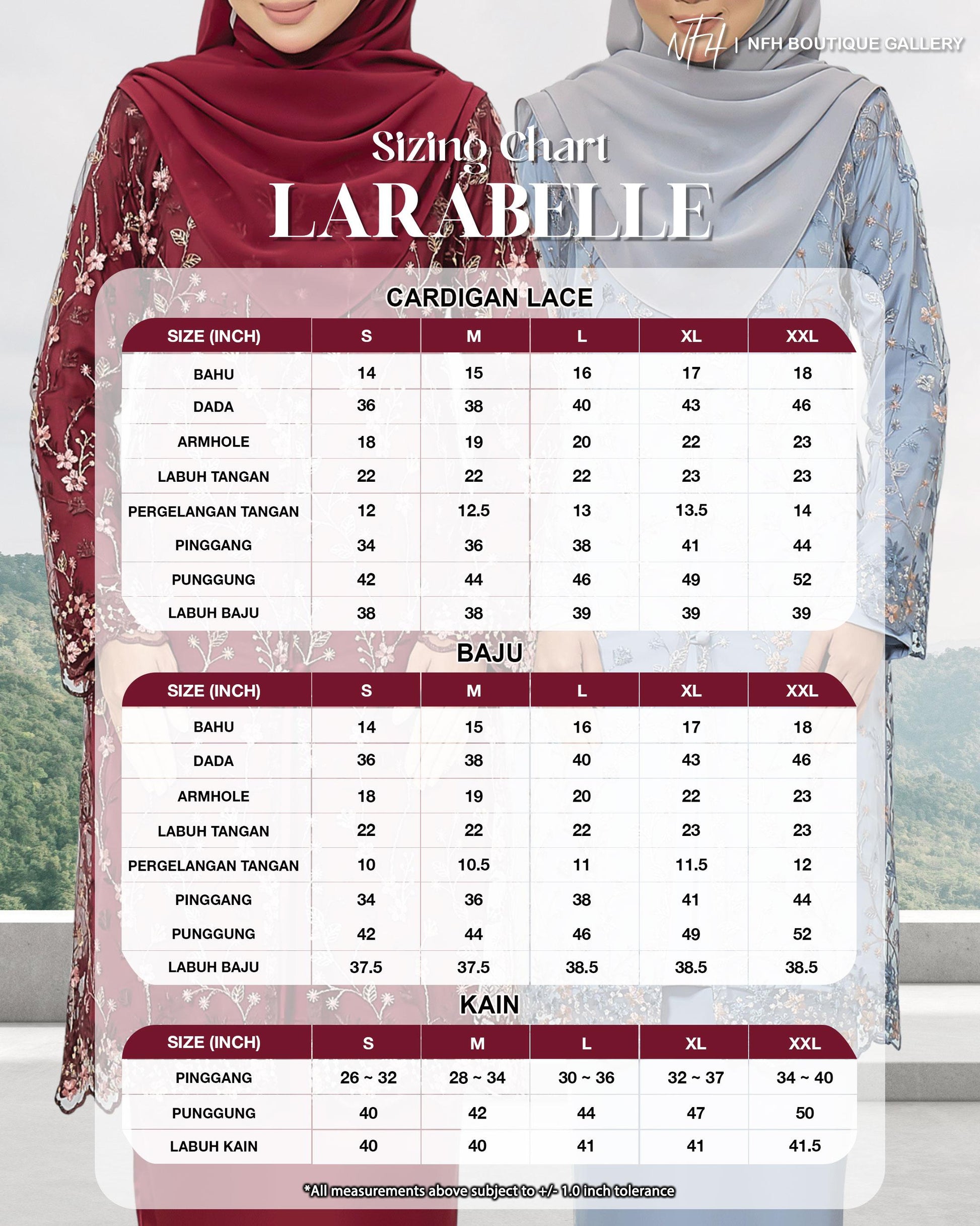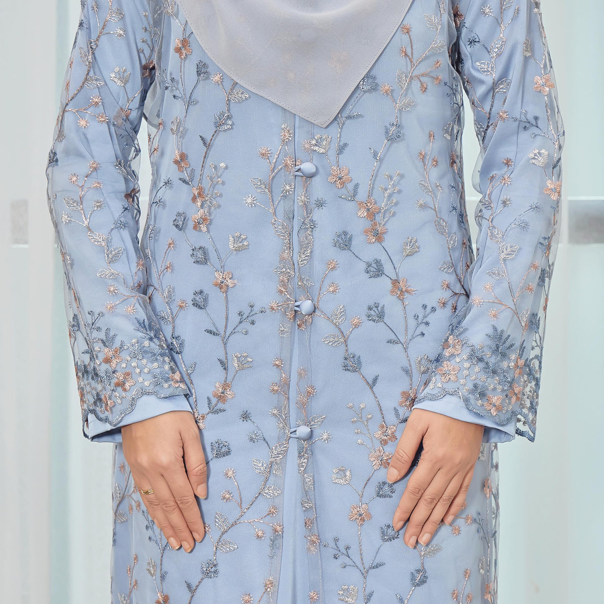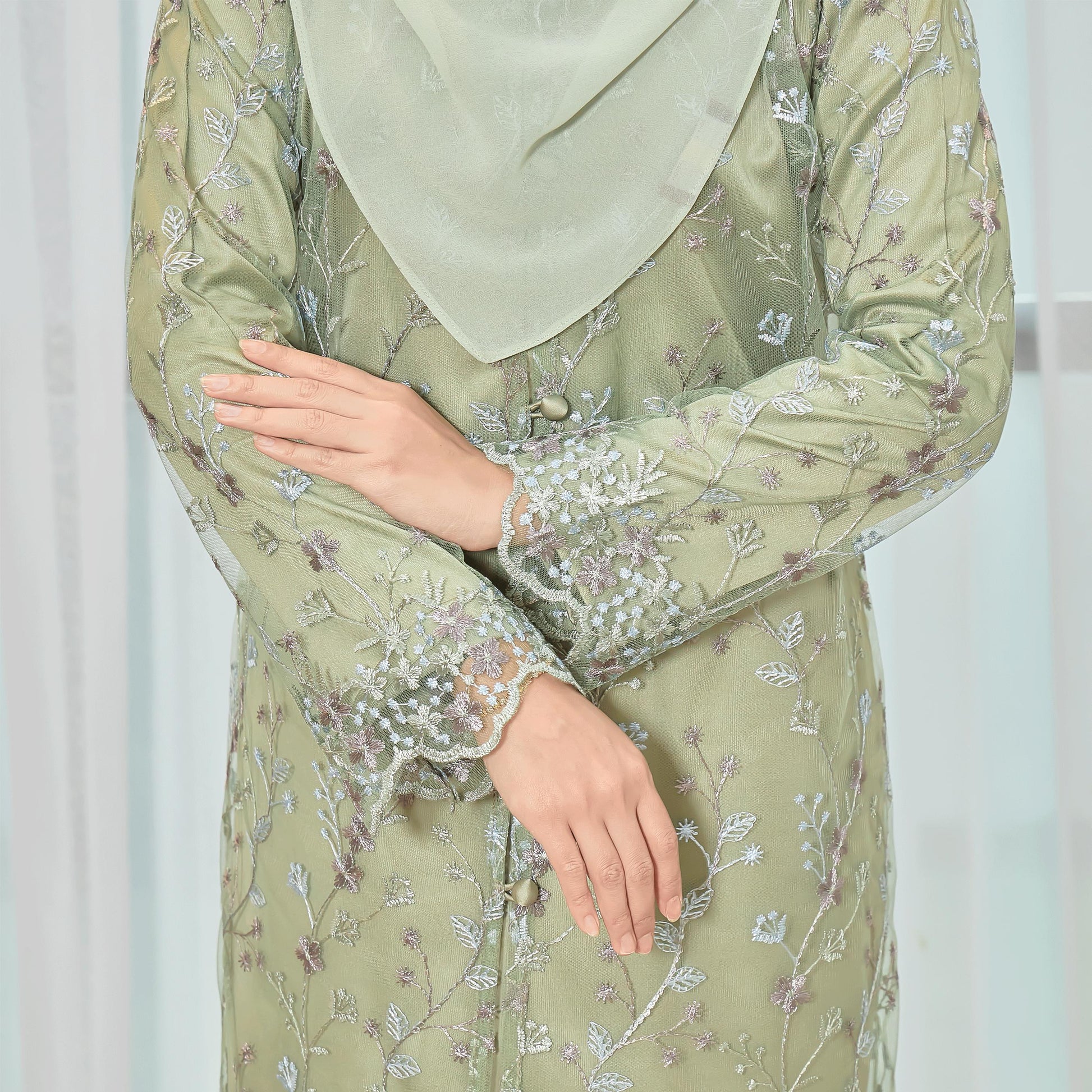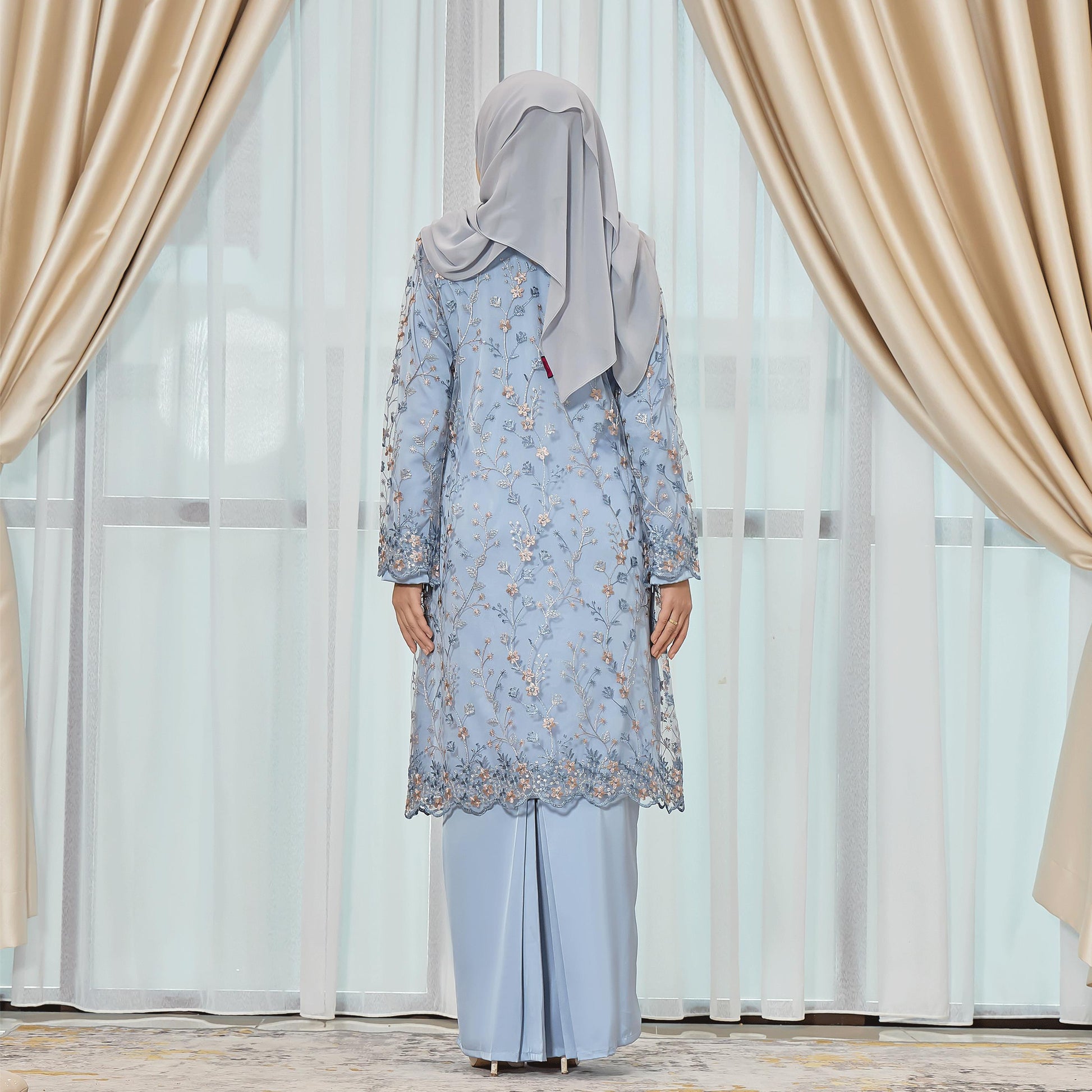 The Larabelle Kurung is made from soft Sutera Luminous fabric with a floral lace design. It has a susun belakang skirt, a chest zip for nursing, and wrist zips for easy wudhu, blending comfort with practicality.