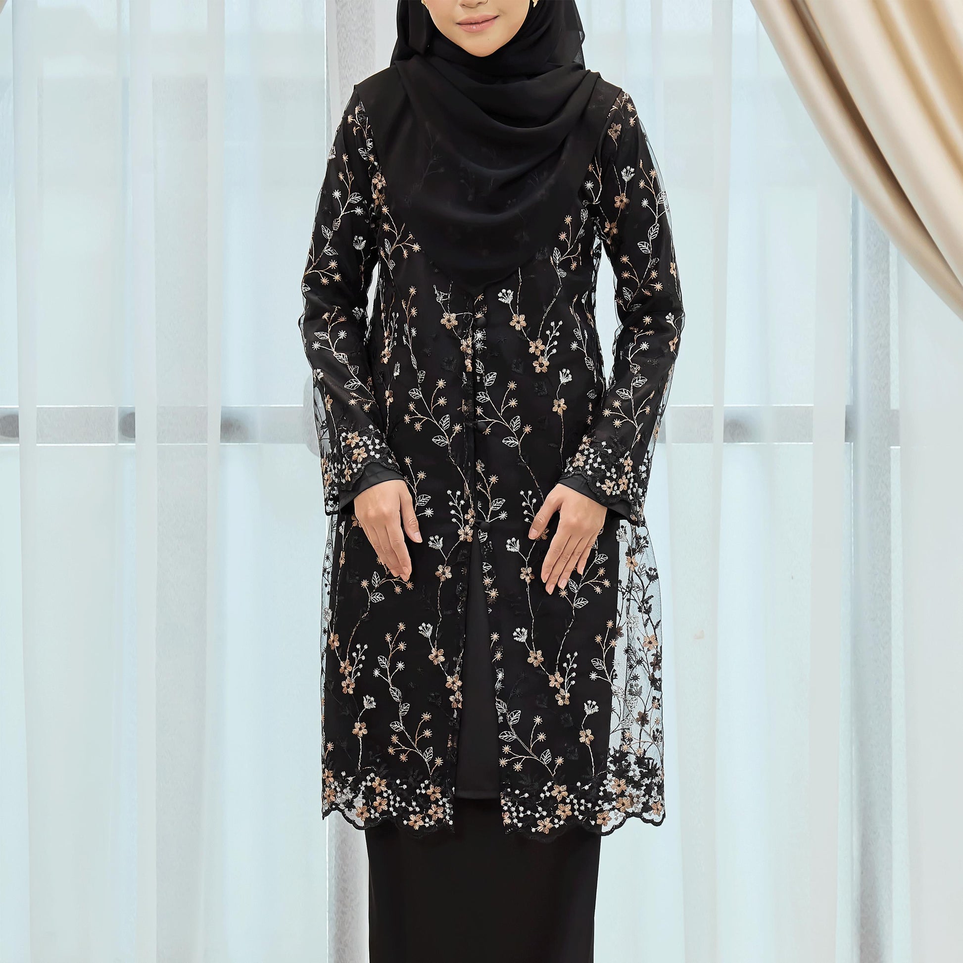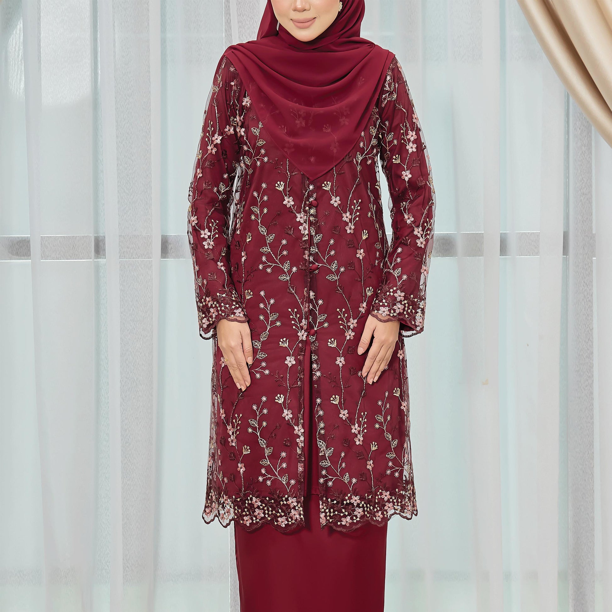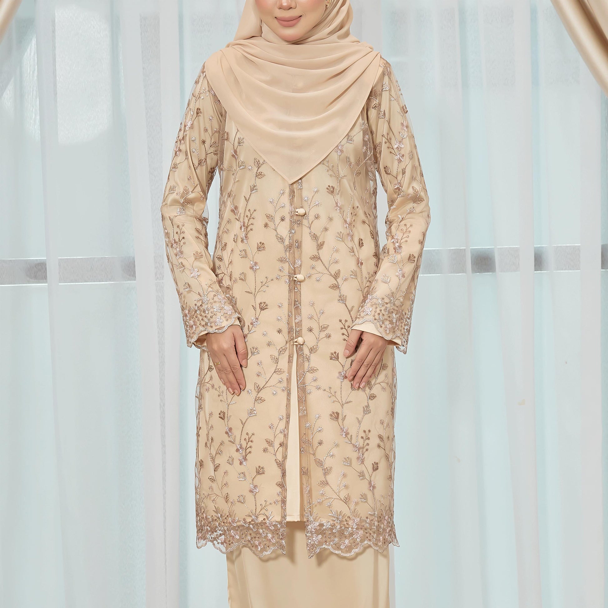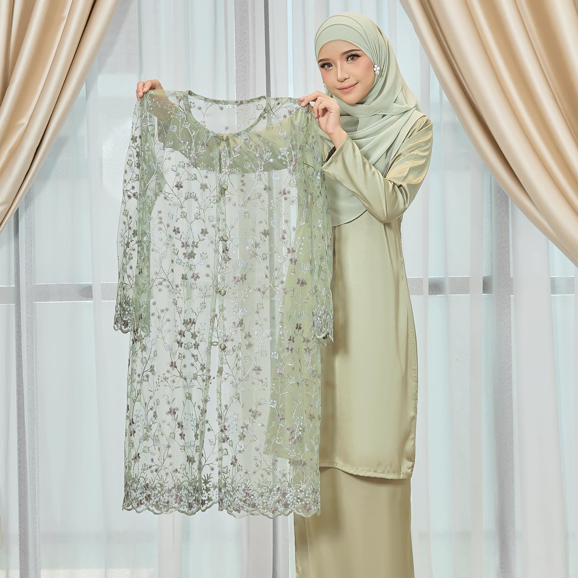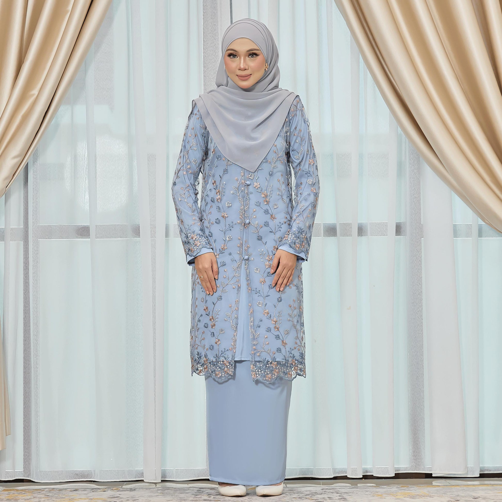 The Larabelle Kurung is made from soft Sutera Luminous fabric with a floral lace design. It has a susun belakang skirt, a chest zip for nursing, and wrist zips for easy wudhu, blending comfort with practicality.