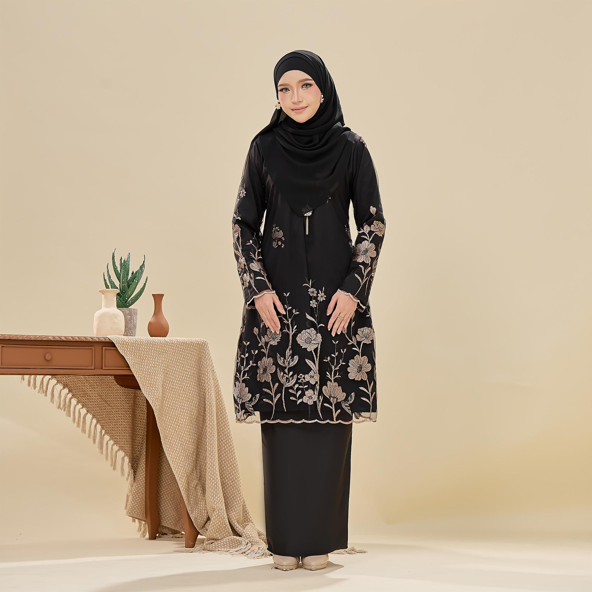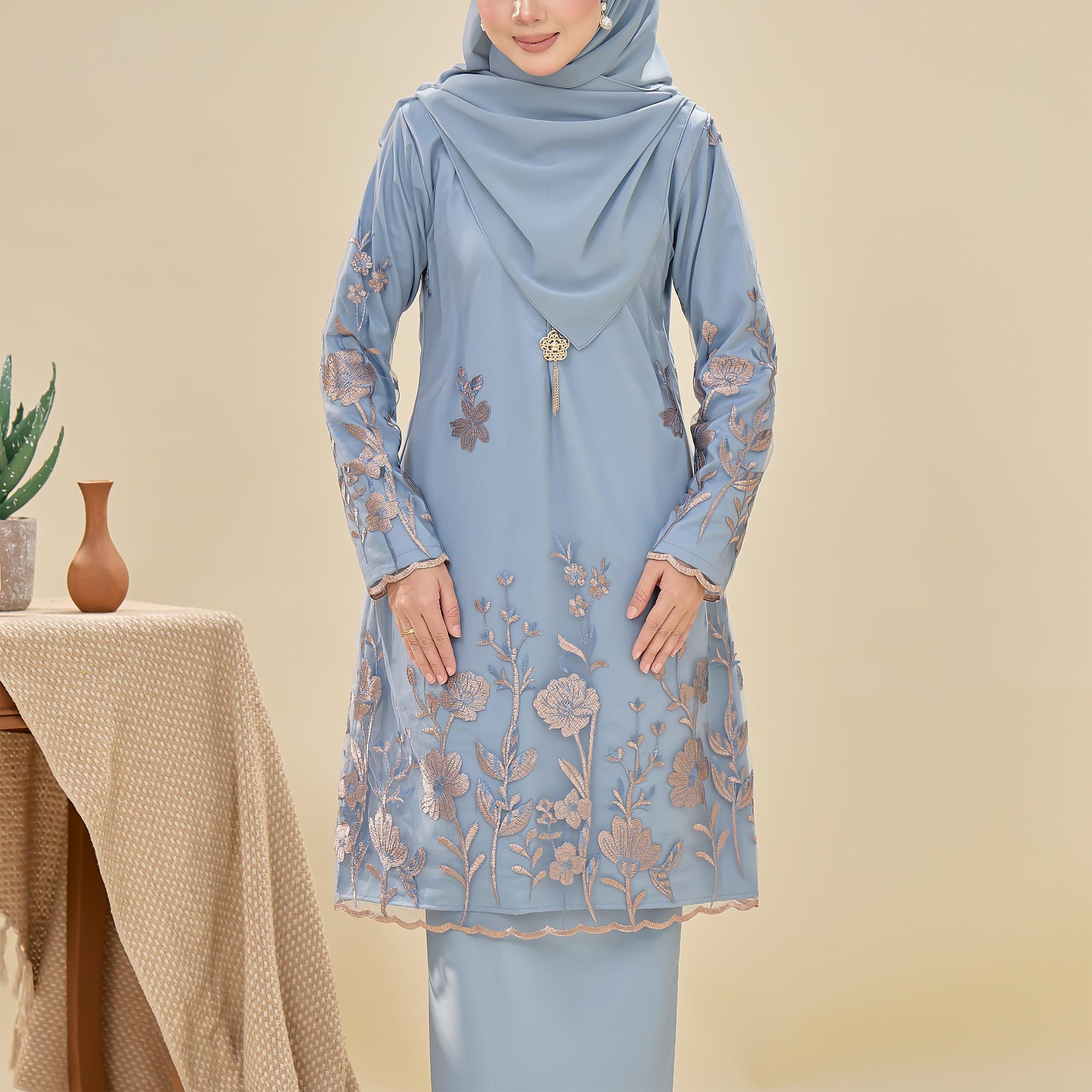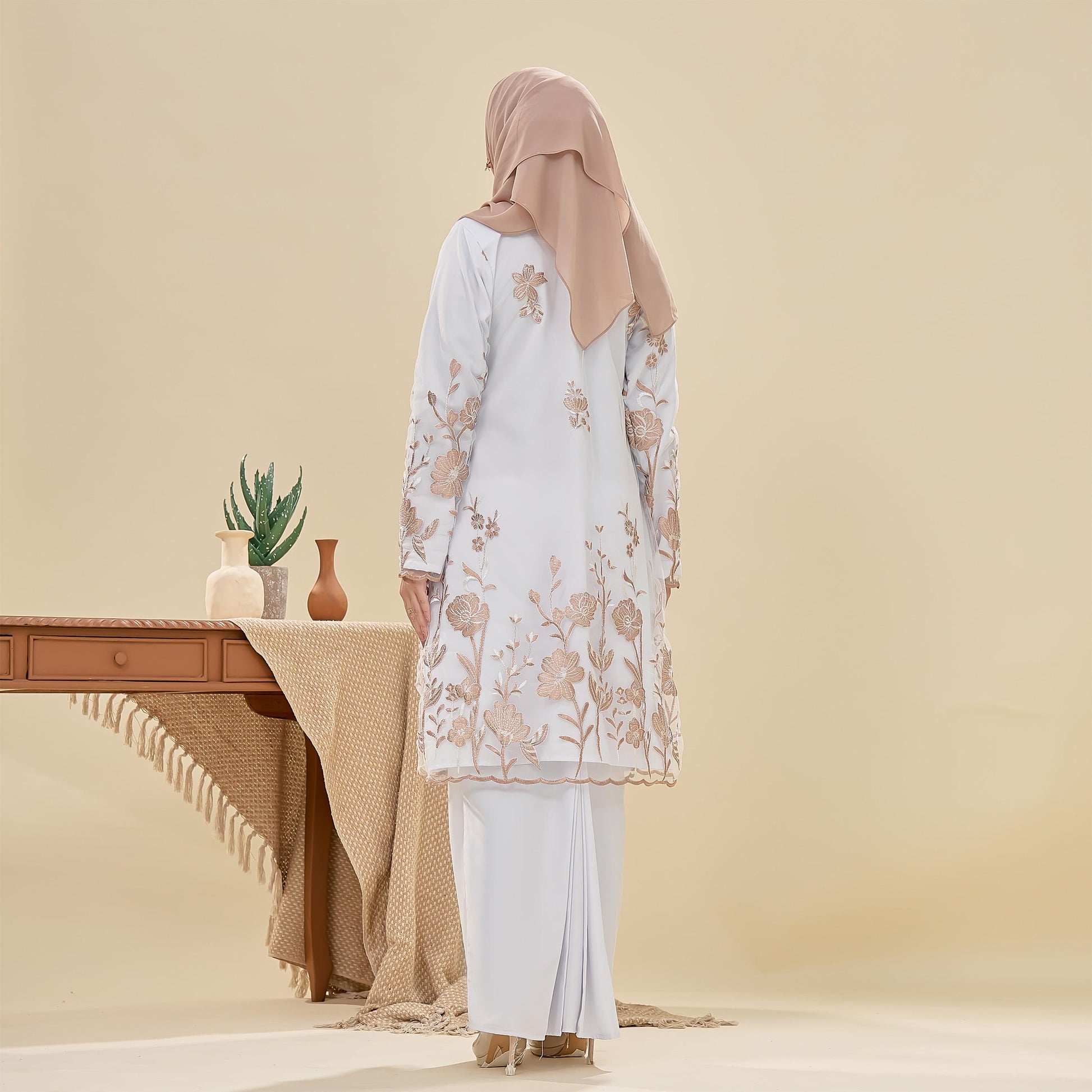 The Lunaya Kurung combines pearl skin silk and tulle lace with a floral pattern. It features a layered back skirt, a chest zip for nursing, and loose cuffs for wudhu, offering comfort and practicality with elegant design.