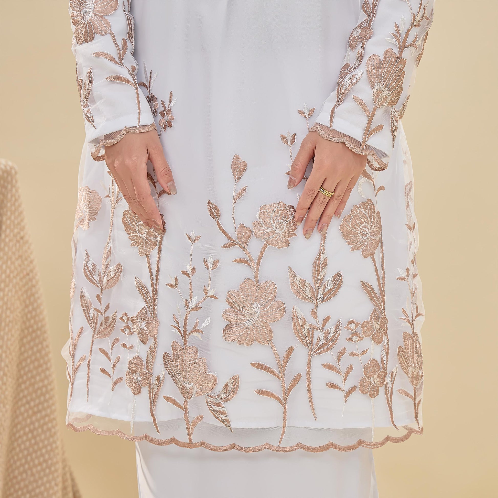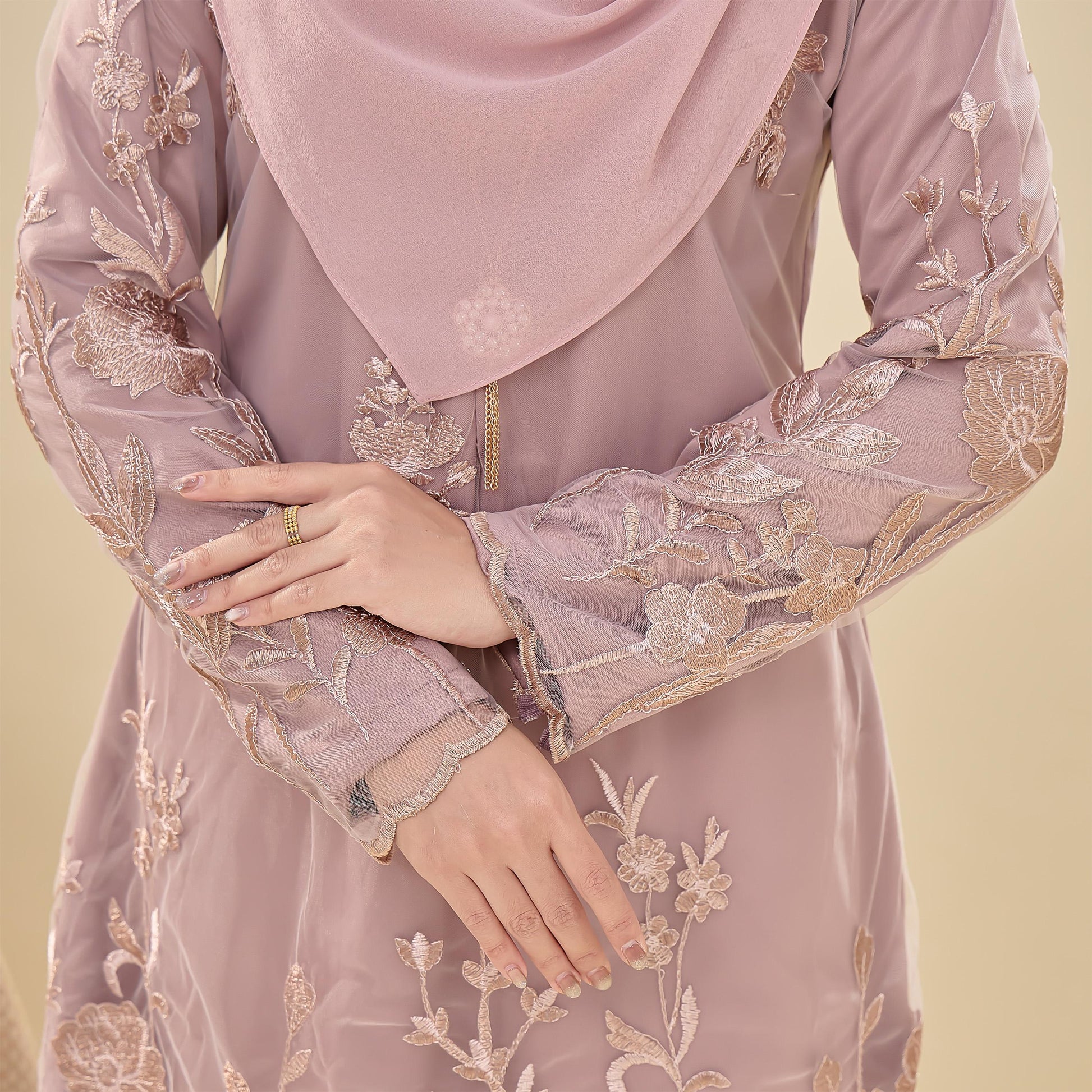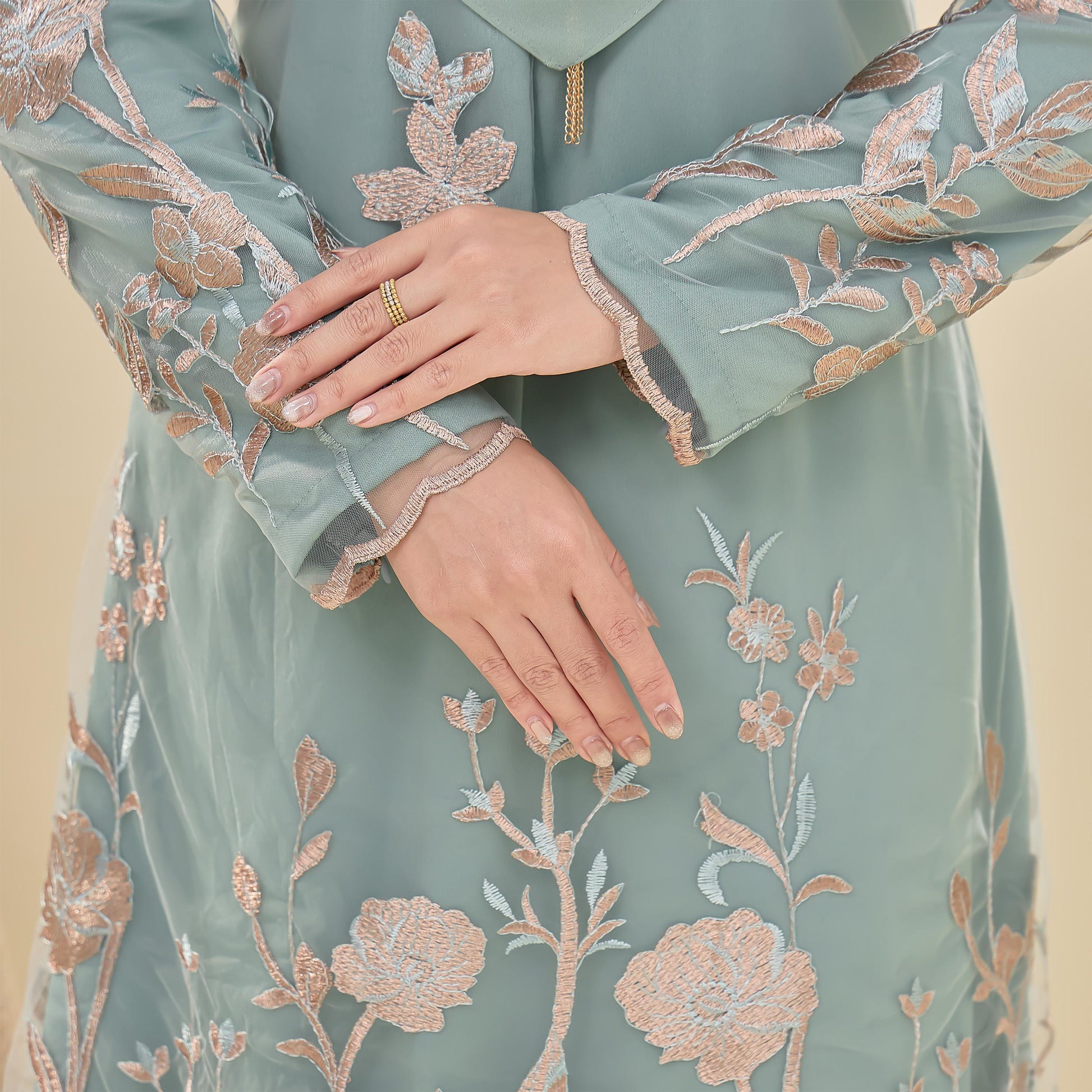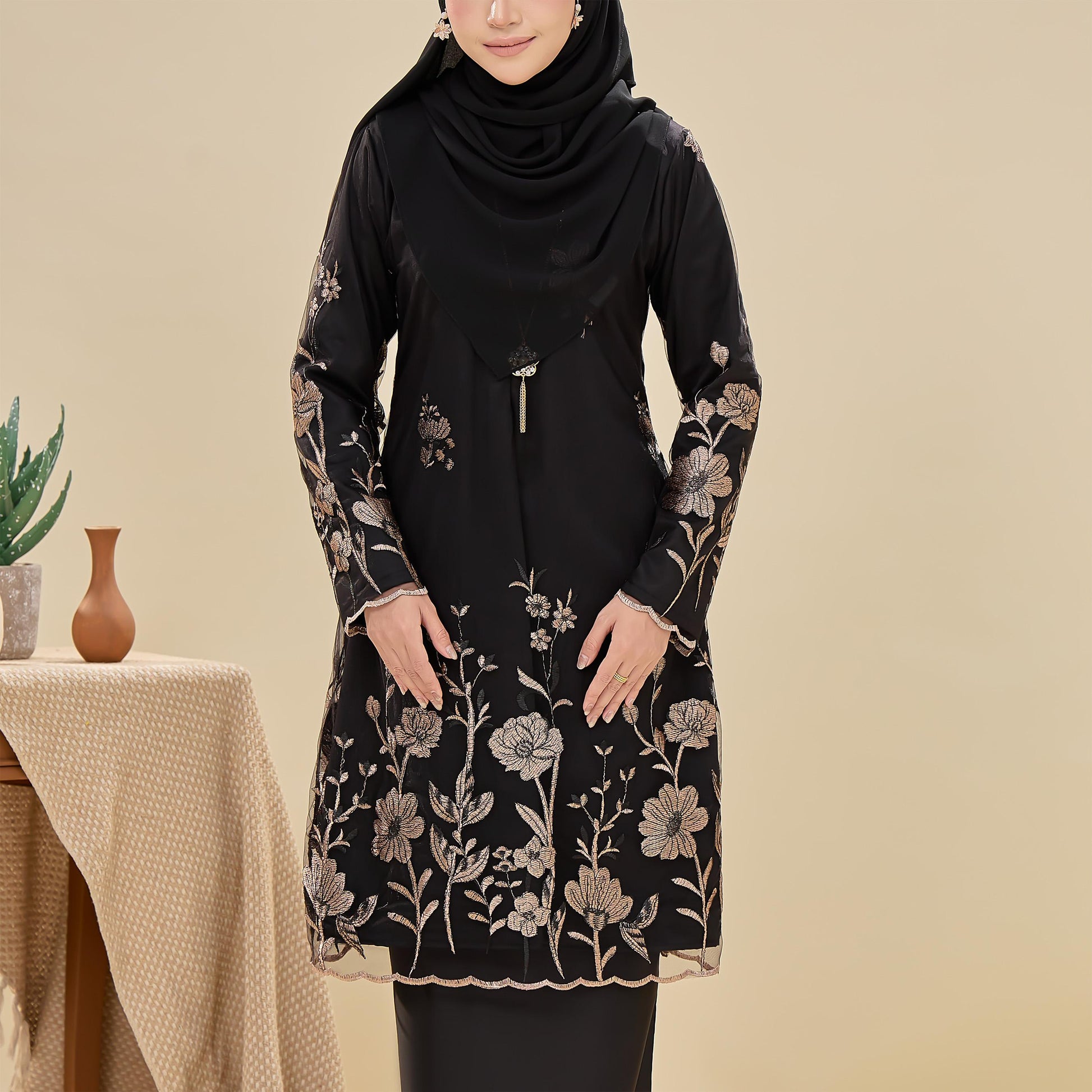 The Lunaya Kurung combines pearl skin silk and tulle lace with a floral pattern. It features a layered back skirt, a chest zip for nursing, and loose cuffs for wudhu, offering comfort and practicality with elegant design.