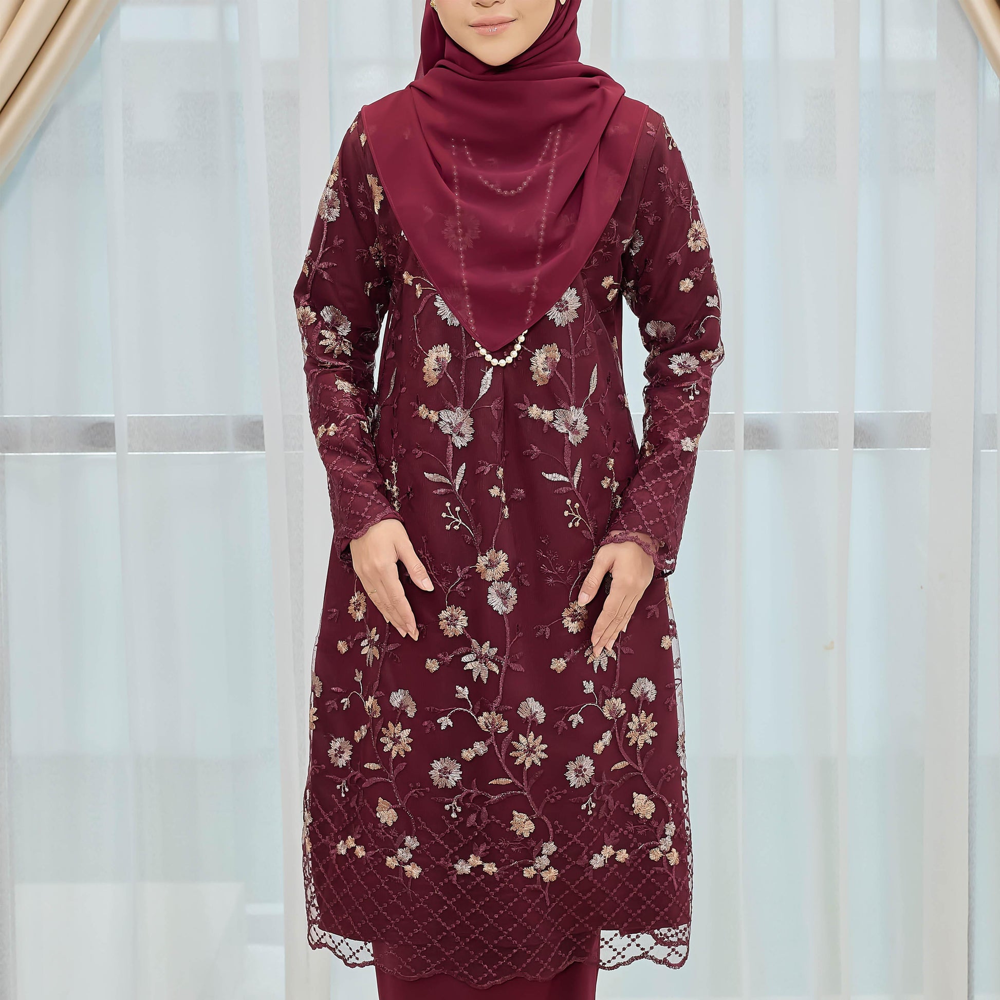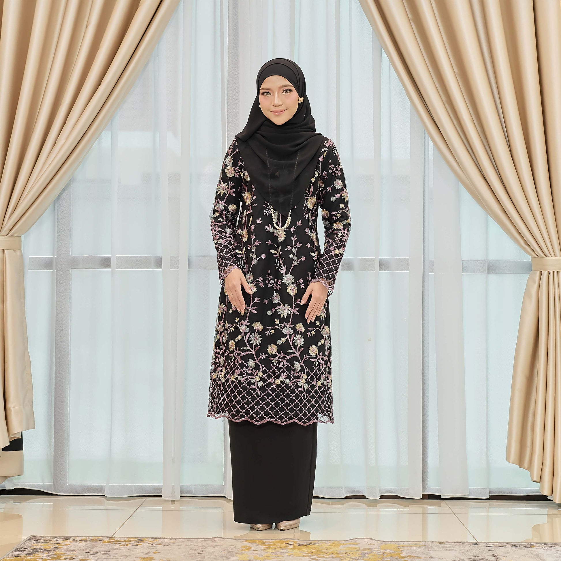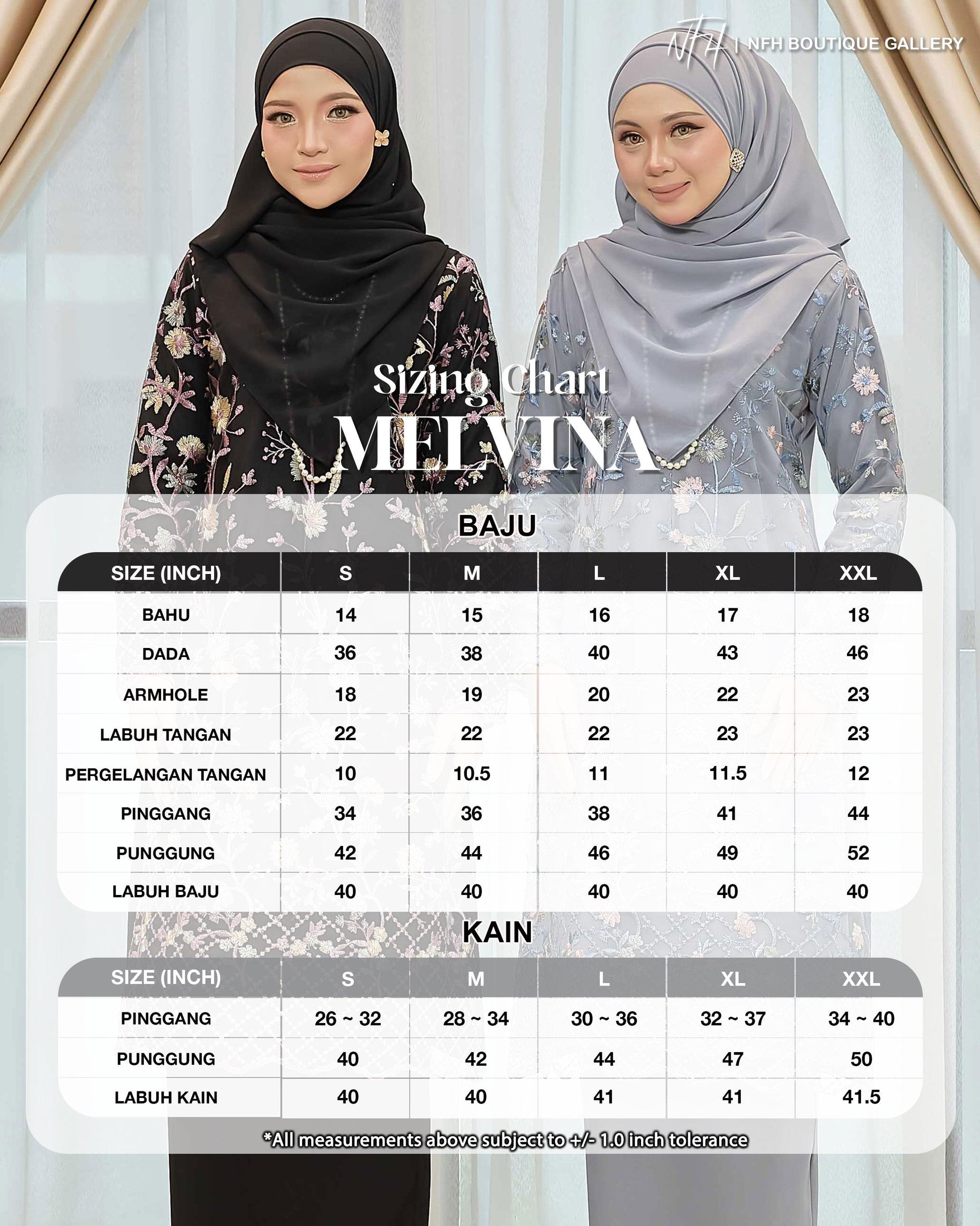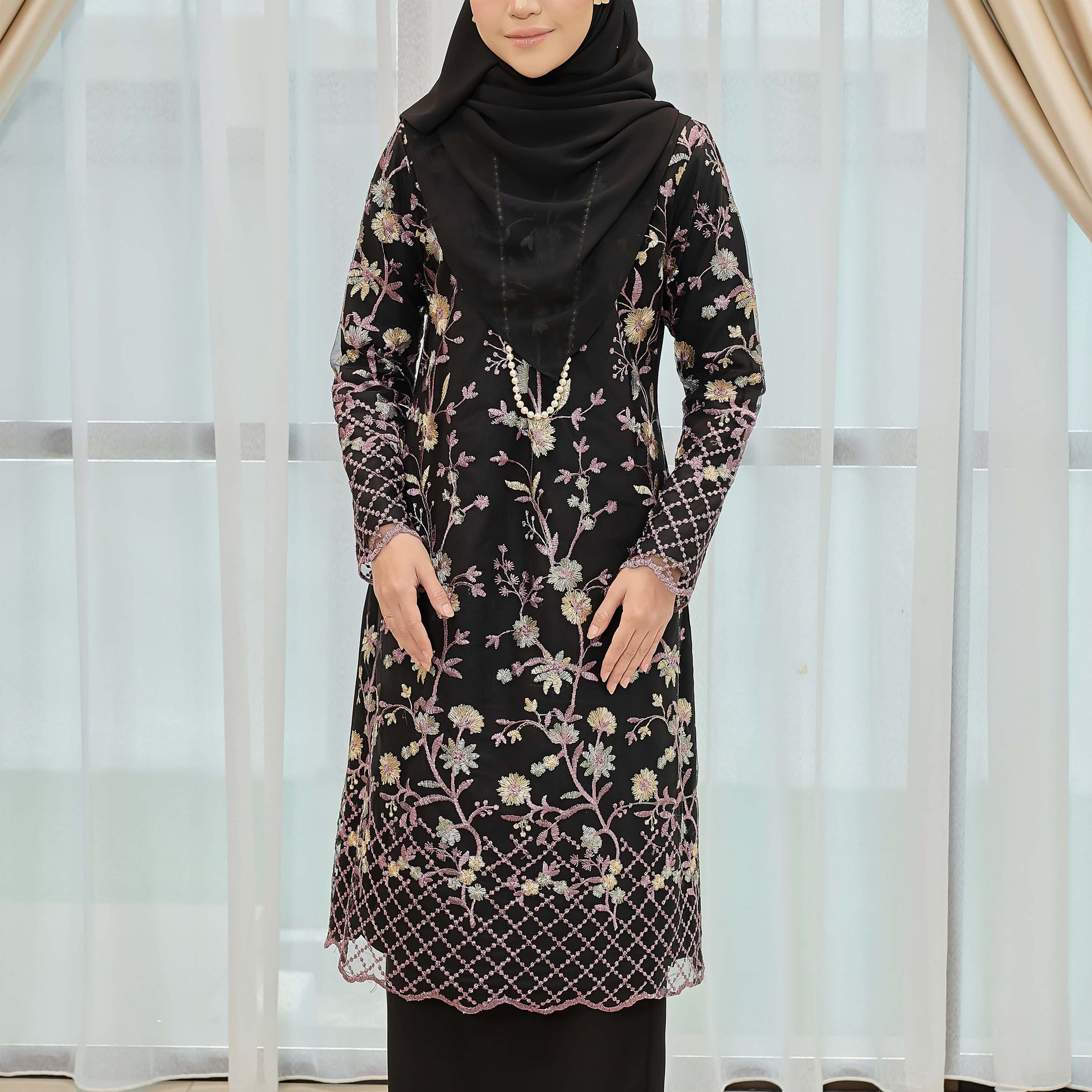 Dare to stand out in the bold and adventurous Melvina Kurung. Made of Como Crepe and adorned with a beautiful floral lace pattern, this kurung is perfect for those who embrace taking risks. The Susun Belakang skirt adds a touch of daring to this unique piece.