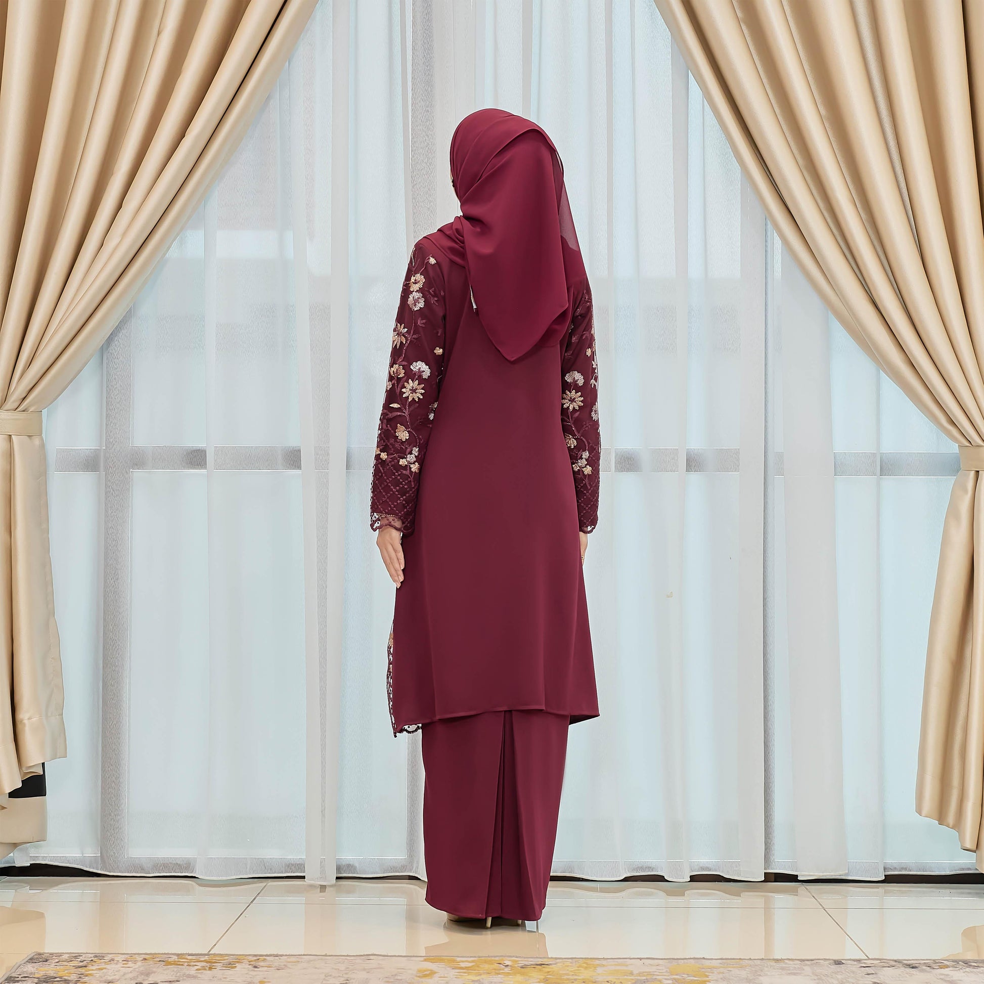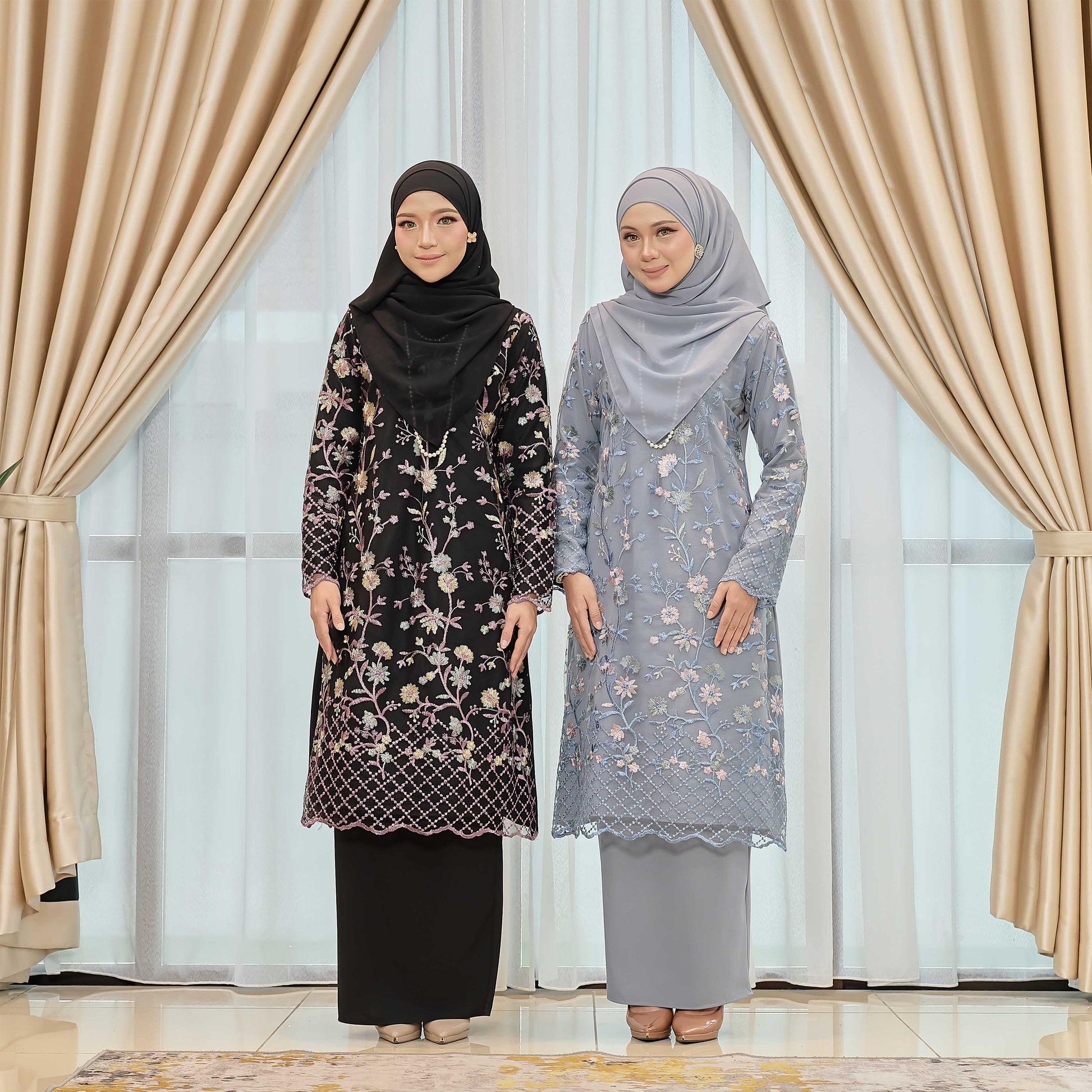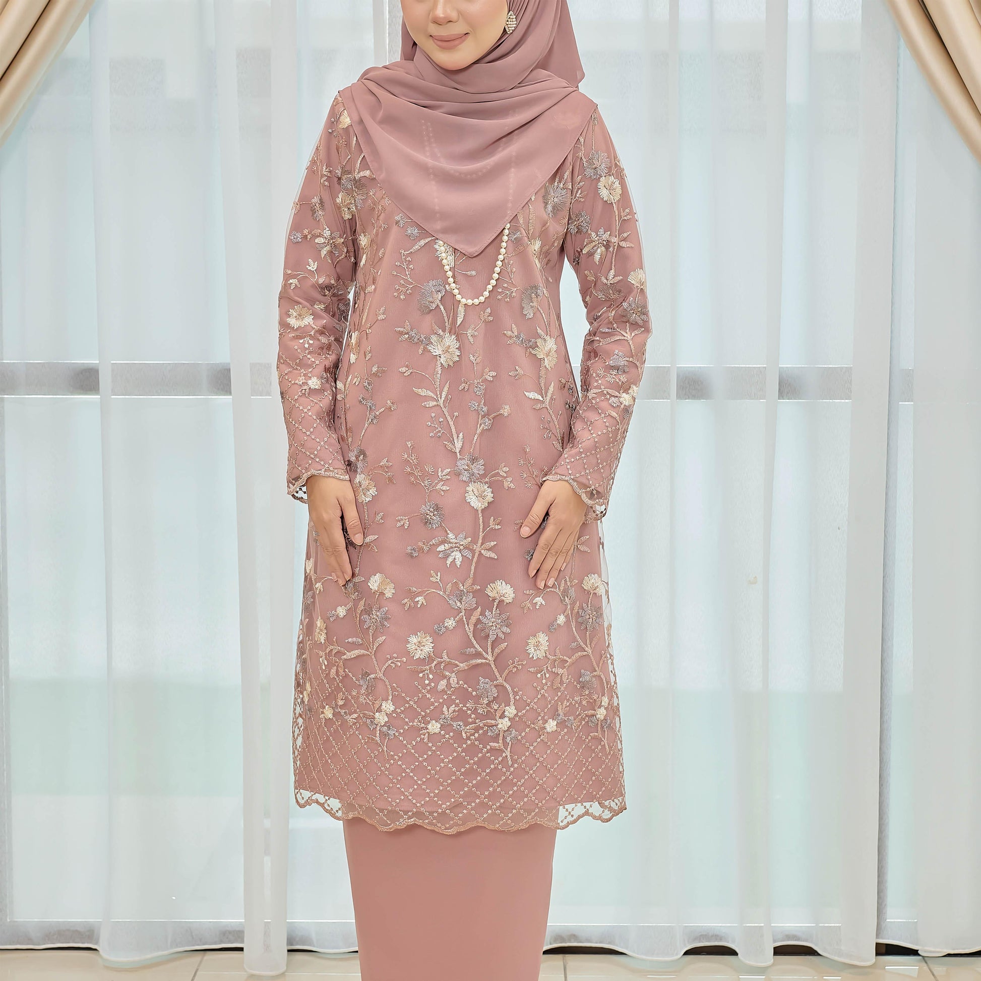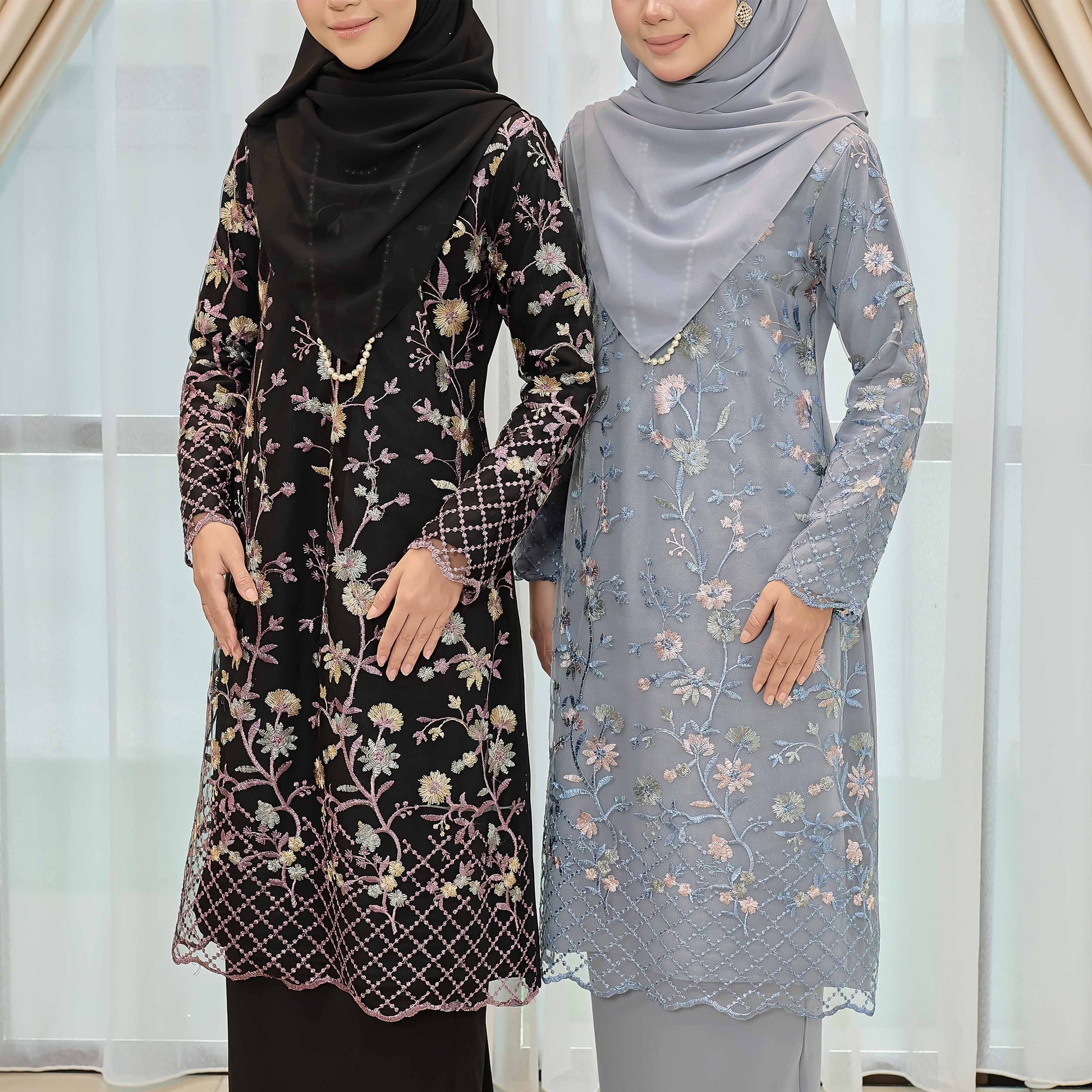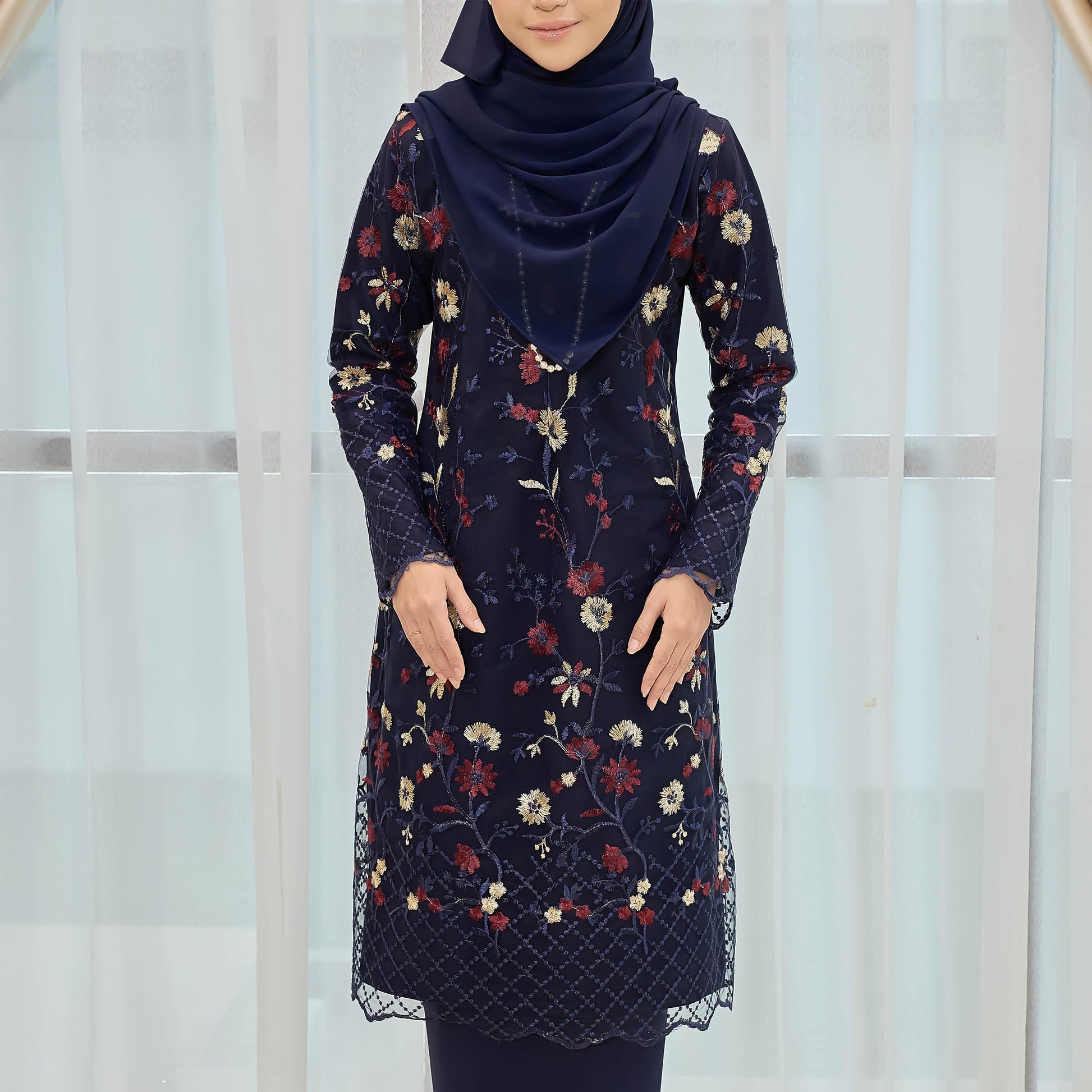 Dare to stand out in the bold and adventurous Melvina Kurung. Made of Como Crepe and adorned with a beautiful floral lace pattern, this kurung is perfect for those who embrace taking risks. The Susun Belakang skirt adds a touch of daring to this unique piece.