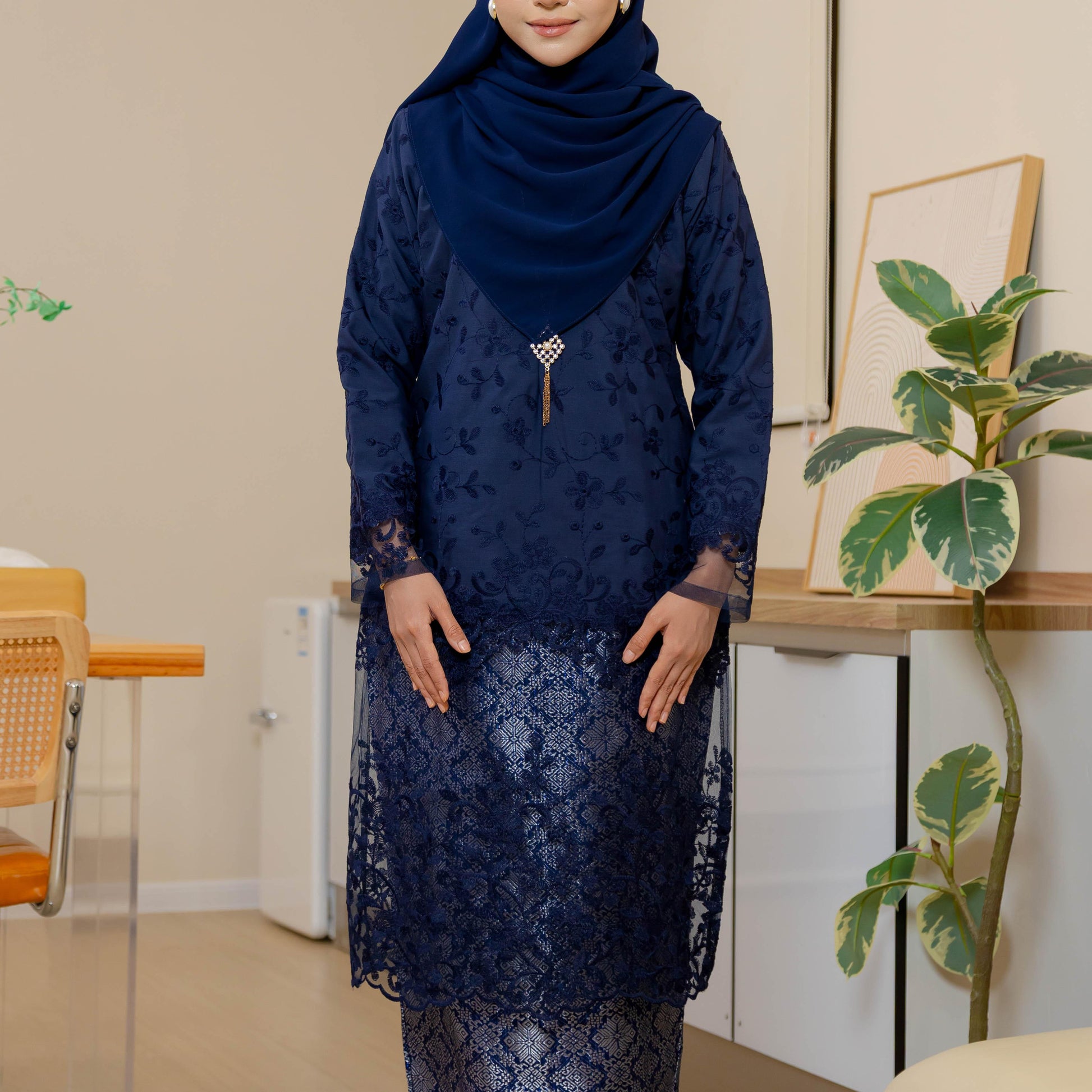 The Meville Kurung features a comfortable embroidered cotton tulle lace top and a traditional songket skirt with a susun belakang design for ease of movement. It includes chest and wrist zip closures for easy nursing and ablution, combining elegance with practical details.