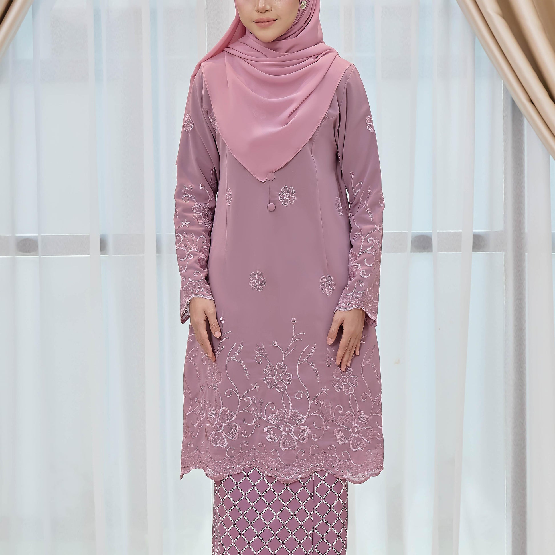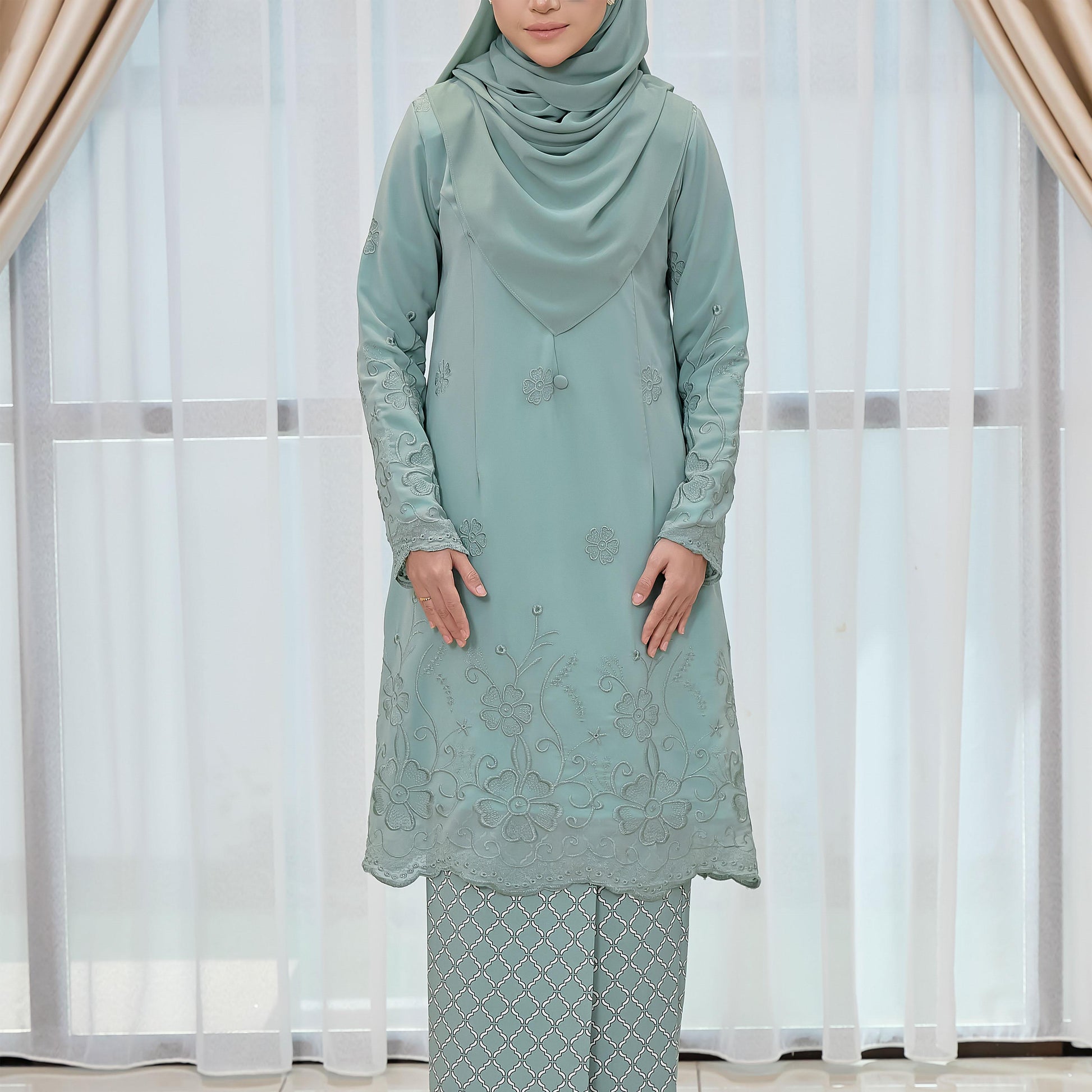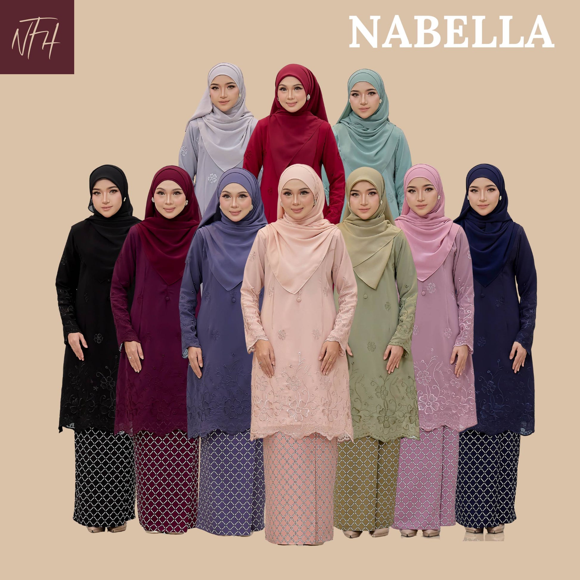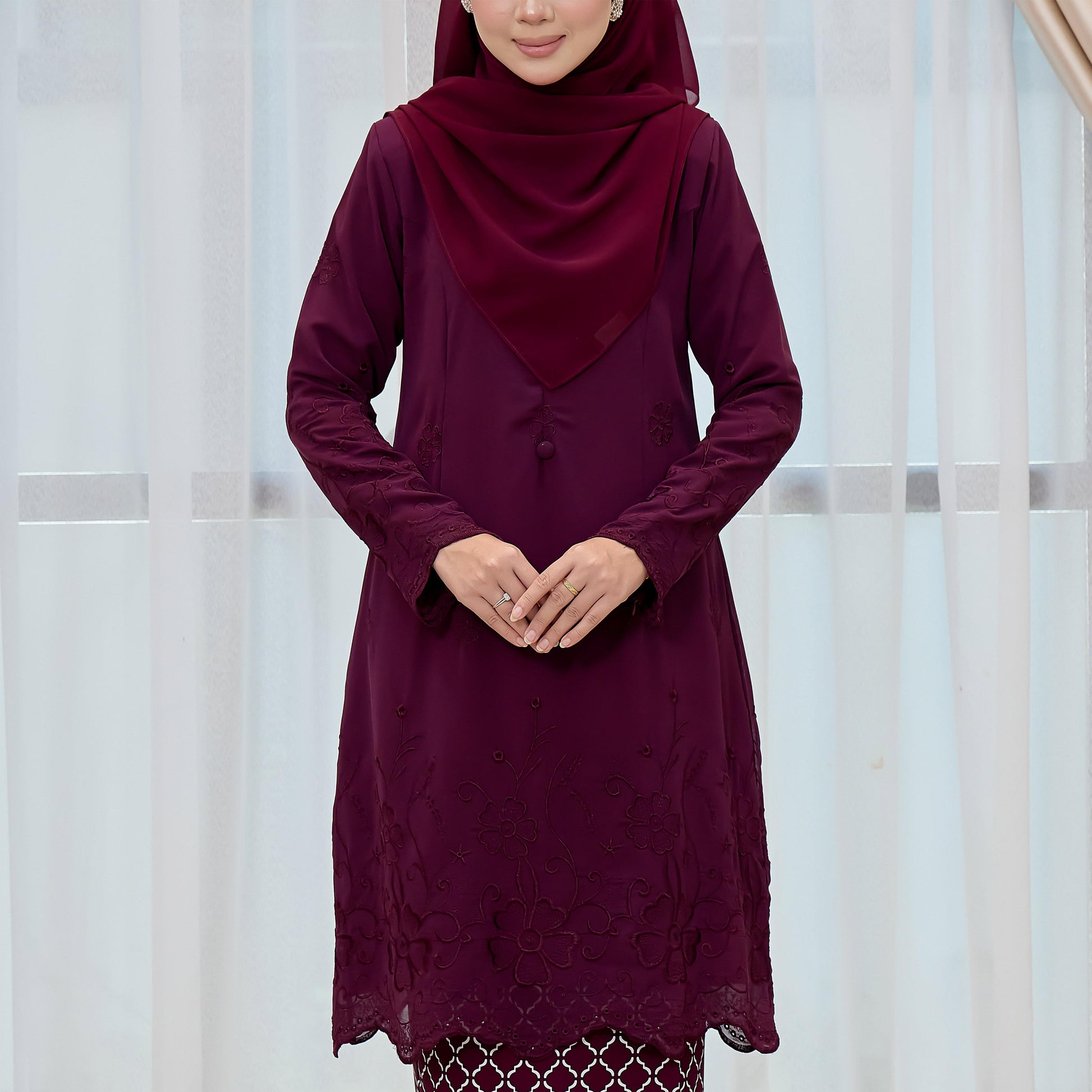 The Nabella Kurung features a comfortable chiffon top with lining and a pokka silk susun belakang skirt. It includes embroidery and practical chest and wrist zips for easy nursing and wudhu.