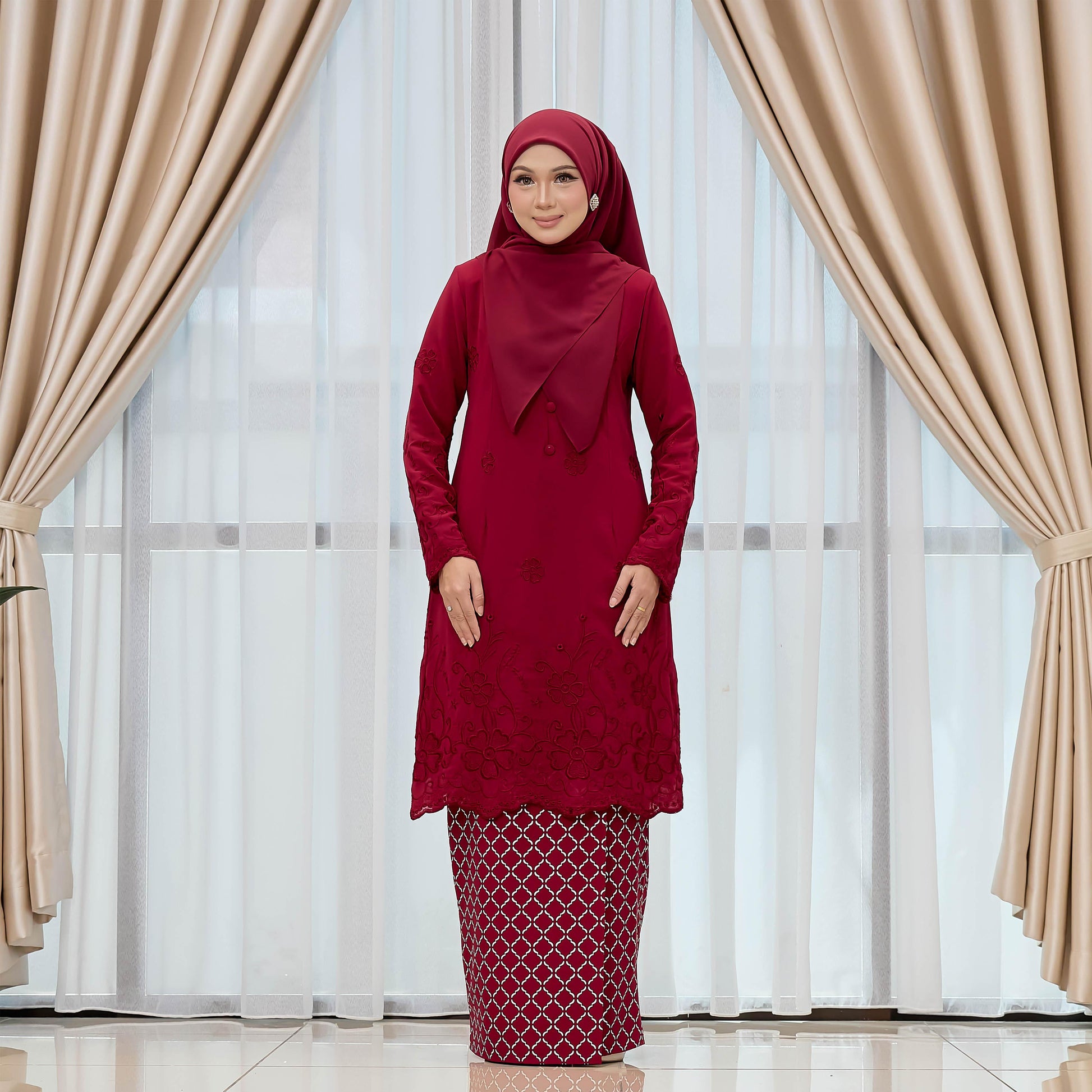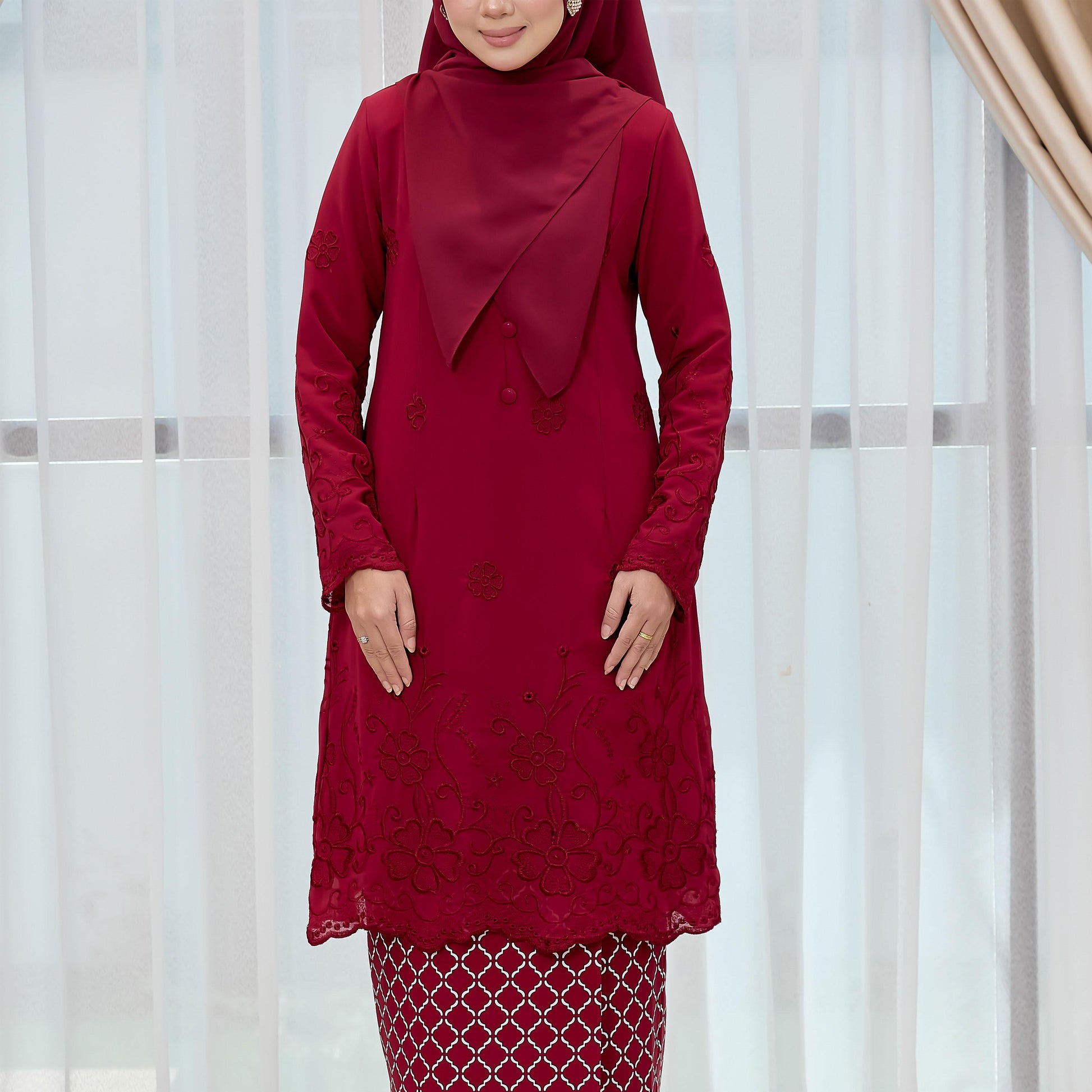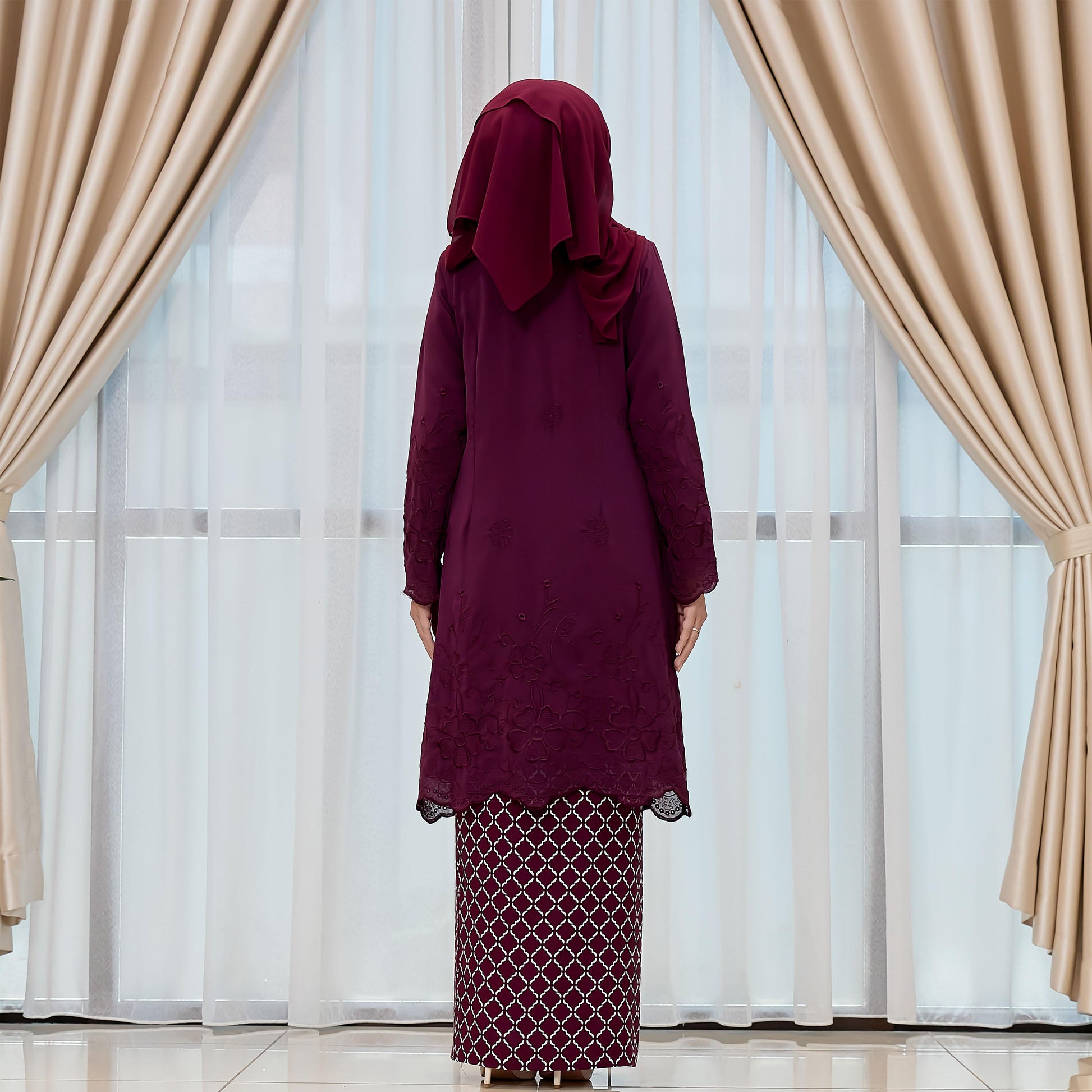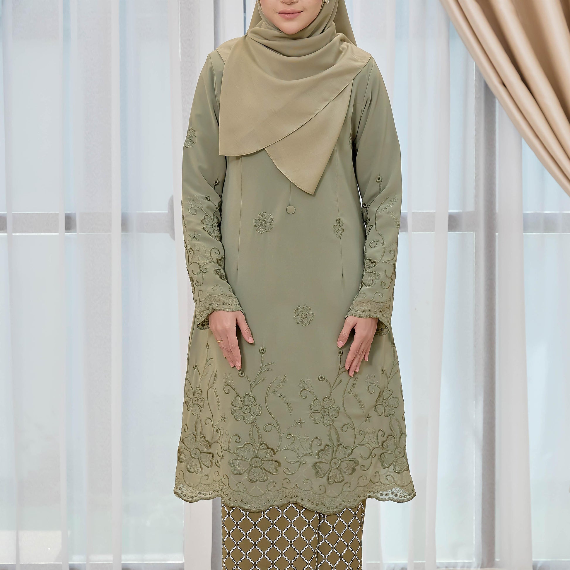 The Nabella Kurung features a comfortable chiffon top with lining and a pokka silk susun belakang skirt. It includes embroidery and practical chest and wrist zips for easy nursing and wudhu.