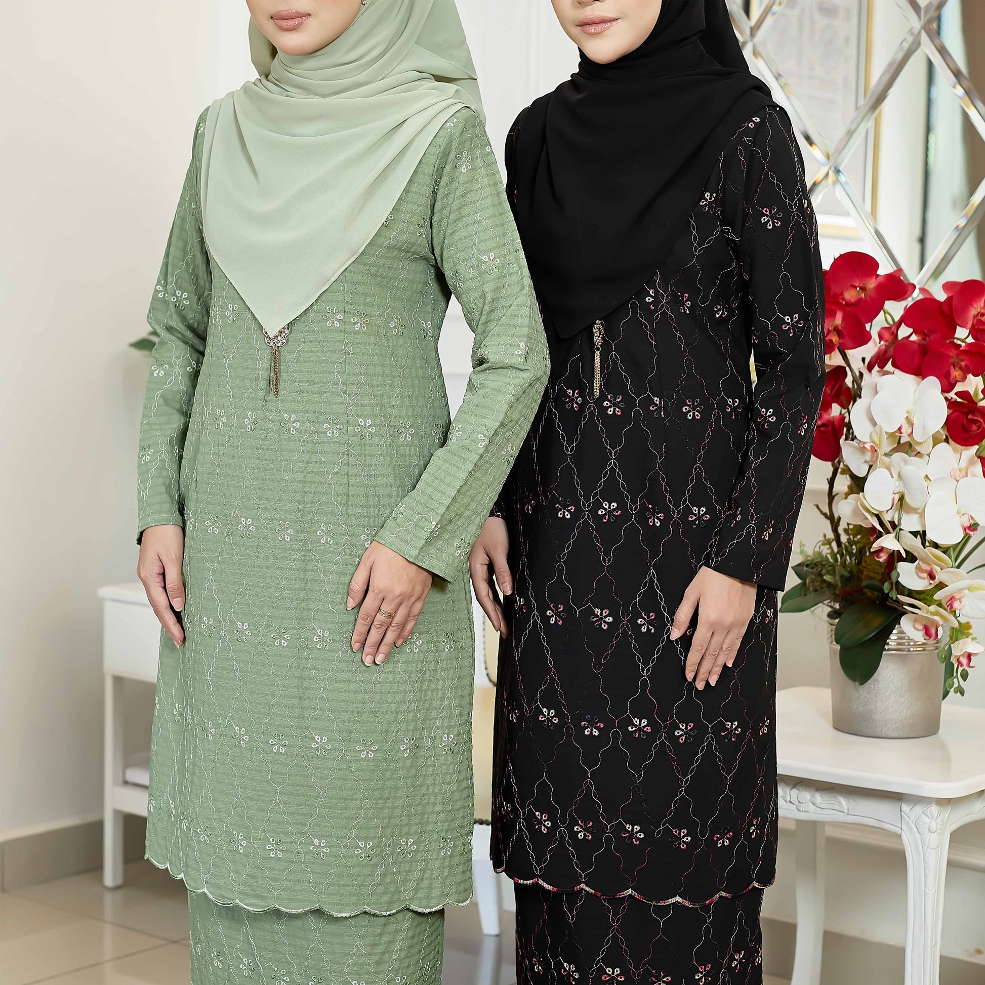 Made with luxurious cotton linen, this outfit features an embossed stripe and daring 3 tone floral embroidery. The vibrant Lipat Batik skirt adds a touch of adventure to your wardrobe. Dare to stand out in this bold and empowering ensemble!