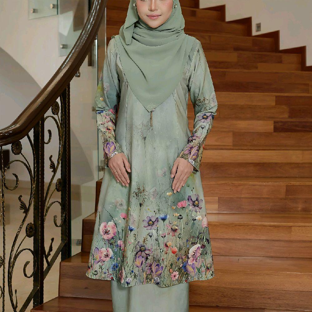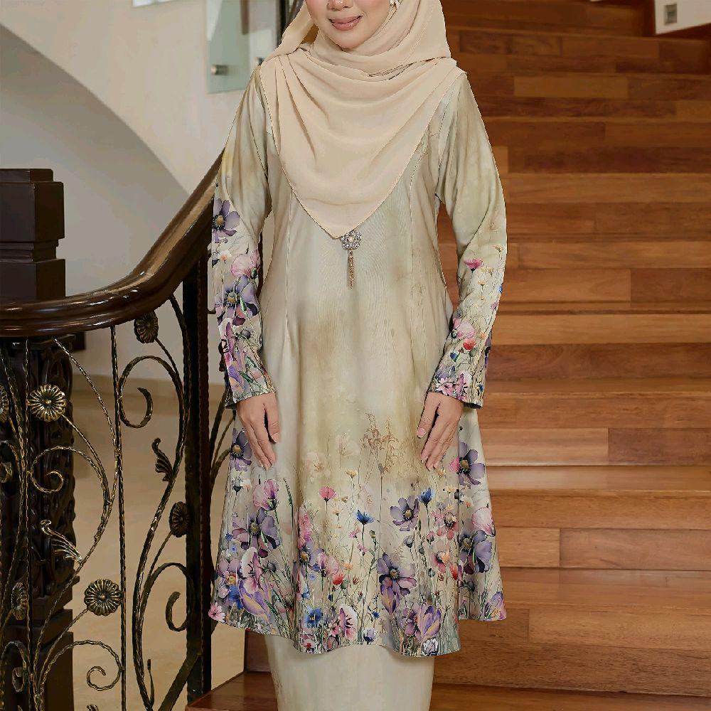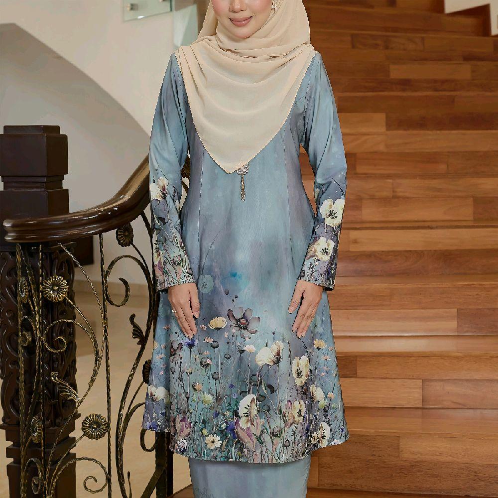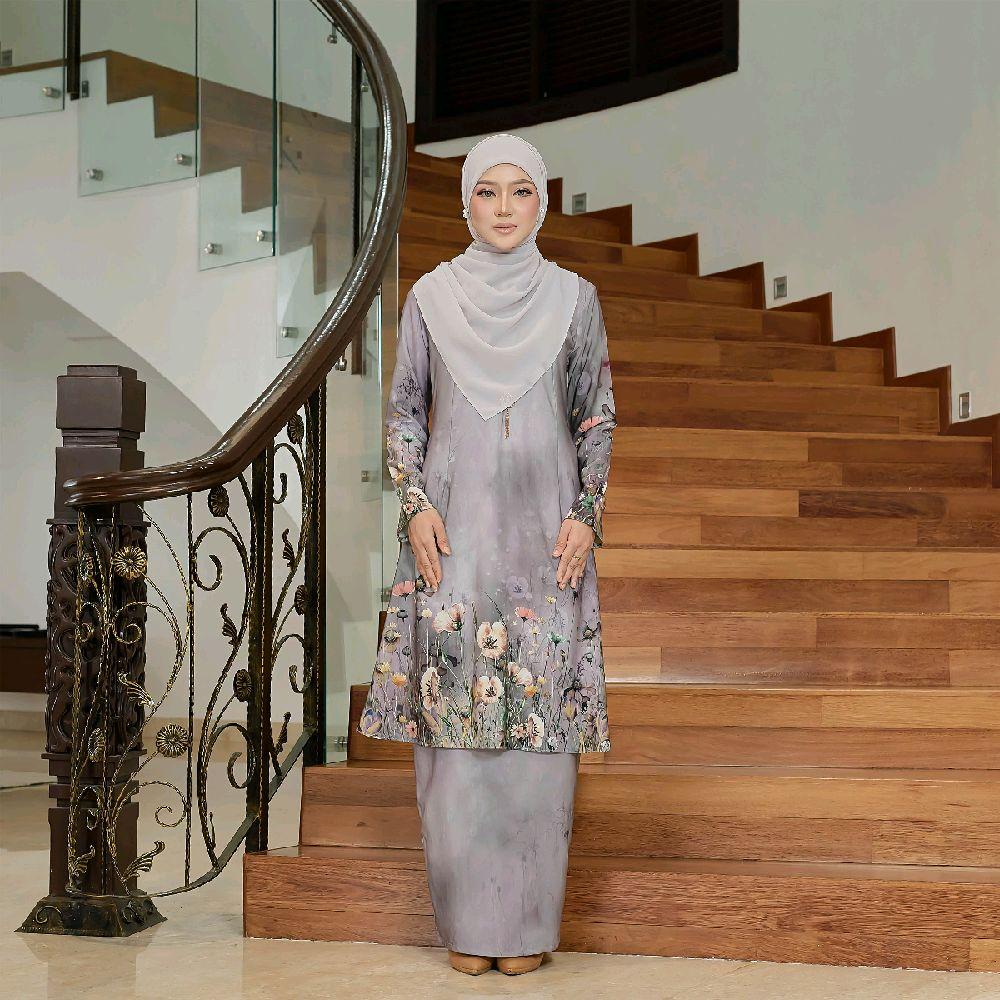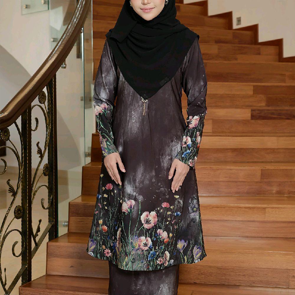 Crafted from Pokka silk, this Natasha Kurung features a daring floral print that will make you stand out from the crowd. The Susun Belakang skirt allows for easy movement, while the convenient chest and wrist zip closures make this outfit perfect for nursing and wudhu-friendly.