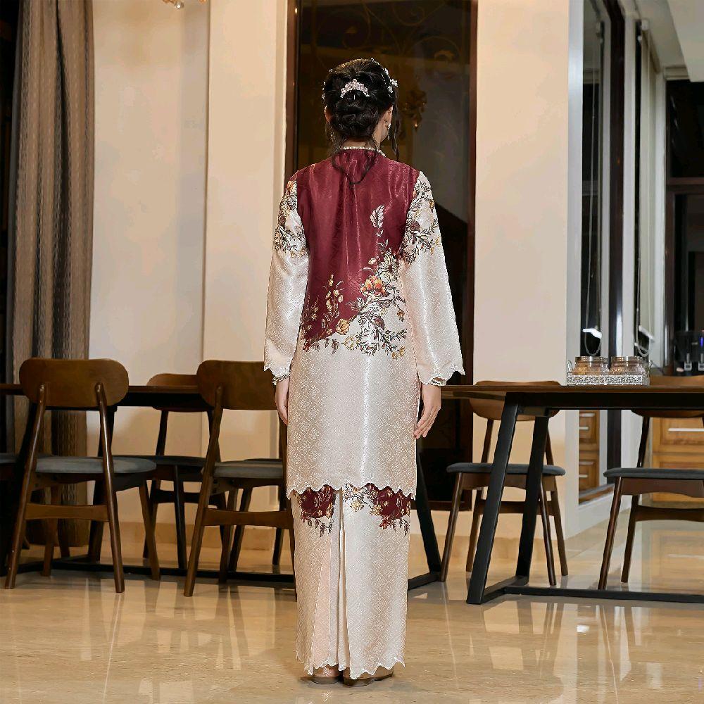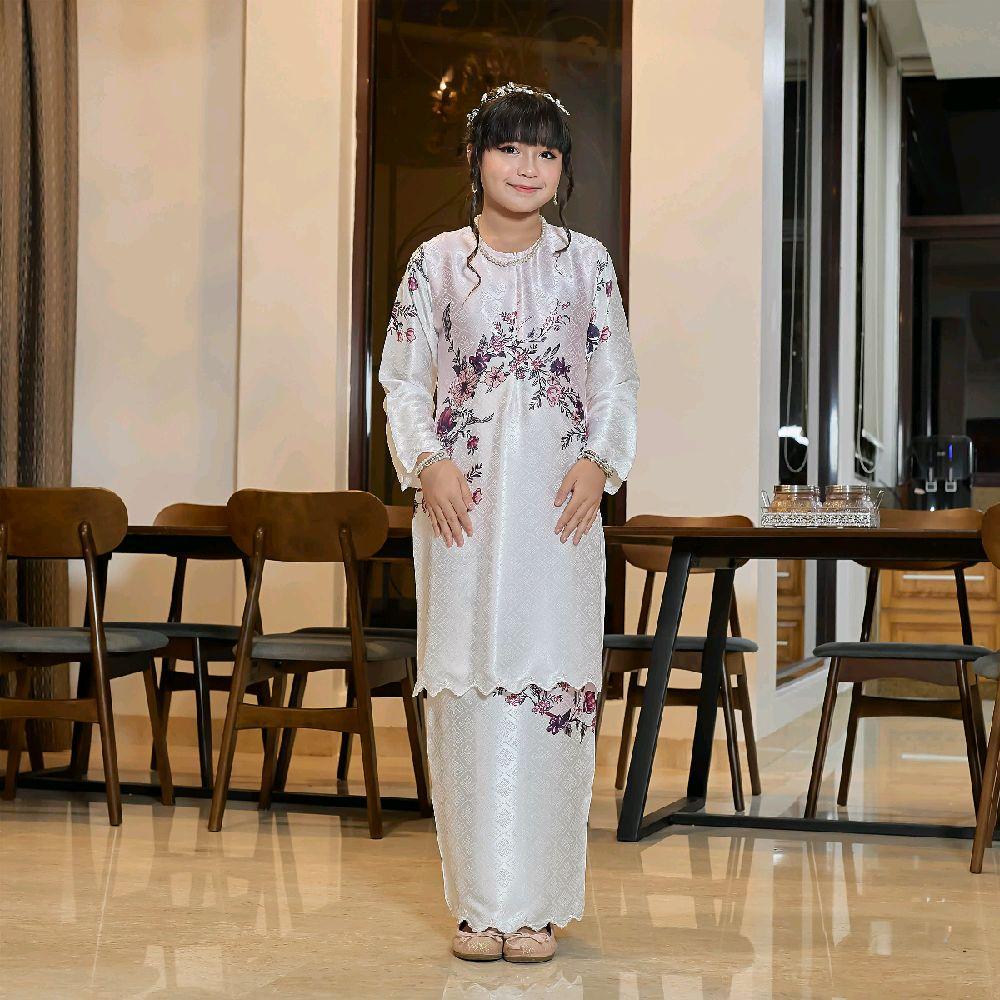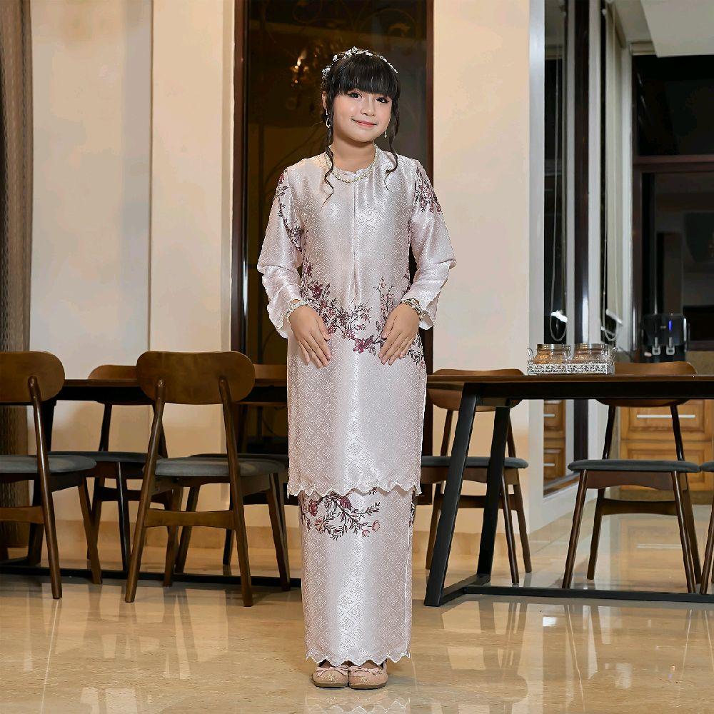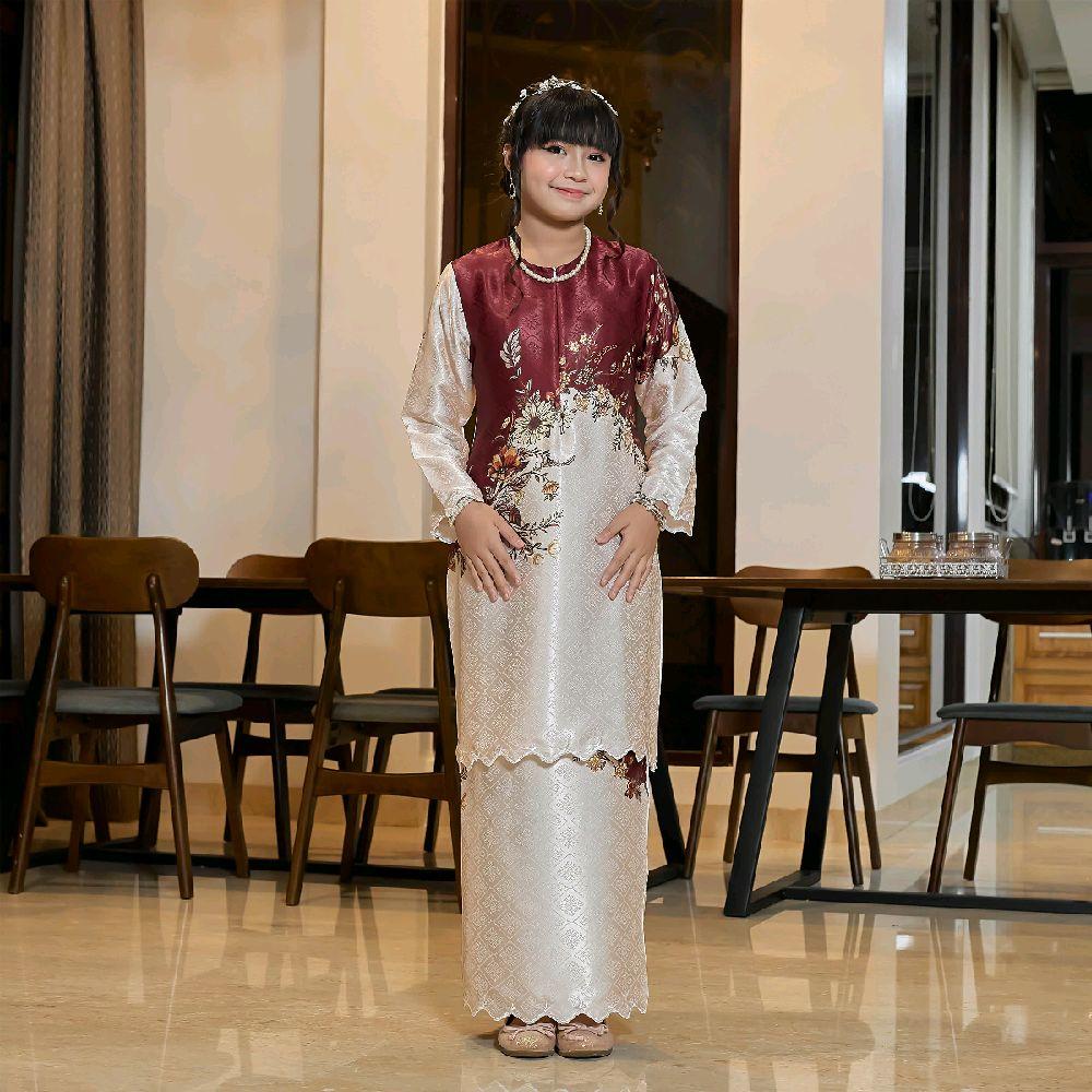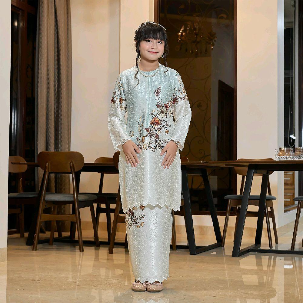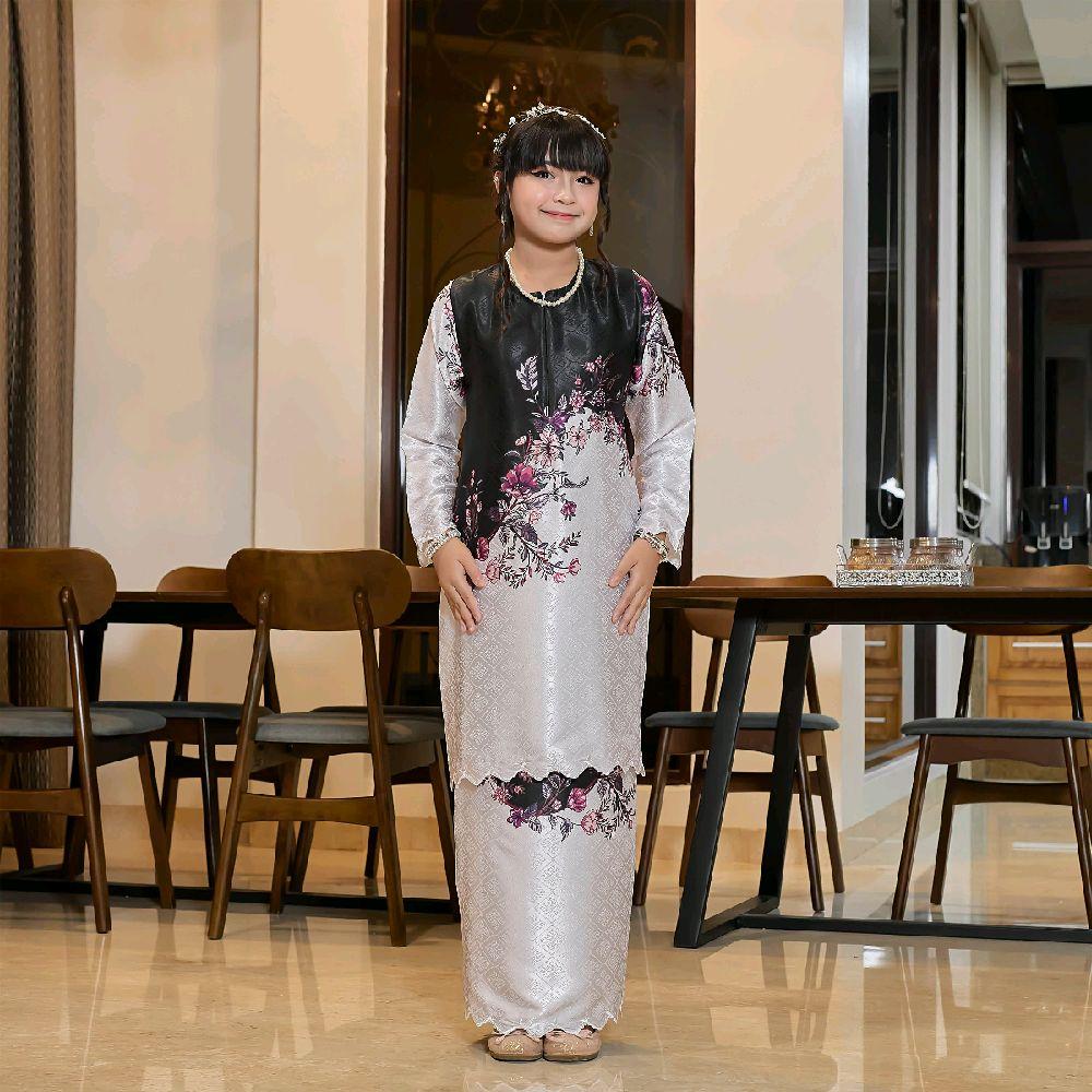 Crafted from Jacquard fabric, the Nelly Kids Kurung showcases a delightful printed floral design with an elegant shimmery woven texture. This beautiful traditional attire combines comfort with eye-catching details that your little one will love.