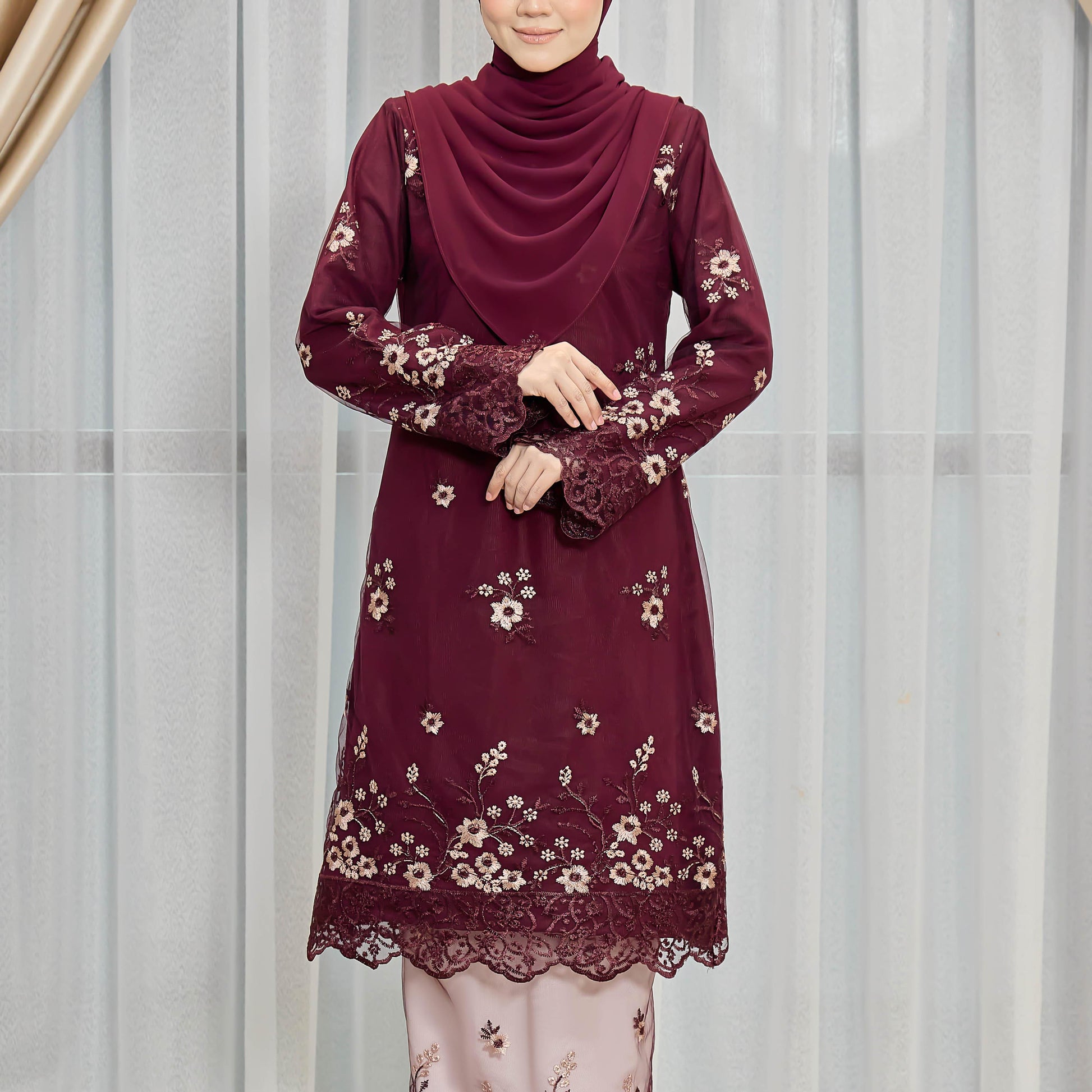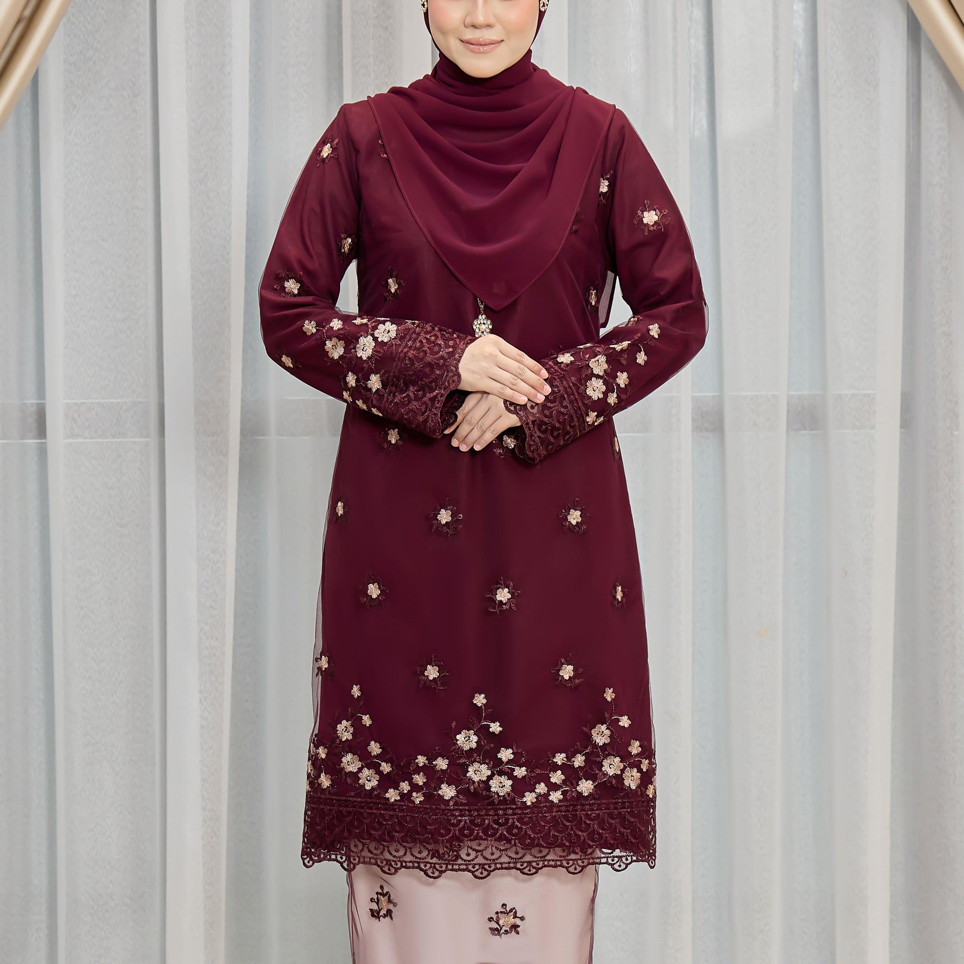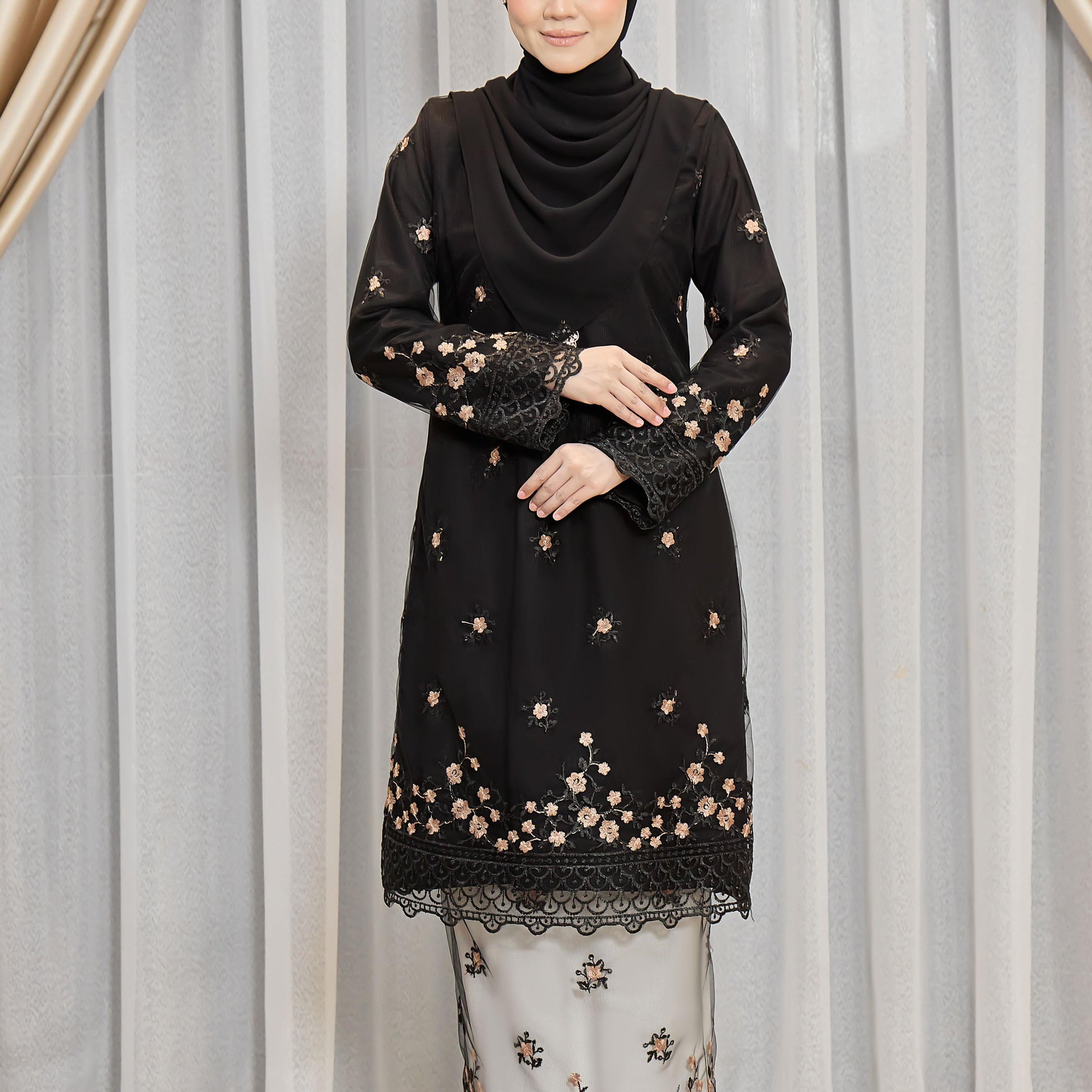 The Carline Kurung combines lace sequins with a soft Como Crepe lining. It has a floral lace design, a chest zip for easy nursing, loose cuffs for wudhu, and a susun belakang skirt for comfort and ease of movement.