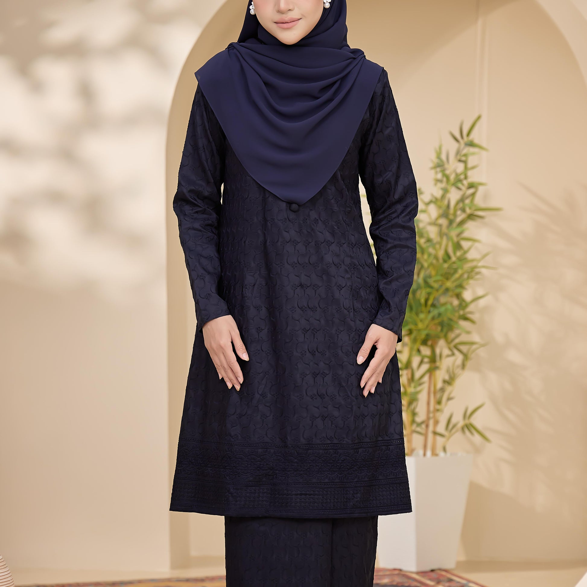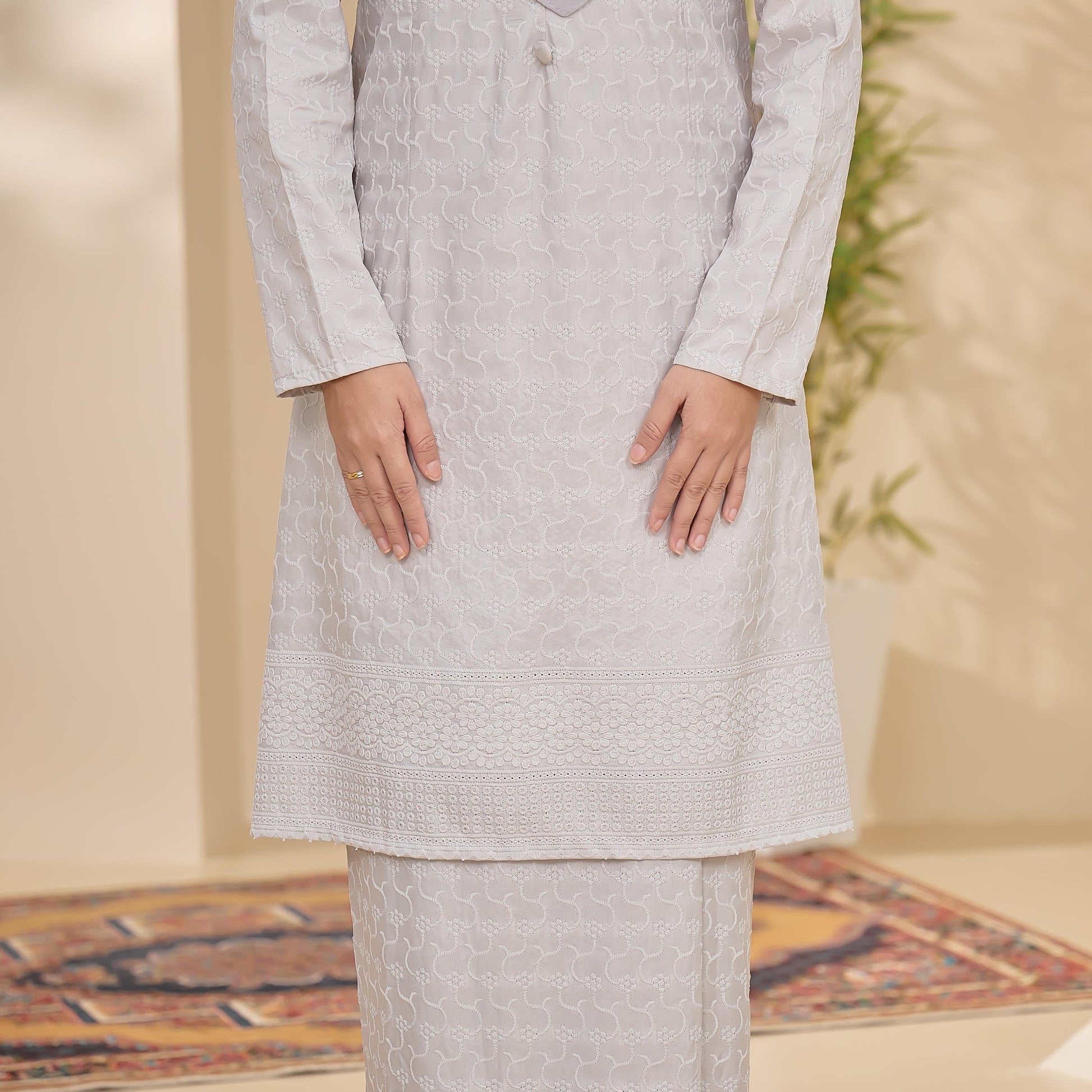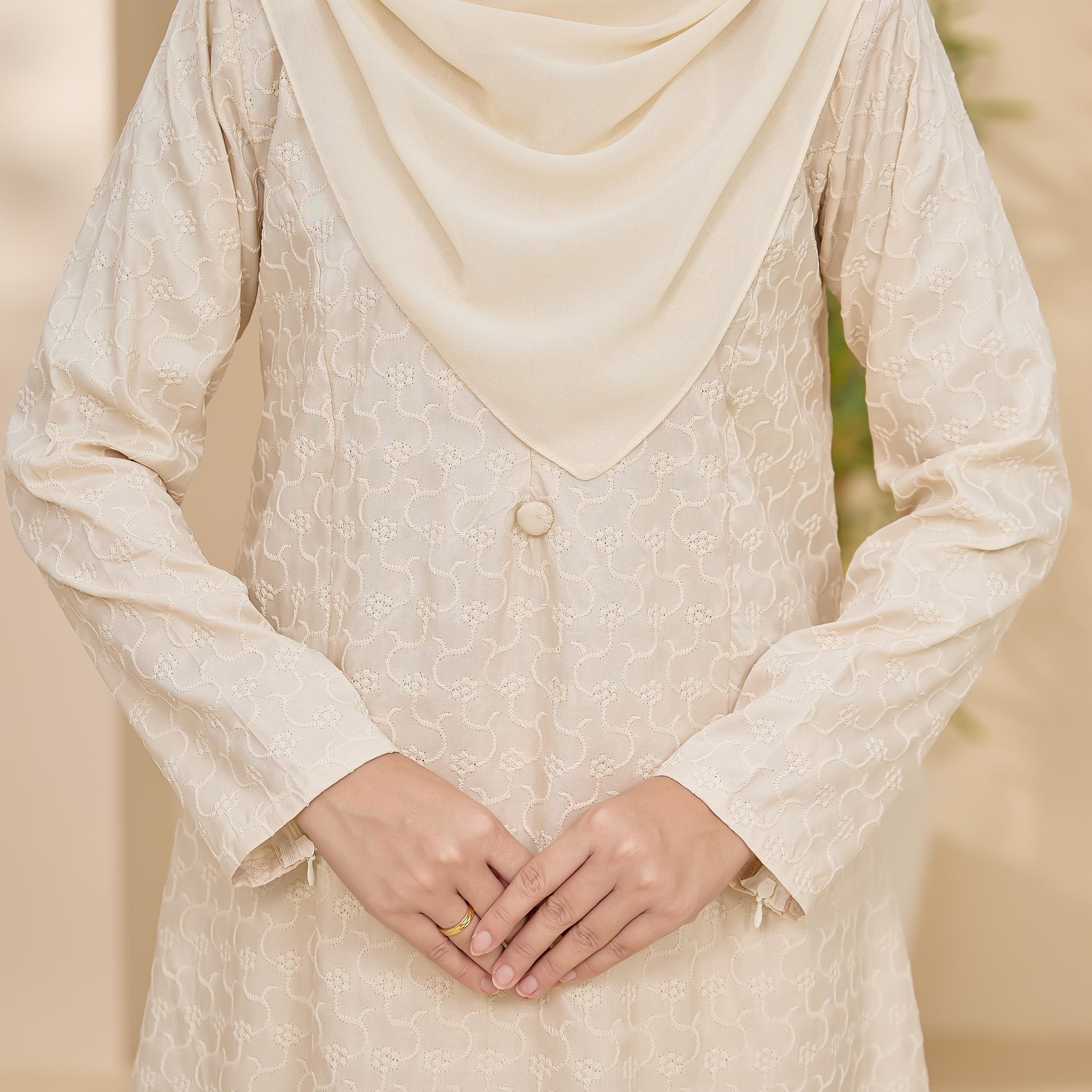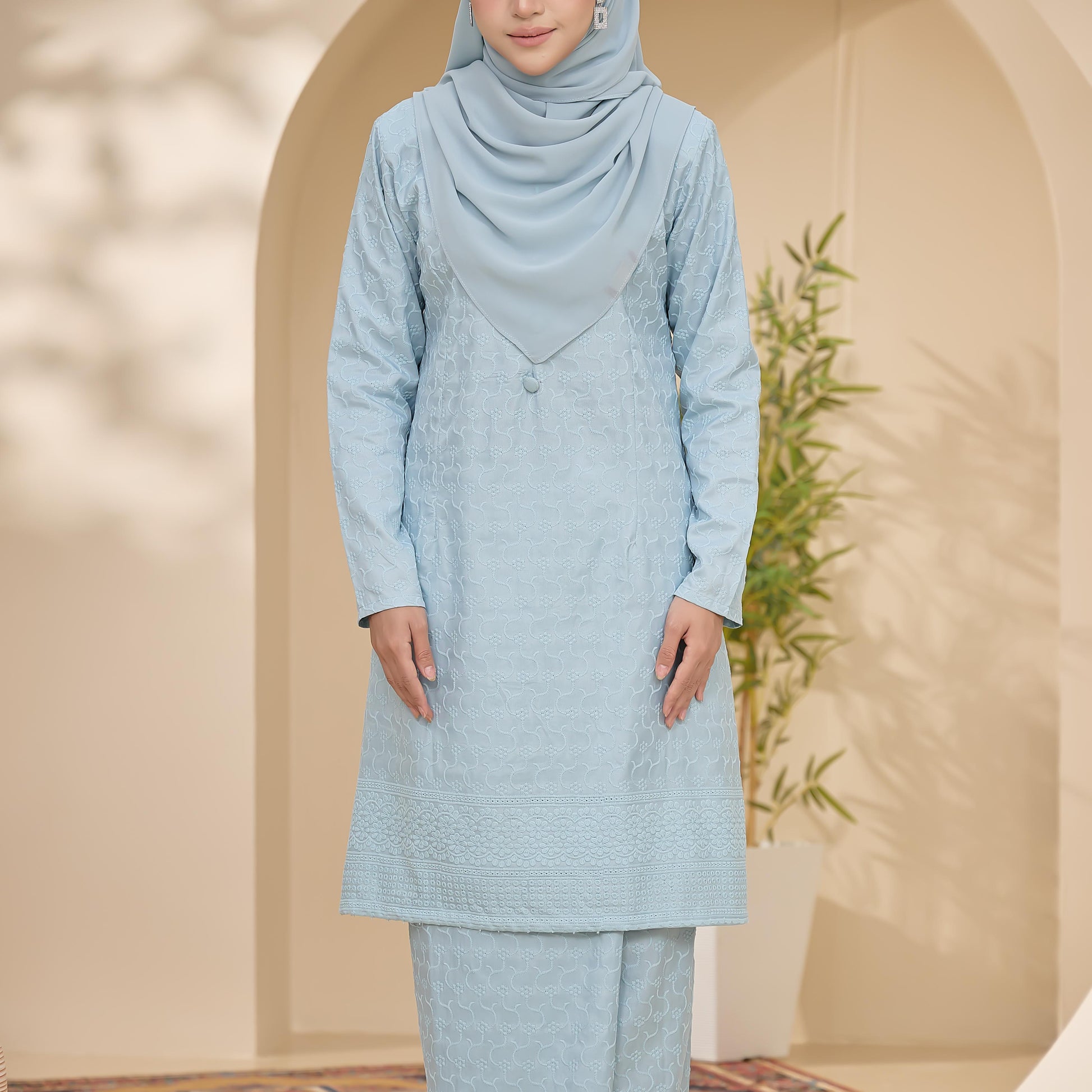 The Veronica Kurung is made from embossed cotton embroidery with a decorative button and lipat batik skirt. It includes a chest zip for nursing and a wrist zip for wudhu, combining style with practicality.