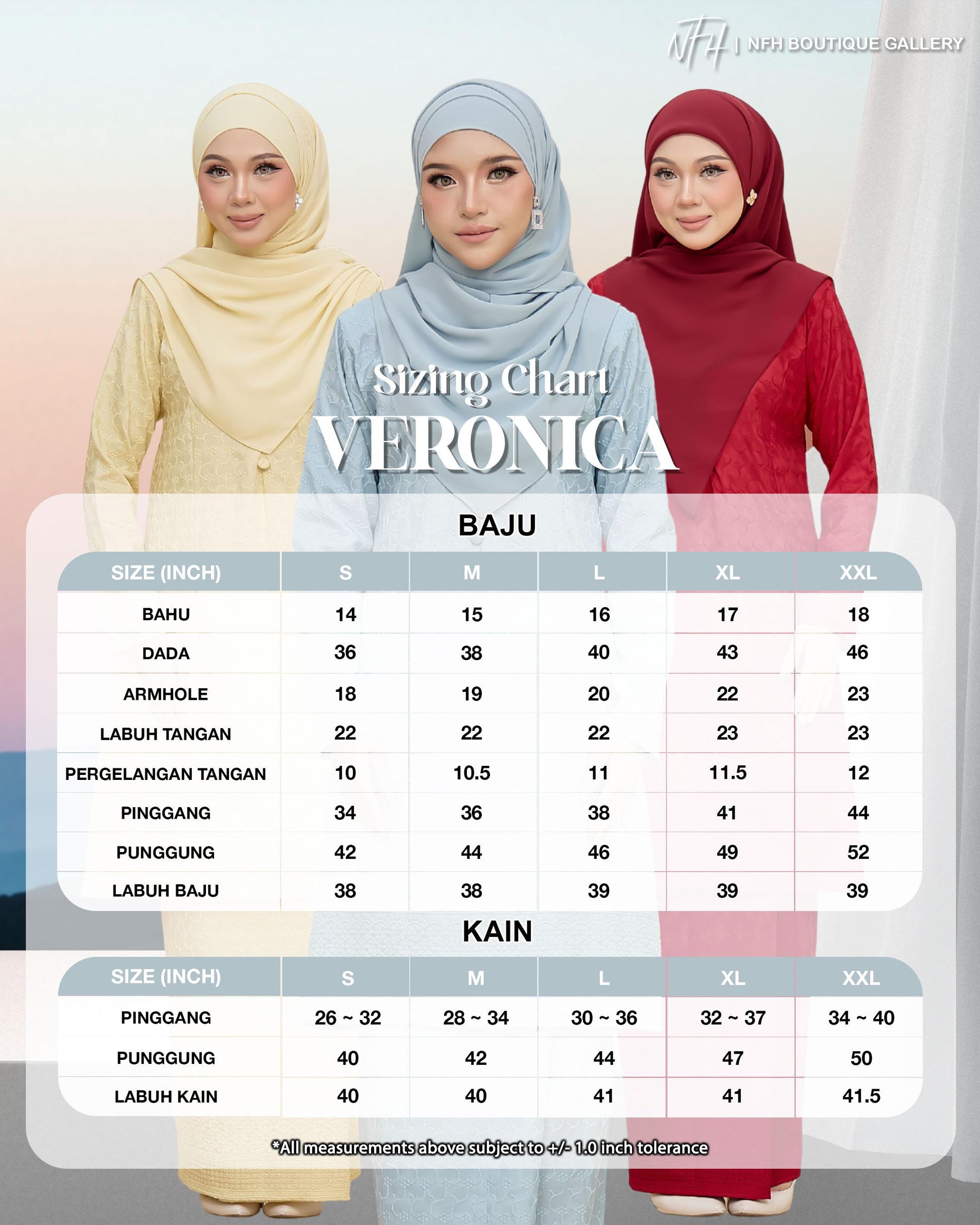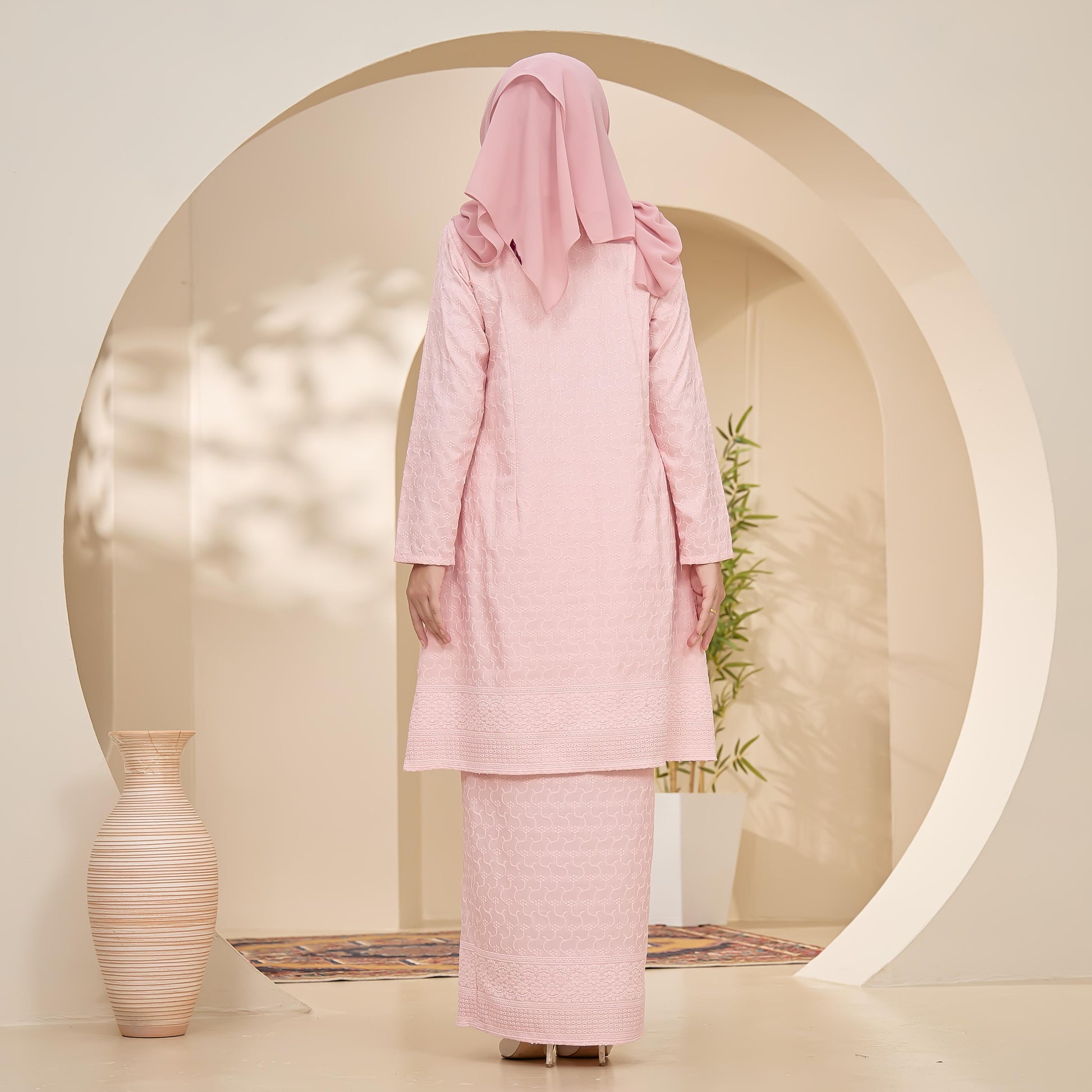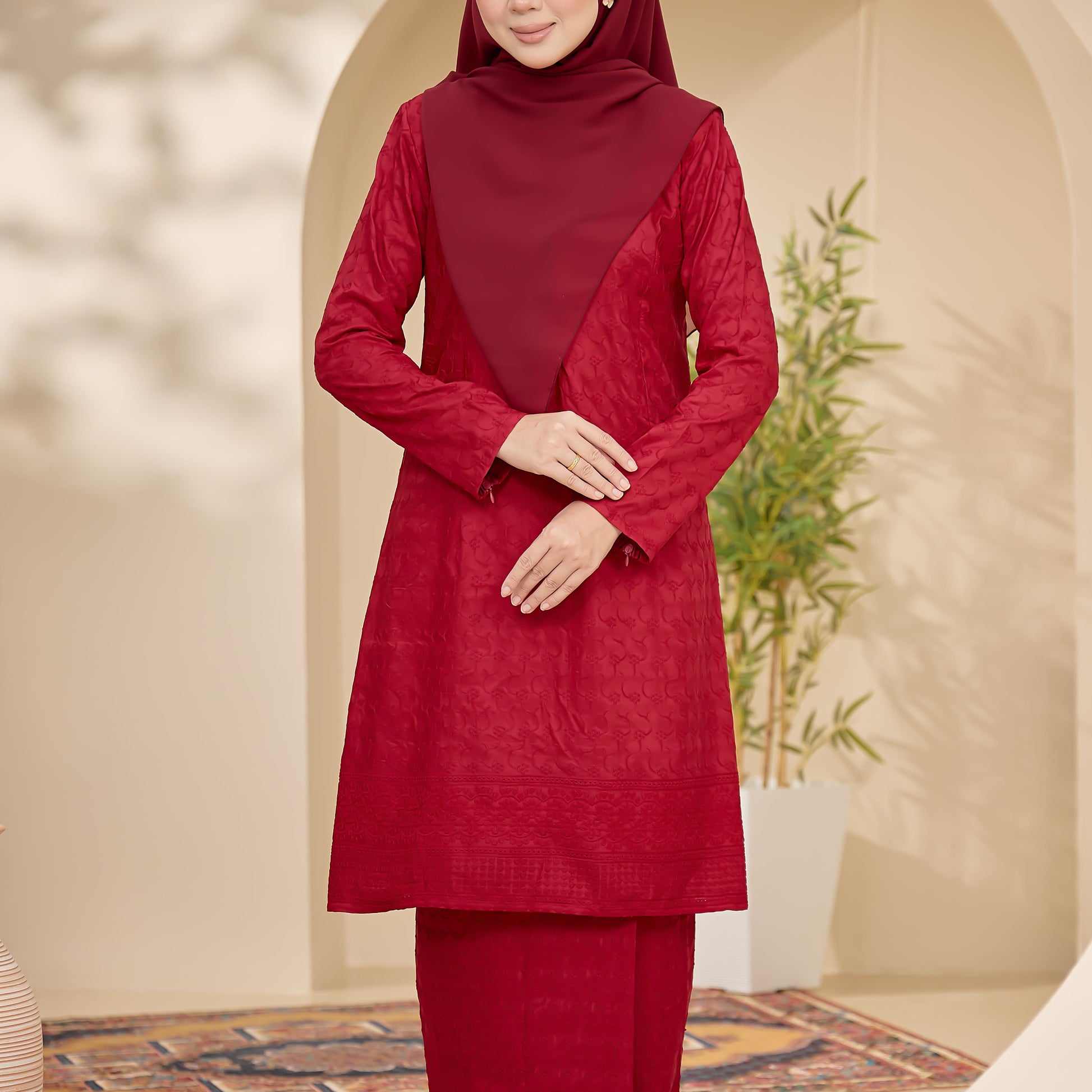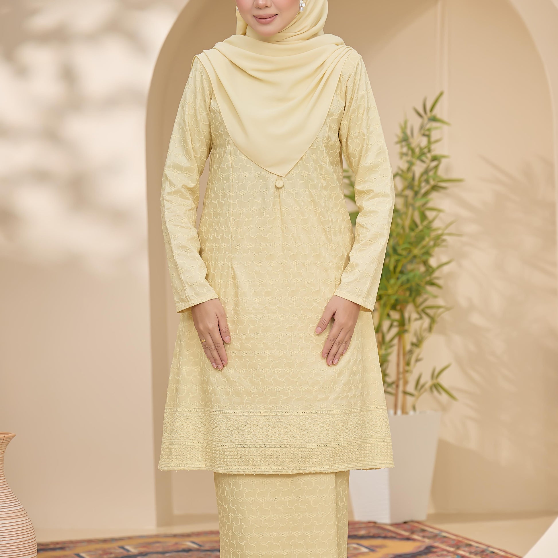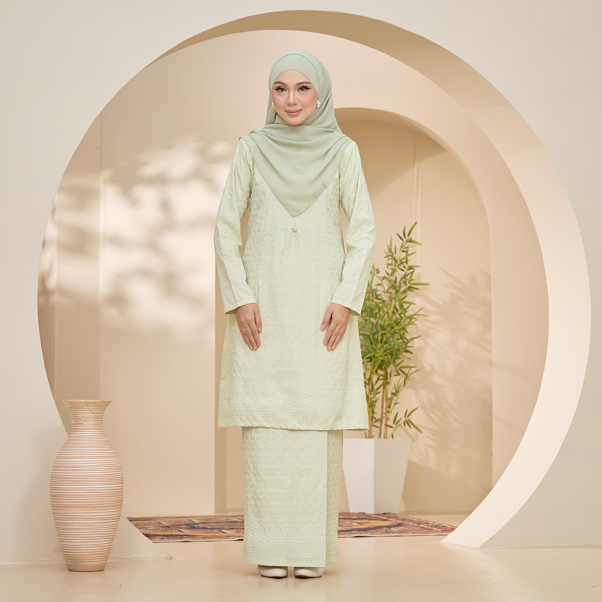 The Veronica Kurung is made from embossed cotton embroidery with a decorative button and lipat batik skirt. It includes a chest zip for nursing and a wrist zip for wudhu, combining style with practicality.