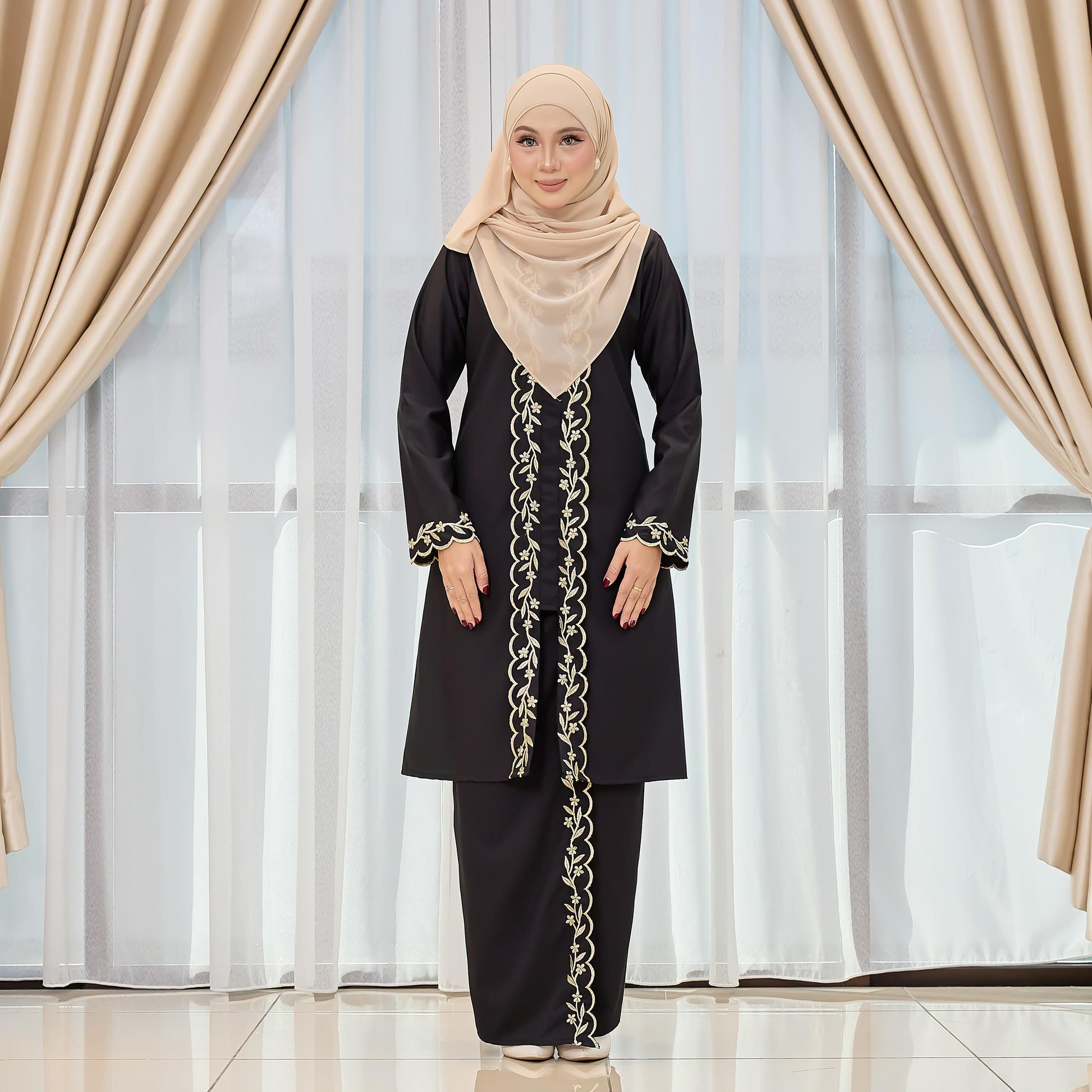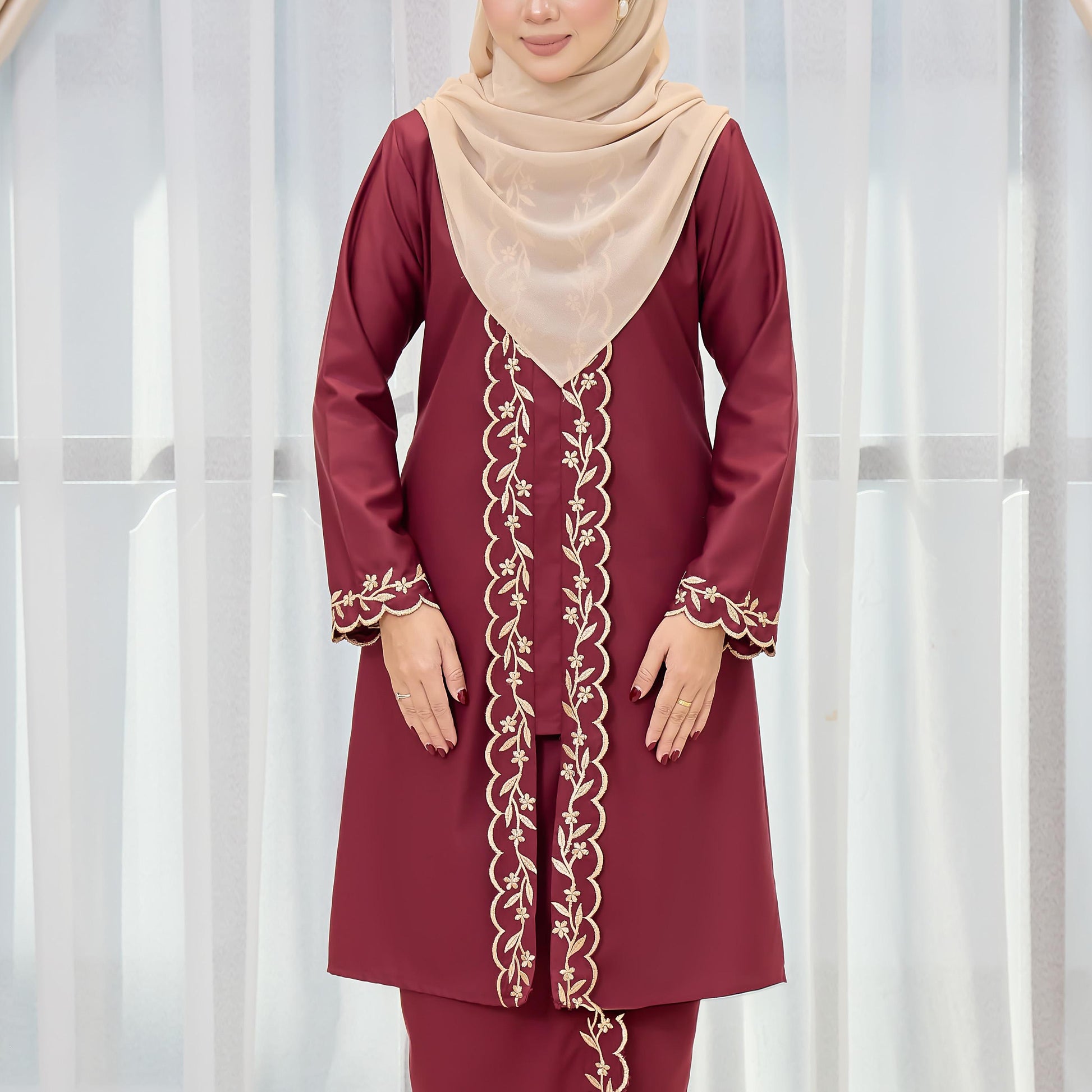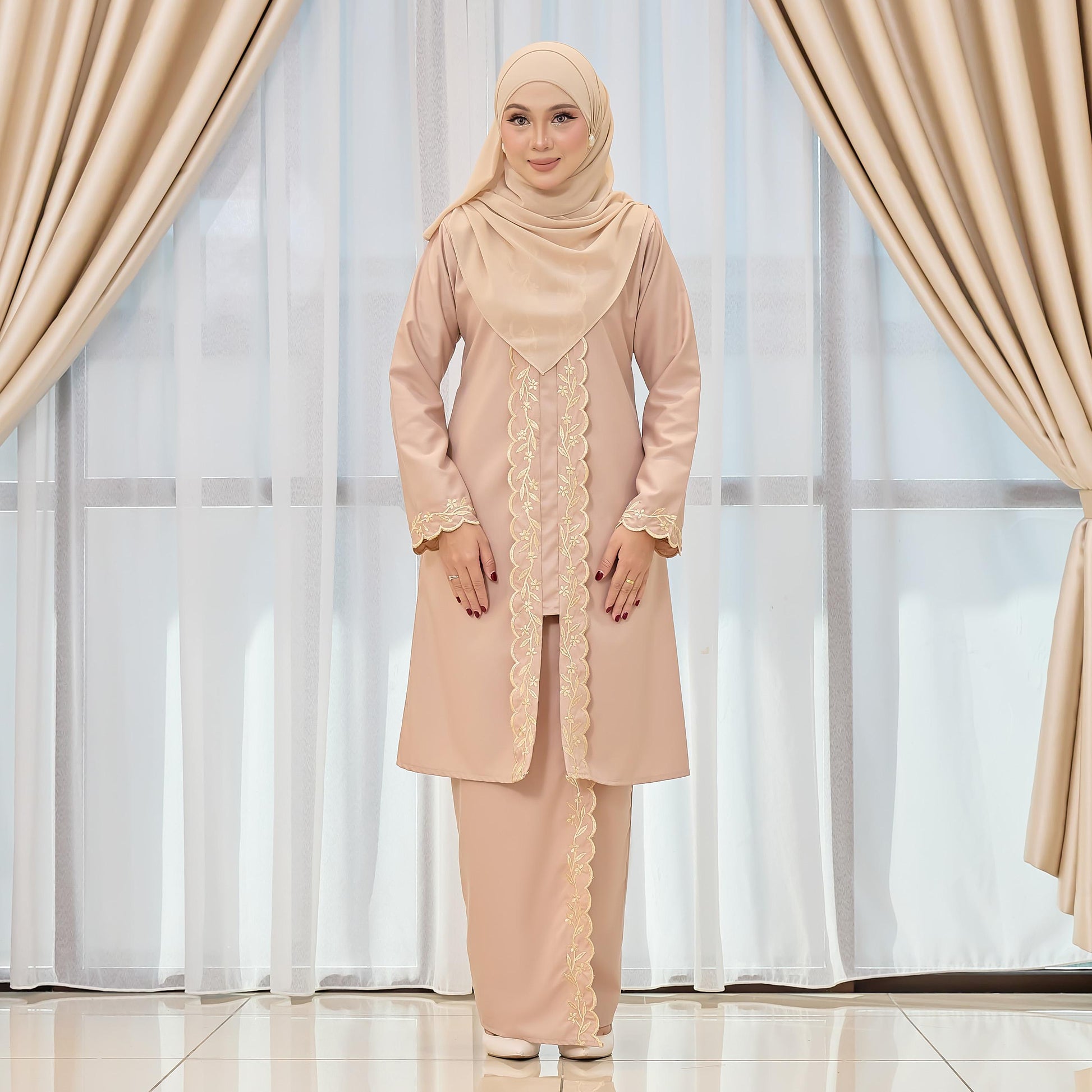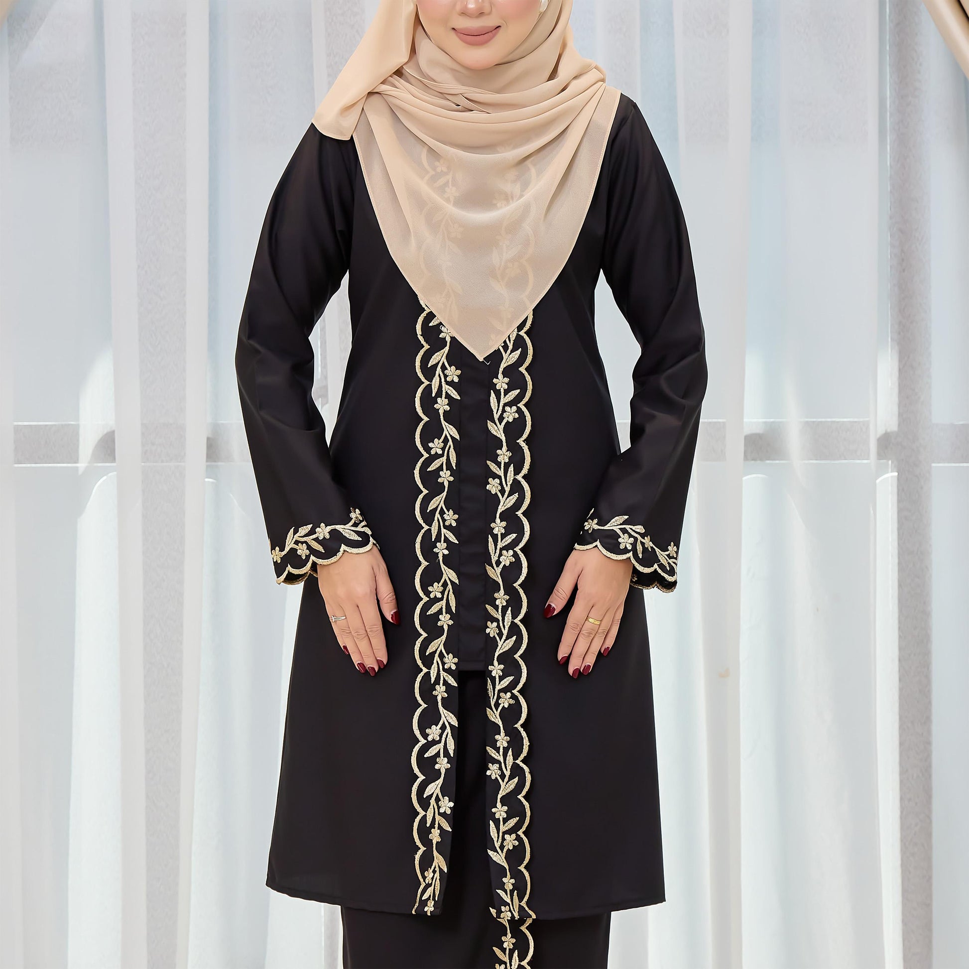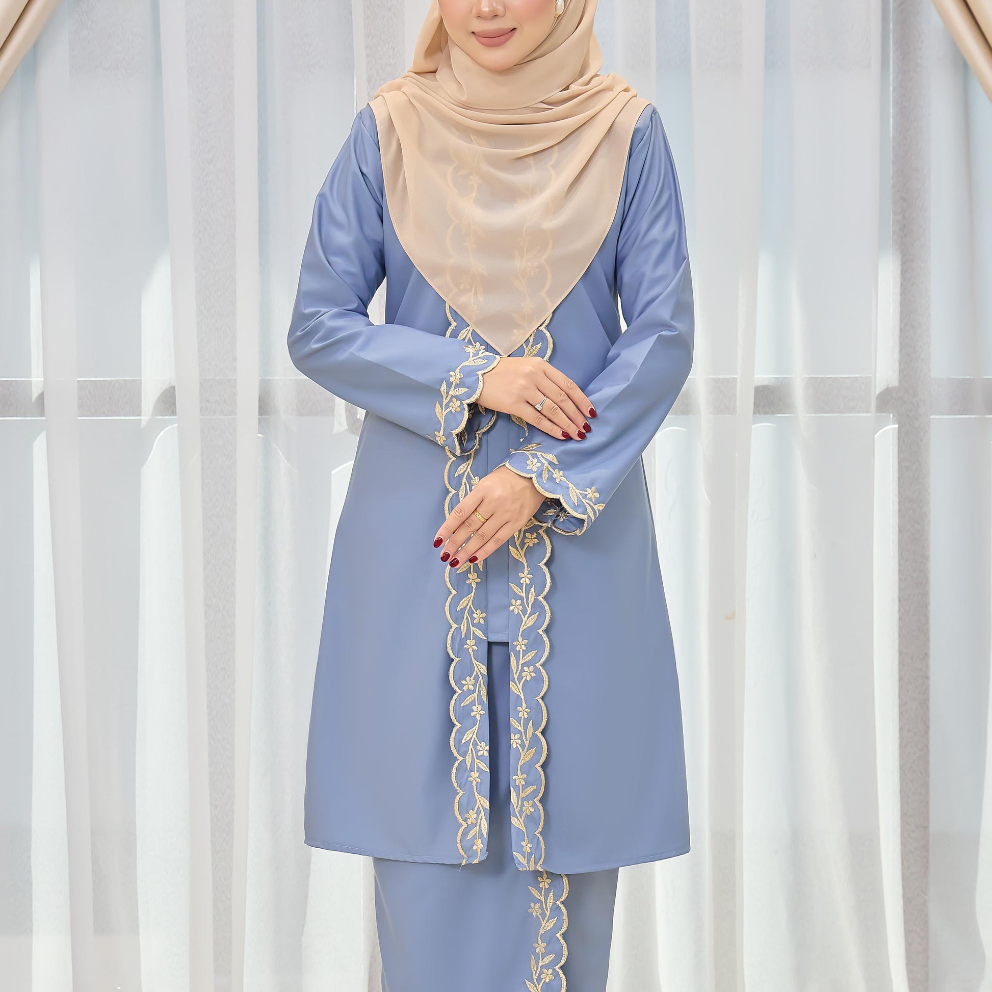 Made from premium cotton, the Nilam Sari Kebarung is comfortable and breathable. It features elegant embroidery, a susun belakang skirt, a chest zip for easy nursing, and loose cuffs for wudhu convenience.