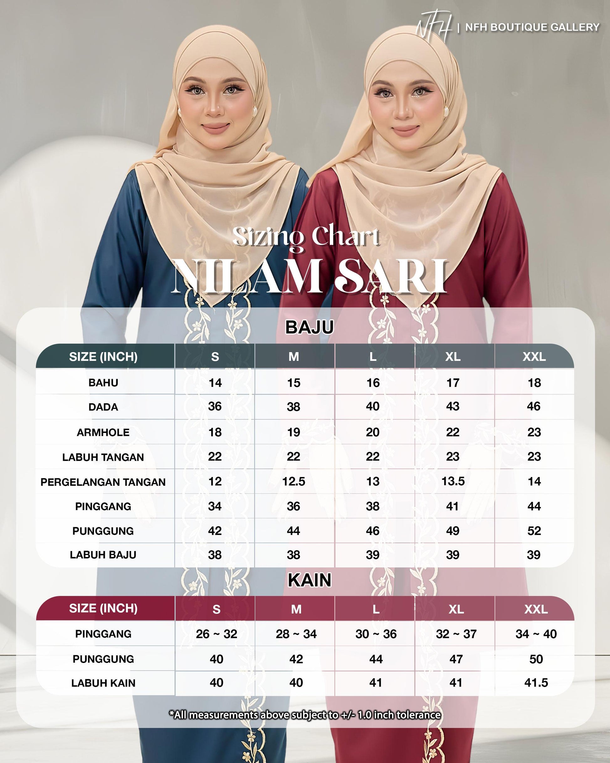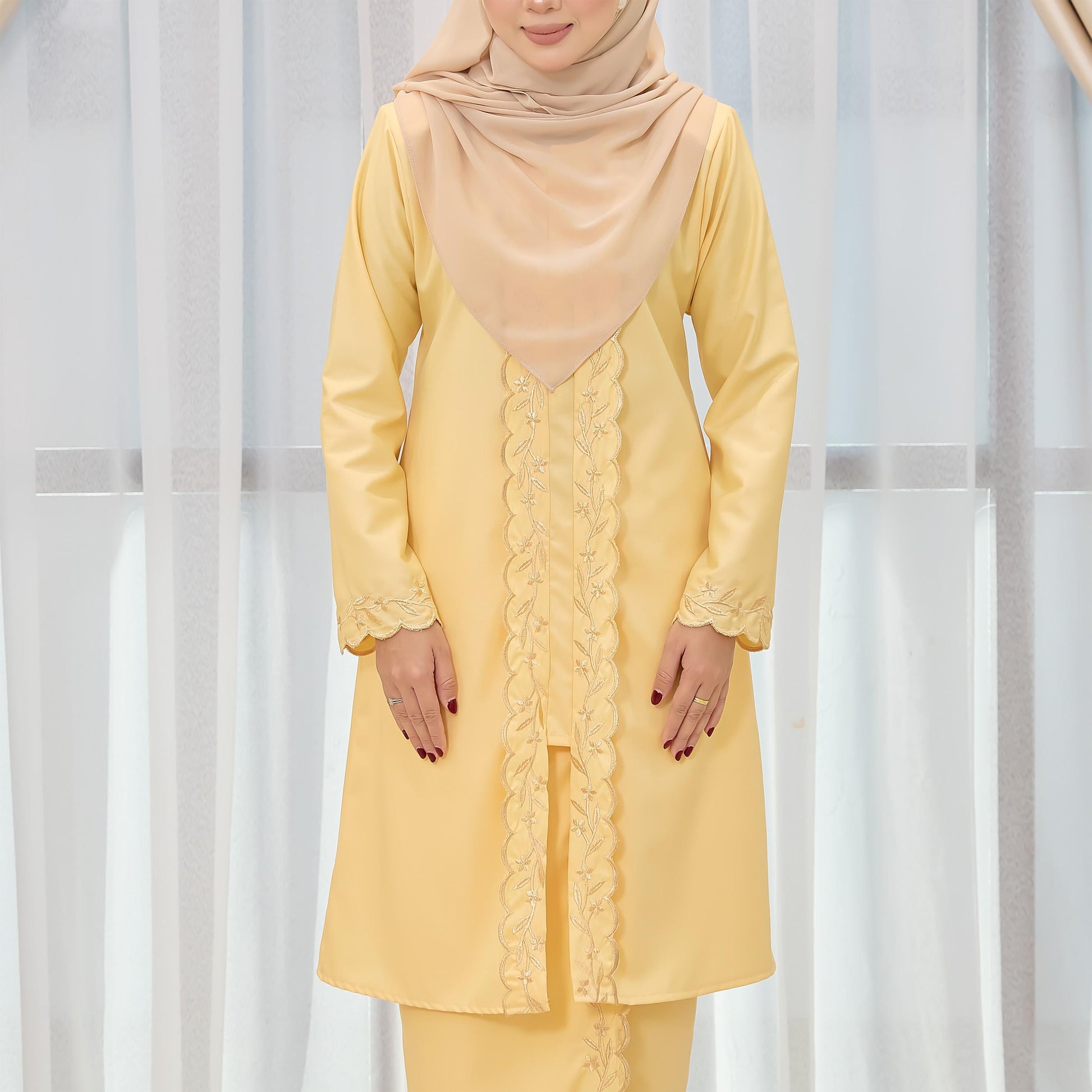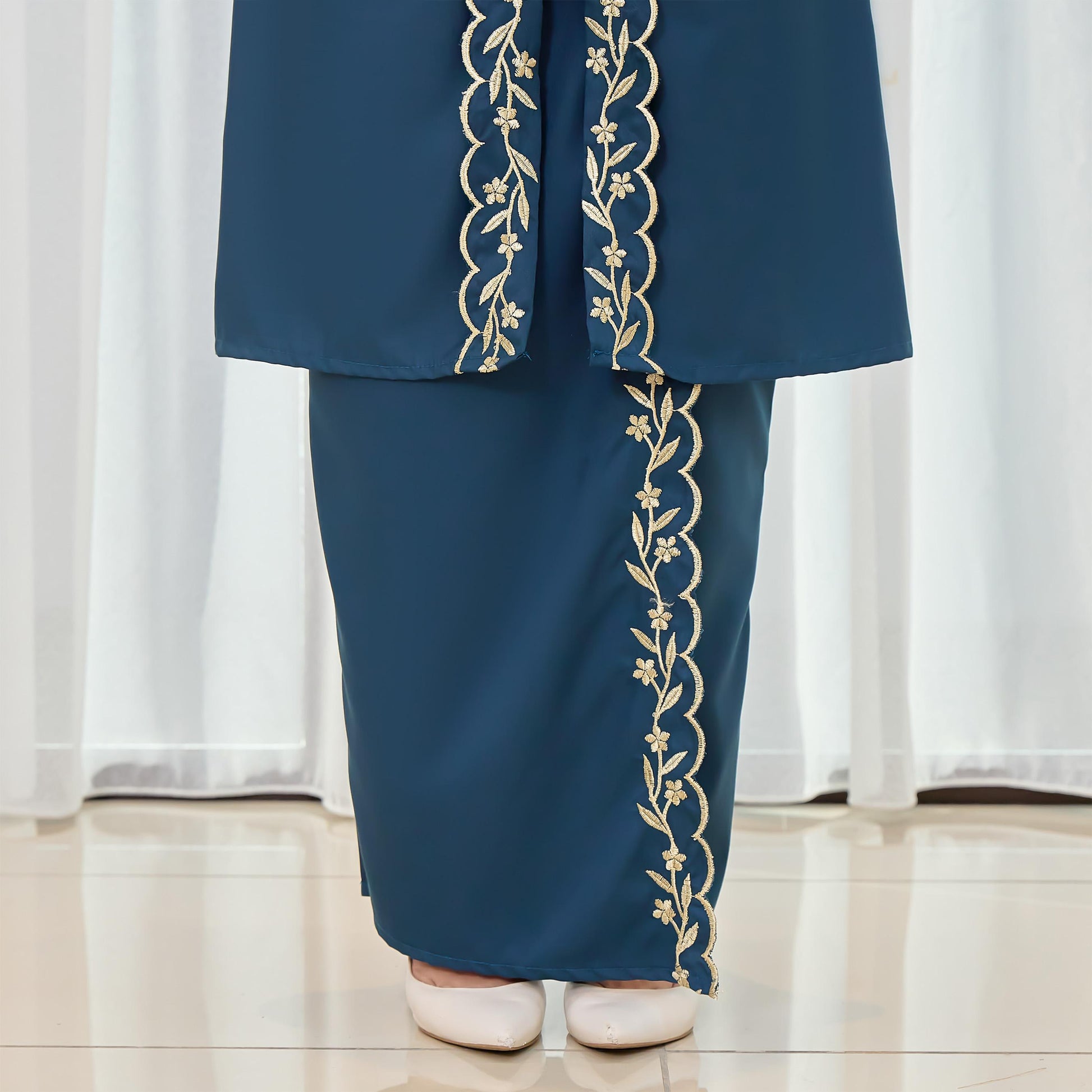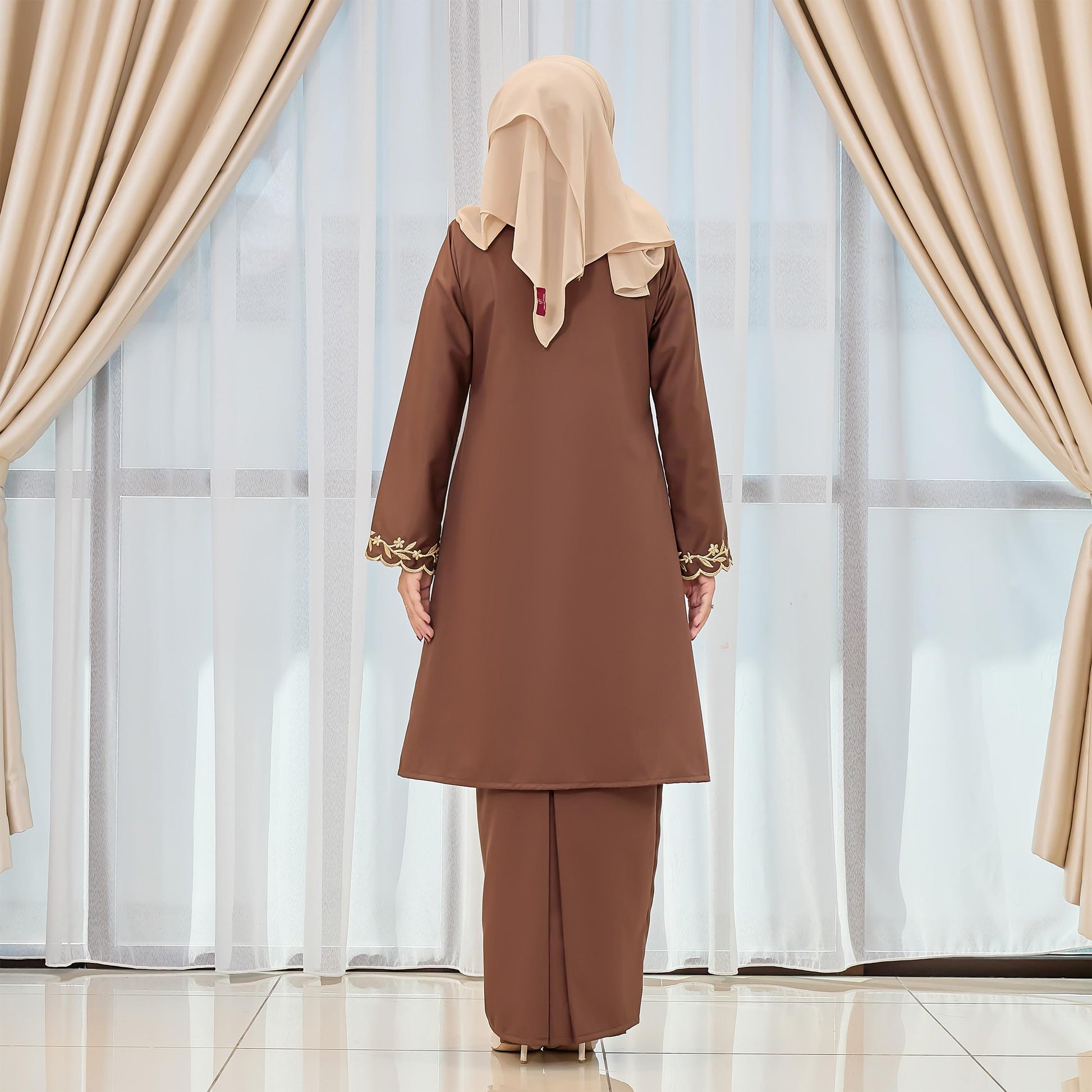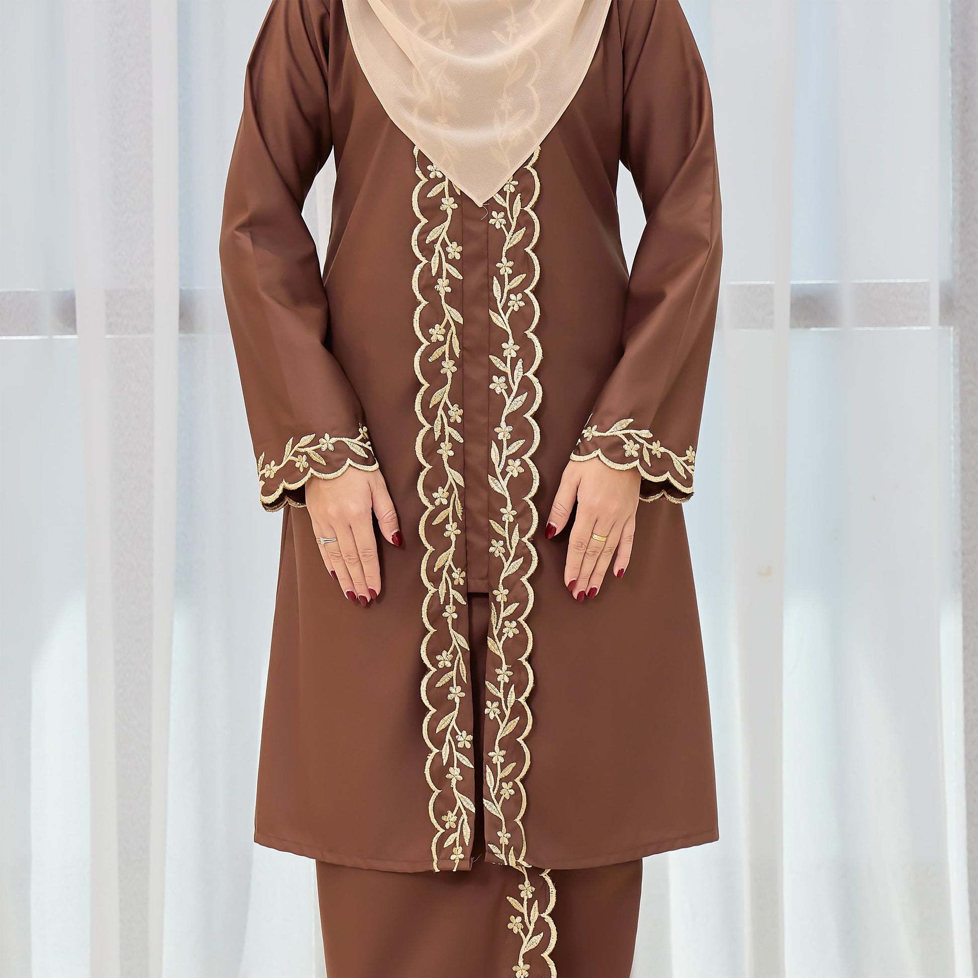 Made from premium cotton, the Nilam Sari Kebarung is comfortable and breathable. It features elegant embroidery, a susun belakang skirt, a chest zip for easy nursing, and loose cuffs for wudhu convenience.