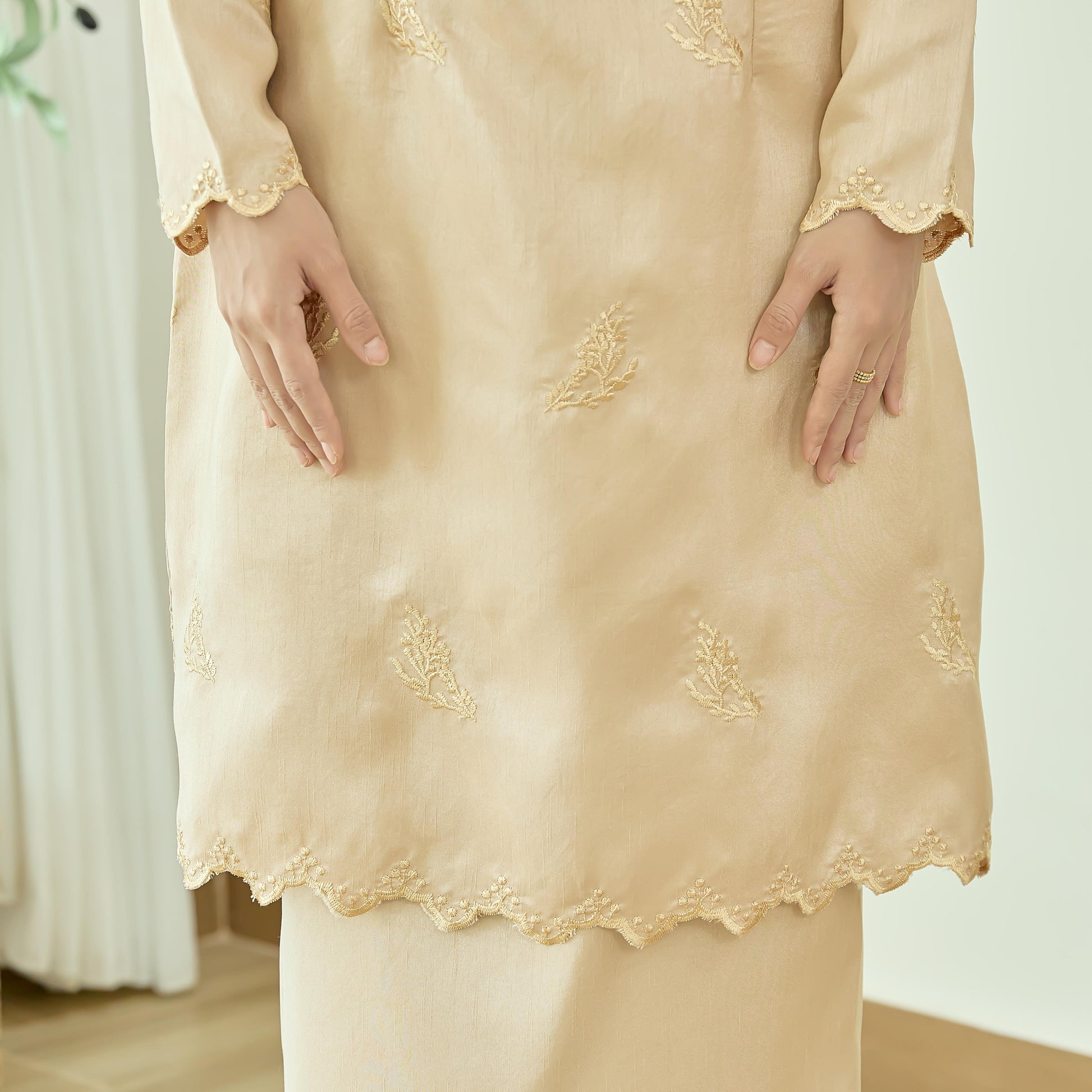 Made from Shantung silk with floral embroidery, the Nulisa Kurung includes a chest zip for nursing and wrist zips for wudhu. The susun belakang skirt offers ease of movement and comfort.