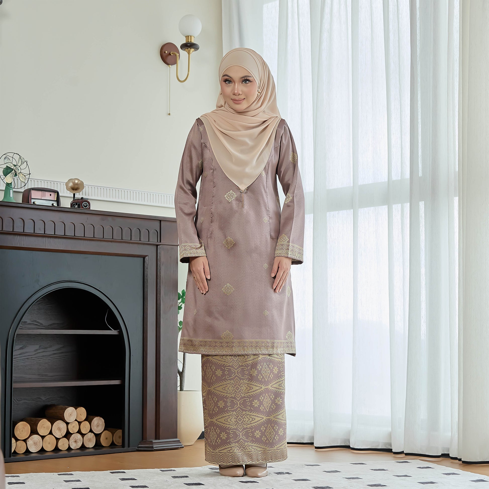 Made from Thai Songket fabric, the Petra Kurung features a susun belakang skirt, a chest zip for easy nursing, and loose cuffs for wudhu convenience.