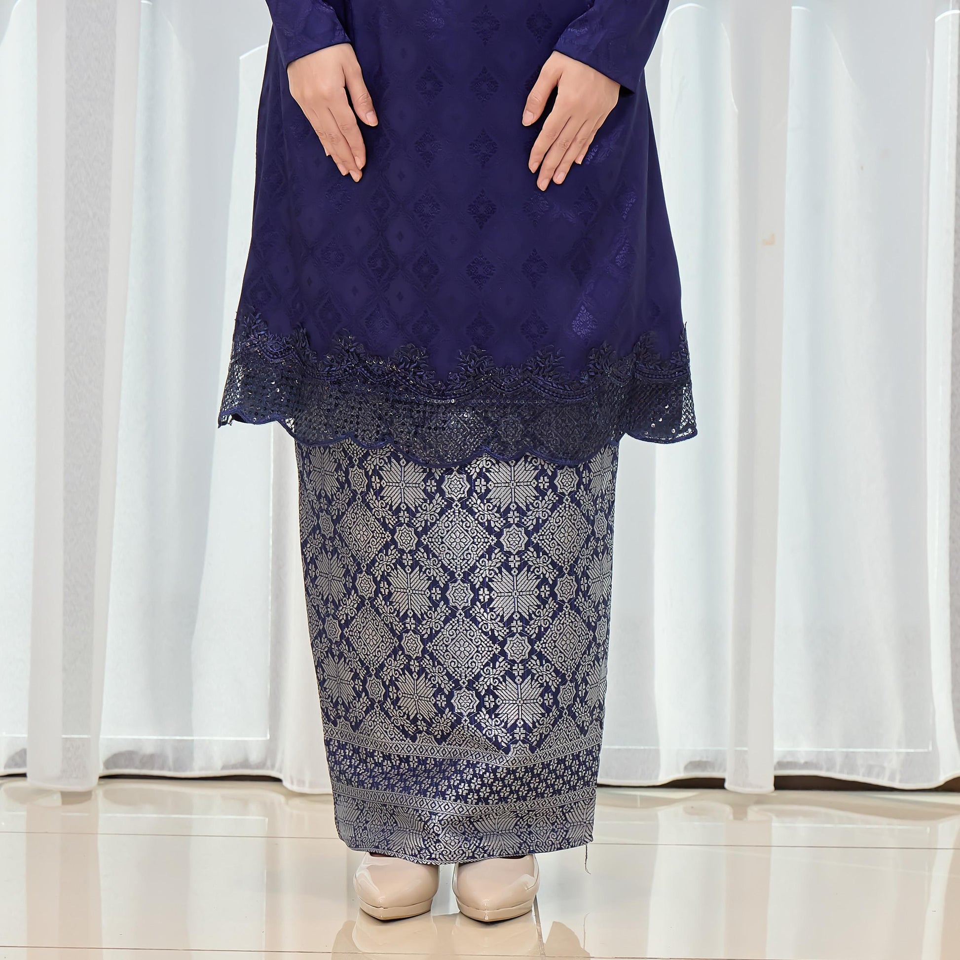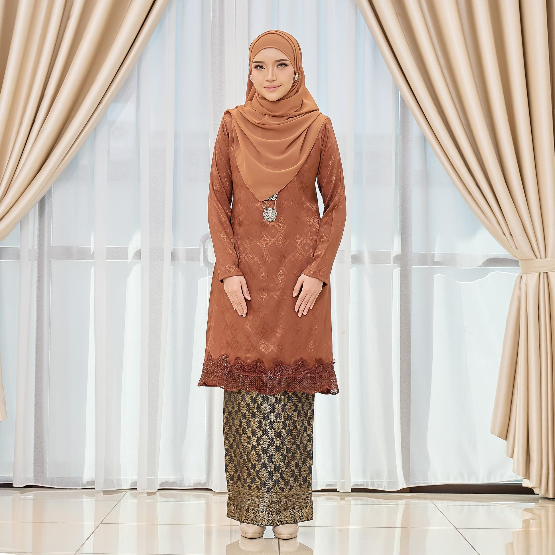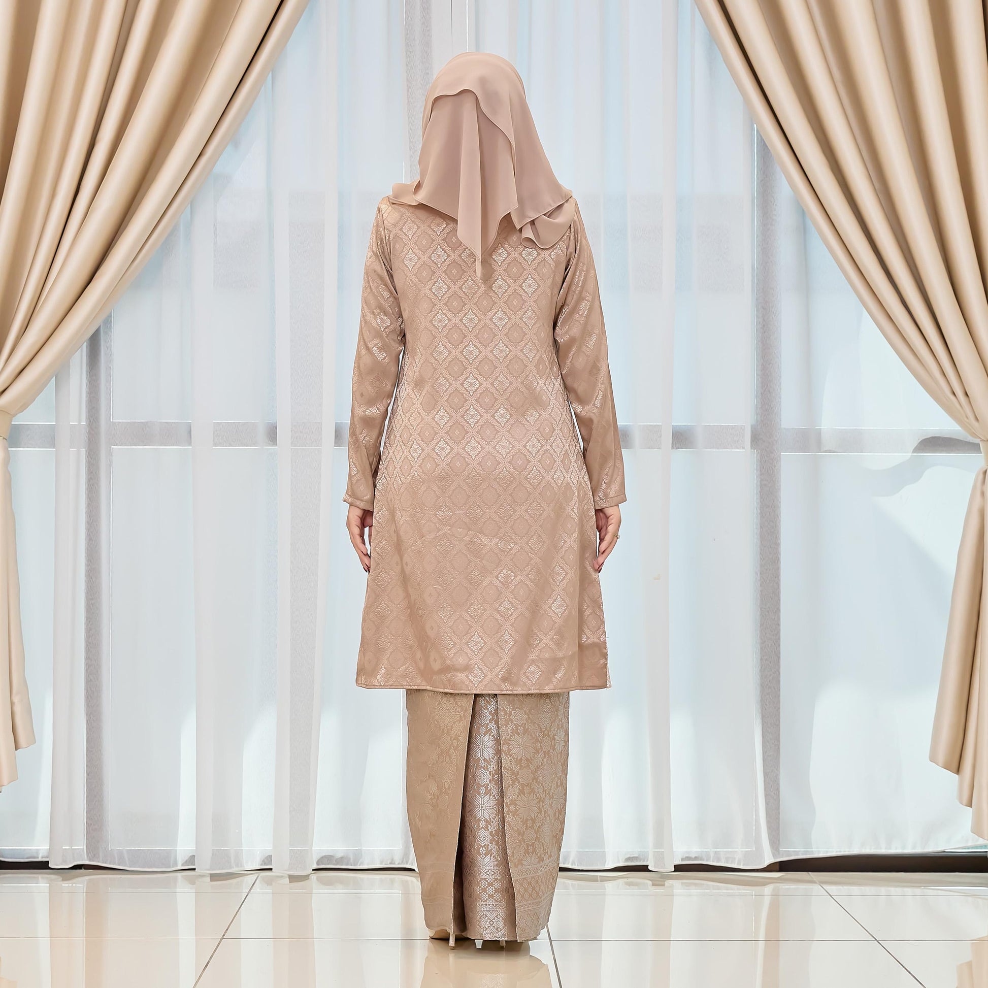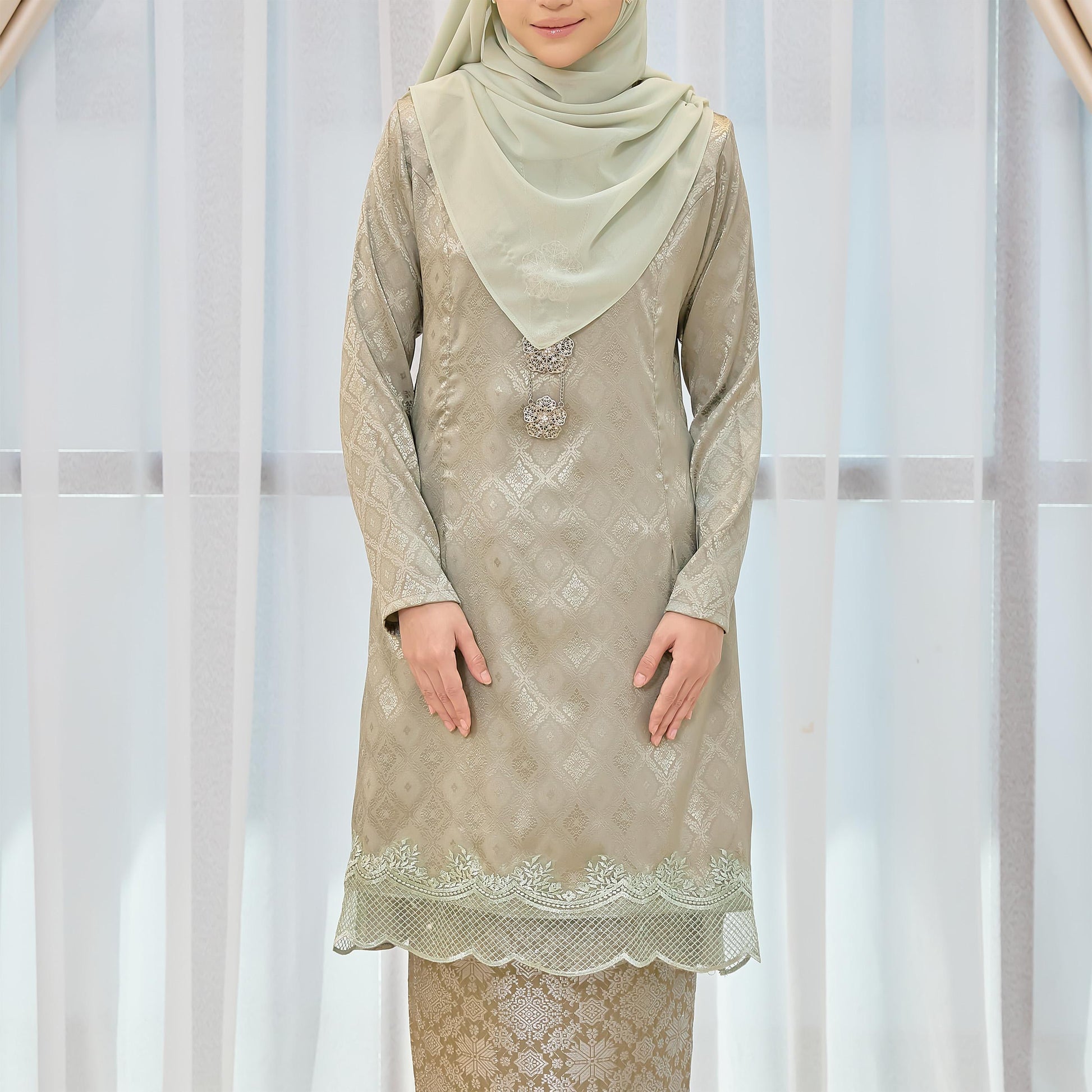 The Qaleesa Kurung combines a jacquard and lace top with a songket skirt, featuring a shimmery pattern and lace trim. It has a chest zip for nursing and wrist zips for easy wudhu, with a susun belakang skirt for comfortable movement.