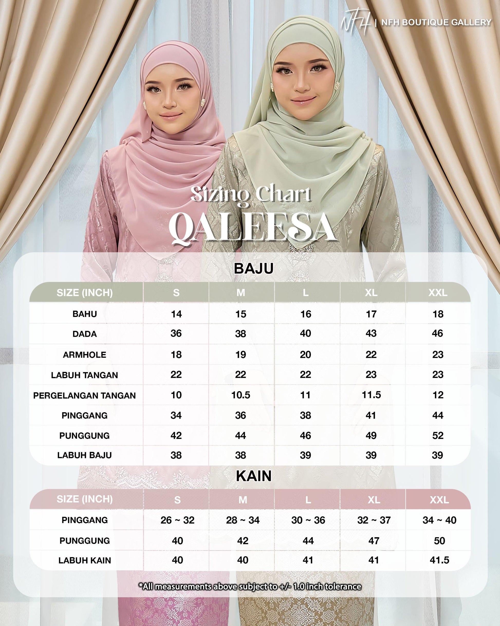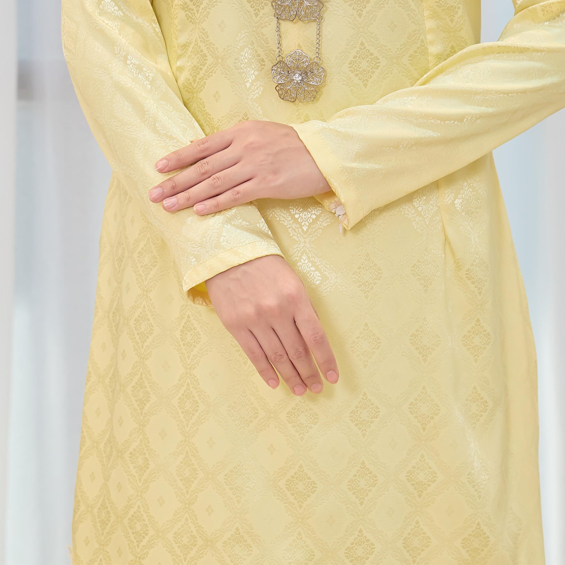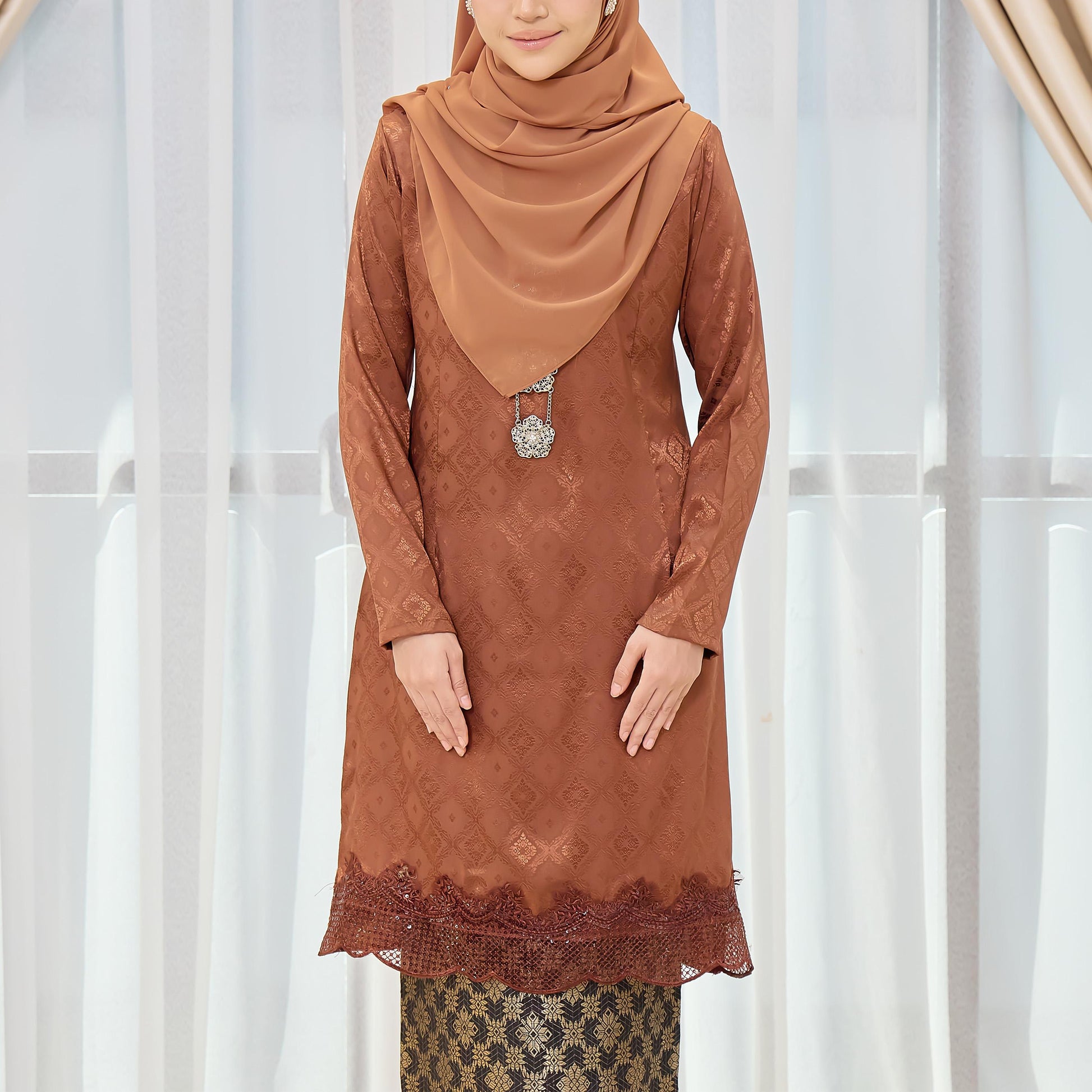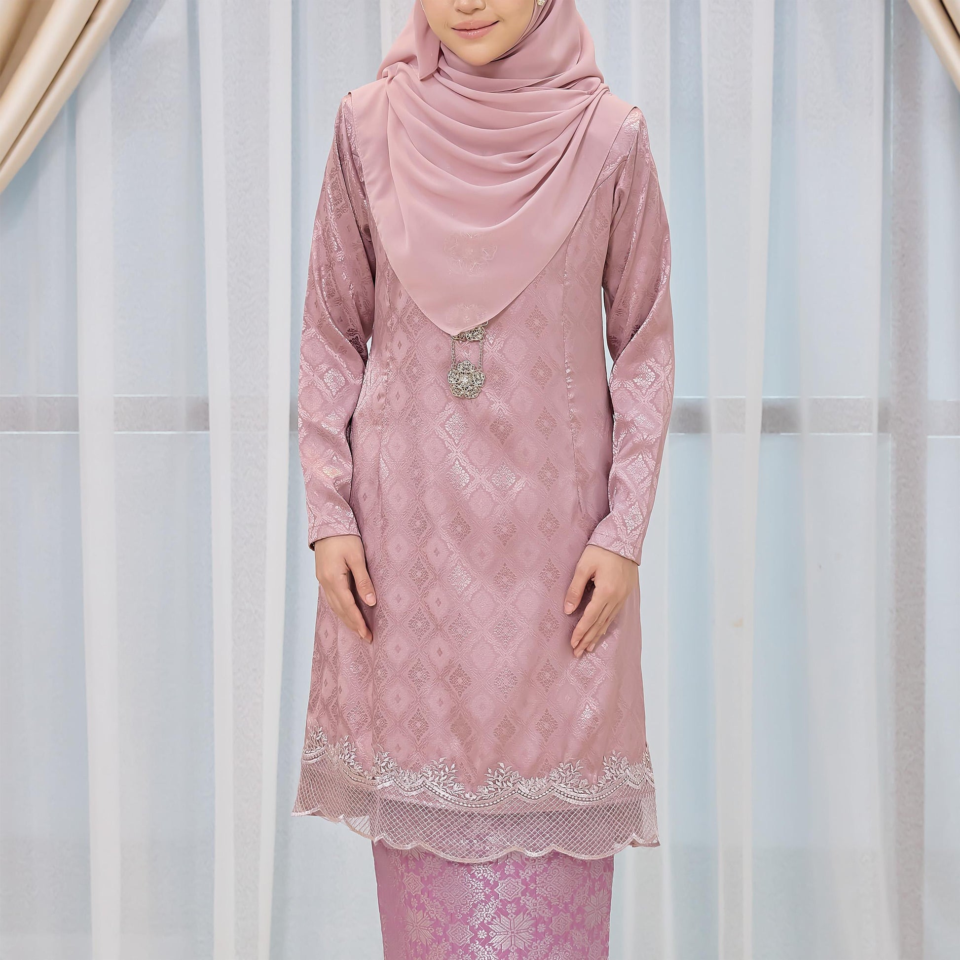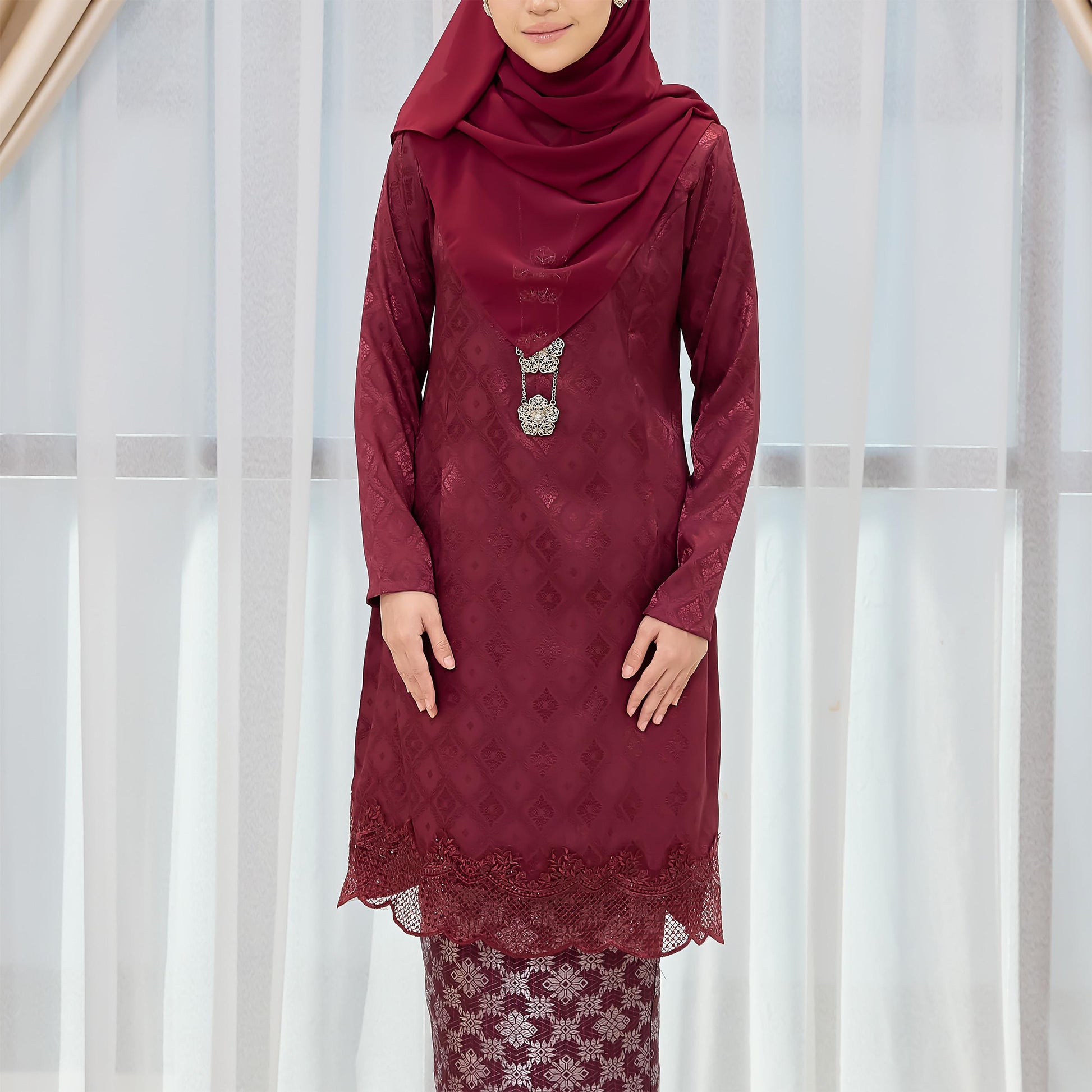 The Qaleesa Kurung combines a jacquard and lace top with a songket skirt, featuring a shimmery pattern and lace trim. It has a chest zip for nursing and wrist zips for easy wudhu, with a susun belakang skirt for comfortable movement.
