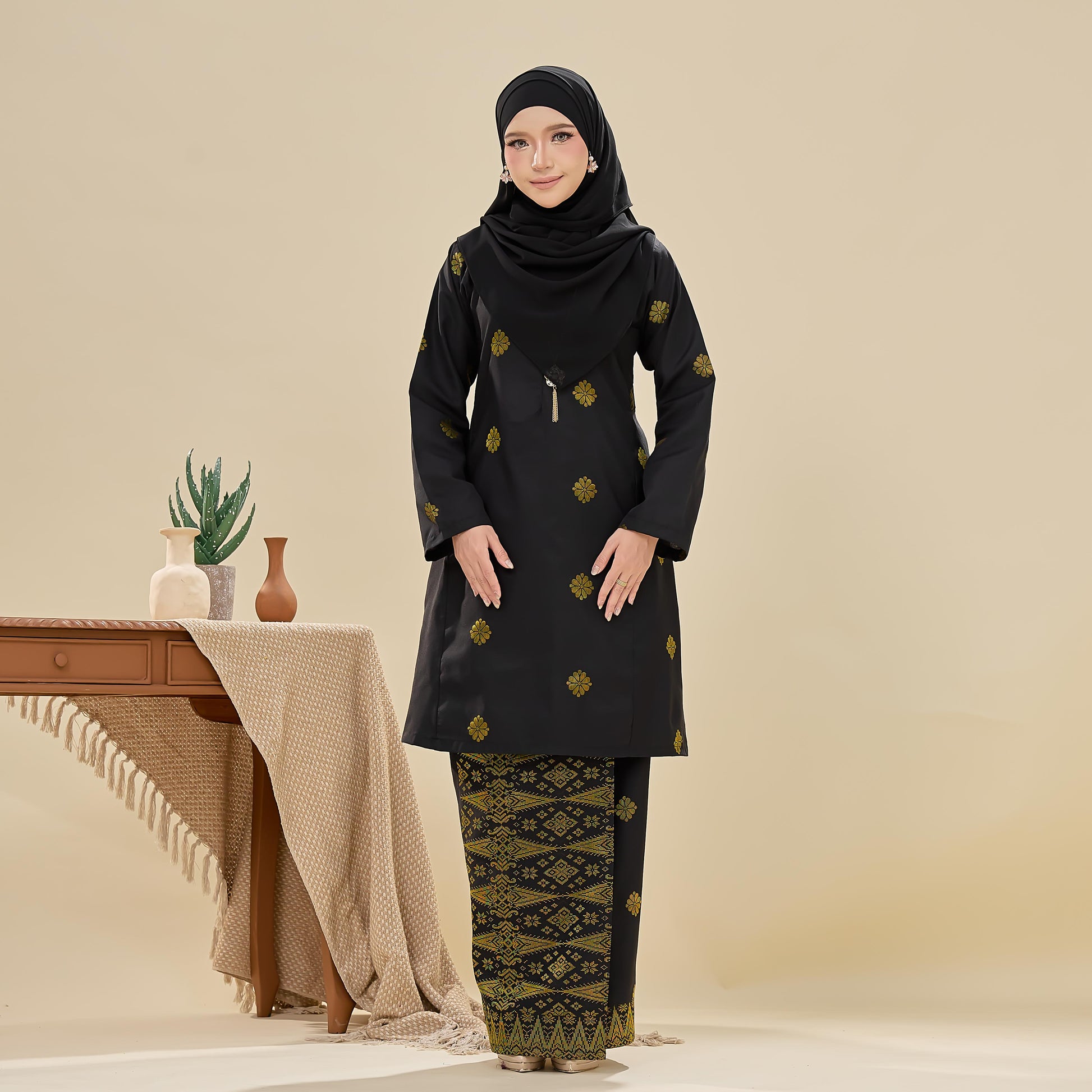 The Ratna Kurung features classic Songket Tenun with the Bunga Tabur pattern, a susun belakang skirt, a chest zip for easy nursing, and loose cuffs for wudhu convenience.