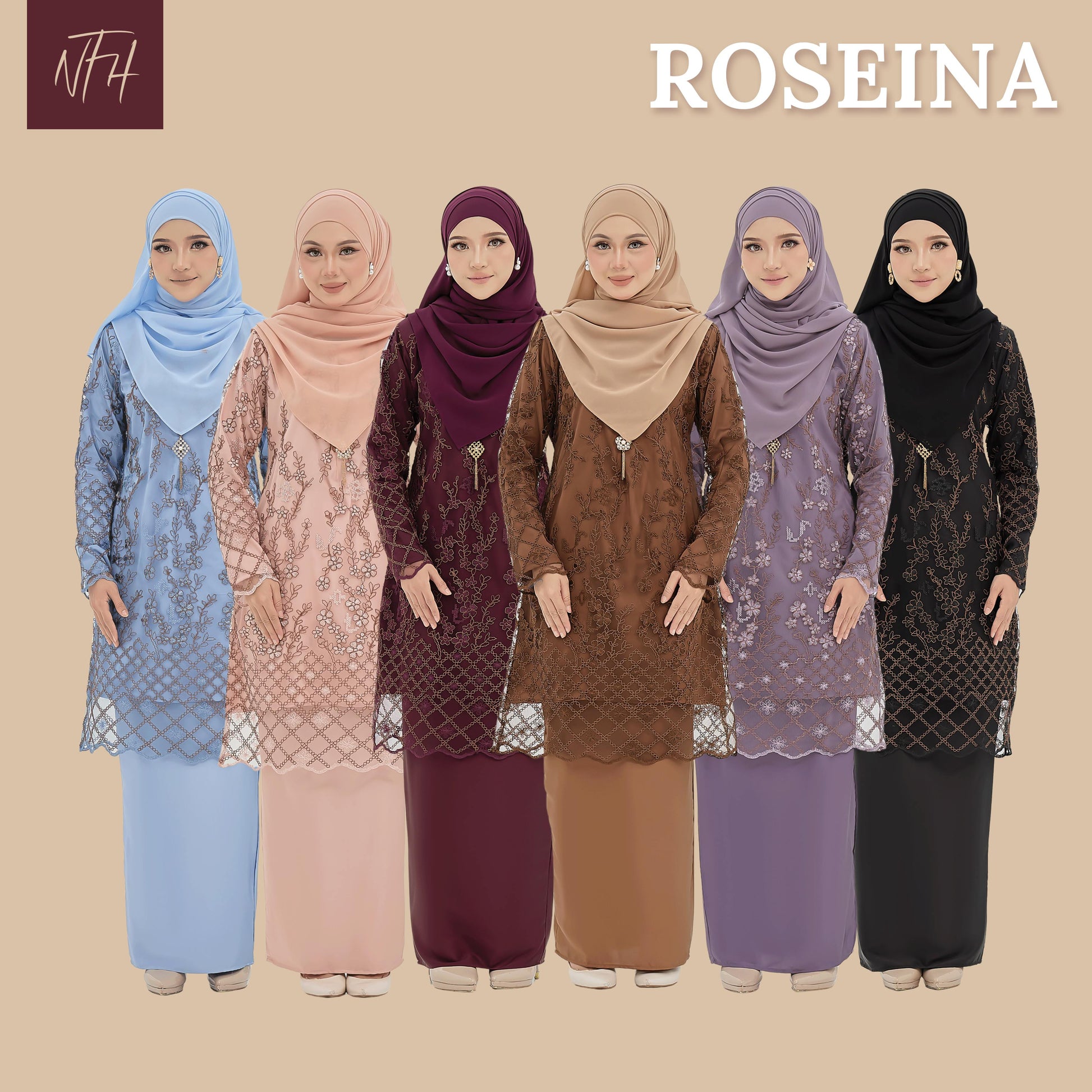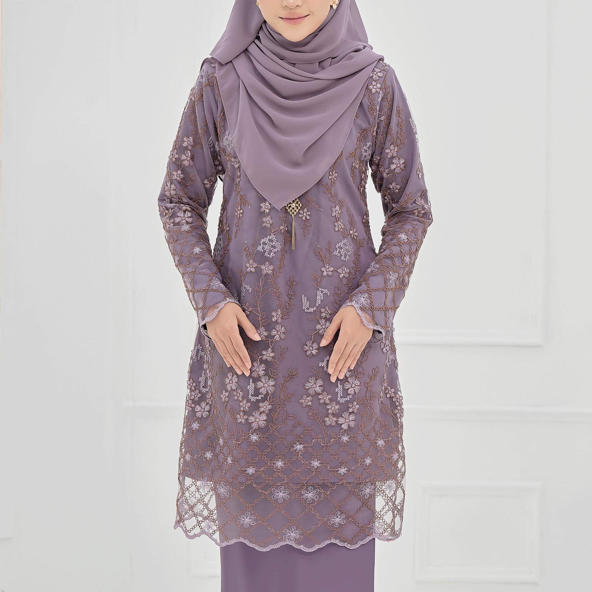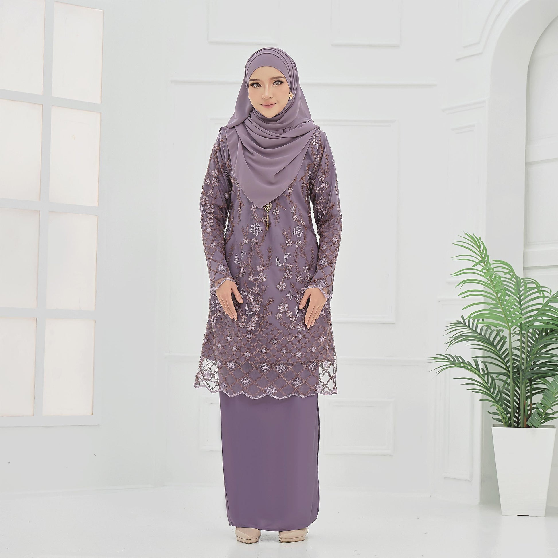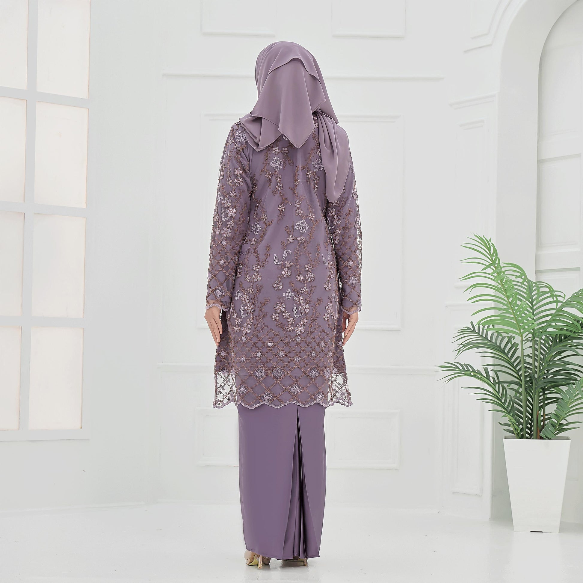The Roseina Kurung is made from soft Sutera Luminous fabric with a floral lace pattern and susun belakang skirt. It has a chest zip for easy nursing and wrist zips for wudhu, combining comfort and practicality.