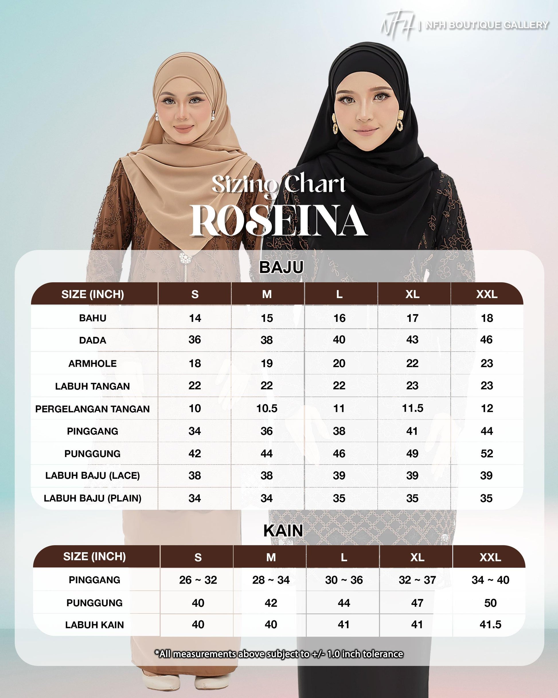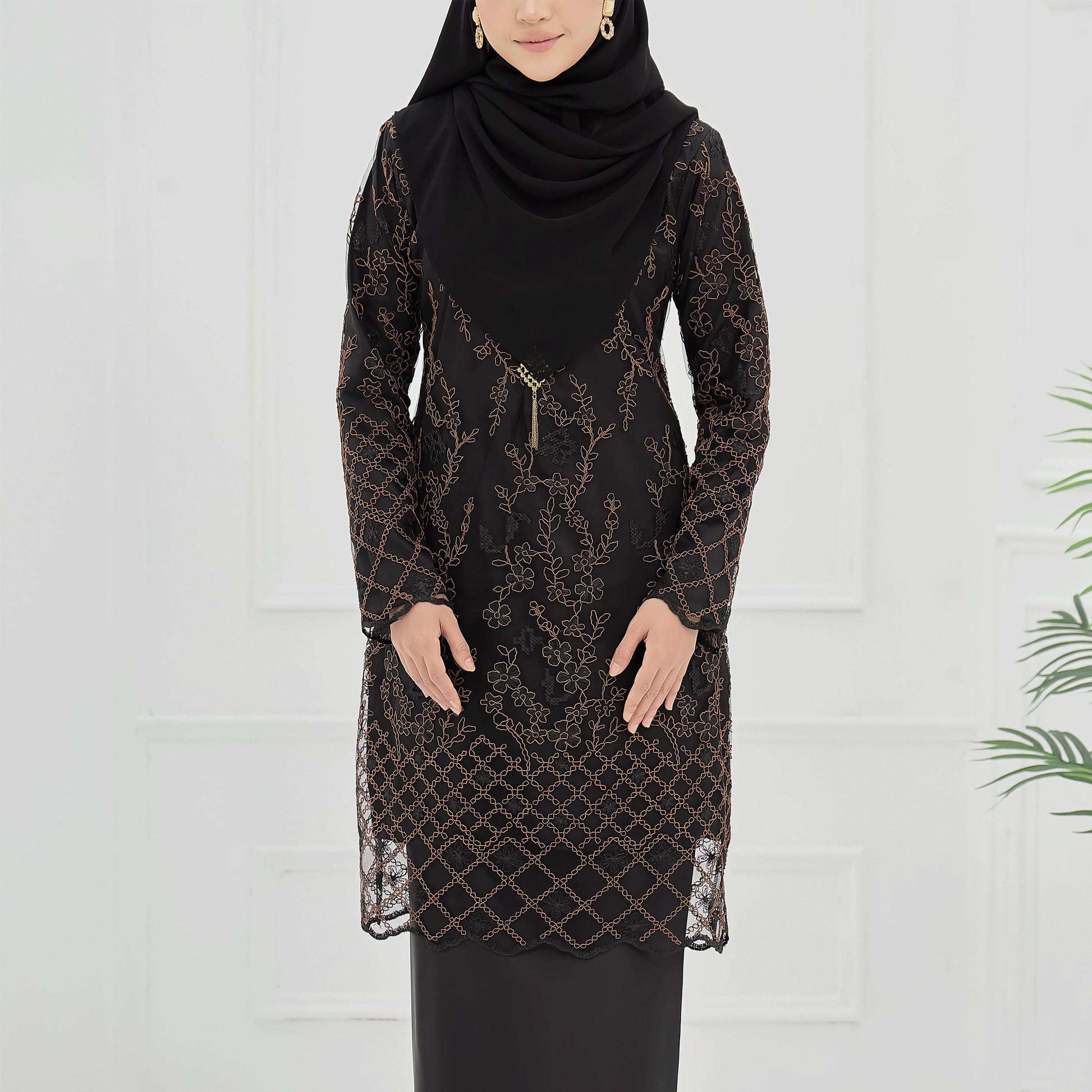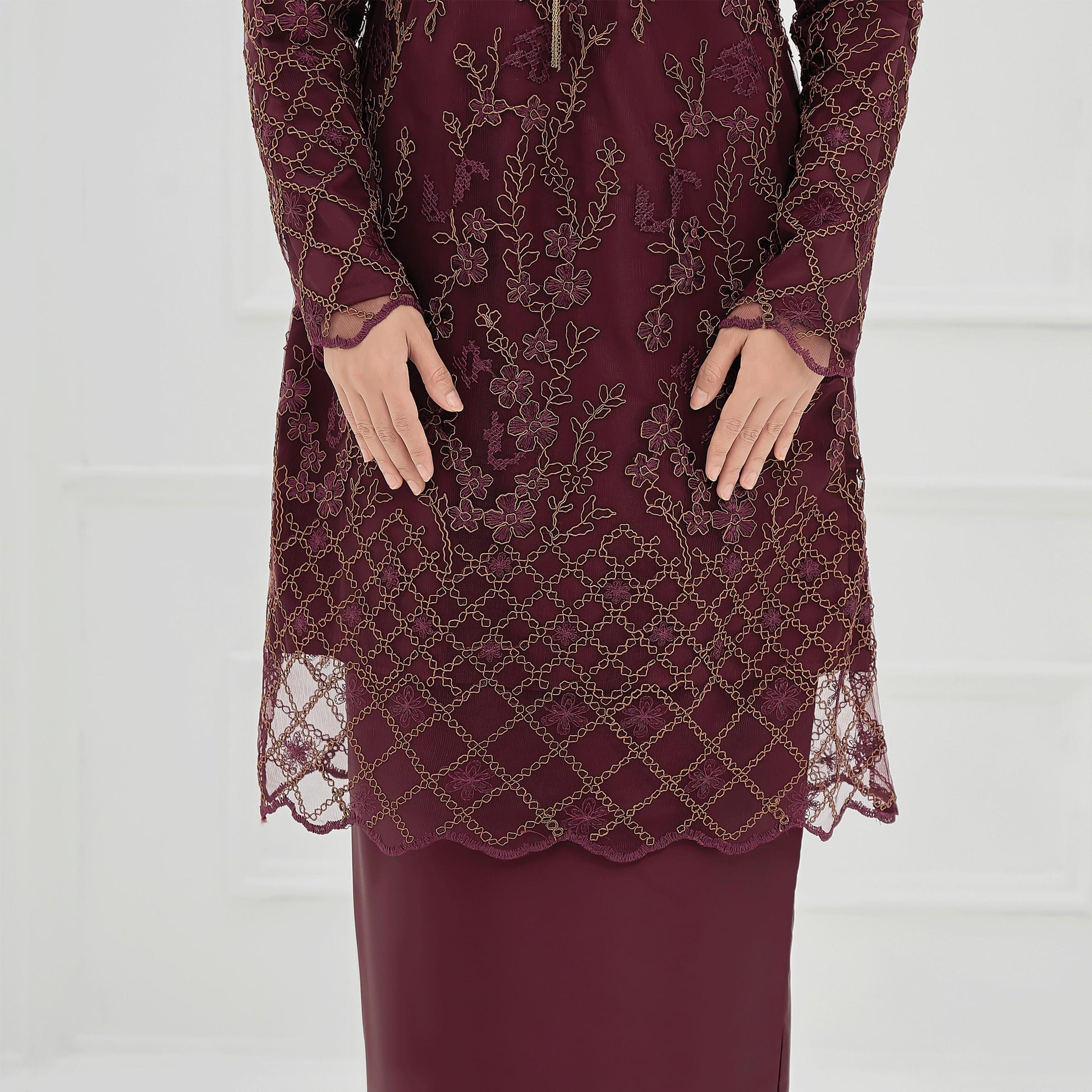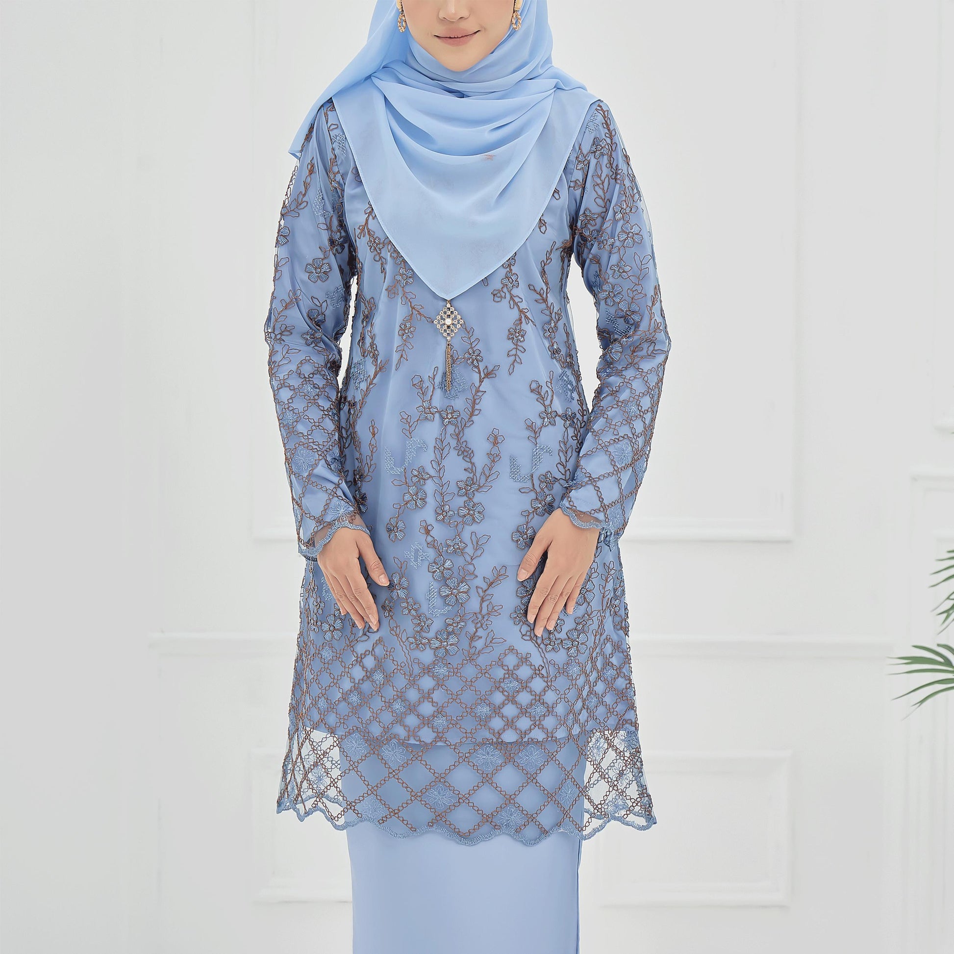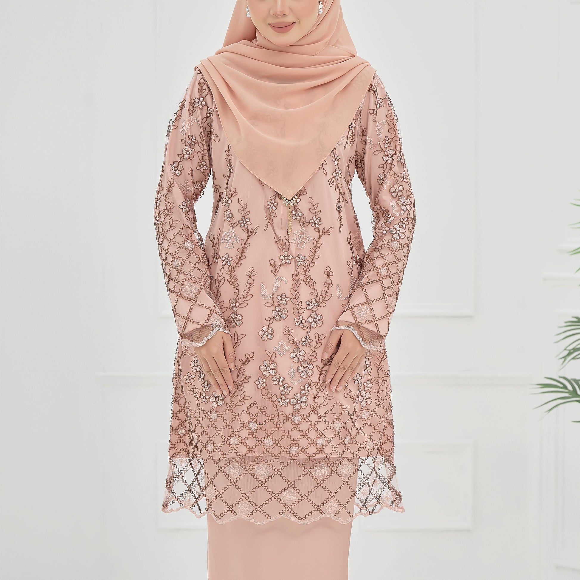 The Roseina Kurung is made from soft Sutera Luminous fabric with a floral lace pattern and susun belakang skirt. It has a chest zip for easy nursing and wrist zips for wudhu, combining comfort and practicality.