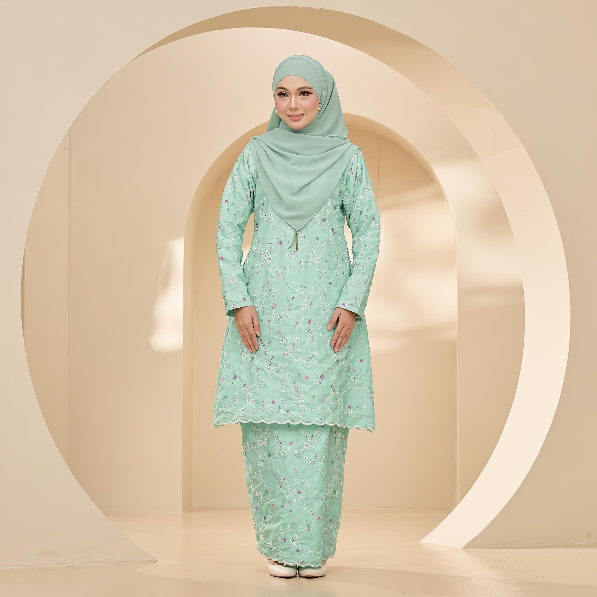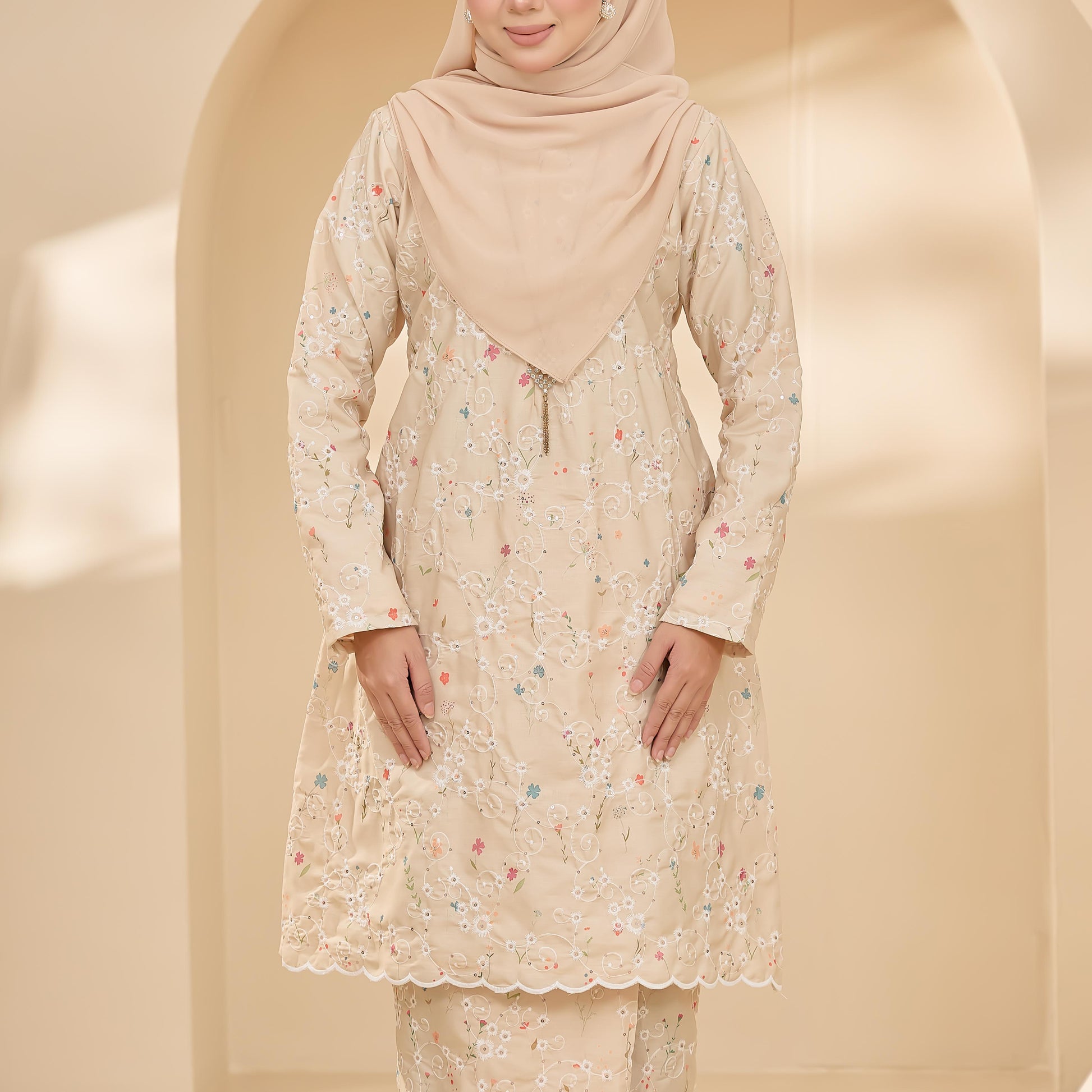 The Rosette Kurung features cotton embroidery with sequins, a susun belakang skirt, and convenient chest and wrist zip closures for nursing and wudhu.