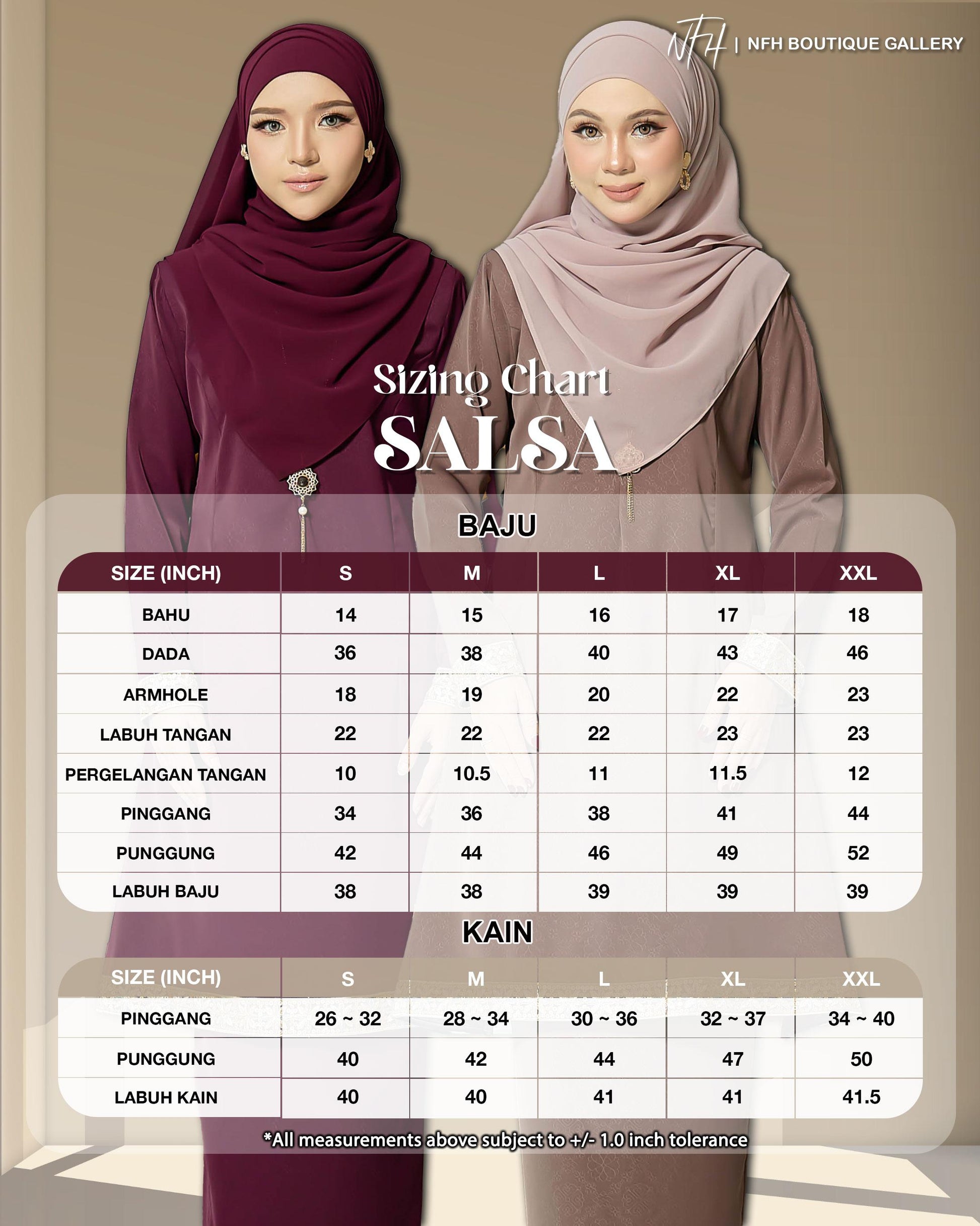 Made from Como Crepe with lace details, the Salsa Kurung features a layered skirt and lace trim. It includes a chest zip for easy nursing and a wrist zip for convenient wudhu, blending style with practical use.