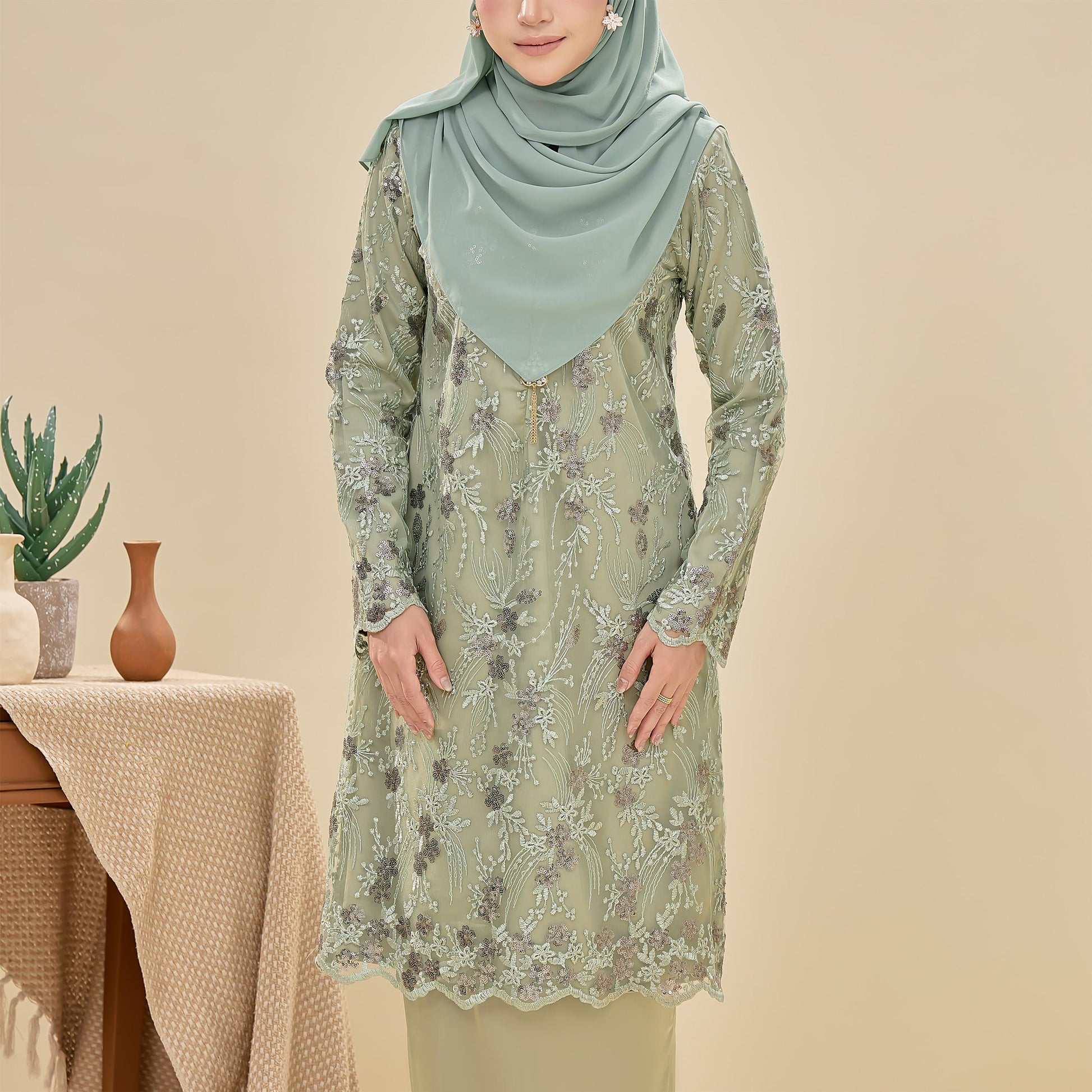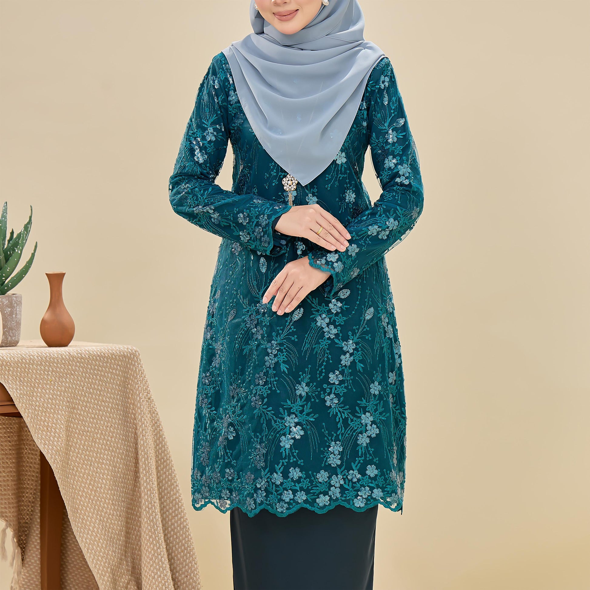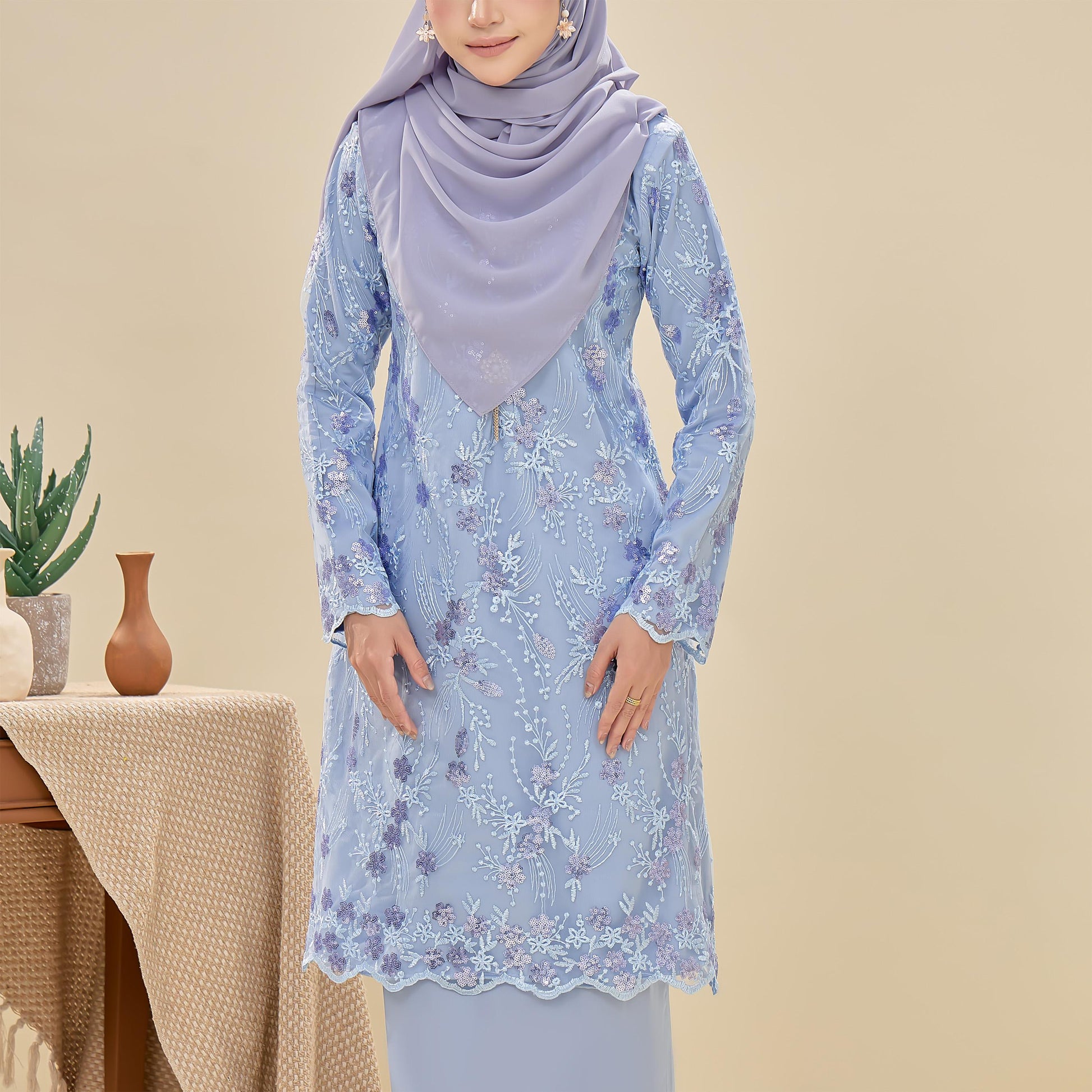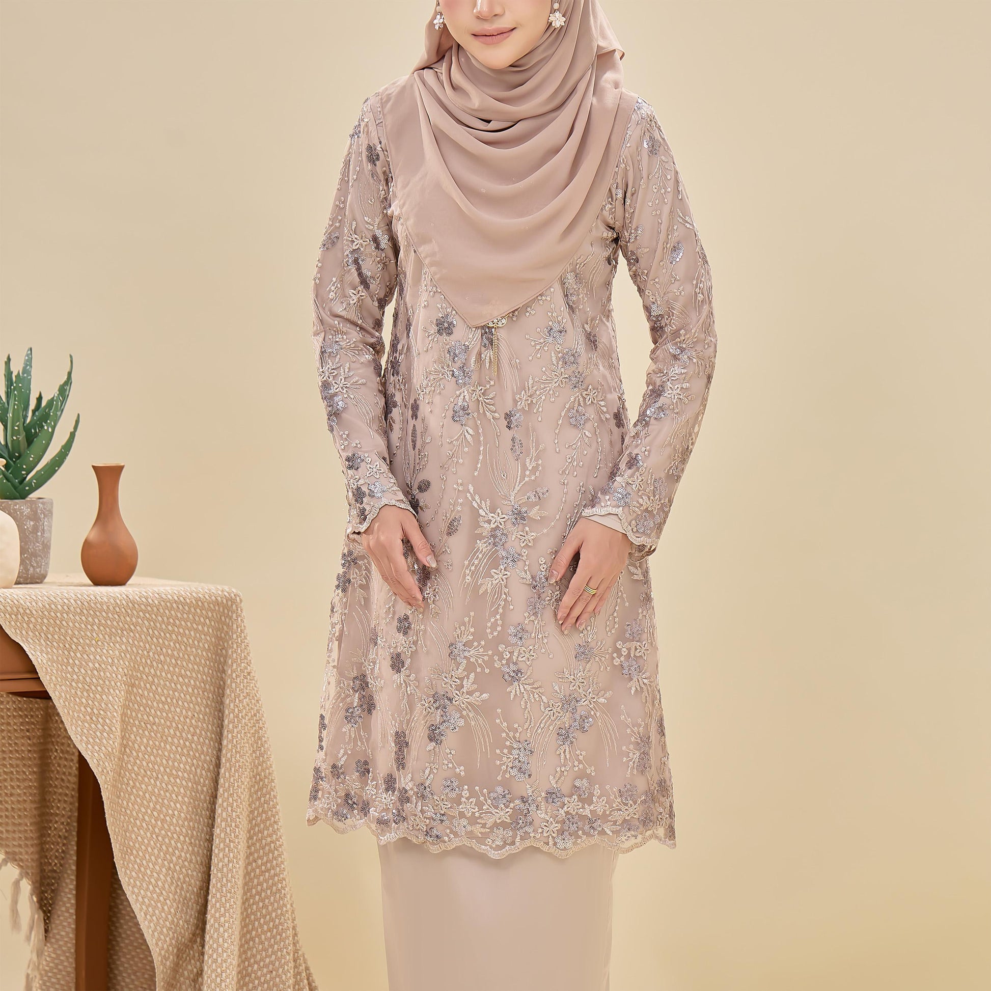 The Searra Kurung is made from lace with sequins and sutera luminous fabric. It features a floral pattern, a susun belakang skirt for ease of movement, a chest zip for nursing, and a wrist zip for wudhu. This kurung offers both elegance and practical comfort.