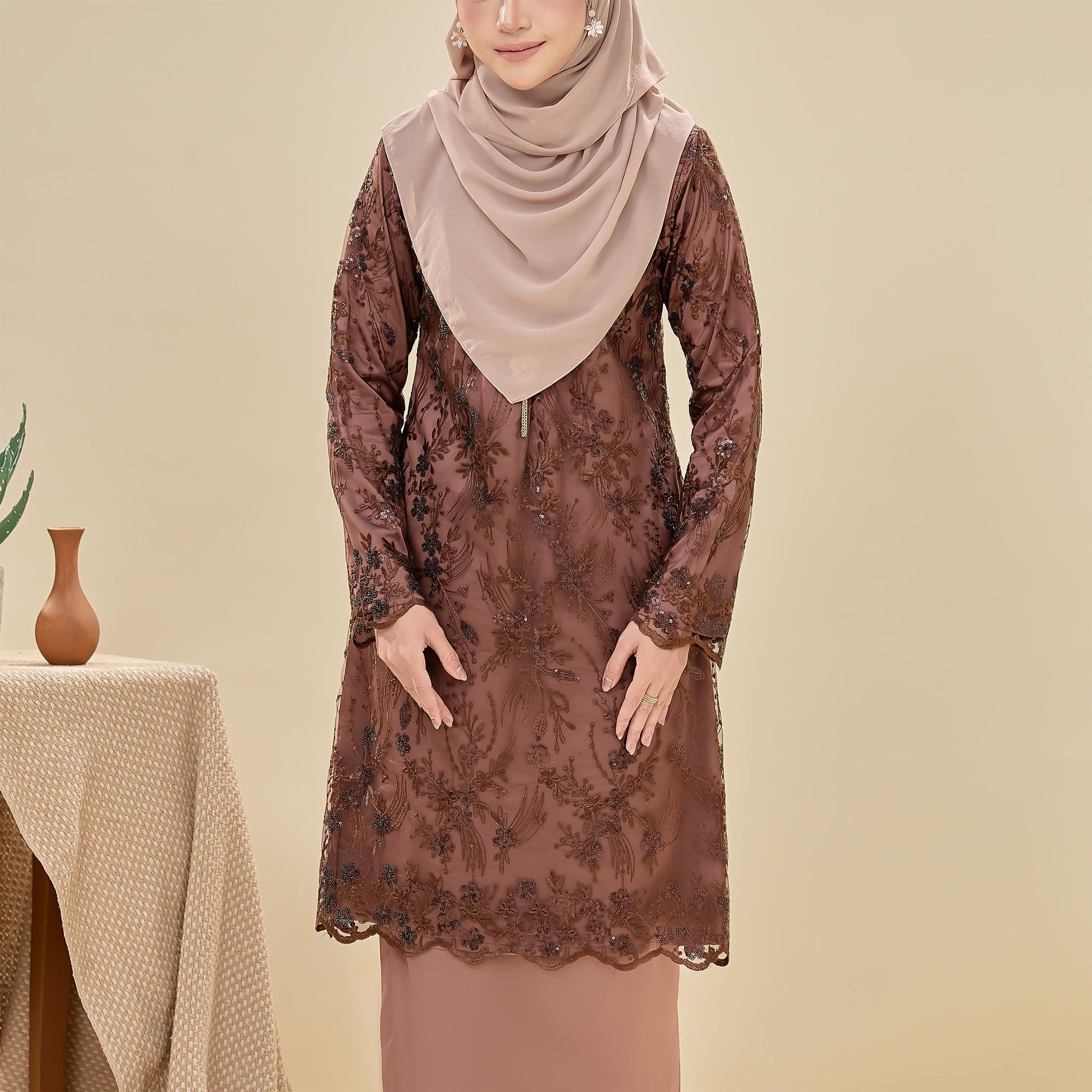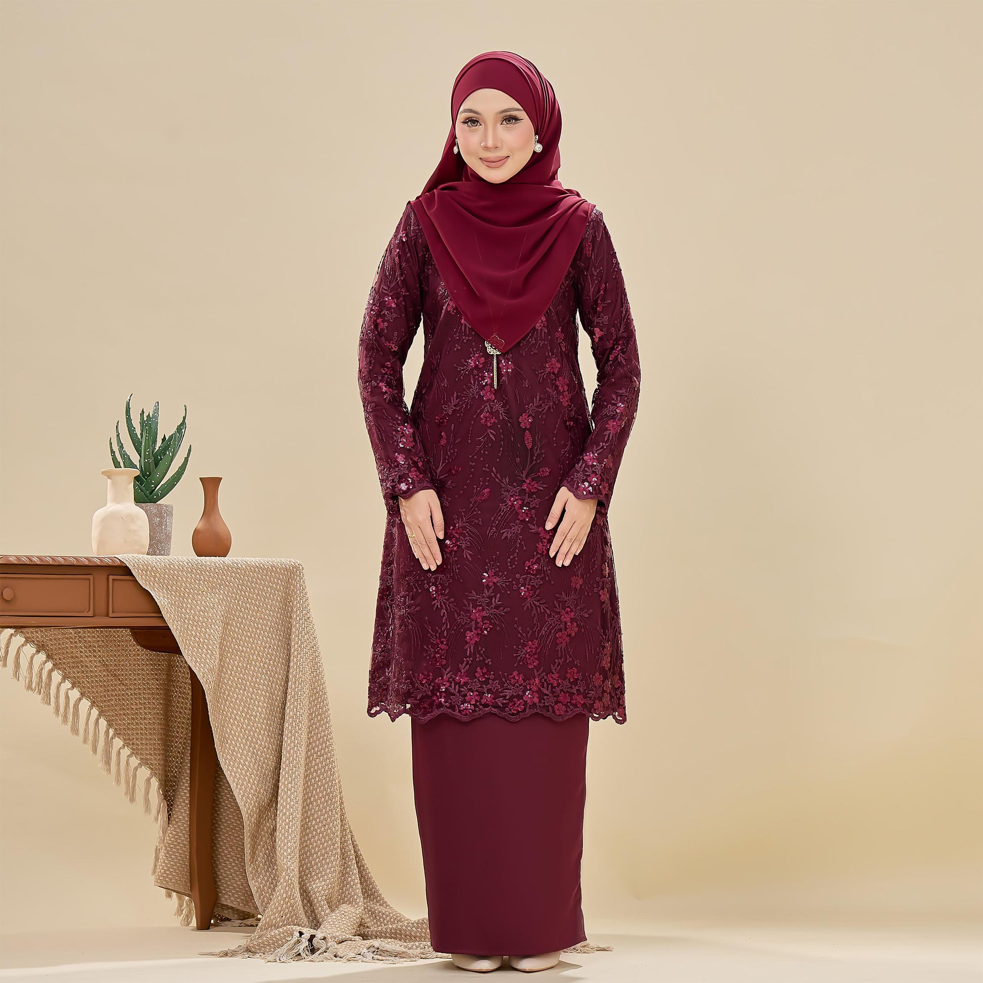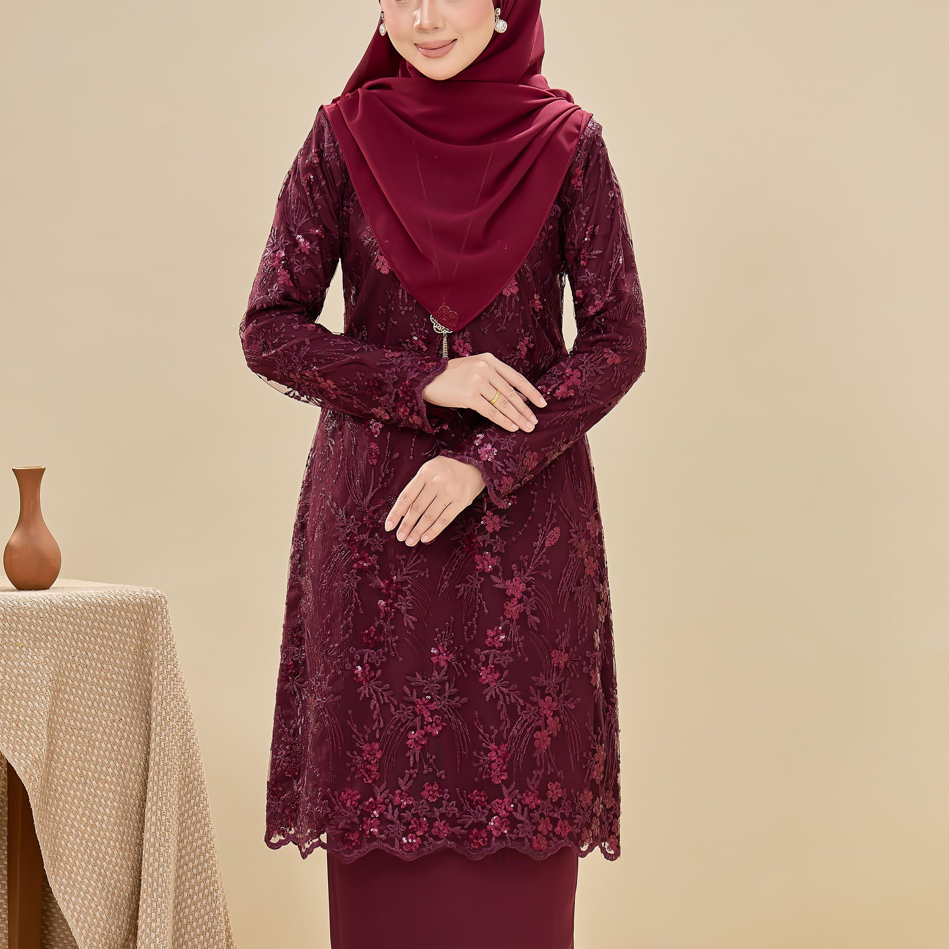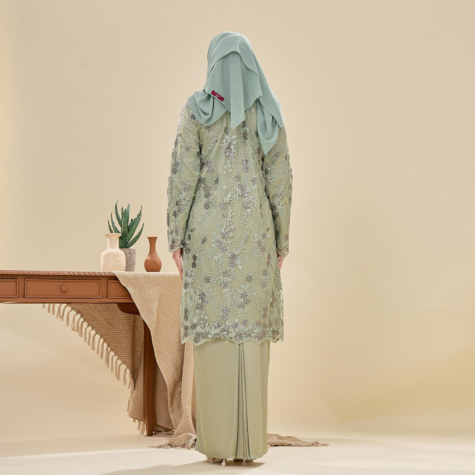 The Searra Kurung is made from lace with sequins and sutera luminous fabric. It features a floral pattern, a susun belakang skirt for ease of movement, a chest zip for nursing, and a wrist zip for wudhu. This kurung offers both elegance and practical comfort.