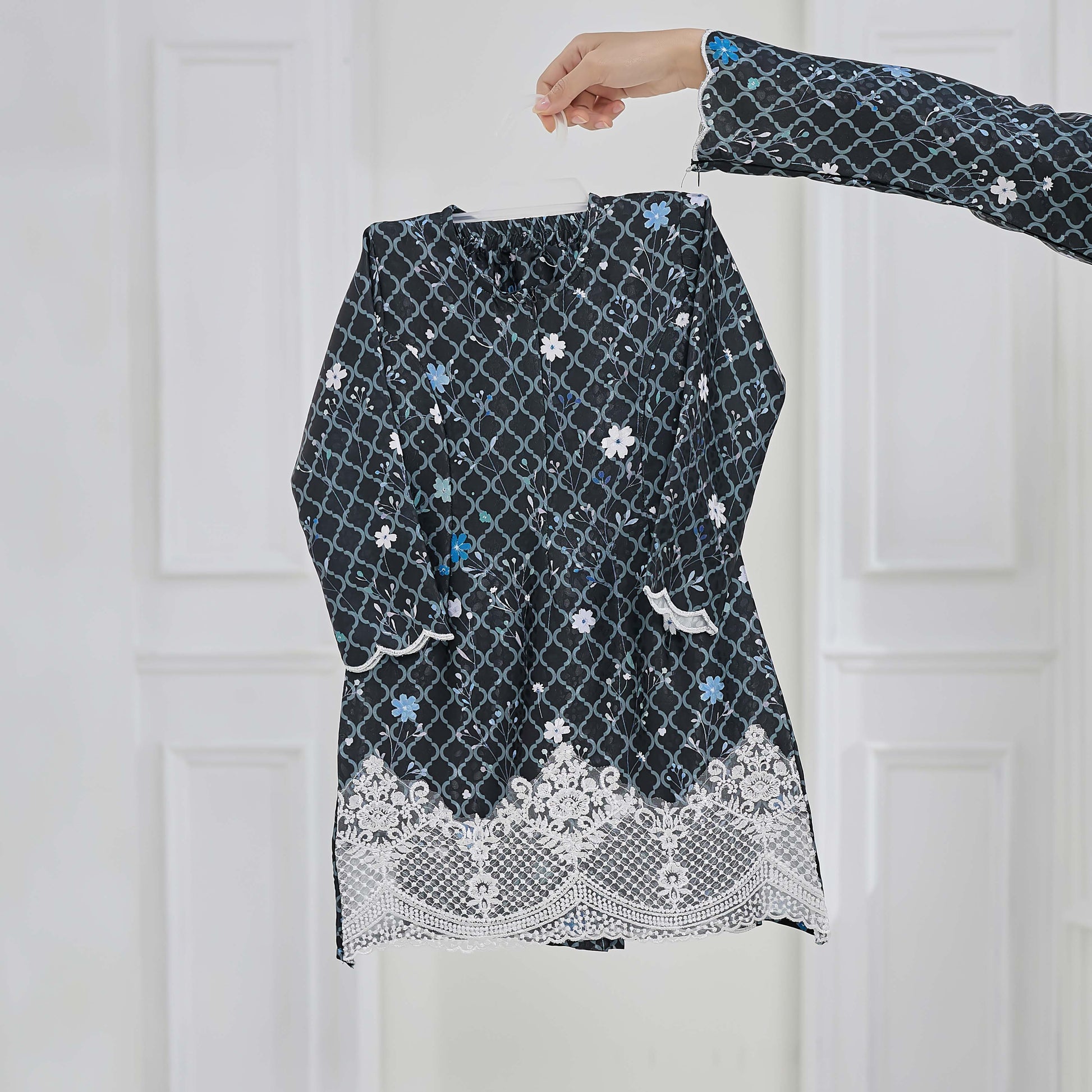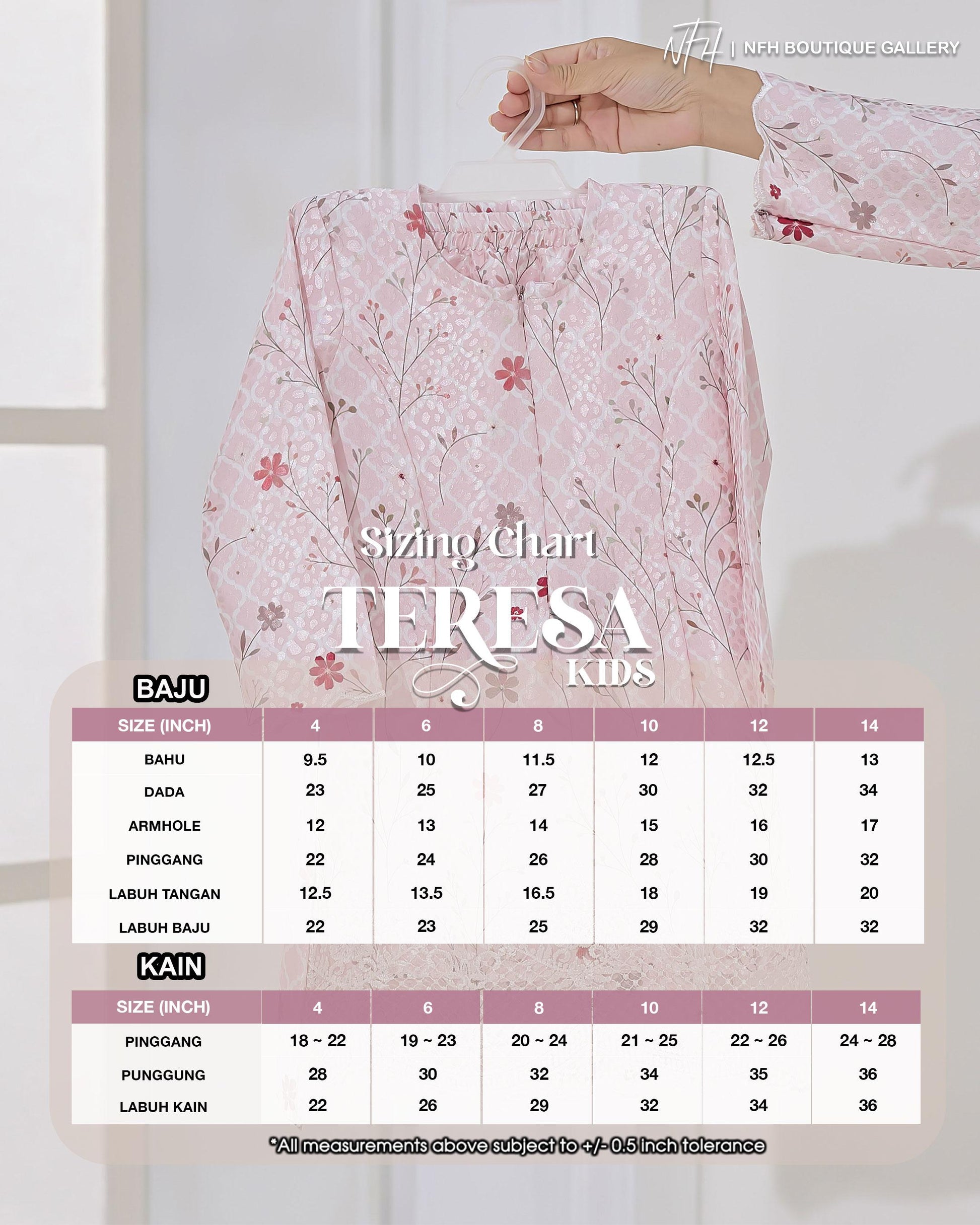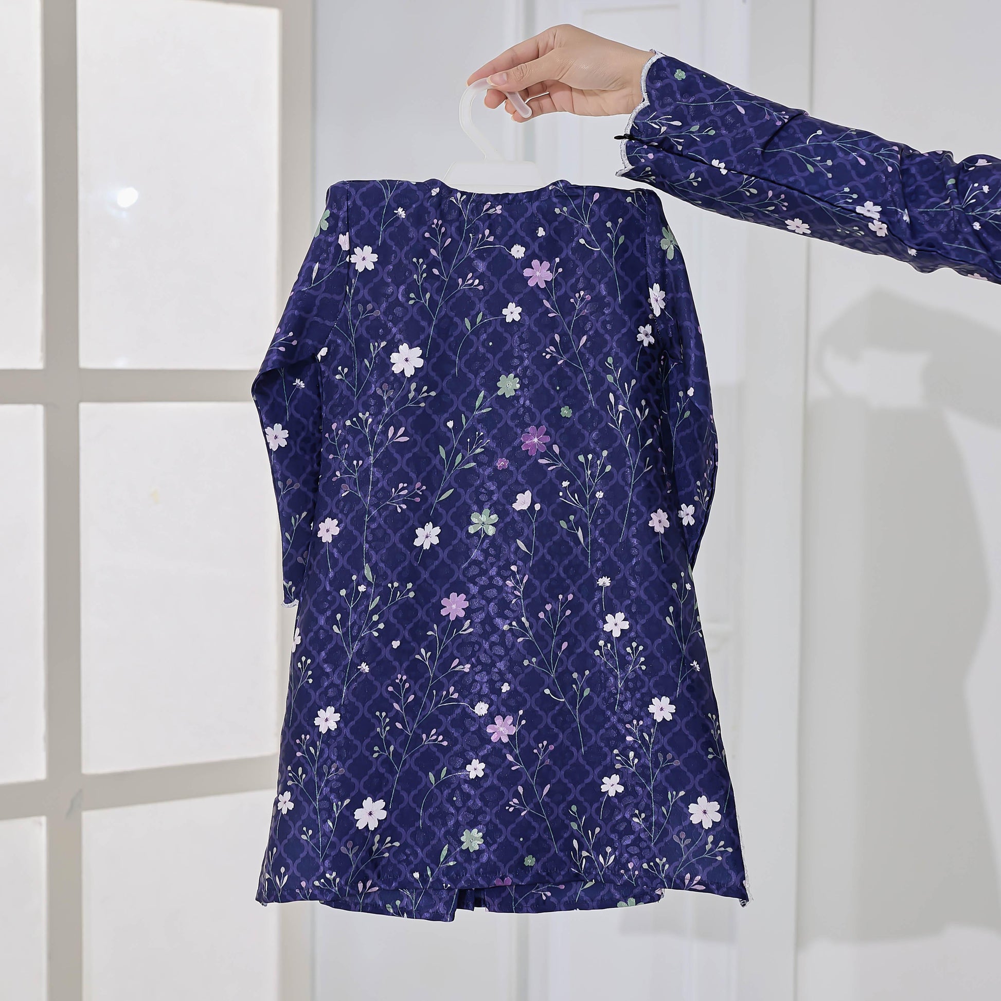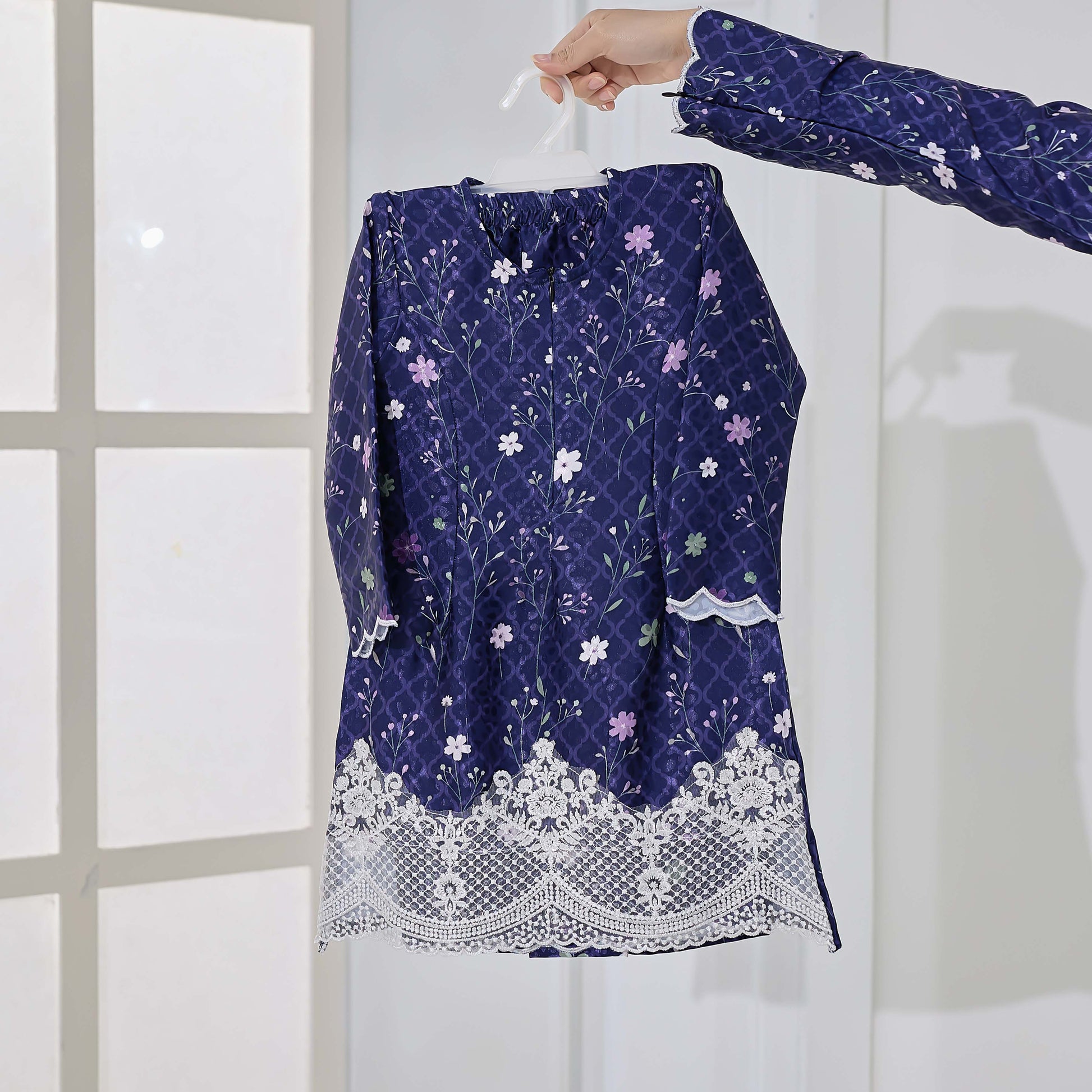 Premium jacquard kurung with printed pattern, lace trim, and convenient back zip closure. Elegant yet comfortable for children's special occasions.