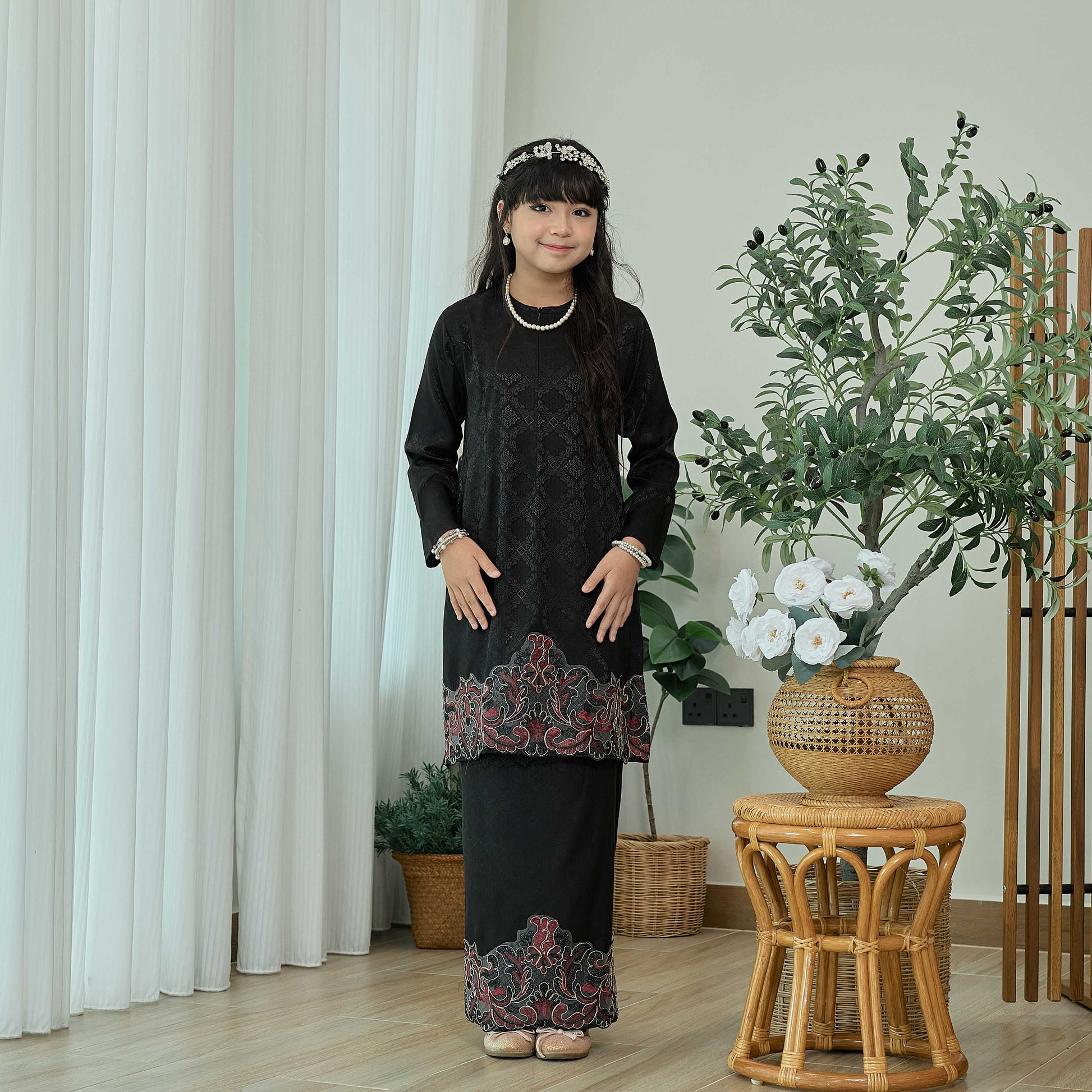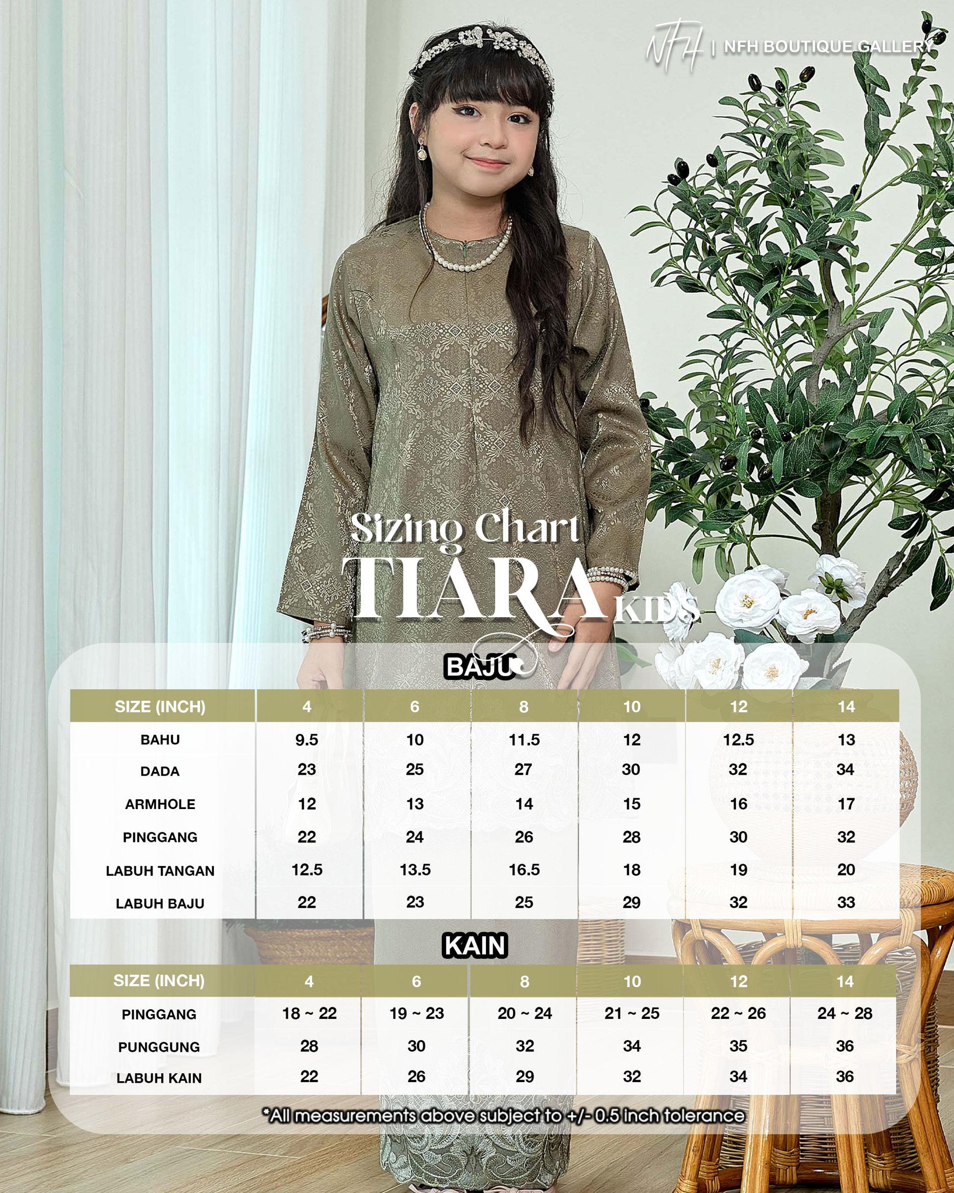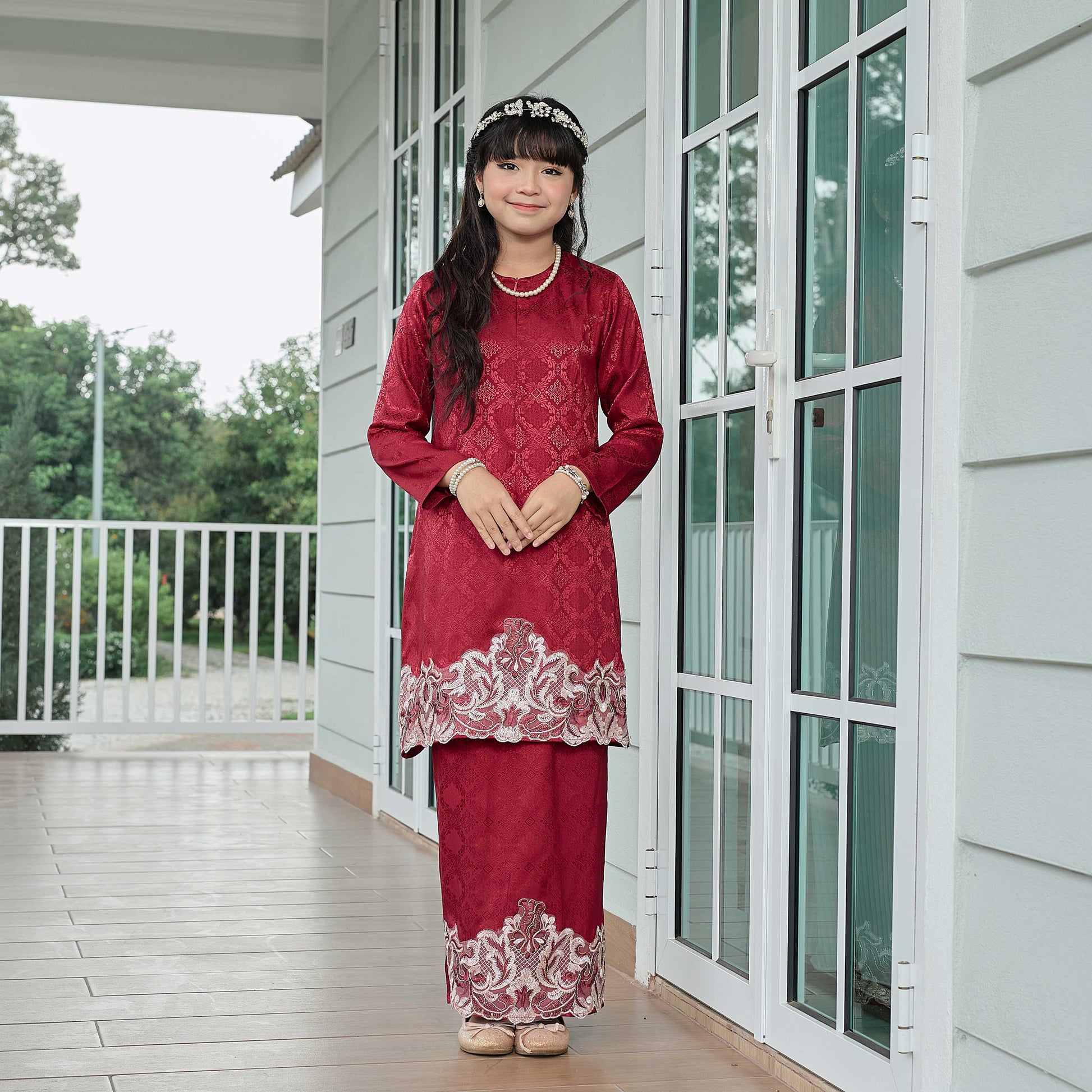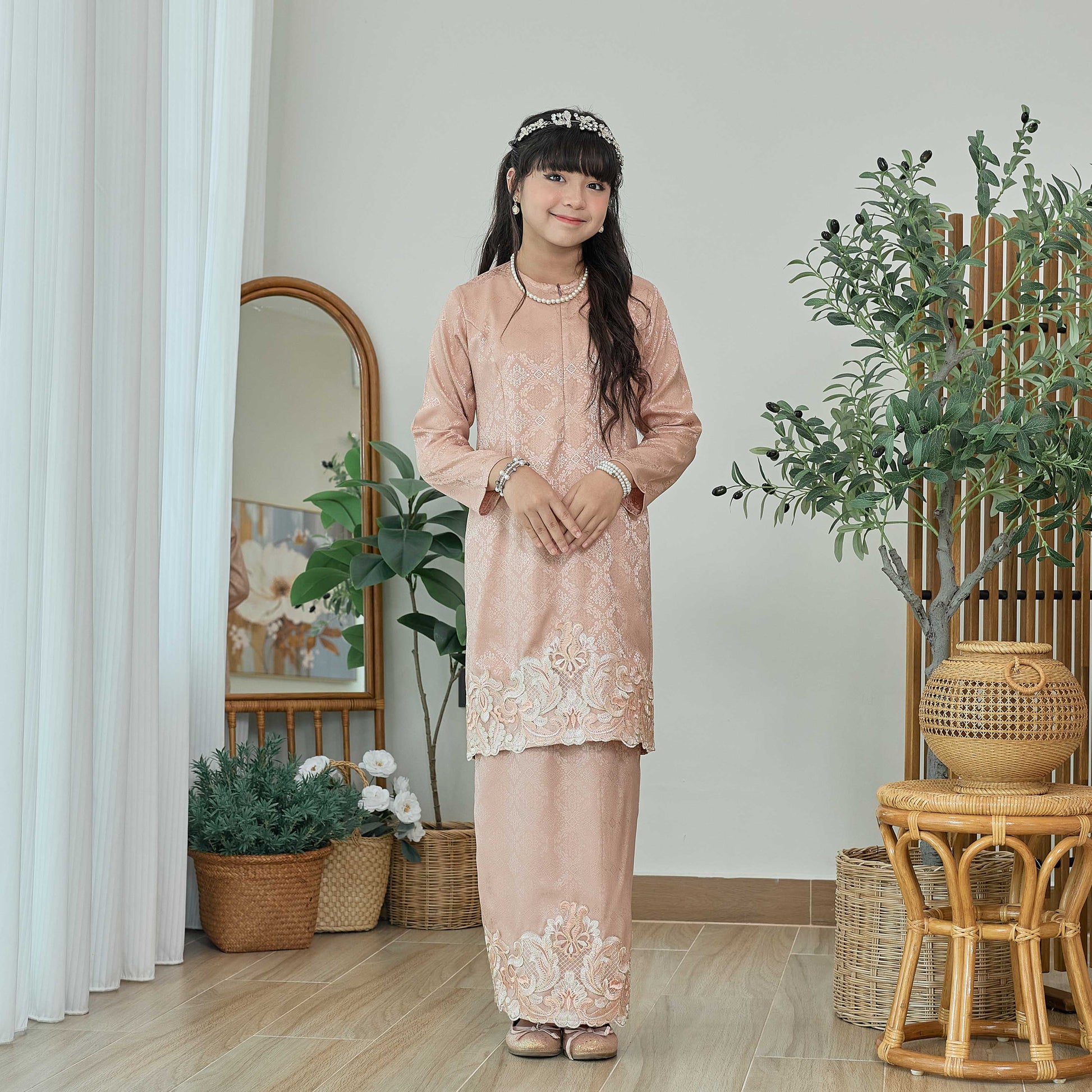 Upgrade your little one's wardrobe with the Tiara Kurung Kids. With Jacquard material and delicate lace trim, this dress exudes elegance and charm. The Susun Belakang skirt adds a unique touch, perfect for special occasions. Let your child shine with this stunning piece.