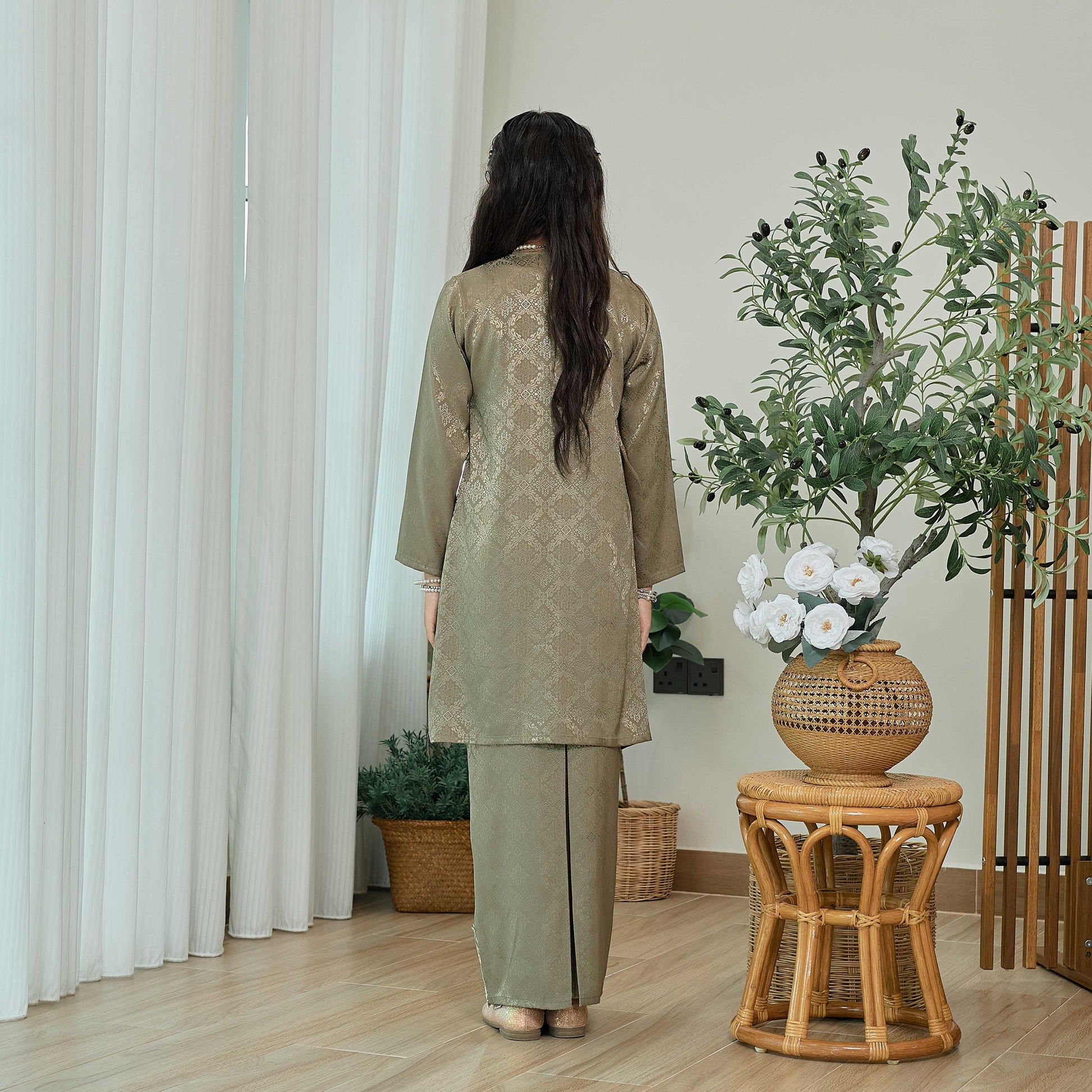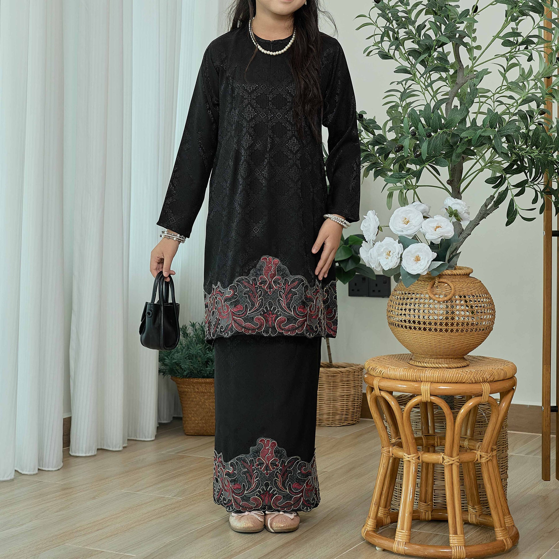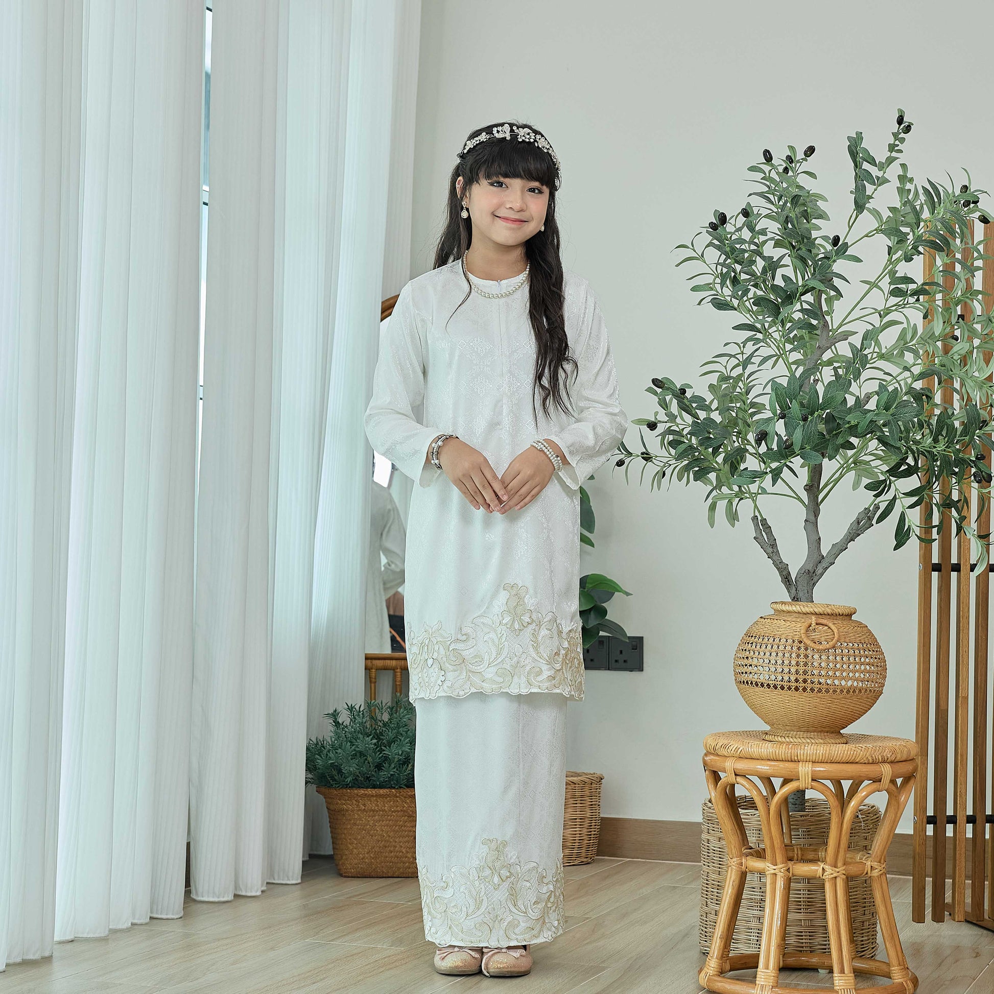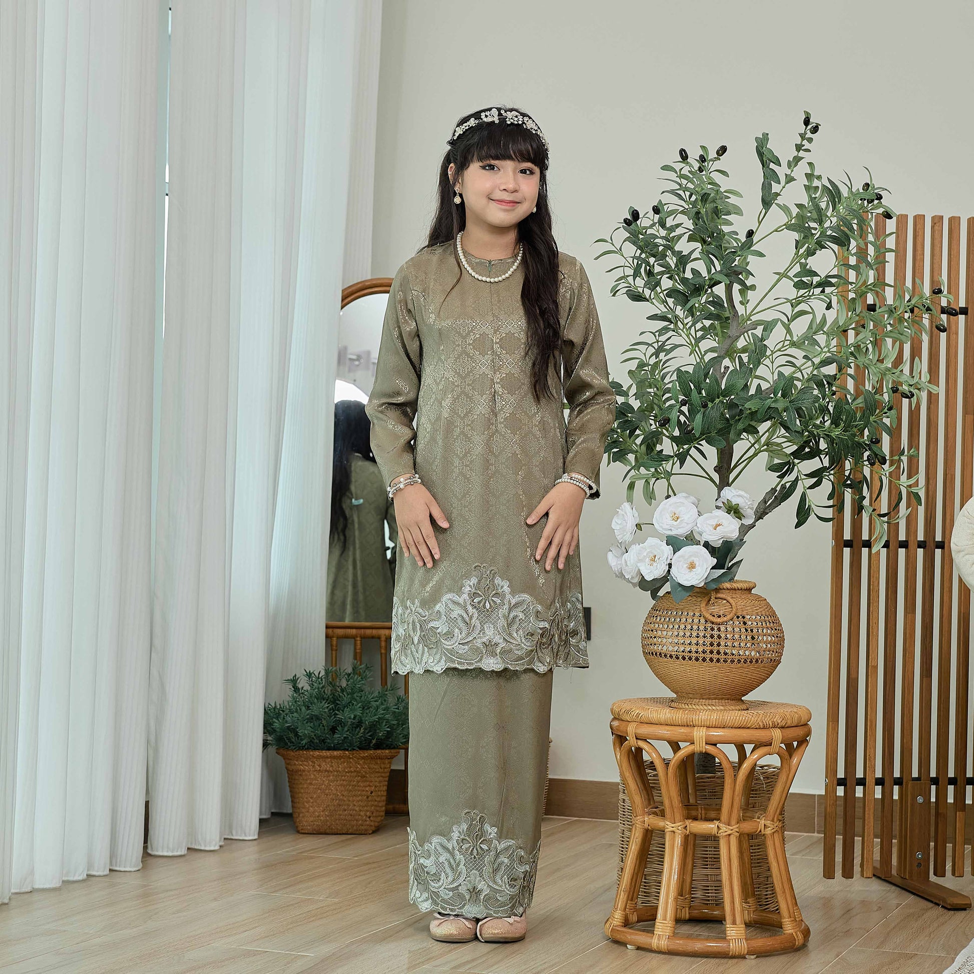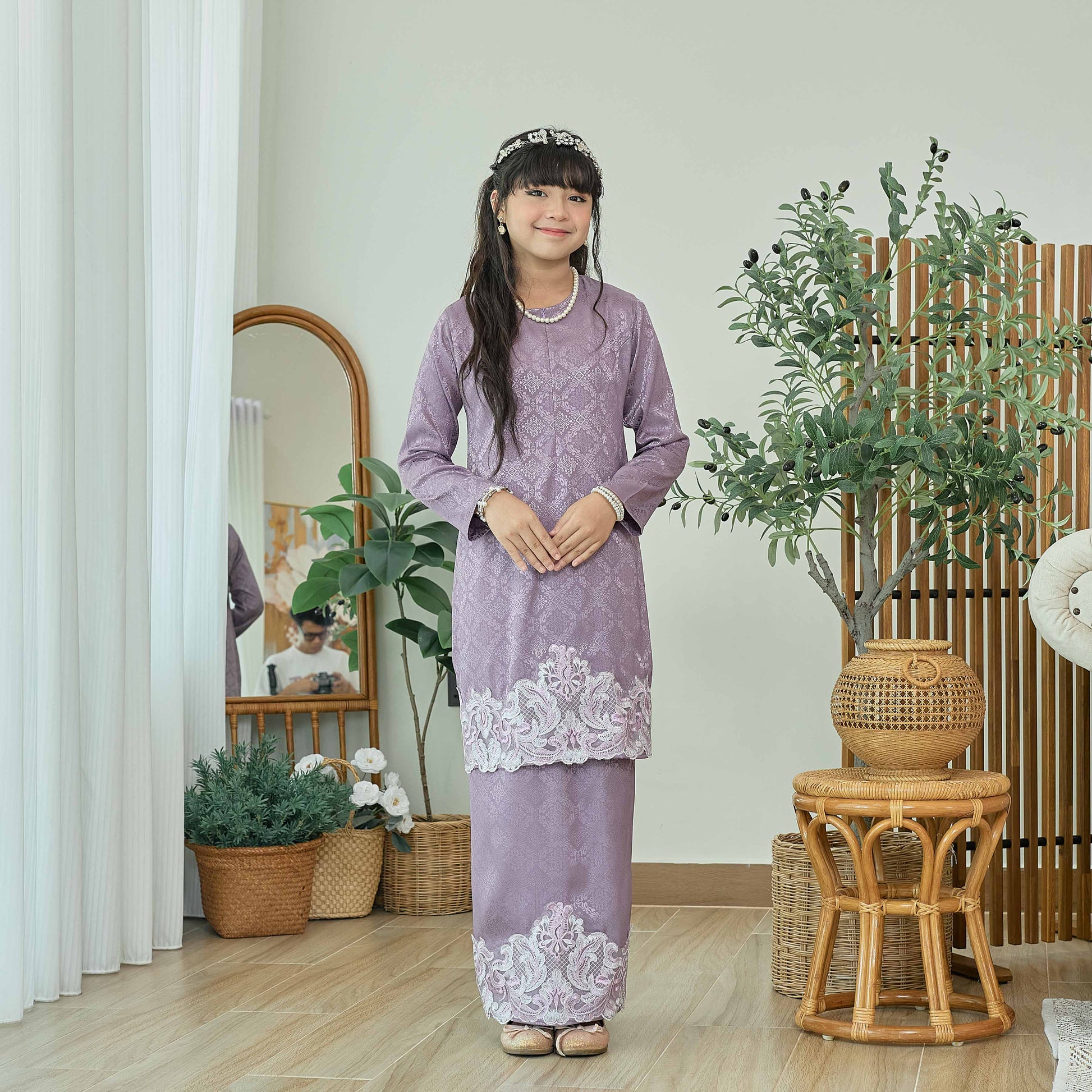 Upgrade your little one's wardrobe with the Tiara Kurung Kids. With Jacquard material and delicate lace trim, this dress exudes elegance and charm. The Susun Belakang skirt adds a unique touch, perfect for special occasions. Let your child shine with this stunning piece.